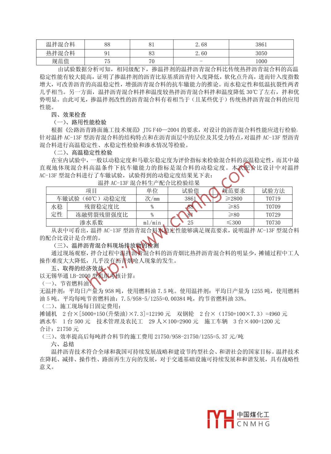 DAT瀝青混合料溫拌添加劑的應(yīng)用李俊德煙臺市蓬萊公路管理局山東煙臺265600摘要:溫拌瀝青技術(shù)符合全球和我國可持續(xù)發(fā)展戰(zhàn)略和建設(shè)節(jié)約型社會(huì)、和諧社會(huì)的國家目標(biāo)。溫拌技術(shù)在降耗、減排、操作性、路面再生方向的發(fā)展,對于交通基礎(chǔ)設(shè)施可持續(xù)發(fā)展和和諧發(fā)展,具有戰(zhàn)略性意義。關(guān)鍵詞:減少能源消耗延長施工季節(jié)提高經(jīng)濟(jì)效益中圖分類號: U214. 7+5文獻(xiàn)標(biāo)識碼: A一、 溫拌技術(shù)概述溫拌瀝青混合料是一種環(huán)保節(jié)能型的新材料,它具有與相應(yīng)的熱拌瀝青混合料一致甚至更優(yōu)的的路用性能,但卻能在更低(低約30"C左右)的溫度下拌和及壓實(shí),降低了在生產(chǎn)過程中的煙塵等廢棄物.的排放,減少能源消耗,減輕瀝青老化,延長施工季節(jié),改善工人工作環(huán)境,開放交通及時(shí),提高經(jīng)濟(jì)效益,成為近年來道路施工領(lǐng)域應(yīng)用的熱點(diǎn)。二、瀝青混合料現(xiàn)狀瀝青混合料的生產(chǎn)是道路工程中的能耗大戶,傳統(tǒng)的熱拌瀝青混合料是- -種熱拌熱鋪材料,在拌合、攤鋪及碾壓時(shí)需具備較高的溫度,因而在生產(chǎn)和施工的過程中不僅要消耗大量能源,而且排出大量的廢氣和粉塵,影響周圍的環(huán)境質(zhì)量和施工人員的身體健康。同時(shí)瀝青還會(huì)產(chǎn)生熱老化,并且在非夏季施工時(shí)氣溫較低,從而影響其路用性能。三、應(yīng)用實(shí)例我國對溫拌技術(shù)的研究和應(yīng)用始于2005年,而煙臺地區(qū)我們是首次使用。本文以我們施工的G206煙汕線八角至蓬萊段路面中修工程為實(shí)例,進(jìn)行了應(yīng)用總結(jié)。(一)、設(shè)計(jì)方面為了更好地體現(xiàn)溫拌瀝青混合料的優(yōu)越性,我們進(jìn)行了密級配溫:拌瀝青混合料及同級配熱拌瀝青混合料的配合比設(shè)計(jì)來驗(yàn)證性能差異。圖紙中設(shè)計(jì)的是AC-13P細(xì)粒式瀝青混合料采用MAC改性瀝青,粗集料采用玄武巖集料。溫拌瀝青混合料和熱拌瀝青混合料采用相同的礦料級配,溫拌添加劑與瀝青的比例為5%。(二)、原材料方面1、粗集料:為了充分發(fā)揮瀝青混合料中粗集料的作用,粗集料必須潔凈、干燥、表面粗糙。我們采用的是棲霞產(chǎn)的玄武巖粗集料。2、細(xì)集料:瀝青路面所用細(xì)集料應(yīng)潔凈、干燥、無風(fēng)化、無雜質(zhì),并有適當(dāng)?shù)念w粒級配。我們采用的是棲霞產(chǎn)的玄武巖細(xì)集料。3、填料:用于瀝青混合料的礦粉必須采用石灰?guī)r等憎水性石料經(jīng)磨細(xì)得到的礦粉。礦粉應(yīng)干燥、潔凈,能自由地從礦粉倉流出。我們采用的是蓬萊產(chǎn)的礦粉。4、瀝青:MAC改性瀝青較之基質(zhì)瀝青粘度大、軟化點(diǎn)高,感溫性小,抗老化能力強(qiáng)。我們采用的是煙臺產(chǎn)的MAC改性瀝青。5、溫拌添加劑:溫拌添加劑我們采用的是山東益高環(huán)保節(jié)能技術(shù)有限公司生產(chǎn)的DAT瀝青混合料溫拌添加劑。(三)、施工方面1、本次溫拌瀝青混合料的拌制溫度控制在140~ 160°C,運(yùn)輸按照《 公路瀝青路面施工技術(shù)規(guī)范》(JTGF40--2004)對熱拌瀝青混合料的相關(guān)規(guī)定執(zhí)行。本次施工攤鋪溫度控制在130C.2、溫拌瀝青混合料的壓實(shí)根據(jù)混合料的級配類型、天氣情況,選擇合理的碾壓工藝。煙汕線采用的碾壓工藝為: (1)、 初壓2遍,選擇11 t雙鋼輪振動(dòng)壓路機(jī)穩(wěn)壓,壓實(shí)速度2~3 km/h.第1遍進(jìn)碾壓時(shí)發(fā)生推移,采用了靜壓,其他采用振壓。(2)、 復(fù)壓2~4遍,采用25t膠輪壓路機(jī),壓實(shí)速度為2~4 km/h。 (3)、 終壓2遍,選擇13t雙鋼輪振動(dòng)壓路機(jī),采用振、靜結(jié)合方式,收光采用靜壓,壓實(shí)速度為3~5km/h.(四)、結(jié)果比對我們根據(jù)生產(chǎn)及施工過程中的各項(xiàng)試驗(yàn)檢測結(jié)果進(jìn)行了比對如下:相同級配的溫拌和的熱拌路用性能中國煤化工瀝青混合料類型殘留穩(wěn)定度比%殘 留強(qiáng)度比%水穩(wěn)定性低溫抗YHCNM H Gr低溫劈裂強(qiáng)/m溫拌混合料8882. 683861熱拌混合料912.603050規(guī)范值770由試驗(yàn)數(shù)據(jù)分析可知,相同級配下,摻溫拌劑的溫拌瀝青混合料比傳統(tǒng)熱拌瀝青混合料的高溫穩(wěn)定性能有較大提高,證明了摻溫拌劑的瀝青比原基質(zhì)瀝青針入度降低,軟化點(diǎn)升高,進(jìn)而針入度指數(shù)增大,可改善瀝青的高溫穩(wěn)定性,增強(qiáng)瀝青混合料的抗車轍能力的推論。而水穩(wěn)定性和低溫抗裂性兩者幾乎相當(dāng)。另一方面,溫拌瀝青混合料拌和溫度較熱拌瀝青混合料拌和溫度降低30°C了左右,拌和優(yōu)勢明顯。由此可見,摻溫拌劑改性的瀝青混合料有著相當(dāng)于(且某些優(yōu)于)傳統(tǒng)熱拌瀝青混合料的應(yīng)用性能。四、效果檢查(一)、路用性能檢驗(yàn)根據(jù)《公路瀝青路面施工技術(shù)規(guī)范》JTGF40--2004的要求,對設(shè)計(jì)的瀝青混合料性能應(yīng)進(jìn)行檢驗(yàn),針對溫拌AC-13F型瀝青混合料的結(jié)構(gòu)特點(diǎn)和在瀝青面層中的層位及其受力特點(diǎn),對溫拌AC-13F型瀝青混合料進(jìn)行高溫穩(wěn)定性、水穩(wěn)定性檢驗(yàn)和滲水情況等檢驗(yàn)。(二)、高溫穩(wěn)定