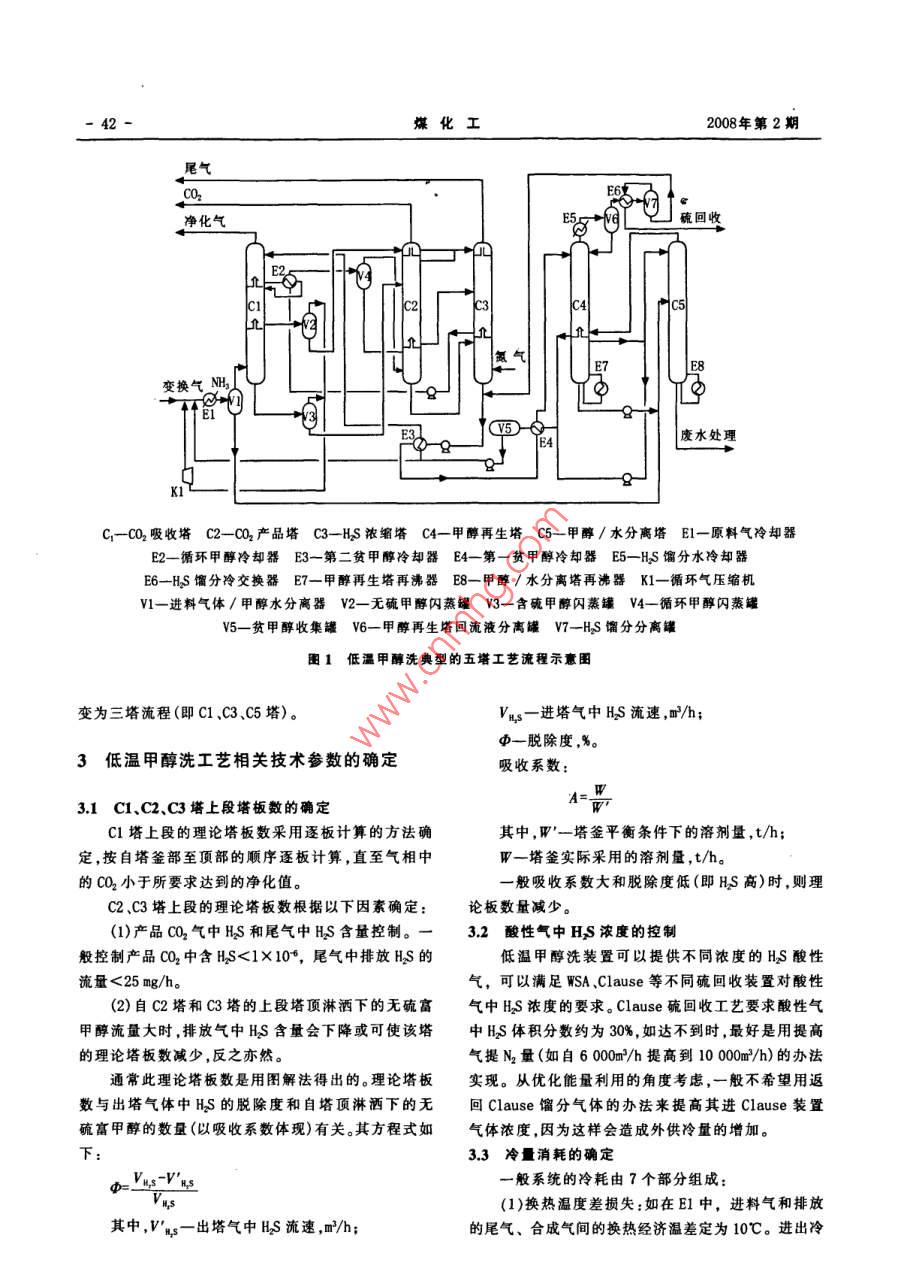 第2期(總第135期)煤化工No.2 (Total No 135)2008年4月Coal Chemical IndustApr.2008NID和低溫甲醇洗酸性氣脫除工藝的比較和選擇劉慶(安徽淮化集團(tuán)有限公司,淮南232038擴(kuò)要簡(jiǎn)述了低溫甲醇洗工藝技術(shù)和ND工藝技術(shù),并將兩種工藝進(jìn)行了技術(shù)經(jīng)濟(jì)比較,以安徽淮化集團(tuán)公司30萬(wàn)t/a合成氨項(xiàng)目為實(shí)例,重點(diǎn)探討了低溫甲醇洗工藝的先進(jìn)性和流程配置的靈活性,介紹了低溫甲醇洗工藝中塔板數(shù)的確定、酸性氣中HS濃度的控制、冷量消耗的控制等方法,結(jié)合整個(gè)合成氨裝置能量利用及消耗的優(yōu)化,對(duì)低溫甲醇洗工藝進(jìn)行了經(jīng)濟(jì)性評(píng)價(jià)。關(guān)鍵詞酸性氣低溫甲醇洗NHD比較工藝文章編號(hào):1005-9598(2008)-02-004004中圖分類(lèi)號(hào):TQ54文獻(xiàn)標(biāo)識(shí)碼:B引言1兩種酸性氣脫除工藝以煤為原料的化工生產(chǎn)決定了粗合成氣中有大11NHD工藝量的酸性氣體,如CQ2、HS、COS等,這些酸性氣體對(duì)合NHD主要成分為聚乙二醇二甲醚,是一種多組分成反應(yīng)是不利的,必須在進(jìn)入合成回路前將其脫除。的配方溶劑。我國(guó)南化公司于1980年開(kāi)始對(duì) Selexol脫硫和脫CO2凈化工序是合成氨生產(chǎn)的主要組成部法進(jìn)行研究,在此基礎(chǔ)上開(kāi)發(fā)成功NHD工藝,1984年分之一,工藝方案的選擇對(duì)于整個(gè)合成氨裝置的經(jīng)濟(jì)其氣體凈化工藝通過(guò)了部級(jí)鑒定。優(yōu)點(diǎn)為能耗低、凈可靠性有著極其重要的影響。隨著煤化工產(chǎn)業(yè)的迅猛化度高操作穩(wěn)定、設(shè)備流程較簡(jiǎn)單,是一種典型的物發(fā)展我國(guó)在合成氣酸性氣體脫除方法及工藝上投入理吸收過(guò)程溶劑的蒸汽壓較低,揮發(fā)性小,不需要在了大量的研究力量。CO2的脫除方法大體上可分為3流程中設(shè)置洗滌回收溶劑的裝置,也不會(huì)對(duì)后工序造類(lèi):化學(xué)吸收法物理吸收法及物理化學(xué)吸收法。對(duì)于成任何損害。長(zhǎng)期的運(yùn)行數(shù)據(jù)也表明,溶液的損耗很以煤為原料的合成氨原料氣,含有大量的CO2(高達(dá)低,相當(dāng)于熱鉀堿液的1/15。其技術(shù)適合于硫化物和45%左右),則以物理吸收法能耗較低而被各方推薦。C2含量較高的煤制氣的凈化,因此,ND工藝在化肥近幾年,加壓煤氣化工藝,如德士古水煤漿加壓氣化工業(yè)煤化工、碳一化學(xué)領(lǐng)域的應(yīng)用具有廣闊的前景。工藝、Shel1粉煤加壓煤氣化工藝,配套的酸性氣體12低溫甲醇洗工藝脫除工藝主要有南化公司開(kāi)發(fā)的聚乙二醇二甲醚法低溫甲醇洗法( Rectisol法)是20世紀(jì)50年代(NHD)工藝和魯奇、林德公司開(kāi)發(fā)的低溫甲醇洗工藝。初由德國(guó)林德公司和魯奇公司聯(lián)合開(kāi)發(fā)的,主要用于低溫甲醇洗法與ND法所選溶劑對(duì)HSCO2選擇性吸從變換氣中提取高純度的氫氣,從裂解氣中提取乙收能力強(qiáng),在溶劑中C2溶解度大,所需溶劑循環(huán)量炔,從鼓風(fēng)爐煤氣中回收高純度的CO2,從CH4中分離小,能耗較低,在硫化物和c2含量高的煤制氣的凈c品2,以及從焦?fàn)t氣中分離苯和環(huán)戊烯等。低溫甲醇洗化過(guò)程逐漸顯示出優(yōu)勢(shì)。法是典型的物理吸收,優(yōu)點(diǎn)是隨著系統(tǒng)操作壓力的提高,循環(huán)量會(huì)大大減少,可以脫除合成氣中多種雜質(zhì)在-30℃~-70℃的低溫下,甲醇能同時(shí)脫除氣體中收稿日期:2007-12-14HS、C0S、CS、CQ2、NO等,所吸收的雜質(zhì)可以在再生過(guò)作者簡(jiǎn)介:劉慶(1973-),男,1998年畢業(yè)于浙江工業(yè)程中加以回收,氣體凈化度高,凈化氣體中總硫含量大學(xué)化學(xué)工程專(zhuān)業(yè),工程師,主要從事化工生產(chǎn)技術(shù)管理可脫至0.1×106以下,CO2可凈化到10×106以下與開(kāi)發(fā)工作。溶劑具有較高的選擇性,CS和HS在低溫甲醇中的2008年4月劉慶:NHD和低溫甲醇洗酸性氣脫除工藝的比較和選擇41溶解度分別比C2高3倍和6倍左右,所以酸性氣的同的HS酸性氣,滿(mǎn)足不同硫回收工藝的要求。脫除可以在同一個(gè)吸收塔中進(jìn)行,脫除C0S和HS的13兩種工藝技術(shù)經(jīng)濟(jì)比較溶劑可以采用溶解飽和CQ2的富液,大大降低了溶劑NHD工藝和低溫甲醇洗工藝技術(shù)經(jīng)濟(jì)比較列于循環(huán)量,并分別得到純度極高的2產(chǎn)品氣和濃度不表1。衰1NHD工藝和低溫甲醇洗工藝技術(shù)經(jīng)濟(jì)比較項(xiàng)目NHD工藝低溫甲醇洗工藝備注脫硫脫碳制冷脫硫、脫碳制冷1.裝置能力/td001000100010001000操作壓力/MP3.03.03.0操作溫度/℃2.裝置性能溶液循環(huán)量/m3h501210凈化氣指標(biāo)CO20.2%20×10凈化氣指標(biāo)HS0.1X1063.裝置消耗以噸氨計(jì)低壓蒸汽/kg47050元/t循環(huán)冷卻水/m150.1元/m0.4元/kWh低壓氮?dú)?m30.2元/m3損失原料H/m30.8元4.操作費(fèi)用/元44.14124.726.379.4619.3合計(jì)/元175.165.裝置投資/萬(wàn)元4565304350797821184合計(jì)/萬(wàn)元8115109666.整個(gè)工藝生產(chǎn)成本207.35144.2以噸氨計(jì)操作費(fèi)用/元175.16修理費(fèi)用/元9.92投資×3.5%管理費(fèi)用/元投資×1.0%2低溫甲醇洗工藝在30萬(wàn)ta合成氨項(xiàng)目作壓力。低溫甲醇洗工藝流程配置靈活,典型的工藝流程中的應(yīng)用是五塔流程,示于下頁(yè)圖1。我公司根據(jù)實(shí)際情況,選低溫甲醇洗技術(s