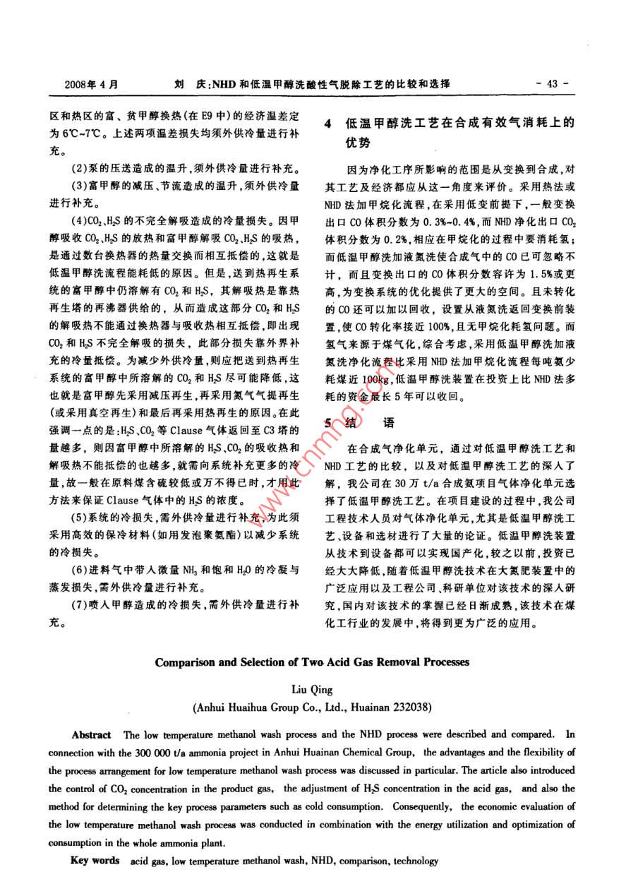 NHD和低溫甲醇洗酸性氣脫除工藝的比較和選擇