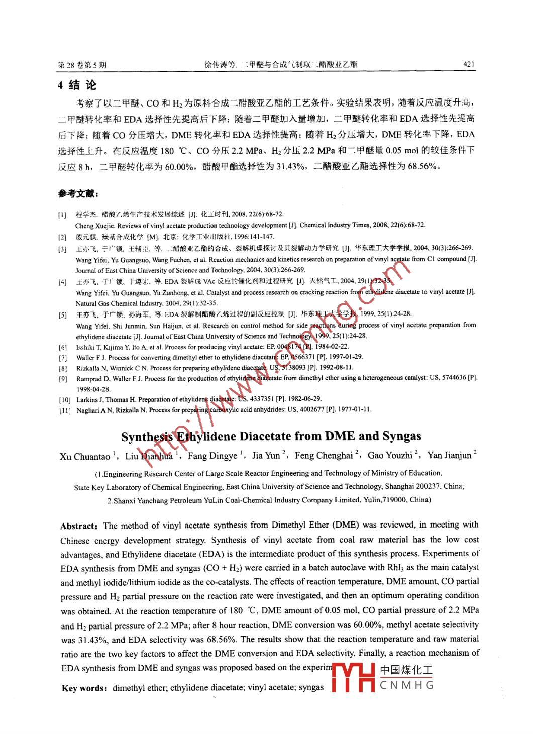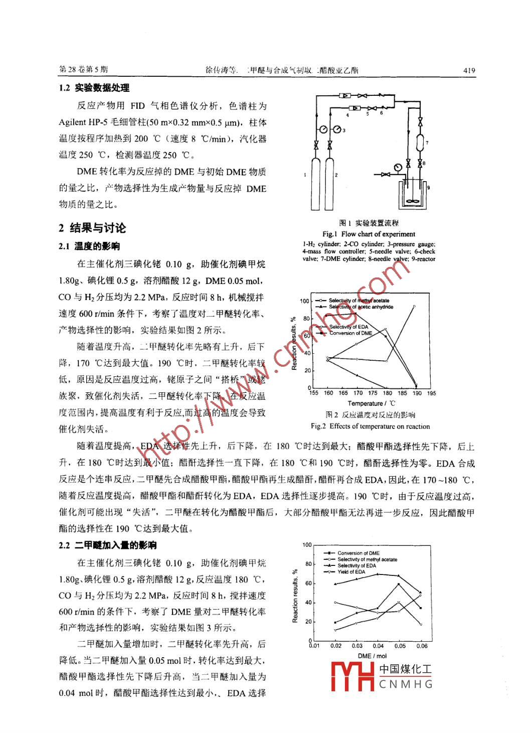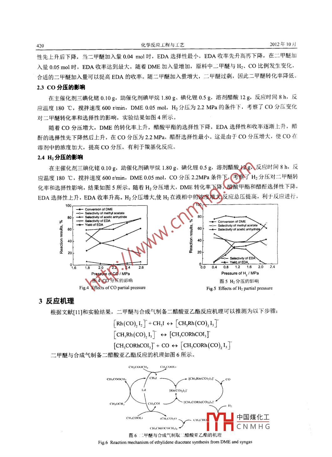 第28卷第5期化學(xué)反應(yīng)工程與工藝Vol 28. No 5012年10月Chemical Reaction Engineering and TechnologyOct 2012文章編號:1001-7631(2012)05041804二甲醚與合成氣制取二醋酸亞乙酯徐傳濤',劉殿華,房鼎業(yè)1,賈云2,馮成海2,高有智2,延建軍2(1.華東理工大學(xué)大型工業(yè)反應(yīng)器工程教育部工程研究中心,化學(xué)工程聯(lián)合國家重點實驗室,上海2002372陜西廷長石油榆林渫化有限公司,陜西榆林719000摘要;以煤為原料合成酷酸乙烯具有成本低的優(yōu)點,二醋酸亞乙酯(EDA)是合成醋酸乙烯的中間產(chǎn)物。在機械攪拌反應(yīng)釜中,采用三碘化銠為上催化劑,碘化鋰和碘甲烷為助催化劑,以二甲醚、CO和H2為原料合成二醋酸亞乙酯,考察了反應(yīng)溫度、二甲醚量、CO分壓和H2分壓對反應(yīng)的影響,在反應(yīng)溫度180℃、CO分壓22MPa、H2分壓22MPa和二甲醚量005mol的條件下反應(yīng)8h,二中醚轉(zhuǎn)化*為6000%,醋酸甲選擇性為3143%,二醋酸亞乙酯選擇性為68.56%,研究結(jié)果表明,反應(yīng)溫度和原料配比對二甲醚轉(zhuǎn)化率和EDA選擇性影響較大,根據(jù)實驗現(xiàn)象,研究了二甲醚與合成氣制取二媾酸亞乙酯的反應(yīng)機理。關(guān)鍵詞:二甲醯二醋酸亞乙酯醋酸乙烯合成氣中圖分類號:TQ031文獻標識碼:A醋酸乙烯是一種重要的有機化工原料凹,目前大部分醋酸乙烯的工業(yè)裝置采用乙烯法,該工藝路線以石油作為原料,隨著石油價格的不斷攀升,醋酸乙烯的生產(chǎn)成本大大提高。我國煤炭豐富,以煤為原料合成醋酸乙烯具有廣闊的應(yīng)用前景。以二甲醚(DME)與合成氣為原料先合成二醋酸亞乙酯(EDA,二醋酸亞乙酯裂解可制得醋酸乙烯和醋酸,反應(yīng)方程式如下:2CH3OCH3+ 4C0+H2-CH3 CH(OOCCH3h +CH3 COOHCH3 CH(OOCCH3h- CH3 COOCH=CH+ CH3COOH該工藝以二甲醚為原料合成醋酸乙烯,與傳統(tǒng)石油路線相比,產(chǎn)品成本低,符合我國的能源發(fā)展戰(zhàn)略。二醋酸亞乙酯為合成醋酸乙烯的重要中間體,空氣產(chǎn)品公司、三菱公司和伊斯曼公司等10以二甲醚、醋酸甲酯或二者的混合物為原料,采用貴金屬如Rh、Pa或Au等為主催化劑,碘甲烷、三苯基磷、溴化鋰或醋酸鋰等為助催化劑,在機械攪拌反應(yīng)釜中合成了二醋酸亞乙酯。二醋酸亞乙酯合成的主要問題有反應(yīng)壓力高、轉(zhuǎn)化率和選擇性低。本研究以三碘化銠為主催化劑,碘甲烷、鋰離子為助催化劑的反應(yīng)體系,采用間歇反應(yīng)方式,系統(tǒng)考察了反應(yīng)溫度、二甲醚量、CO及H2分壓對反應(yīng)的影響,獲得了較佳的工藝條件1實驗部分11實驗裝置及流程二甲醚與合成氣制取二醋酸亞乙酯的反應(yīng)器采用鋯材高壓反應(yīng)釜,工藝流程如圖1所示。稱取一定量催化劑加入到反應(yīng)釜中,一氧化碳和氫氣經(jīng)減壓穩(wěn)壓閥,調(diào)節(jié)到反應(yīng)壓力,通過質(zhì)量流量控制器控制流量進入到反應(yīng)釜中。通過二甲醚罐的稱重,計量二甲醚加入量,然后壓入到反應(yīng)釜中。調(diào)節(jié)反應(yīng)溫度和壓力,反應(yīng)結(jié)束后,泄壓并收集氣體,打開反應(yīng)釜,稱重獲得液體產(chǎn)物的質(zhì)量,分析液體和氣體的組成。中國煤化工收稿日期:201207-16;修訂日期:2012-10-13CNMHG作者簡介:徐傳濤(1986-),男,碩士研究生:劉殿華(1970-),男,教授,通訊聯(lián)系人。 E-mail: dhliuajecust cducn第28卷第5期馀傳濤等.:甲醚與合成氣制取醋酸業(yè)乙酯41912實驗數(shù)據(jù)處理反應(yīng)產(chǎn)物用FID氣相色譜儀分析,色譜柱為Agilent HP5毛細管柱(50m×0.32mm×0.5ym),柱體溫度按程序加熱到200℃(速度8℃/min),汽化器溫度250℃,檢測器溫度250℃C。DME轉(zhuǎn)化率為反應(yīng)掉的DME與初始DME物質(zhì)的量之比,產(chǎn)物選擇性為生成產(chǎn)物量與反應(yīng)掉DME物質(zhì)的量之比。2結(jié)果與討論圖1實驗裝置流程Fig. I Flow chart of experiment21溫度的影響1-H cylinder: 2-CO cylinder, 3-pressure gauge在主催化劑三碘化銠010g,助催化劑碘甲烷valve: 7-DME cylinder, 8-needle valve: 9-reactorl.80g、碘化鋰0.5g,溶劑醋酸12g,DME0.05molCO與H2分壓均為22MPa,反應(yīng)時間8h,機械攪拌Selectivity of methyl acetateSelectivity of acetic anhydride速度600r/min條件下,考察了溫度對甲醚轉(zhuǎn)化率、產(chǎn)物選擇性的影響,實驗結(jié)果如圖2所示,隨著溫度升高,二甲醚轉(zhuǎn)化率先略有上升,后下降,170℃達到最大值。190℃時,二甲醚轉(zhuǎn)化率較低,原因是反應(yīng)溫度過高,銠原子之間“搭橋”或銠族聚,致催化劑失活,二甲醚轉(zhuǎn)化率下降。在反應(yīng)溫5160165170175180185190195度范圍內(nèi),提高溫度有利于反應(yīng)而過高的溫度會導(dǎo)致圖2反應(yīng)溫度對反應(yīng)的影響催化劑失活。Fig 2 Effects of temperature on rcaction隨著溫度提高,EDA選擇性先上升,后下降,在180℃時達到最大;醋酸甲酯選擇性先下降,后上升,在180℃時達到最小值;醋酐選擇性一直下降,在180℃和190℃時,醋酐選擇性為零。EDA合成反應(yīng)是個連串反應(yīng),二甲醚先合成醋酸甲酯,醋酸甲酯再生成醋酐,醋酐再合成EDA,因此,在170-180℃隨著反應(yīng)溫度提高,醋酸甲酯和醋酐轉(zhuǎn)化為EDA,EDA選擇性逐步提高。190℃時,由于反應(yīng)溫度過高,催化劑可能出現(xiàn)“失活”二甲醚在轉(zhuǎn)化為醋酸甲酯后,大部分醋酸甲酯無法再進一步反應(yīng),因此醋酸甲酯的選擇性在190℃達到最大值22二甲醍加入量