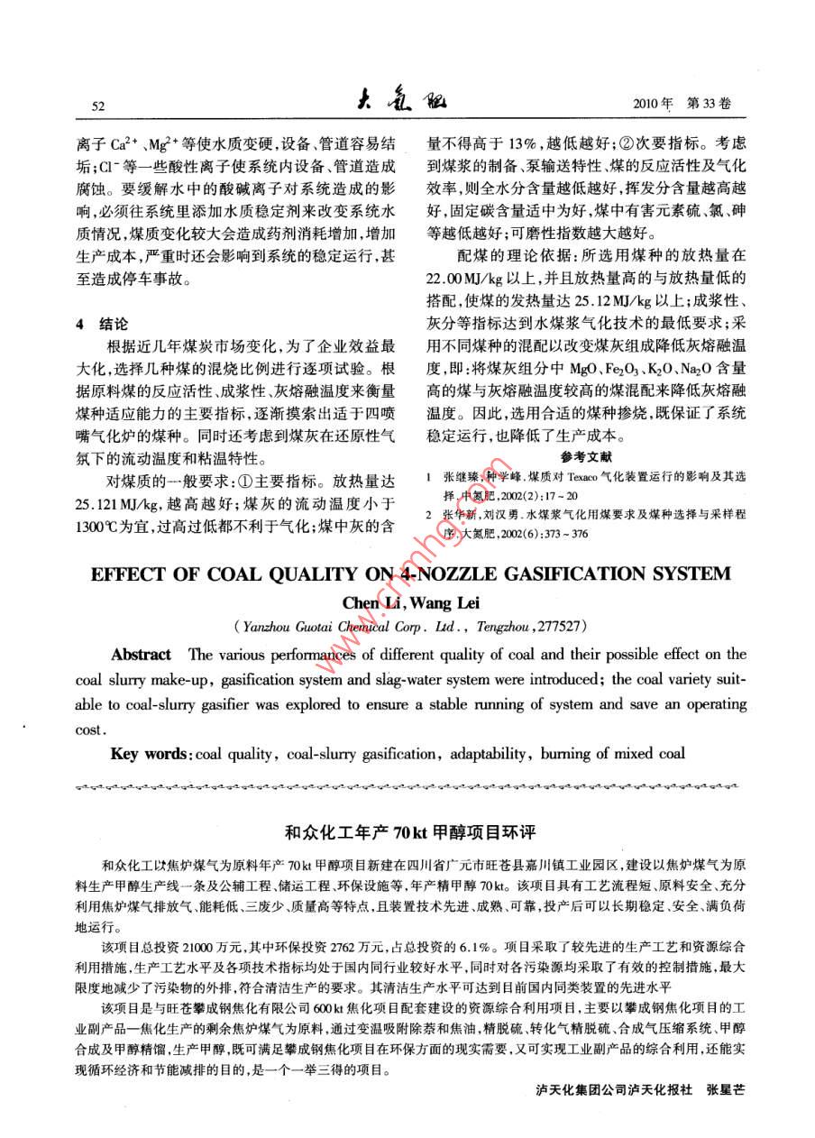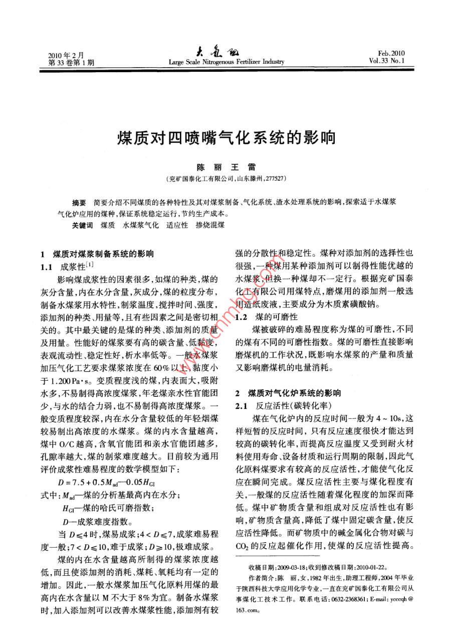 2010年2月大色阻Feb. 2010第33卷第1期Lange Scale Nitrogenous Fertilizer IndustryVol.33 No.1煤質(zhì)對四噴嘴氣化系統(tǒng)的影響陳麗王雷(兗礦國泰化工有限公司,山東滕州,77527)摘要簡要介紹不同煤質(zhì)的各種特性及其對煤漿制備氣化系統(tǒng)、渣水處理系統(tǒng)的影響,探索適于水煤漿氣化爐應(yīng)用的煤種,保證系統(tǒng)穩(wěn)定運(yùn)行,節(jié)約生產(chǎn)成本。關(guān)鍵詞煤質(zhì)水煤漿氣化適應(yīng)性摻燒混煤1煤質(zhì)對煤漿制備系統(tǒng)的影響強(qiáng)的分散性和穩(wěn)定性。煤種對添加劑的選擇性也1.1成漿性[川很強(qiáng),一種煤用某種添加劑可以制得性能優(yōu)越的影響煤成漿性的因素很多,如煤的種類,煤的水煤漿,但換一種煤卻不一-定行。根據(jù)兗礦國泰灰分含量,內(nèi)在水分含量,灰成分,煤的粒度分布,化工有限公司用煤特點(diǎn),磨煤用的添加劑一般選制備水煤漿用水特性,制漿溫度,攪拌時(shí)間強(qiáng)度,用造紙廢液,主要成分為木質(zhì)素磺酸鈉。添加劑的種類、用量等,且有些因索之間是密切相1.2煤的可磨性關(guān)的。其中最關(guān)鍵的是煤的種類、添加劑的質(zhì)量煤被破碎的難易程度稱為煤的可磨性,不同及用量。性能好的煤漿要有高的碳含量、低黏度,的煤有不同的可磨性指數(shù)。煤的可磨性直接影響表觀流動性、穩(wěn)定性好,析水率低等。- -般水煤漿磨煤機(jī)的工作狀況,既影響水煤漿的產(chǎn)量和質(zhì)量加壓氣化工藝要求煤漿濃度在60%以上,黏度小又影響磨煤機(jī)的電量消耗。于1.200Pa.so變質(zhì)程度淺的煤,內(nèi)表面大,吸附水多,不易制得高濃度煤漿,年老煤親水性官能團(tuán)2煤質(zhì)對氣化爐系統(tǒng)的影響少,與水的結(jié)合力弱,也不易制得高濃度煤漿。-.2.1反應(yīng)活性(碳轉(zhuǎn) 化率)般變質(zhì)程度較深,內(nèi)在水分含量較低的年輕煙煤煤在氣化爐內(nèi)的反應(yīng)時(shí)間--般為4~ 10s,這較易制出高濃度的水煤漿。煤的內(nèi)水含量越高,樣短暫的反應(yīng)時(shí)間,只有反應(yīng)速度很快才能達(dá)到煤中0/C越高,含氧官能團(tuán)和親水官能團(tuán)越多,較高的碳轉(zhuǎn)化率,而提高反應(yīng)溫度又受到耐火材孔隙率越大,煤的制漿難度越大。目前較為通用料使用壽命、設(shè)備材質(zhì)和運(yùn)行周期的限制,因此氣評價(jià)成漿性難易程度的數(shù)學(xué)模型如下:化原料煤要求有較高的反應(yīng)活性,才能使氣化反D=7.5 +0.5Mu -0.05Ha應(yīng)在瞬間完成。煤反應(yīng)活性主要與煤化程度有式中:M odr -煤的分析基最高內(nèi)在水分;關(guān),一般煤的反應(yīng)活性隨著煤化程度的加深而降Her-煤的哈氏可磨指數(shù);低。煤中礦物質(zhì)含量和組成對反應(yīng)活性也有影D-成漿難度指數(shù)。響,礦物質(zhì)含量高,降低了煤中固定碳含量,使反當(dāng)D≤4時(shí),煤易成漿;4< D≤7,成漿難易程應(yīng)活性降低。而礦物質(zhì)中的堿金屬化合物對碳與度-般;7< D≤10,難于成漿;D≥10,極難成漿。CO2的反應(yīng)起催化作用,使煤的反應(yīng)活性提高。煤的內(nèi)在水含量越高所制得的煤漿濃度越收稿8期:2009-03-18;收到修改稿日期201-22。低,而且使添加劑的消耗、煤耗氧耗均有一定的作者簡介:陳麗,女,1982 年出生,助理工程師,004年畢業(yè)增加。因此,一般水煤漿加壓氣化原料用煤的最于陜西科技大學(xué)應(yīng)用化學(xué)專業(yè),一直在兗礦國泰化工有限公司從高內(nèi)在水含量以M不大于8%為宜。制備水煤漿事煤化工技術(shù)工作。聯(lián)系電話: 0632-2368361; E-mail: ycqph @時(shí),加入添加劑可以改善水煤漿性能,添加劑有較163. com。第1期陳麗等.煤質(zhì)對四噴嘴氣化系統(tǒng)的影響51煤的反應(yīng)活性隨溫度的升高而增加。原料煤的灰熔點(diǎn)太低,由于生產(chǎn)條件下煤灰的黏2.2渣對氣化爐耐火材料的腐蝕性度降低,也會加劇對耐火磚的侵蝕。較低灰熔點(diǎn)腐蝕性渣可導(dǎo)致耐火材料襯里蝕損率高,即的煤種可以通過配煤來解決。使在最佳操作溫度下也是如此,耐火磚蝕損率隨2.4灰的粘溫特性溫度增加而加快。因氣化爐耐火材料價(jià)格非常黏度是衡量流體流動性能的主要指標(biāo),要實(shí)高,所以選擇沒有腐蝕性渣的煤作為氣化原料,并現(xiàn)氣化溫度下灰渣以液態(tài)順利排出氣化爐,黏度且在較低的溫度下操作,使耐火材料的蝕損率降應(yīng)在合適的范圍之內(nèi),既要保證在耐火磚表面形到最小,以延長氣化爐的運(yùn)行周期。成有效的灰渣保護(hù)層,又要保持一定的流動性。一般高鋁質(zhì)(A1203)向火面耐火磚容易受到根據(jù)國內(nèi)外對液態(tài)排渣鍋爐的研究表明,灰渣黏熔渣侵蝕,因?yàn)槿墼幸埠邢喈?dāng)量的Al203。度應(yīng)在25 ~ 40Pa*s方可保證順利排渣,水煤漿氣熔渣中含的CaO及Fe2O3 組分侵人耐火磚,與耐化爐在操作溫度下灰渣黏度控制在25 ~ 30Pa.s火磚中的MgO組分生成MgFe204,后者的耐磨損為宜。影響灰渣黏度的主要因素是煤灰的組成,性比MgO低。--般認(rèn)為,耐火磚中的尖晶體即灰成分。煤灰的主要礦物質(zhì)成分是Al203、MgAl2O4對熔渣的侵蝕作用具有一定的抵御性。SiO2、MgO等,研究表明:A1203是渣灰熔點(diǎn)升高、然而,熔渣中的Fe2O3侵人磚, Fe3+取代了耐火磚黏度變差的主要成分。Al2O3 含量越高,煤灰的中的AI+,這種置換作用導(dǎo)致磚體膨