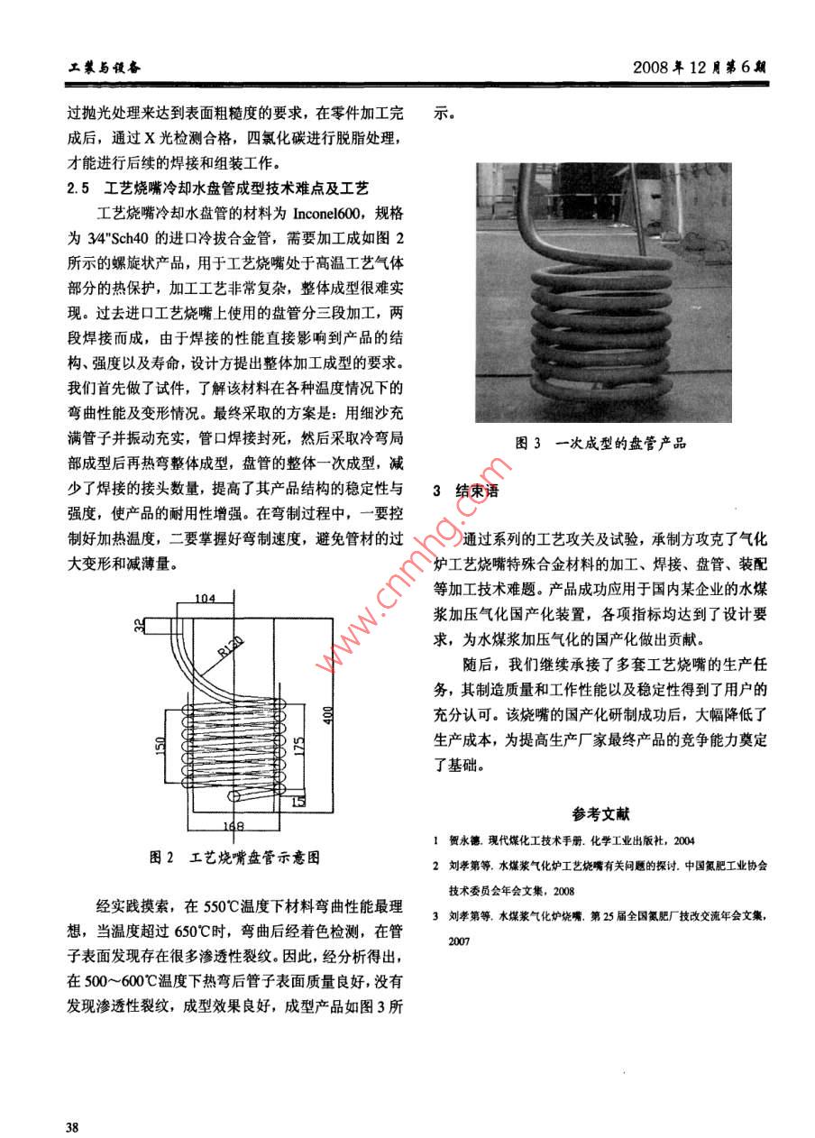 工與設(shè)舂2008旱12周第6期設(shè)備水煤漿氣化爐工藝燒嘴加工技術(shù)研究首都航天機械公司邱友志摘要介紹了水煤漿氣化爐工藝燒嘴主體材料的焊接技術(shù)難點,經(jīng)過對焊接工藝的分析與實驗,確定了完整的工藝方案和實施細則,研究了工藝燒嘴的裝配工藝與工藝燒嘴冷卻水盤管的成型工藝,進而解決了加工技術(shù)難題,填補了國內(nèi)工藝燒嘴生產(chǎn)的空白關(guān)鍵詞工藝燒嘴焊接工藝裝配工藝引言制要求也非常嚴格。若裝配整體尺寸及精度達不到圖紙要求,就會對供應(yīng)的水煤漿流量、氧氣流量、水煤隨著煤化工技術(shù)的不斷發(fā)展,煤炭作為化工原料漿的霧化、燒嘴的火焰形狀造成影響,直接影響整個的比重不斷提高。煤氣化所產(chǎn)生的合成氣,成為氮肥、氣化爐的工作。因此,整臺工藝燒嘴組裝后,需進行甲醇、二甲醚、醋酸等過去主要依賴石油化工產(chǎn)品的嚴格的裝配尺寸和公差檢查,并進行8~18MPa液主要原料,該技術(shù)途徑也成為國內(nèi)目前煤化工的主要壓及氣密試驗,完全合格后方可交付使用項目。水煤漿加壓氣化技術(shù)由于氣化爐壓力髙、煤種適應(yīng)性寬、投資小,越來越受到煤氣化行業(yè)的關(guān)注,2工藝燒嘴的焊接與裝配工藝已經(jīng)成為國內(nèi)煤加壓氣化的主流。工藝燒嘴作為水煤漿加壓氣化技術(shù)的關(guān)鍵設(shè)備之一,目前國內(nèi)在用的設(shè)2.1工藝燒嘴材料的焊接技術(shù)難點分析備已超過300臺。工藝燒嘴的主體材料為 Inconel600和UMCo-50該工藝燒嘴是由內(nèi)、中、外噴嘴和盤管組成,燒(或GH88),熱導率低,線膨脹系數(shù)較大,焊接時嘴主體材料一般選用 Inconel600和UMCo50(或在熔池表面容易形成高熔點氧化物,且覆蓋在熔池表GH188)。其中 nonel600合金是一種高Nir合金,面,使熔化的金屬流動不充分,焊工難以有效地控制N和Cr的總含量超過70%,是標準的耐熱、耐腐蝕熔池形態(tài)與大小,在焊接過程中產(chǎn)生的熱量冷卻后焊的工程材料,在高溫環(huán)境和腐蝕環(huán)境中具有極好的抗縫處又會形成較大的拉應(yīng)力,容易出現(xiàn)裂紋,氧化性能。UMCo50(或GH188)屬于鈷基合金材料,2.2工藝燒嘴的焊接工藝具有優(yōu)異的抗高溫氧化性能和耐磨性,該合金使用溫由于沒有接觸過這兩種材料,在承擔該項任務(wù)度范圍為650~1100℃。由于工藝燒嘴在1200~后,承制單位進行了一系列技術(shù)討論和工藝研究,同1500℃高溫及腐蝕工藝氣體中工作,材料的選擇非常時對材料的加工性能和焊接性能進行了多次實驗和重要,同時要有良好的冷卻條件保證其長周期的連續(xù)驗證,最終確定了完整的工藝方案和實施細則。工藝運行燒嘴采用手工鎢極氬弧焊,封底焊時采用背面充氬氣工藝燒嘴也是一個高壓構(gòu)件,使用壓力一般為保護,嚴格控制焊接的速度和熔池的深度。焊接坡口4~8MPa。它上面五個管口全部是熔焊連接而成,由形式為U形坡口,用成型刀機械加工而成,鈍邊1.0于使用條件的需要,對于裝配、定位過程中尺寸的控1.5mm,間隙05mm。并對坡口表面做100%PT檢簡介:邱友志(1964),高級技師,機械制造專業(yè);研究方向:彈頭鉚接裝配日期:2008-1120工裴與設(shè)舂航天制造技術(shù)查,確認坡口表面無裂紋、夾渣等缺陷后,用丙酮清過程中保證組件的各項指標,組裝過程中制作工裝等洗施焊區(qū)域,除去施焊區(qū)域內(nèi)的油跡、污水、記號筆方面均缺一不可。印痕等,用無塵袋進行封存,在焊接前保護坡口的清如在加工和組合工藝燒嘴內(nèi)、中、外噴嘴組件時潔性。焊接采用的焊絲為N82,直徑φ25mm。焊前出現(xiàn)尺寸和位置公差不符合設(shè)計要求的情況,將會影用丙酮清洗干凈。在每次焊接實施之前,對已有的焊響工藝燒嘴的最終技術(shù)狀態(tài)。為了保證整臺燒嘴的最縫表面用鋼絲刷進行清理,除去臟物和氧化皮,保證終質(zhì)量,我們制定了嚴格的工藝路線,層層把關(guān),將兩次焊縫之間的熔接質(zhì)量。技術(shù)要求分解,從零件到組件,各項尺寸公差和位置焊接工件的設(shè)定預(yù)熱:一般不需預(yù)熱,當環(huán)境溫公差均在制定的范圍之內(nèi),確保在組裝工裝的輔助度低于15℃時,應(yīng)對接頭兩側(cè)200~300mm范圍內(nèi),下,滿足整臺設(shè)備的最終要求預(yù)熱到50~100℃。預(yù)熱后焊接參數(shù)選定在}=100~2.4工藝燒嘴加工裝配工藝160A之間,電弧電壓在U=4~2V之間選取,氣體工藝燒嘴的整體要求是:安裝長度(包括墊片)流量為5~10/min,確保焊縫產(chǎn)生熱量的數(shù)值,避免允差±2mm,垂直度全長允差±lmm,同心度允差裂紋的生成±0.5mm,方位角度允差±1.5mm。所以在制作裝配工同時,由于 Inconel600和UMCo50(或GH188)裝時,我們制定的保證條件是:角度限位的方位偏差各自的焊接和相互的焊接變形量(主要是收縮量)有不大于±10,垂直度公差不大于05mm,同心度公差差異,因此在零件的加工時要預(yù)留變形量,以保證組不大于±0.3mm。在工藝燒嘴的組裝工裝組焊、加工完合件的最終尺寸和加工量。成后,進行各方面數(shù)據(jù)的檢測、校正,以達到圖紙的2.3工藝燒嘴裝配工藝技術(shù)難點分析要求。在工藝燒嘴整體裝配時還要特別注意裝配先后組裝工藝燒嘴時,能否保證內(nèi)、中、外噴嘴之間順序的安排、整體高度、各個管接口的方位及預(yù)留量,的位置關(guān)系以及法蘭盤相對于噴嘴的位置關(g