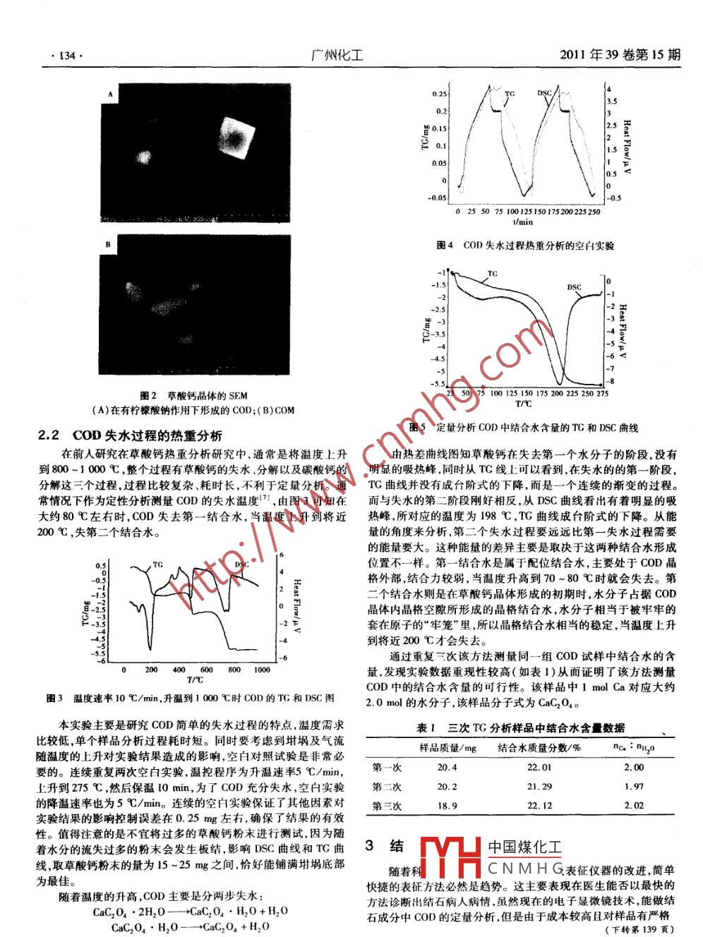 20l1年39卷第15期廣州化工133體外合成二水草酸鈣及其失水過程的熱重分析研究陶菲,陳安良(武漢理工大學(xué)理學(xué)院化學(xué)系,湖北武漢430070)摘要:通過體外礦化合成一水草酸鈣(COM)和二水草酸鈣(COD)晶體,并用XRD和SEM進(jìn)行表征。同時(shí)同步熱重分析研究二水草酸鈣失水過程的特點(diǎn)。結(jié)果表明:COD首先失去的是配位結(jié)合水,隨著溫度的進(jìn)一步升高,失去晶格結(jié)合水。同時(shí)進(jìn)一步驗(yàn)證該熱重分析方法可定量分析COD真實(shí)的含水量的。關(guān)鍵詞:熱重分析;水草酸鈣;二水草酸鈣;結(jié)合水Thermal Analysis of Vitro Synthesis of COD and its Water lossTAO Fei, CHEN An-liangDepartment of Chemistry, School of Science, Wuhan University of Technology, Hubei Wuhan 430070, China)Abstract: Calcium oxalate monohydrate and calcium oxalate dihydrate( COD)crystals were sythesized by mineralization in vitro, which were characterized via XRD and SEM. Meanwhile, application of simultaneous thermal analysisproved that COD water loss was first of coordination water, and then was the lattice water with the increased temperatureFurthermore. this method can determinate the real content of bound water in CODKey words: thermal analysis COM COD bound water人體腎結(jié)石的主要成分是草酸鈣水合物分別是CaCO4·H2QO將所得沉淀過濾,水洗3次,然后純洗3次,放在40℃烘箱中充(COM)和CaCO,·2H2O(COD),從外科手術(shù)得到的人體結(jié)石表分干燥。用XRD、SEM對(duì)其進(jìn)行表征,并用TG對(duì)其進(jìn)行熱力學(xué)明,在通常情況下結(jié)石中COM的含量是COD含量的兩倍多,所分析。實(shí)驗(yàn)所用藥品均為化學(xué)用分析純。以能夠分辨出病人結(jié)石中COM和COD,這對(duì)于臨床醫(yī)師來說顯得非常的重要"。通過生物礦化過程傷生實(shí)驗(yàn),對(duì)理解生命體2結(jié)果與討論的內(nèi)有無機(jī)離子結(jié)晶過程有著重要的指導(dǎo)意義121,所以很多研究者開始通過體外實(shí)驗(yàn)?zāi)M合成人體腎結(jié)石主要無機(jī)組成部分2.1COD的表征以及與COM的對(duì)比同樣具有參考價(jià)值和指導(dǎo)意義。人體腎結(jié)石的主要成分是一水對(duì)所得的沉淀用XRD進(jìn)行物相分析(如圖1),通過對(duì)比草酸鈣水合物(COM),還有少量的二水草酸鈣(COD,熱力學(xué)穩(wěn)XRD的標(biāo)準(zhǔn)PDF卡片,可以證明所合成的的物質(zhì)為一水草酸鈣和定性較COM差)通過研究發(fā)現(xiàn)人體腎結(jié)石中含有少量的熱力二水草酸鈣。通過圖2中COM和COD的表面形貌的對(duì)比可知學(xué)不穩(wěn)定的三水草酸鈣(Cor)3。由于COM和COD晶體在某COM的形貌主要為菱片狀,具有較大的比表面,而COD主要是四些晶面尺寸電荷密度等存在差異,COM較COD與腎小管細(xì)胞雙錐形狀,從宏觀的性質(zhì)表現(xiàn)為COD具有很好的分散性,COM有較強(qiáng)的親和力4。同時(shí)由于COM和COD在晶體結(jié)構(gòu)上的不剛好相反很容易發(fā)生團(tuán)聚易對(duì)腎小管壁細(xì)胞發(fā)生粘附。同,導(dǎo)致兩者在失水過程中所表現(xiàn)的明顯的差異,所以能夠利用COM和COD的物理和化學(xué)性質(zhì)上的不同來分辨出病人結(jié)石中COM和COD,同時(shí)有文獻(xiàn)報(bào)道COD中是1 mol CaC2O4中對(duì)應(yīng)20-2.5mol的水分子。1實(shí)驗(yàn)常溫下用0.01 nol/L CaCI2溶液和0.01 mol/L NaC2O4溶液在pH=7.2的ris緩沖液中,在有磁攪拌作用下,放置一夜。然后將所得的沉淀過濾,蒸餾水洗3次,再用乙醇洗3次,在40℃烘箱中充分十燥。在XRD以及SEM表征所得顆粒為COM。中國煤化工在濃度為0.001mo/L檸檬酸的溶液中,分別加入0.01CN MH GRDmo/ L CaCI2和0.0lmol/LNaC2O4,磁攪拌作用下放置一晚上。作者簡介:陶菲(1988-),男,碩士研究生。E-ma435517903@qcom陳安良(1987-),男,碩土研究生。E-mail:chenanliangl98@yahoo.cn廣州化工2011年39卷第15期1.50255075100125150175200225250圖4COD失水過程熱重分析的空白實(shí)驗(yàn)圖2草酸鈣品體的SEM2550751001251501752002252(A)在有檸檬酸鈉作用下形成的COD;(B)COM22coD失水過程的熱重分析圖5定量分析COD中結(jié)合水含量的TG和DSC曲線在前人研究在草酸鈣熱重分析研究中,通常是將溫度上升由熱差曲線圖知草酸鈣在失去第一個(gè)水分子的階段,沒有到800-1000℃,整個(gè)過程有草酸鈣的失水、分解以及碳酸鈣的明顯的吸熱峰,同時(shí)從TC線上可以看到,在失水的的第一階段分解這三個(gè)過程,過程比較復(fù)雜、耗時(shí)長,不利于定量分析。通TC曲線并沒有成臺(tái)階式的下降,而是一個(gè)連續(xù)的漸變的過程常情況下作為定性分析測(cè)量COD的失水溫度,由圖3可知在而與失水的第二階段剛好相反,從DSC曲線看出有著明顯的吸大約80℃左右時(shí),COD失去第一結(jié)合水,當(dāng)溫度上升到將近熱峰,所對(duì)應(yīng)的溫度為198℃,TG曲線成臺(tái)階式的下降。從能200℃,失第二個(gè)結(jié)合水。量的角度來分析,第二個(gè)失水過程要遠(yuǎn)遠(yuǎn)比第一失水過程需要的能量要大。這種能量的差異主要是取決于這兩種結(jié)合水形成位置不一樣。第一結(jié)合水是屬于配位結(jié)合水,主要處于COD晶格外部,結(jié)合力較弱,當(dāng)溫度升高到70~80℃時(shí)就會(huì)失去。第5二個(gè)結(jié)合水則是在草酸鈣晶體形成的初期時(shí),水分子占據(jù)COD晶體內(nèi)晶格空隙所形成的晶格結(jié)合水,水分子相當(dāng)于被牢牢的套在原子的“牢籠”里,所以晶格結(