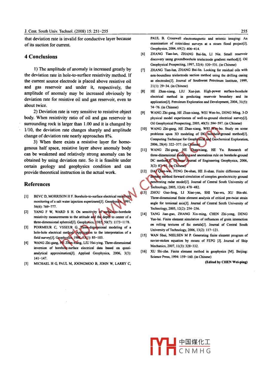 J Cent. South Univ. Technol. (2008)15: 251-255Do:10.1007/sll771-008-0047-2Application of deviation rate in oil and gas reservoir explorationTANG Jing-tian(湯井田), ZHANG Ji-feng(張繼鋒), FENG Bing(馮兵), WANG Ye(王燁)(1. School of Info-physics and Geomatics Engineering, Central South University, Changsha 410083, China;2. College of Geology Engineering and Geomatics, Chang'an University, Xi'an 710054, China)Abstract: Three dimensional geophysical models were abstracted and established according to characteristics of oil and gas reservoirThen direct current fields for different models were simulated with finite element software( finite element program generator) byhole-to-surface resistivity method. Numerical solution was compared with analytical one for the homogeneity earth model. And anew parameter of deviation rate was proposed by analyzing different plot curves. The results show that the relative error of solutionfor homogeneity earth model may attain to 0.043%. And deviation rate decreases from 18%to 1%and its anomaly range becomeswide gradually when the depth of oil and gas reservoir increases from 200 to 1 500 m. If resistivity ratio of oil and gas reservoir tosur-rounding rock decreases from 100 to 10 for the resistive oil and gas reservoir, the amplitude attenuation of deviation rate nearlyreaches 8%. When there exists stratum above oil and gas reservoir, and influence of resistive stratum may be eliminated or weakenedand anomaly of oil and gas reservoir can be strengthened.Key words: numerical simulation; deviation rate; oil and gas reservoir; hole-to-surface resistivity method; finite element progranprofiling method to find deep resistive oil and ga1 Introductionreservoir and determined its border. he and LIUemployed hole-to-surface method to transmit the variedIt has been an arduous duty for a long time for squared wave current, referred the case of oil and gaspetroleum prospecting workers to enhance the success reservoir and located its range and border according toratio of drilling hole, speed up the exploration pace and layer resistivity and layer polarization, and achievedreduce the exploration cost. Still, effective method is effective results. WANG et al9-ll implemented waterstarved for solving special modality of the complex oil trough simulation, in which power was supplied throughand gas reservoir, which results in many wells deserted. the steel tube well, and studied the anomaly rule of theSo in this paper deviation rate was proposed and used to ground isoclines, which provided physical base toimprove exploration ability for oil and gas reservoir.determine the distributed scope of different reservoirsBecause oil and gas reservoir is generally buried atMany problems on geophysics have not analyticaldeep place on the subsurface, surface electrical resistivity solutions, so numerical simulation of finite elementmethod does not work well Hole-to-surface method becomes a popular and effective method to solvein which the point source is placed at the near target them[12-14). In this work, direction current fields forregion in a hole can detect anomalous body and different models were simulated by finite elementmaximize signal about inhomogeneous body in the program generator), and a new parameter of deviationvicinity of a borehole, so it is an effective method to rate was proposed by analyzing different plot curvesexplore for deep objects/2-. This method has beenresearched by many scholars. In 1958, Russian 2 Theoryimplemented this method to determine horizontalboundary of the coal bed, and carried out some field test 2. 1 Definition of deviation rateresearches and yielded the preliminary results. BEVCFig. I shows the basic principle of hole-to-surfaceand MORRISON made a salt water injection resistivity method. a current source electrode is placed atexperiment by bore-to-surface electrical resistivity the appropriate location that is either under oil and gasmethod. ZHANG et al6- discovered small reservoir in reservoir or above it in a well, while the other is placed atSinkiang using groundborehole trielectrode gradient "infinity". Electrical potential is acquired by electrode Mmethod and proposed a non-boundless trielectrode on the ground when plot lines are at the center of the中國(guó)煤化工Foundation item: Projects(2006AA06Z105, 2007AA06Z134)supported by the National二 ogran of ChinaReceived date: 2007-06-25: Accepted date: 2007-07-30CNMHGCorresponding author: ZHANG Ji-feng, Doctoral candidate; Tel: +86-13467538541: E-mtaJ. Cent. South Univ. Technol. (2008)15: 251-2552.2 Weak solution integral form of differentialdirect current fieldIn the rectangular Cartesian coordinate system, thetensional partial differential aquaticdirect current field isat[ a/*a,au),al,aua auwhere a is conductivity, U is electrical potential, I isnents of point A.1)roo, U-0, where r is distance between currentsource point and receiver point. Electrical potential atinfinity "is equal to zeroHole0, where Jn is current densityp is resistivity. The current density at normal componenton the ground is equal to zeroThe interior boundary condition is the naturalFig. I Schematic diagrams of hole-to-surface resistivity methodundary condition, so it is not considered here(M--Electrical electrode of measurement; P.AppareLaplacian equation is applied in the solution domainresistivity; A-Point source):(a)Section view:(b)Plane view except the point source, therefore, Eqn. (2)becomesmouth of a well. This method can detect deep anomaly a ax ol d a dzbody on the subsurface by apparent resistivity anomaliesIn order to analyze the difference of a current sourceAccording to variational principle, Eqn. 3)mayelectrode placed under oil and gas reservoir and above it,become its weak solution integral forma new parameter of deviation rate( @)is defined aad au ad au adUdv=0(4)2.3 Numerical calculation and error analysiswhere Psa and Psu are the apparent resistivities when aA three dimensional computational 