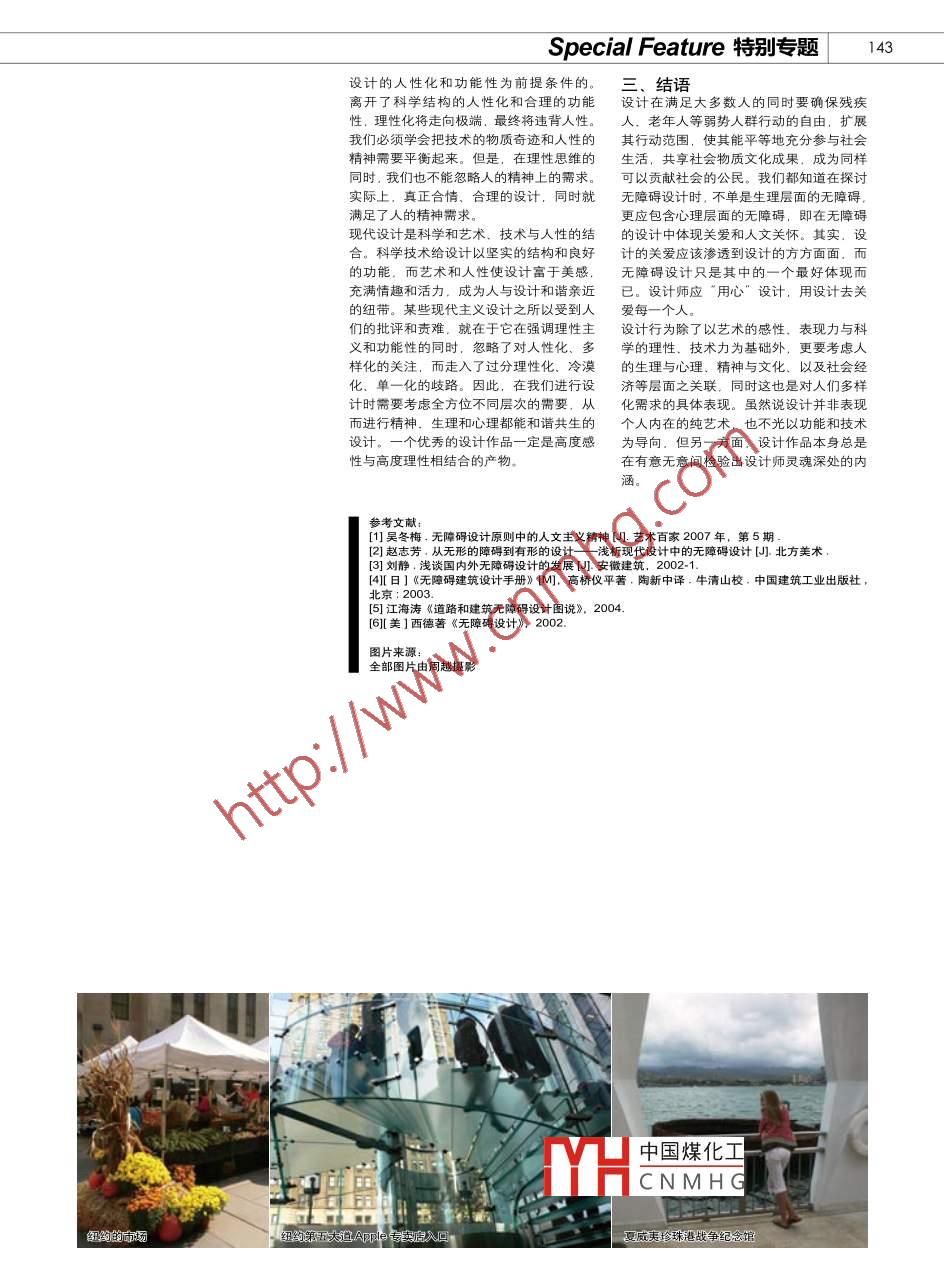 140特別專題Special Feature論文POINTOF VE關(guān)愛設(shè)計(jì)Love CaringDesign I周越高級(jí)建筑裝飾設(shè)計(jì)師北京林業(yè)大學(xué)藝術(shù)設(shè)計(jì)系副教授碩士生導(dǎo)師曾任中信室內(nèi)裝修工程公司主任設(shè)計(jì)師高國(guó)棟北京林業(yè)大學(xué)藝術(shù)設(shè)計(jì)系研究生劉媛欣設(shè)計(jì)的關(guān)愛Care in Designs摘要:本文以無(wú)障礙設(shè)計(jì)為契機(jī)重點(diǎn)闡述設(shè)計(jì)性靈的實(shí)質(zhì)是關(guān)愛的設(shè)計(jì)。通俗地說(shuō)是在設(shè)計(jì)層面上通過(guò)平等參與、合理規(guī)劃、操作方便、設(shè)施齊備等人文關(guān)懷理念去體現(xiàn)對(duì)作為個(gè)體的人的深層次的關(guān)愛。通過(guò)為社會(huì)特殊群體的實(shí)際需求而設(shè)計(jì)的探討,不僅僅停留在以人為本的設(shè)計(jì)理論上,單純以提升人們的生活品質(zhì)為目的。而是融入到當(dāng)今社會(huì)的建設(shè)和發(fā)展的時(shí)代浪潮中.體現(xiàn)設(shè)計(jì)中本質(zhì)的關(guān)愛和人文情懷。提出“用心”設(shè)計(jì),用設(shè)計(jì)關(guān)愛每一個(gè)人。關(guān)鍵詞:設(shè)計(jì)關(guān)愛性靈無(wú)障礙設(shè)計(jì)談到設(shè)計(jì)的關(guān)愛,,很容易讓人想到當(dāng)代對(duì)的關(guān)注.是對(duì)人的關(guān)心、愛護(hù)和尊重。這無(wú)障礙設(shè)計(jì)的研究.主要包括對(duì)無(wú)障礙設(shè)是社會(huì)文明進(jìn)步的標(biāo)志,是人類自覺意識(shí)計(jì)的使用范圍和使用功能方面的研究.多提高的反映。人文關(guān)懷下的關(guān)愛思想著眼數(shù)是應(yīng)用方面的涉獵.體現(xiàn)了現(xiàn)實(shí)生活中于對(duì)生命關(guān)懷,注重.人的存在、人的價(jià)值.針對(duì)少數(shù)弱勢(shì)人群的問(wèn)題,為他們的生活尤其是人的心靈、精神和情感。人文關(guān)懷提供便利。但對(duì)無(wú)障礙設(shè)計(jì)所體現(xiàn)的精神的具體體現(xiàn)就是無(wú)障礙設(shè)計(jì)所追求的對(duì)人層面問(wèn)題,及其所反映出來(lái)的設(shè)計(jì)方面廣的心理、情感方面的關(guān)注。而無(wú)障礙設(shè)計(jì)義的思考卻不多。當(dāng)社會(huì)經(jīng)濟(jì)水平達(dá)到一原則,恰恰體現(xiàn)了人文關(guān)懷中對(duì)人的尊重定程度時(shí).消費(fèi)者會(huì)對(duì)設(shè)計(jì)產(chǎn)生更高要求,與熱愛.對(duì)人的價(jià)值的肯定。而我們這里除實(shí)用之外,會(huì)包含越來(lái)越多的心理和精伊 利諾伊州理工學(xué)院UIT) 學(xué)生活動(dòng)中心所談的關(guān)愛又不僅僅局限于此,而是包括神的需求。本文主要以無(wú)障礙設(shè)計(jì)為契機(jī).談到關(guān)愛,不得不談到“人文” 與“ 人文在設(shè)計(jì)出發(fā)點(diǎn)、 過(guò)程以及最終成果中所反從設(shè)計(jì)師的角度探討設(shè)計(jì)性靈的實(shí)質(zhì)。關(guān)懷”?!叭宋摹?一詞最早發(fā)源于古希臘哲映出的對(duì) 人的情感。一. 設(shè)計(jì)性靈的實(shí)質(zhì)是關(guān)愛學(xué),發(fā)展于文藝復(fù)興,是與人的價(jià)值、人(二)、設(shè)計(jì)應(yīng)該是深層次的關(guān)愛(一)、性靈與關(guān)愛的含義的尊嚴(yán)、人的獨(dú)立人格、人的個(gè)中國(guó)煤化工除了物理層次上的滿本文這里的性靈是指精神、性情、情感。生存和生活、 以及生活與生存的社會(huì)的深層次因素人需要陶冶性情,設(shè)計(jì)同樣需要陶冶性想與命運(yùn)等密切相關(guān)。而”人文TYHC N M H G用的工具對(duì)社會(huì)特殊靈。換句話說(shuō),設(shè)計(jì)應(yīng)該是對(duì)人類性靈對(duì)人的生 存狀況的關(guān)懷.是對(duì)人的尊嚴(yán)與”群體形成新的 障好” 時(shí), 他們不得不依的深層次的關(guān)愛,而設(shè)計(jì)作品的本身又符合 人性的生活條件的肯定.是對(duì)人類的賴他人來(lái)尋求幫助, 失去了自主參與的能是設(shè)計(jì)師性靈深處的體現(xiàn)。解放與自由的追求,是對(duì)人的生存與發(fā)展力. 如果這樣長(zhǎng)期發(fā)展不利于社會(huì)特殊人Special Feature特別專題[Inr學(xué)生活動(dòng)中心內(nèi)部美國(guó)聽濤別墅西部波上頓的路燈群的生理和心理方面的健全發(fā)展。因此人的,它需要設(shè)計(jì)師的全面規(guī)劃和人性化文關(guān)懷下提倡的無(wú)障礙設(shè)計(jì)不僅是在設(shè)計(jì)考量。 簡(jiǎn)單地說(shuō),這是一種設(shè)身處地為的功能和性能上關(guān)愛殘障人士,更重要的他人 著想、將功能與藝術(shù)完美結(jié)合的人是通過(guò)無(wú)障礙設(shè)計(jì)使其真正體會(huì)到平等參性 化設(shè)計(jì)。而這種設(shè)計(jì)應(yīng)該成為一種主與和獨(dú)立自主的心態(tài)。由此可見關(guān)愛使無(wú)流的設(shè)計(jì) 趨勢(shì)。障礙設(shè)計(jì)在使用者的精神和心理方面顯得(三)、 設(shè)計(jì)是設(shè)計(jì)師性靈的體現(xiàn)尤為重要。這-理念對(duì)于無(wú)障礙設(shè)計(jì)之外從表面 上看,設(shè)計(jì)師只是設(shè)計(jì)原則的實(shí)踐的設(shè)計(jì)的各個(gè)方面同樣適用。者,他們的設(shè)計(jì)思維、設(shè)計(jì)理念.直接影再例如德國(guó)設(shè)計(jì)師為殘疾人設(shè)計(jì)了可利響 了設(shè)計(jì)的性靈。設(shè)計(jì)師的設(shè)計(jì)是從