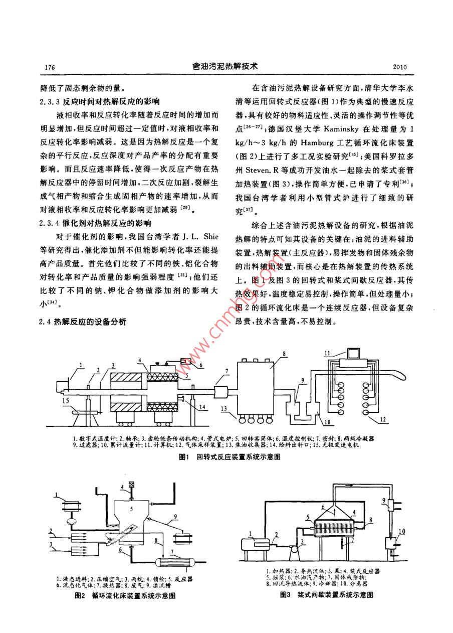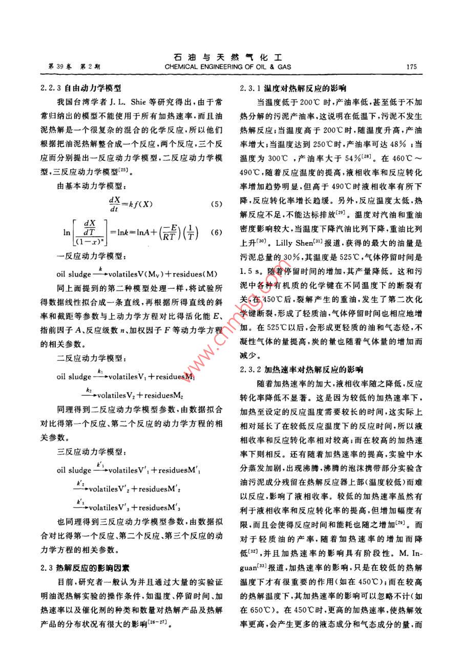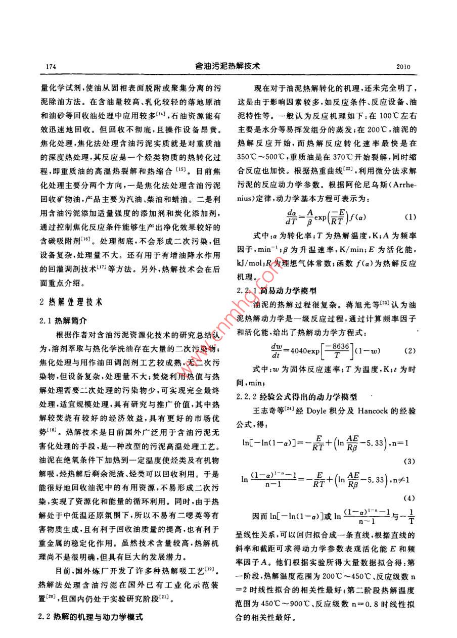 石油與天然氣化工第39卷第2期CHEMICAL ENGINEERING OF OIL GAS173含油污泥熱解技術(shù)王萬福金浩2石豐2劉鵬1黃婕2(1中國石油集團(tuán)安全環(huán)保技術(shù)研究院2華東理工大學(xué)化工學(xué)院摘要含油污泥是石油工業(yè)的主要污染物之一,含油污泥的處理一直是因擾石油化工企業(yè)的一大難題。本文結(jié)合含油污泥理化性質(zhì)及處理現(xiàn)狀,總結(jié)了國內(nèi)外含油污泥減量化、無害化、資源化處理技術(shù)的研究進(jìn)展。并重點(diǎn)介紹資源化中的熱解技術(shù)及熱解反應(yīng)模式的建立、影響條件和設(shè)備的分析。關(guān)鍵詞含油污泥熱解動力學(xué)模型DOI:10.3969/j.issn.1007—3426.2010.02.0241含油污泥處理現(xiàn)狀污泥脫水能力7。目前,利用超聲波技術(shù)進(jìn)行含油1.1會油污泥的來源與危害污泥除油的研究較少。但由于超聲波設(shè)備問題,短首先,原油開采產(chǎn)生含油污泥。原油開采中時間內(nèi)無法實施大型連續(xù)性的工業(yè)化產(chǎn)生的含油污泥主要來源于地面處理系統(tǒng)采油污1.2.2含油污泥無害化處理技術(shù)進(jìn)水處理過程中。再就是油田集輸和儲存過程產(chǎn)生油生物處理方法分兩類:一是向含油污泥中投加泥凹。我們習(xí)慣把煉油廠污水處理中產(chǎn)生的隔油營養(yǎng)物質(zhì)實現(xiàn)對污染物的降解。二是向含油污泥中池底泥、浮選池浮渣、原油罐底泥等俗稱“三泥3。投加高效降解石油烴的微生物菌劑-9。此技術(shù)油田含油污泥的組成成分極其復(fù)雜是一種極穩(wěn)定節(jié)省能耗,但技術(shù)尚未成熟,且廢渣廢水有待處理。的懸浮乳狀液體系除自身含有大量老化原油、蠟污泥固化處理是將含油污泥固化或包容在惰性固化質(zhì)、瀝青質(zhì)、膠體等,還包括生產(chǎn)過程中投加的大量基材中的一種無害化處理過程。目前應(yīng)用最廣泛的凝案劑、緩蝕劑阻垢劑等水處理劑。污泥還含有是水泥固化劑,這樣可以節(jié)約處理費(fèi)用,但污大量的病原菌、寄生蟲(卵)重金屬、放射性元素等染環(huán)境且資源浪費(fèi)。焚燒處理法具有減容效果顯難降解的有毒有害物質(zhì),這對人類的鍵康和自然環(huán)著、消滅病原菌、處理比較安全的優(yōu)點(diǎn)。焚燒法目前境都是一個極大的危害。因此油田含油污泥已被列仍是我國處理含油污泥的主流工藝。研究發(fā)為危險固體廢棄物?,F(xiàn):利用塑料與含油污泥混合焚燒,可創(chuàng)造良好的焚燒條件,降低成本,減少了煙氣排放量,但焚燒會產(chǎn)1.2油泥處理技術(shù)匯總生PAHs等有害物質(zhì)12。1.2.1含油污泥減量化處理技術(shù)進(jìn)展1.2.3含油污泥資源化處理技術(shù)進(jìn)展含油污泥調(diào)質(zhì)技術(shù)研究表明,有機(jī)高分子絮凝溶劑萃取處理研究表明,污泥與溶劑比為1:8劑可以破壞膠體穩(wěn)定性,改善污泥脫水性能使污泥時,5次抽提率可達(dá)99.76%,并且隨著抽提次數(shù)的含水率降至90%以下,優(yōu)點(diǎn)是減少脫水工藝,節(jié)增加,所得油品中的重組分比例增大。萃取處約成本,但絮凝劑技術(shù)含量高,獲取成本較高。超聲理量大且回收徹底,但萃取劑用量大、費(fèi)用高?;瘜W(xué)波預(yù)處理技術(shù)。作為新型的污泥預(yù)處理技術(shù),超聲熱洗處理,是將油泥加水稀釋后再加熱,并投加一定波對污泥能夠產(chǎn)生海綿效應(yīng)、局部發(fā)熱等作用提高基金項目:“十一五”國家科技支撐計劃環(huán)境污染治理類項目(2008BAC43B03)174含油污泥熱解技術(shù)量化學(xué)試劑,使油從固相表面脫附或聚集分離的污現(xiàn)在對于油泥熱解轉(zhuǎn)化的機(jī)理,還未完全明了泥除油方法。在含油量較高、乳化較輕的落地原油這是由于影響因素較多,如反應(yīng)條件、反應(yīng)設(shè)備、油和油砂等回收油處理中應(yīng)用較多,石油資源能有泥特性等。一般認(rèn)為反應(yīng)機(jī)理如下:在100℃左右效迅速地回收。但回收不徹底,且操作設(shè)備昂貴。主要是水分等易揮發(fā)組分的蒸發(fā);在200℃,油泥的焦化處理,焦化法處理含油污泥實質(zhì)就是對重質(zhì)油熱解反應(yīng)開始,而熱解反應(yīng)轉(zhuǎn)化速率最快是在的深度熱處理,其反應(yīng)是一個烴類物質(zhì)的熱轉(zhuǎn)化過350℃~500℃,重質(zhì)油是在370℃開始裂解,同時縮程,即重質(zhì)油的高溫?zé)崃呀夂蜔峥s合[1。目前焦合反應(yīng)也加快。根據(jù)熱重曲線,利用微分法求解化處理主要分兩個方向,一是焦化法處理含油污泥污泥的反應(yīng)動力學(xué)參數(shù)。根據(jù)阿倫尼烏斯( Arre回收礦物油,產(chǎn)品主要為汽油、柴油和蠟油。二是利nius)定律,動力學(xué)基本方程可表示為:用含油污泥添加適量強(qiáng)度的添加劑和炭化添加劑,R7/(a(1)通過控制焦化反應(yīng)條件能夠生產(chǎn)出凈化效果較好的式中:a為轉(zhuǎn)化率;T為熱解溫度,K;A為頻率設(shè)備復(fù)雜,處理量不大,還有用于有增油降水作用因子,mnP為升溫速率,Kmn;E為活化能,的回灌調(diào)剖技術(shù)等方法。另外,熱解技術(shù)會在后kJ/mol;R為理想氣體常數(shù);函數(shù)f(a)為熱解反應(yīng)機(jī)理面重點(diǎn)介紹。2.2.1簡易動力學(xué)模型2熱解處理技術(shù)油泥的熱解過程很復(fù)雜。蔣旭光等認(rèn)為油2.1熱解簡介泥熱解動力學(xué)是一級反應(yīng)過程,