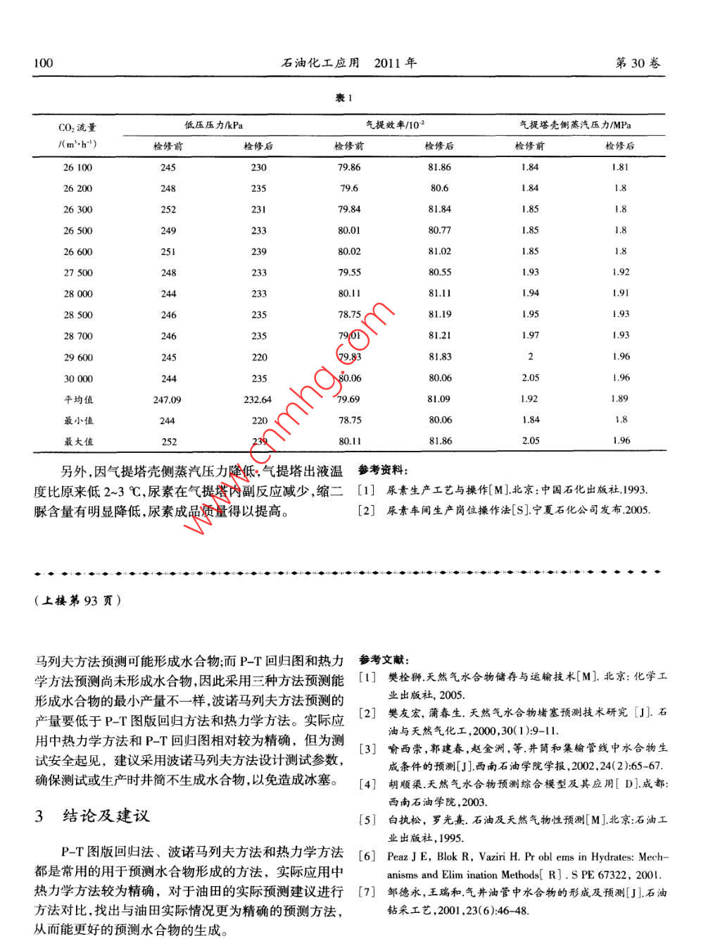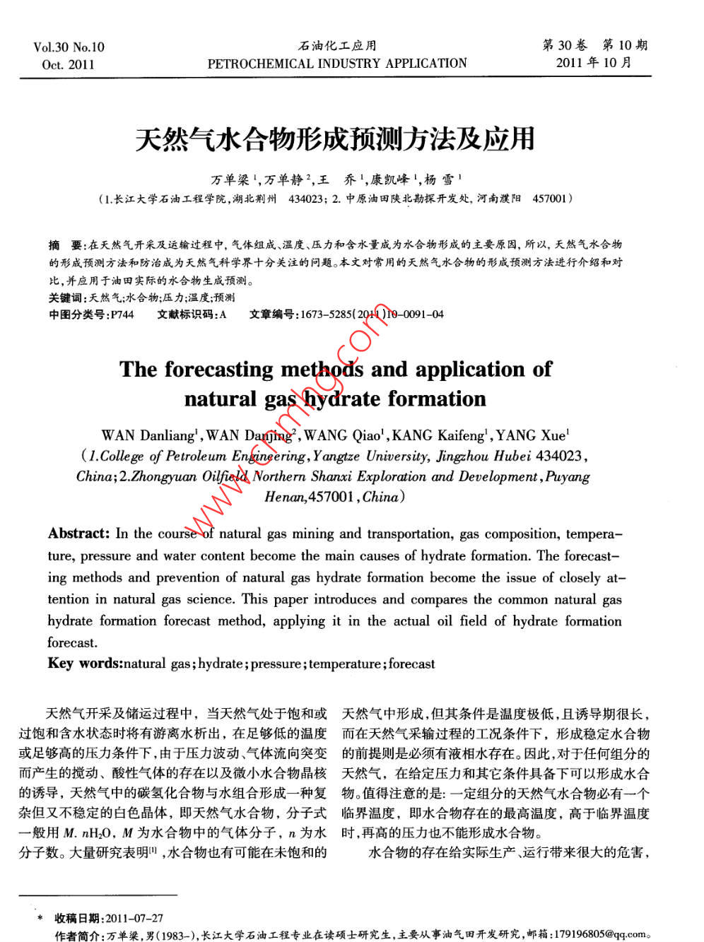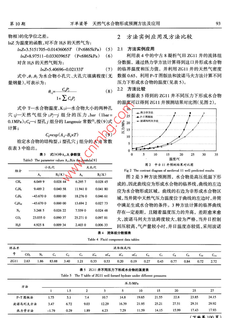 Vol30 No 10石油化工應(yīng)用第30卷第10期Oct 2011PETROCHEMICAL INDUSTRY APPLICATION20l1年10月天然氣水合物形成預(yù)測(cè)方法及應(yīng)用萬單梁ψ,萬單靜2,王喬1,康凱峰,楊雪1(1.長(zhǎng)江大學(xué)石油工程學(xué)院,湖北荊州434023;2.中原油田陜北勘探開發(fā)處,河南濮陽457001)摘要:在天然氣開采及運(yùn)輸過程中,氣體組成、溫度、壓力和含水量成為水合物形成的主要原因,所以,天然氣水合物的形成預(yù)測(cè)方法和防治成為天然氣科學(xué)界十分關(guān)注的問題。本文對(duì)常用的天然氣水合物的形成預(yù)測(cè)方法進(jìn)行介紹和對(duì)比,并應(yīng)用于油田實(shí)際的水合物生成預(yù)測(cè)。關(guān)鍵詞:天然氣;水合物;壓力;溫度;預(yù)測(cè)中圖分類號(hào):P744文獻(xiàn)標(biāo)識(shí)碼:A文章編號(hào):1673-5285(2011)10-0091-04The forecasting methods and application ofnatural gas hydrate formationWAN Danliang', WAN Danjing WANG Qiao, KANG Kaifeng, YANG Xue(I. College of Petroleum Engineering, Yangtze University, Jingzhou Hubei 434023China; 2. Zhongyuan Oilfield Northern Shanxi Exploration and Development, PuyangHenan, 457001, China)Abstract: In the course of natural gas mining and transportation, gas composition, tempera-ture, pressure and water content become the main causes of hydrate formation. The forecast-ing methods and prevention of natural gas hydrate formation become the issue of closely at-tention in natural gas science. This paper introduces and compares the common natural gashydrate formation forecast method, applying it in the actual oil field of hydrate formationforecastKey words: natural gas; hydrate; pressure; temperature; forecast天然氣開采及儲(chǔ)運(yùn)過程中,當(dāng)天然氣處于飽和或天然氣中形成,但其條件是溫度極低,且誘導(dǎo)期很長(zhǎng)過飽和含水狀態(tài)時(shí)將有游離水析出,在足夠低的溫度而在天然氣采輸過程的工況條件下,形成穩(wěn)定水合物或足夠高的壓力條件下,由于壓力波動(dòng)氣體流向突變的前提則是必須有液相水存在。因此,對(duì)于任何組分的而產(chǎn)生的攪動(dòng)、酸性氣體的存在以及微小水合物晶核天然氣,在給定壓力和其它條件具備下可以形成水合的誘導(dǎo),天然氣中的碳?xì)浠衔锱c水組合形成一種復(fù)物。值得注意的是:一定組分的天然氣水合物必有一個(gè)雜但又不穩(wěn)定的白色晶體,即天然氣水合物,分子式臨界溫度,即水合物存在的最高溫度,高于臨界溫度般用M.nH2O,M為水合物中的氣體分子,n為水時(shí),再高的壓力也不能形成水合物。分子數(shù)。大量研究表明,水合物也有可能在未飽和的水合物的存在給實(shí)際生產(chǎn)、運(yùn)行帶來很大的危害,收稿日期:2011-07-27簡(jiǎn)介:萬單梁,男(1983-),長(zhǎng)江大學(xué)石油工程專業(yè)在讀碩士研究生,主要從事油氣田開發(fā)研究,郵箱:l79196805@q4com。石油化工應(yīng)用2011年第30卷旦在開采和輸送中形成水合物,將導(dǎo)致閥門和設(shè)備11波諾馬列夫方法阻塞、氣井停產(chǎn)、管道停輸?shù)葒?yán)重事故,從而影響天然波諾馬列夫?qū)?shí)驗(yàn)數(shù)據(jù)進(jìn)行整理,得出不同氣體氣的開采、集輸和加工的正常運(yùn)行。另外,隨著海洋密度下天然氣水合物生成條件的經(jīng)驗(yàn)公式石油天然氣的開發(fā),又發(fā)現(xiàn)水合物可在鉆桿和防噴器對(duì)于T>273K,之間形成環(huán)狀封堵,堵塞防噴器、節(jié)流管線和壓井管線log(p)=-1.0055+0.0541(B+7-273)(1)等。所以,天然氣水合物的防治一直是天然氣科學(xué)工作對(duì)于T<273K,者十分關(guān)注的問題,預(yù)測(cè)天然氣水合物的生成條件并log(p)=-1.005540.0541(B+7-273)(2)釆取合理措施防止水合物生成,對(duì)天然氣工業(yè)的發(fā)展式中,7一溫度,K;P一水合物生成壓力,MPa。系數(shù)有著重要的現(xiàn)實(shí)意義。B、B1可根據(jù)氣體相對(duì)密度查表1。1水合物形成預(yù)測(cè)方法1.2水合物PT圖回歸公式法水合物形成的臨界溫度是水合物可能存在的最高目前,確定天然氣水合物生成條件(溫度和壓力)溫度。高于此溫度,不管壓力多大,水合物也不會(huì)形成,可采用圖版法、波諾馬列夫方法和熱力學(xué)法。表2列出了部分氣體形成水合物的臨界溫度。表1波諾馬列夫B值表Tablel Ley ponomarev b value table參教0.560.640.700.750.850.900.9524.2517.67154714.76143414.0013.3212.74121811661.1710.77B77,4064.2048604690456044.40420039903790362034.5033.10表2氣體水合物形成的臨界溫度Table2 The critical temperature of Gas hydrate formation氣體類別CHaCHeCHEn-CLHIoi-CaHtoCOz臨界溫度/C28.014.55.52.5100290若已知天然氣密度,可以根據(jù)天然氣水化物生成1.3熱力學(xué)方法的平衡曲線圖1州,利用內(nèi)插法,初步推算出天然氣水天然氣水合物相平衡的理論模型研究已經(jīng)相當(dāng)成合物形成的最低壓力及最高溫度。熟,絕大多數(shù)預(yù)測(cè)水合物相平衡條件的理論模型都是基于范德瓦爾-普朗特統(tǒng)計(jì)熱力學(xué)模型發(fā)展起來的。在多元混合物體系中,每一組分在各相中的化學(xué)勢(shì)能相等,范德瓦爾-普朗特根據(jù)水合物結(jié)晶特點(diǎn),應(yīng)用經(jīng)典熱力學(xué)的處理方法,結(jié)合蘭格繆爾( Langmuir)氣體等溫吸附理論,根據(jù)相平衡準(zhǔn)則,采用水作為考察組分,建立起含氣體水合物相和富水相的熱力學(xué)模型但模型計(jì)算過于復(fù)雜,在實(shí)際工程預(yù)測(cè)水合物生成條件時(shí