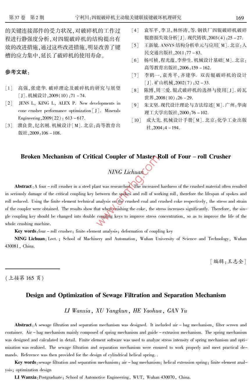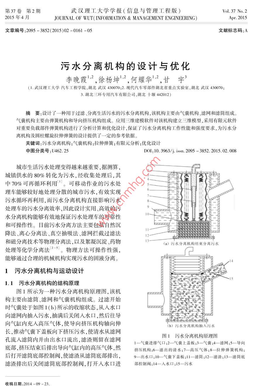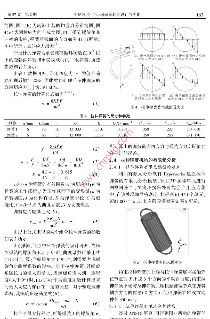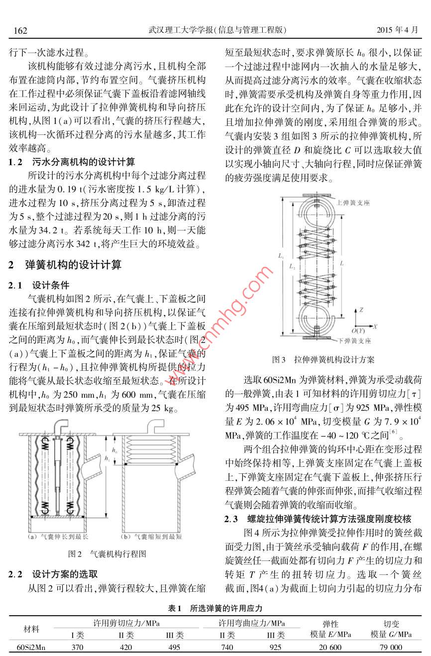 第37卷第2期武漢理工大學(xué)學(xué)報(信息與管理工程版)Vol. 37 No. 22015年4月JOURNAL OF WUT( INFORMATION MANAGEMENT ENGINEERINGApr.2015文章編號:2095-3852(2015)02-0161-05文獻標(biāo)志碼:A污水分離機構(gòu)的設(shè)計與優(yōu)化李晚霞2,徐楊坤2,何耀華2,甘宇(1.武漢理工大學(xué)汽車工程學(xué)院,湖北武漢430070;2.現(xiàn)代汽車零部件湖北省重點實驗室,湖北武漢4300703.湖北三環(huán)專用汽車有限公司,湖北十堰442012)摘要:設(shè)計了一種用于過濾、分離生活污水的污水分離機構(gòu),該機構(gòu)主要由氣囊機構(gòu)、濾網(wǎng)和濾筒組成。氣囊機構(gòu)主要由彈簧機構(gòu)和導(dǎo)向擠壓機構(gòu)組成。應(yīng)用三維建模軟件對該機構(gòu)建立三維模型,采用有限元軟件對重要負(fù)載部件彈簧機構(gòu)進行了分析計算和優(yōu)化設(shè)計,保證了污水分離機構(gòu)工作性能和強度要求,為污水分離機構(gòu)及圓柱螺旋拉伸彈簧的設(shè)計提供了一定的參考依據(jù)。關(guān)鍵詞:污水分離機構(gòu);氣囊機構(gòu);拉伸彈簧;有限元分析;優(yōu)化設(shè)計中圖分類號:U462.25DO:10.3963/j.isn.2095-3852.2015.02.008城市生活污水處理變得越來越重要,據(jù)測算城鎮(zhèn)供水的80%轉(zhuǎn)化為污水,經(jīng)收集處理后,其中70%可再循環(huán)利用。可移動作業(yè)的污水處理車能夠較好地處理分散的城市污水,有效實現(xiàn)污水循環(huán)再利用,而污水分離機構(gòu)直接影響污水處理車的污水分離效率,因此設(shè)計實用、高效的污水分離機構(gòu)能夠有效地保證污水處理車的可靠性委和可操作性。目前污水分離方法主要包括自然沉降法、離心分離法、真空抽吸法、濾網(wǎng)攔截過濾法和磁分離技術(shù)等物理分離法,以及絮凝沉淀、藥物(a)污水分離機構(gòu)結(jié)束分離污水處理等化學(xué)分離法2-。物理方法可操作性強,能夠通過合理的機械機構(gòu)實現(xiàn)污水的固液分離。1污水分離機構(gòu)與運動設(shè)計1.1污水分離機構(gòu)的結(jié)構(gòu)原理圖1所示為一種污水分離機構(gòu)原理圖,該機構(gòu)主要由濾筒、濾網(wǎng)和氣囊機構(gòu)組成。過濾開始時氣囊處于如圖1(b)所示的收縮狀態(tài),從入水口向濾網(wǎng)內(nèi)抽入污水,抽滿后關(guān)閉入水口,然后往導(dǎo)向氣缸內(nèi)充入高壓氣體,使導(dǎo)向擠壓機構(gòu)軸向伸(b)污水分離機構(gòu)抽入污水長,推動氣囊下蓋板向下擠壓污水,使清水從濾網(wǎng)孔流入濾筒內(nèi)并由出水口流出,濾渣則留在濾網(wǎng)圖1污水分離機構(gòu)原理圖1—氣囊進排氣口;2一氣囊上蓋板;3—氣囊;4—濾網(wǎng);5—導(dǎo)向底部,擠壓結(jié)束后排出導(dǎo)向氣缸內(nèi)的高壓氣體,然擠壓機構(gòu);6—濾出的清水;7一高壓氣體;8一拉伸彈簧機后打開濾筒底部控制閥,使濾渣從濾筒底部排出9一出水口;10—氣囊下蓋板:11—濾筒;12-濾渣;13-濾筒底濾渣排出后關(guān)閉濾筒底部控制閥,打開人水口進部控制闞:4-人水口;15一污水武漢理工大學(xué)學(xué)報(信息與管理工程版)2015年4月行下一次濾水過程。短至最短狀態(tài)時,要求彈簧原長h很小,以保證該機構(gòu)能夠有效過濾分離污水,且機構(gòu)全部一個過濾過程中濾網(wǎng)內(nèi)一次抽入的水量足夠大,布置在濾筒內(nèi)部,節(jié)約布置空間。氣囊擠壓機構(gòu)從而提高過濾分離污水的效率。氣囊在收縮狀態(tài)在工作過程中必須保證氣囊下蓋板沿著濾網(wǎng)軸線時,彈簧需要承受機構(gòu)及彈簧自身等重力作用,因來回運動,為此設(shè)計了拉伸彈簧機構(gòu)和導(dǎo)向擠壓此在允許的設(shè)計空間內(nèi),為了保證ho足夠小,并機構(gòu)從圖1(a)可以看出,氣囊的擠壓行程越大,且增加拉伸彈簧的剛度,采用組合彈簧的形式。該機構(gòu)一次循環(huán)過程分離的污水量越多,其工作氣囊內(nèi)安裝3組如圖3所示的拉伸彈簧機構(gòu),所效率越高設(shè)計的彈簧直徑D和旋繞比C可以選取較大值1.2污水分離機構(gòu)的設(shè)計計算以實現(xiàn)小軸向尺寸、大軸向行程,同時應(yīng)保證彈簧所設(shè)計的污水分離機構(gòu)中每個過濾分離過程的疲勞強度滿足使用要求。的進水量為0.19t(污水密度按1.5kg/L計算),進水過程為10s,擠壓分離過程為5s,卸渣過程上彈簧支座為5s,整個過濾過程為20s,則1h過濾分離的污水量為34.2t。若系統(tǒng)每天工作10h,則一天能夠過濾分離污水342t,將產(chǎn)生巨大的環(huán)境效益。2彈簧機構(gòu)的設(shè)計計算2.1設(shè)計條件氣囊機構(gòu)如圖2所示,在氣囊上、下蓋板之間連接有拉伸彈簧機構(gòu)和導(dǎo)向擠壓機構(gòu),以保證氣囊在壓縮到最短狀態(tài)時(圖2(b))氣囊上下蓋板之間的距離為ho,而氣囊伸長到最長狀態(tài)時(圖2下彈簧支座(a))氣囊上下蓋板之間的距離為h1,保證氣囊的圖3拉伸彈簧機構(gòu)設(shè)計方案行程為(h1-ho),且拉伸彈簧機構(gòu)所提供的拉力能將氣囊從最長狀態(tài)收縮至最短狀態(tài)。在所設(shè)計選取60Si2Mn為彈簧材料,彈簧為承受動載荷機構(gòu)中,ho為250mm,h1為600m,氣囊在壓縮的一般彈簧,由表1可知材料的許用剪切應(yīng)力[T到最短狀態(tài)時彈簧所承受的質(zhì)量為25kg。為495MPa,許用彎曲應(yīng)力[σ]為925MPa,彈性模量E為2.06×10MPa,切變模量G為7.9×10MPa,彈簧的工作溫度在-40-120℃之間°。兩個組合拉仲彈簧的鉤環(huán)中心距在
