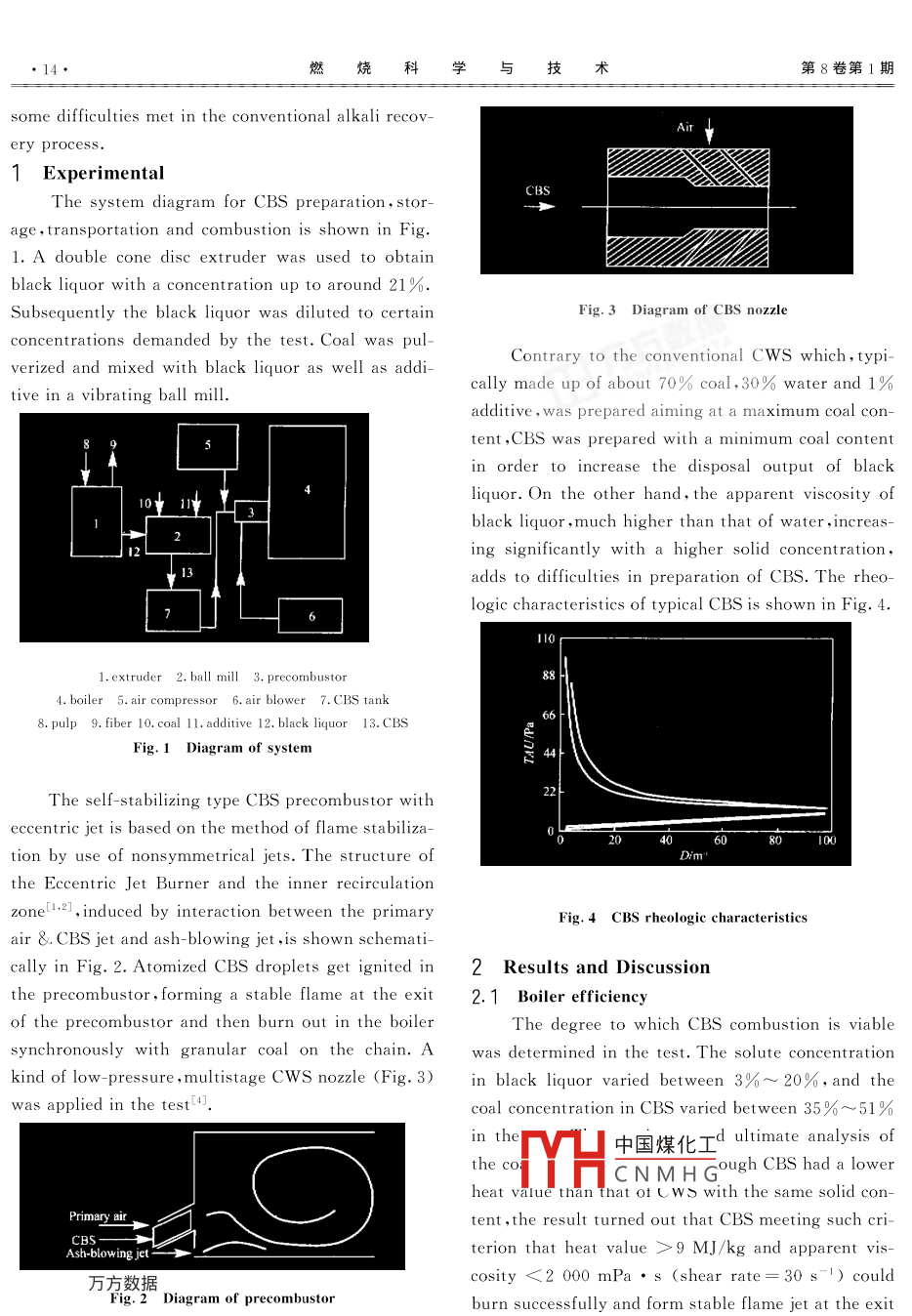 燃燒科學(xué)與技術(shù)第8卷(2002)第1期JOURNAL OF COMBUSTION SCIENCE AND TECHNOLOG YVol.8(2002)No.1Research on Application of Coal-Water Slurry Techniquesto Disposal of Wheat Straw Pulping black liquorYUANChEn Li-fang, WU Cheng-kang(Institute of Mechanics, Chinese Academy of Sciences, Beijing 100080. China)Abstract: A pilot test on disposal of wheat straw pulping black liquor by Coal-Water Slurry (CWS) combustiontechnology as an alternative of traditional alkali recovery technique has been performed. Experimental studycombustion feature of several kinds of Coal-Blackliquor Slurry (CBS) was carried out in a 6. 5 t/h chain-grate boier In the test flue gas, slag and dust were analyzed and the boiler's thermal efficiency was measured. The resultsdemonstrate that the co-combustion of CBS with granular coal increases the boiler's thermal efficiency and decreases poisonous emission. The successful combustion of CBs demonstrates its promise as a key technique in a noveleasure of comprehensive disposal of wheat straw black liquorKeywords: coal-water slurry i coal-blackliquor slurry wheat straw black liquor水煤漿燃燒技術(shù)用于造紙黑液處理的研究原鯤,陳麗芳,吳承康(中國(guó)科學(xué)院力學(xué)研究所,北京100080)摘要:對(duì)水煤漿燃燒技術(shù)用于造紙黑液處理進(jìn)行了中試研究。多種不同組成的黑液煤漿在改造過的6.5t/h的鏈條爐上進(jìn)行了燃燒試驗(yàn)。對(duì)黑液燃燒產(chǎn)物如煙氣、煙塵及灰渣進(jìn)行了成分測(cè)試,對(duì)鍋爐混燒水煤漿前后的效率進(jìn)行了分析比較。結(jié)果表明,黑液煤漿與層燃煤混燒提高了鍋爐效率并降低了污染。水煤漿燃燒技術(shù)在該領(lǐng)域的成功應(yīng)用為造紙黑液的處理提供了新的思路關(guān)鍵詞:水煤漿;黑液煤漿;黑液中圖分類號(hào):X793文獻(xiàn)標(biāo)識(shí)碼:A文章編號(hào):1006-8740(2002)01-0013-04The impact of continuous development of the paof wheat straw black liquor utilizing CWS technologyper industry on the environment is getting serious in as well as the effects of secondary pollution are invesChina. The conventional alkali recovery system, how- tigated in this study CWS arose as an alternative ofever,works far less than satisfactorily in handling fuel oil in the crucial oil crisis in 1970s. During theTheat straw black liquor due to its inherent drawpast two decades, CWs technology has maturedbacks that lead to failure in the aspects of black terms of preparation, trans portation, atomization andliquor extraction, evaporation, combustion and causti- combustion. As a substituent of the conventional discization. But pollution caused by the paper industry中國(guó)煤化工or, the CWS technolomust be solved urgentlCNMHGes. Direct combustionTo overcome the difficulties, viability of disposal of black liquor assisted by coal may naturally avoid收稿巳兩芳數(shù)據(jù)21作者簡(jiǎn)介:原鯤(1972—),男,博士,中國(guó)科學(xué)院工程熱物理所博士后。E-mail:kyuan@iech.ac.cn。燃燒堯科學(xué)與技術(shù)第8卷第1期some difficulties met in the conventional alkali recovery process1 Experimental爹多The system diagram for CBS preparation, storage, transportation and combustion is shown in Fig1.a double cone disc extruder was used to obtainblack liquor with a concentration up to around 21%Subsequently the black liquor was diluted to certainFig 3 Diagram of CBS nozzleconcentrations demanded by the test Coal was pulerized and mixed with black liquor as well as addiContrary to the conventional CwS which, typi-tive in a vibrating ball millcally made up of about 70% coal, 30% water and 1%additive, was prepared aiming at a maximum coal cotent, CBS was prepared with a minimum coal contentin order to increase the disposal output of blackliquor. On the other hand. the apparent viscosity ofblack liquor, much higher than that of water, increasing significantly with a higher solid concentrationadds to difficulties in preparation of cBs. The rheologic characteristics of typical CBS is shown in Fig. 4torboiler 56. air blower 7. CRS tank8. pulp 9. fiber 10. coal Il additive 12. black liquor 13. CBSFig 1 Diagram of systemThe self-stabilizing type CBS precombustor witheccentric jet is based on the method of flame sta bilization by use of nonsymmetrical jets. The structure ofthe Eccentric Jet Burner and the inner recirculationzoneLl. 2, induced by interaction bet ween the primaryFig 4 CBS rheologic characteristicsair & CBS jet and ash-blowing jet, is shown schematcally in Fig. 2. Atomized CBS droplets get ignited in 2 Results and Discussionthe precombustor, forming a stable flame at the exit 2. 1 Boiler efficiencyof the precombustor and then burn out in the boilerThe degree to which CBS combustion is viablesynchronously with granular coal on the chain. A was determined in the test. The solute concentrationkind of low-pressure, multistage CWS nozzle (Fig 3) in black liquor varied between 3%20%,and thewas applied in the test 4coal concentration in CBS varied between 35%51%in the中國(guó)煤化工 I ultimate analysis ofthe coCNMHGOugh CBS had a lowerheattent, the result turned out that CBS meeting such cr<2000mPFig 2 Diagram of precombustorburn successfully and form stable flame jet at the exi2002年2月原鯤等:水煤漿燃燒技術(shù)用于造紙黑液處理·15·of the precombustor. The efficiency of a typical chain- rate and simultaneous decrease of the feeding rate ofgrate boiler burning granular coal is relatively low. granular coal to maintain the stable boiler steam outHowever, the setting of the precombustor enabled the put, the NO content in the gas decreased due primanCBS flame jet to flow toward the head of the chain to ily to the low-emission characteristics of combustionincrease the temperature there and thus help the ignithe eccentric jet burner. But with further increaseti