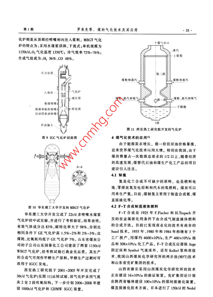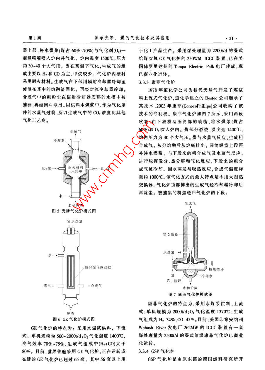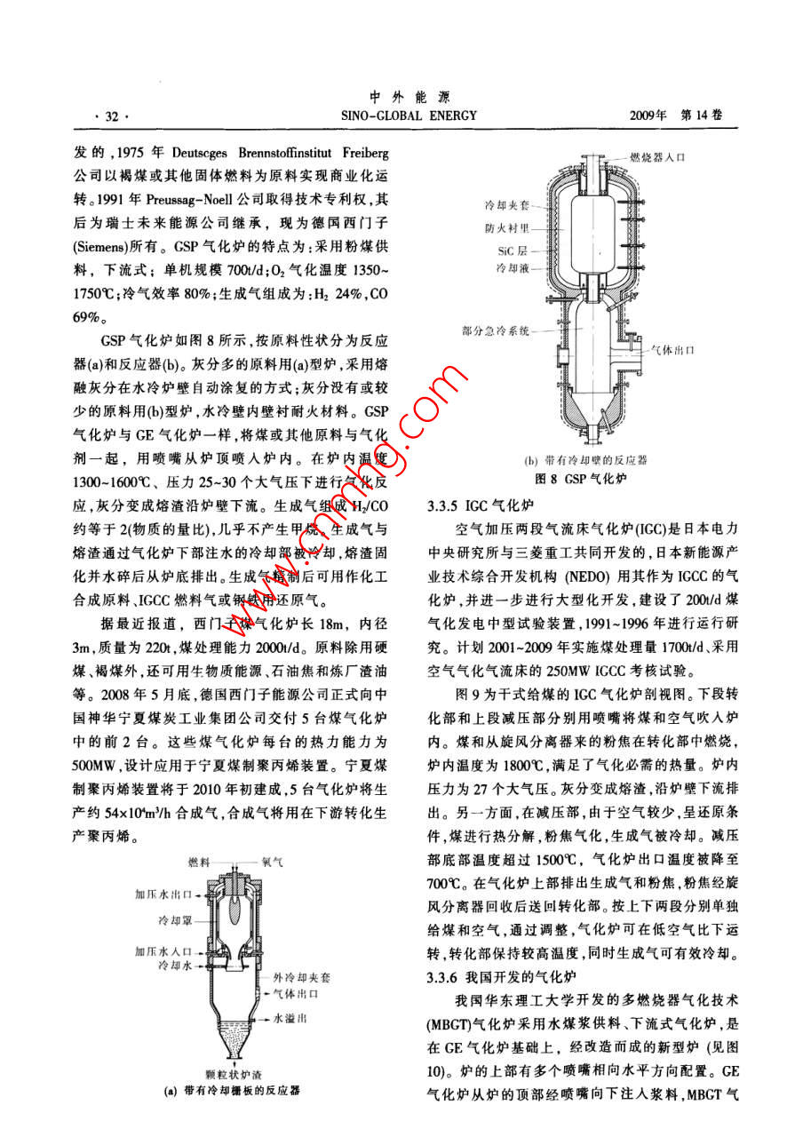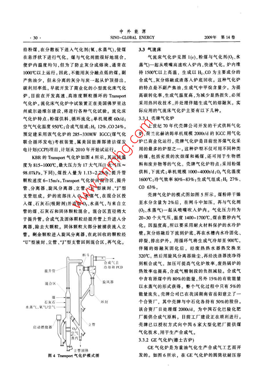 中外能源.28.SINO-GLOBAL ENERCY2009年第14卷煤的氣化技術(shù)及其應(yīng)用羅承先',周韋慧2(1.原中國(guó)石化信息中心,北京10012.中 國(guó)石化經(jīng)濟(jì)技術(shù)研究院.北京10029)摘要煤氣化技術(shù)是環(huán)境友好的現(xiàn)代煤化T的關(guān)鍵技術(shù)。介紹了當(dāng)今世界主要的煤氣化技術(shù),著重介紹了已工業(yè)化生產(chǎn)的魯奇.Transport、殼牌.德士古、康非氣化爐及我國(guó)自主開(kāi)發(fā)的華東理工大學(xué)氣化爐等技術(shù),并且介紹了煤氣化技術(shù)在煤氣化聯(lián)合循環(huán)發(fā)電和在煤化工的合成油、合成氨.合成甲醇.合成烯烴等方面的應(yīng)用。重點(diǎn)介紹了我國(guó)煤化工發(fā)展的具體情況。關(guān)鍵詞煤氣化氣化爐煤化工1前言②部分燃燒氣化(約900~1600C):煤在氧氣中部分近年.原油價(jià)格持續(xù)上漲,2001年末約為23美燃燒產(chǎn)生高溫,并加入氣化劑(H2O ,CO2等),產(chǎn)生可元/bbl,2008年1月達(dá)到100美元/bbl,甚至曾一度燃?xì)?C0,CO2、H2)和灰分;③化學(xué)循環(huán)氣化(約60U~超過(guò)140美元/bbl。采用氣化技術(shù)處理的煤化工產(chǎn)800C):該技術(shù)是近年才開(kāi)發(fā)的,在煤氣化爐中投人品替代石油,再次引起人們的高度關(guān)注。所謂煤氣水和CO2吸收劑,產(chǎn)生吸收CO2的放熱反應(yīng),為煤化技術(shù)是將煤與氧、水蒸氣等反應(yīng),轉(zhuǎn)化為氫和一氣化反應(yīng)提供熱量,得到產(chǎn)品氫(H2)、灰分和吸收氧化碳等合成氣的技術(shù)。用這種合成氣可生產(chǎn)甲劑-C02。醇、合成油或化工產(chǎn)品。,3煤氣化方式22煤氣化原理H大約200年前就已開(kāi)發(fā)應(yīng)用煤氣化技術(shù)。按固煤氣化關(guān)聯(lián)反應(yīng)如下:體、氣體的接觸方式可分為固定床、流化床、氣流床①燃燒反應(yīng):和熔融床4種煤氣化技術(shù),其中熔融床技術(shù)還沒(méi)有C+0,-→CO2放熱(1)實(shí)際應(yīng)用開(kāi)發(fā)。近年,正在完善大規(guī)模、高效率的煤2C+02--→>2C0放熱(2)氣化技術(shù),今后先進(jìn)的煤氣化技術(shù)可望用于零排放②煤熱分解反應(yīng):發(fā)電、制氫、煤制油和制造化工產(chǎn)品。最近新提出的煤一?粉焦+揮發(fā)分 吸熱(3)化學(xué)循環(huán)煤氣化技術(shù)是將吸收反應(yīng)并人氣化爐內(nèi),揮發(fā)分一→焦油+C0、CO2.H2.CH4 (4)在爐內(nèi)吸收CO2的同時(shí),可生成高濃度的氫,減少③氣化反應(yīng):熱損失。各種煤氣化爐的模式見(jiàn)圖1。C+CO2-→2C0吸熱(5)3.1固定床C+H20一→C0+H2 吸熱6)固定床煤氣化爐見(jiàn)圖1 (間), 爐篦上充填塊狀④生成氣改質(zhì)反應(yīng):煤,由下部送入氣化劑(氧、水蒸氣)進(jìn)行氣化。爐篦CO+H20-→CO2+H2 放熱(7)上的煤在氧化環(huán)境下燃燒,產(chǎn)生高溫燃燒氣。這種⑤CO2吸收反應(yīng):燃燒氣的熱用于上部煤的干餾、氣化及預(yù)熱。燃燒CO2+吸收劑一> 吸收劑-CO2放熱8)用煤造氣,按供熱原理大致可分為3種。①熱作者簡(jiǎn)介:羅承先,高級(jí)工程師,1962年畢業(yè)于四川大學(xué)化學(xué)系分解(約500~1000C):加熱使煤放出揮發(fā)分,再由有機(jī)化學(xué)專業(yè),曾在化工部吉化研究院、化工部第二膠片廠、中揮發(fā)分得到焦油和燃?xì)?CO、CO2、H2、CH4),必須由:石化信息研究所(信息中心)從事有機(jī)合成、信息編譯報(bào)道、信息外部供熱,殘留的固態(tài)炭(粉焦和焦炭等)作它用;調(diào)研等工作,發(fā)表論文多篇。第1期羅承先等,煤的氣化技術(shù)及其應(yīng)用.29●狀態(tài)的溫度為1200~1400C,但上部在1000C以下安裝了氣化劑噴嘴,由這里噴入氧和水蒸氣,形成成為還原環(huán)境,進(jìn)行氣化。煤中的灰分通過(guò)爐篦落高溫區(qū),熔融狀爐渣經(jīng)排料孔下降,使粉焦高溫氣人爐底移出爐外。煤通過(guò)各反應(yīng)區(qū)域,逐步被氣化,化。該爐型為BGC-魯奇氣化爐(BCC:英國(guó)氣體公氣化顯熱用于干燥和熱分解,因此,氣化的冷氣效司),爐內(nèi)最高溫度1500C以上,合成氣組成為:H2率[(生成氣的熱值/供應(yīng)煤的熱值)x100%]高,但單30%、.CO 60%左右,與氣流床氣化爐的合成氣組成位容積的煤處理量小,大型化困難。目前,運(yùn)轉(zhuǎn)中的大體相同。熔融狀爐渣也與氣流床氣化爐的情況一固定床氣化爐主要有魯奇氣化爐和BGC-魯奇爐。樣,落人爐底水槽,被造粒排出。德國(guó)SVZ Schwarze媒氣煤氣Pumpe公司已將這種爐型應(yīng)用于各種廢棄物氣化煤的商業(yè)化裝置。水蒸氣/7煤煤閘循環(huán)焦油水蒸氣水旋轉(zhuǎn)分配器一灰分_「 O水洗冷卻分配器水燕氣氧水蒸氣‘氧爐篦(a)固定床(b) 流化床(2) 氣流床(d)熔融床旋轉(zhuǎn)妒能圖1各種煤氣化爐模式圖不.水冷卻3.1.1魯奇氣化爐固定床中魯奇氣化爐(結(jié)構(gòu)如圖2所示)實(shí)績(jī)最水燕氣+02厭閘好,目前,商業(yè)爐還在運(yùn)轉(zhuǎn)中。一定大小的煤塊通過(guò)閘斗進(jìn)入爐的頂部,沿反應(yīng)床向下移動(dòng),經(jīng)旋轉(zhuǎn)分配器分散后,依次經(jīng)干燥區(qū)、干餾區(qū)、氣化區(qū)和燃燒區(qū)。爐內(nèi)的煤被旋轉(zhuǎn)爐篦支撐,由其下向爐內(nèi)吹人.圖2魯奇氣化爐結(jié)構(gòu)氣化劑(氧、水蒸氣)。通過(guò)氣化區(qū)的粉焦在燃燒區(qū)燃燒產(chǎn)生的爐灰,經(jīng)旋轉(zhuǎn)爐篦落人灰閘排出。爐內(nèi)燃閘斗燒區(qū)的溫度最高,超過(guò)1000C,為了