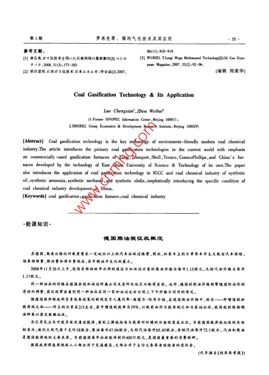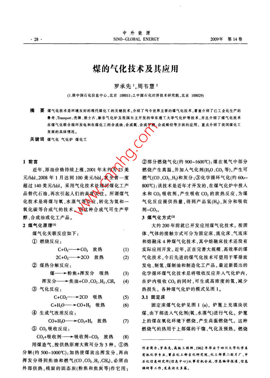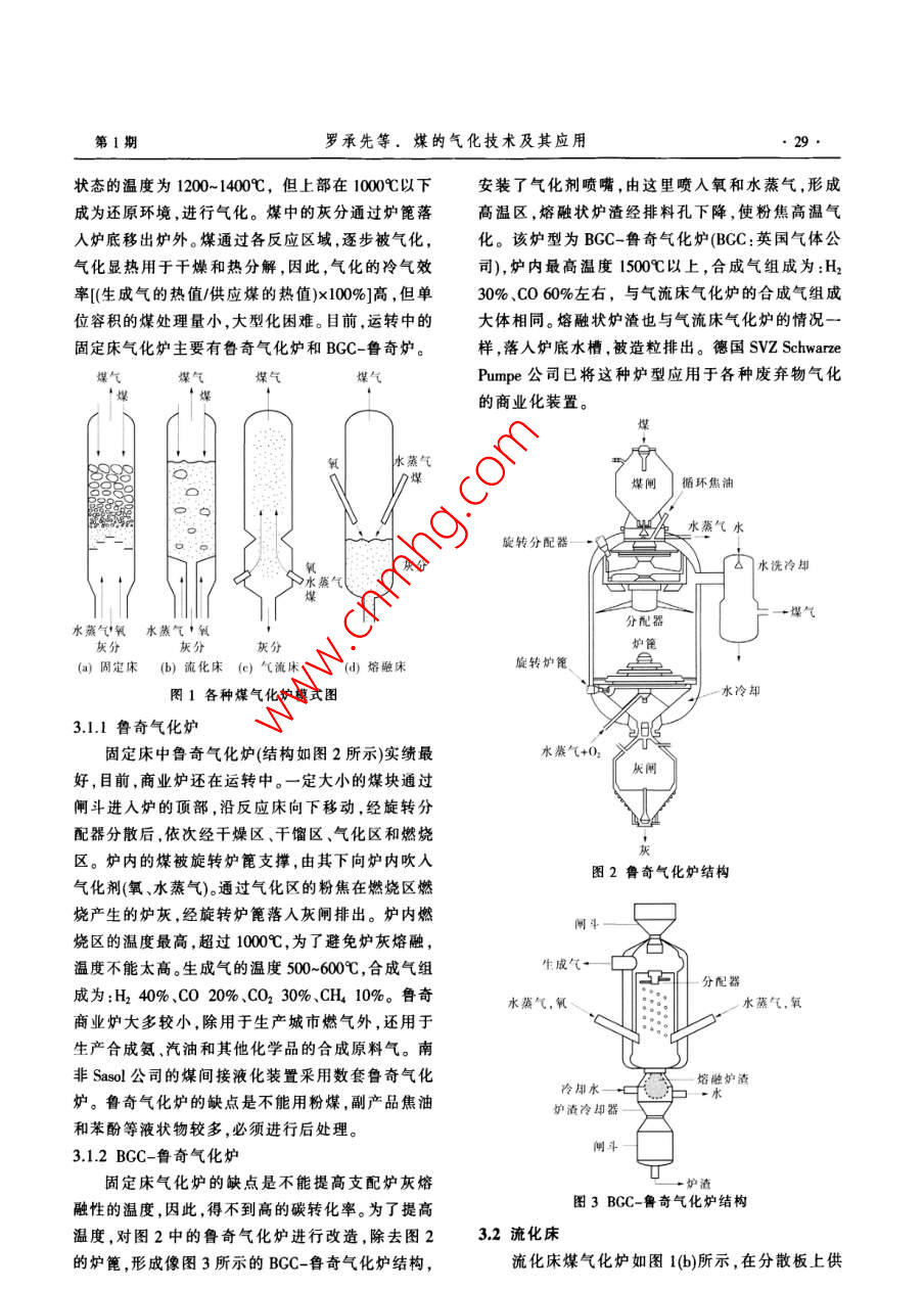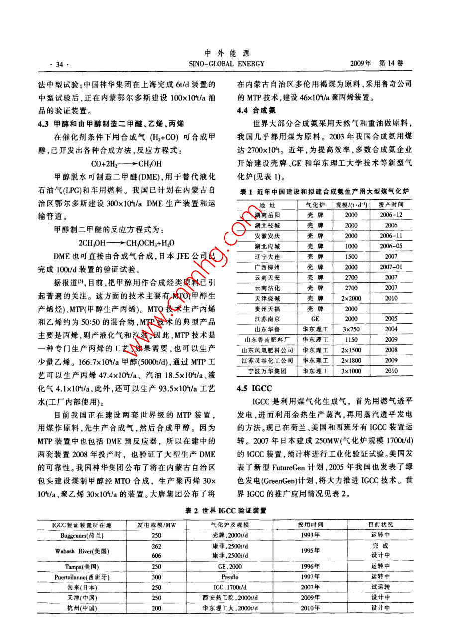 中外能源.28.SINO-GLOBAL ENERCY2009年第14卷煤的氣化技術(shù)及其應(yīng)用羅承先',周韋慧2(1.原中國(guó)石化信息中心,北京10012.中 國(guó)石化經(jīng)濟(jì)技術(shù)研究院.北京10029)摘要煤氣化技術(shù)是環(huán)境友好的現(xiàn)代煤化T的關(guān)鍵技術(shù)。介紹了當(dāng)今世界主要的煤氣化技術(shù),著重介紹了已工業(yè)化生產(chǎn)的魯奇.Transport、殼牌.德士古、康非氣化爐及我國(guó)自主開(kāi)發(fā)的華東理工大學(xué)氣化爐等技術(shù),并且介紹了煤氣化技術(shù)在煤氣化聯(lián)合循環(huán)發(fā)電和在煤化工的合成油、合成氨.合成甲醇.合成烯烴等方面的應(yīng)用。重點(diǎn)介紹了我國(guó)煤化工發(fā)展的具體情況。關(guān)鍵詞煤氣化氣化爐煤化工1前言②部分燃燒氣化(約900~1600C):煤在氧氣中部分近年.原油價(jià)格持續(xù)上漲,2001年末約為23美燃燒產(chǎn)生高溫,并加入氣化劑(H2O ,CO2等),產(chǎn)生可元/bbl,2008年1月達(dá)到100美元/bbl,甚至曾一度燃?xì)?C0,CO2、H2)和灰分;③化學(xué)循環(huán)氣化(約60U~超過(guò)140美元/bbl。采用氣化技術(shù)處理的煤化工產(chǎn)800C):該技術(shù)是近年才開(kāi)發(fā)的,在煤氣化爐中投人品替代石油,再次引起人們的高度關(guān)注。所謂煤氣水和CO2吸收劑,產(chǎn)生吸收CO2的放熱反應(yīng),為煤化技術(shù)是將煤與氧、水蒸氣等反應(yīng),轉(zhuǎn)化為氫和一氣化反應(yīng)提供熱量,得到產(chǎn)品氫(H2)、灰分和吸收氧化碳等合成氣的技術(shù)。用這種合成氣可生產(chǎn)甲劑-C02。醇、合成油或化工產(chǎn)品。,3煤氣化方式22煤氣化原理H大約200年前就已開(kāi)發(fā)應(yīng)用煤氣化技術(shù)。按固煤氣化關(guān)聯(lián)反應(yīng)如下:體、氣體的接觸方式可分為固定床、流化床、氣流床①燃燒反應(yīng):和熔融床4種煤氣化技術(shù),其中熔融床技術(shù)還沒(méi)有C+0,-→CO2放熱(1)實(shí)際應(yīng)用開(kāi)發(fā)。近年,正在完善大規(guī)模、高效率的煤2C+02--→>2C0放熱(2)氣化技術(shù),今后先進(jìn)的煤氣化技術(shù)可望用于零排放②煤熱分解反應(yīng):發(fā)電、制氫、煤制油和制造化工產(chǎn)品。最近新提出的煤一?粉焦+揮發(fā)分 吸熱(3)化學(xué)循環(huán)煤氣化技術(shù)是將吸收反應(yīng)并人氣化爐內(nèi),揮發(fā)分一→焦油+C0、CO2.H2.CH4 (4)在爐內(nèi)吸收CO2的同時(shí),可生成高濃度的氫,減少③氣化反應(yīng):熱損失。各種煤氣化爐的模式見(jiàn)圖1。C+CO2-→2C0吸熱(5)3.1固定床C+H20一→C0+H2 吸熱6)固定床煤氣化爐見(jiàn)圖1 (間), 爐篦上充填塊狀④生成氣改質(zhì)反應(yīng):煤,由下部送入氣化劑(氧、水蒸氣)進(jìn)行氣化。爐篦CO+H20-→CO2+H2 放熱(7)上的煤在氧化環(huán)境下燃燒,產(chǎn)生高溫燃燒氣。這種⑤CO2吸收反應(yīng):燃燒氣的熱用于上部煤的干餾、氣化及預(yù)熱。燃燒CO2+吸收劑一> 吸收劑-CO2放熱8)用煤造氣,按供熱原理大致可分為3種。①熱作者簡(jiǎn)介:羅承先,高級(jí)工程師,1962年畢業(yè)于四川大學(xué)化學(xué)系分解(約500~1000C):加熱使煤放出揮發(fā)分,再由有機(jī)化學(xué)專業(yè),曾在化工部吉化研究院、化工部第二膠片廠、中揮發(fā)分得到焦油和燃?xì)?CO、CO2、H2、CH4),必須由:石化信息研究所(信息中心)從事有機(jī)合成、信息編譯報(bào)道、信息外部供熱,殘留的固態(tài)炭(粉焦和焦炭等)作它用;調(diào)研等工作,發(fā)表論文多篇。第1期羅承先等,煤的氣化技術(shù)及其應(yīng)用.29●狀態(tài)的溫度為1200~1400C,但上部在1000C以下安裝了氣化劑噴嘴,由這里噴入氧和水蒸氣,形成成為還原環(huán)境,進(jìn)行氣化。煤中的灰分通過(guò)爐篦落高溫區(qū),熔融狀爐渣經(jīng)排料孔下降,使粉焦高溫氣人爐底移出爐外。煤通過(guò)各反應(yīng)區(qū)域,逐步被氣化,化。該爐型為BGC-魯奇氣化爐(BCC:英國(guó)氣體公氣化顯熱用于干燥和熱分解,因此,氣化的冷氣效司),爐內(nèi)最高溫度1500C以上,合成氣組成為:H2率[(生成氣的熱值/供應(yīng)煤的熱值)x100%]高,但單30%、.CO 60%左右,與氣流床氣化爐的合成氣組成位容積的煤處理量小,大型化困難。目前,運(yùn)轉(zhuǎn)中的大體相同。熔融狀爐渣也與氣流床氣化爐的情況一固定床氣化爐主要有魯奇氣化爐和BGC-魯奇爐。樣,落人爐底水槽,被造粒排出。德國(guó)SVZ Schwarze媒氣煤氣Pumpe公司已將這種爐型應(yīng)用于各種廢棄物氣化煤的商業(yè)化裝置。水蒸氣/7煤煤閘循環(huán)焦油水蒸氣水旋轉(zhuǎn)分配器一灰分_「 O水洗冷卻分配器水燕氣氧水蒸氣‘氧爐篦(a)固定床(b) 流化床(2) 氣流床(d)熔融床旋轉(zhuǎn)妒能圖1各種煤氣化爐模式圖不.水冷卻3.1.1魯奇氣化爐固定床中魯奇氣化爐(結(jié)構(gòu)如圖2所示)實(shí)績(jī)最水燕氣+02厭閘好,目前,商業(yè)爐還在運(yùn)轉(zhuǎn)中。一定大小的煤塊通過(guò)閘斗進(jìn)入爐的頂部,沿反應(yīng)床向下移動(dòng),經(jīng)旋轉(zhuǎn)分配器分散后,依次經(jīng)干燥區(qū)、干餾區(qū)、氣化區(qū)和燃燒區(qū)。爐內(nèi)的煤被旋轉(zhuǎn)爐篦支撐,由其下向爐內(nèi)吹人.圖2魯奇氣化爐結(jié)構(gòu)氣化劑(氧、水蒸氣)。通過(guò)氣化區(qū)的粉焦在燃燒區(qū)燃燒產(chǎn)生的爐灰,經(jīng)旋轉(zhuǎn)爐篦落人灰閘排出。爐內(nèi)燃閘斗燒區(qū)的溫度最高,超過(guò)1000C,為了