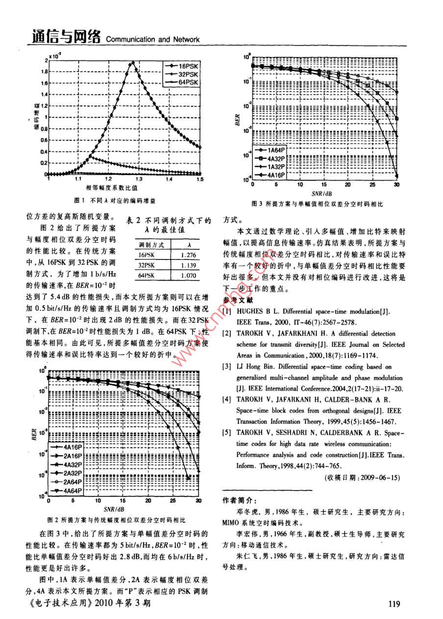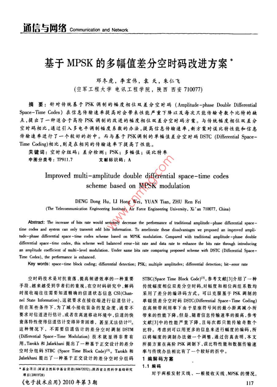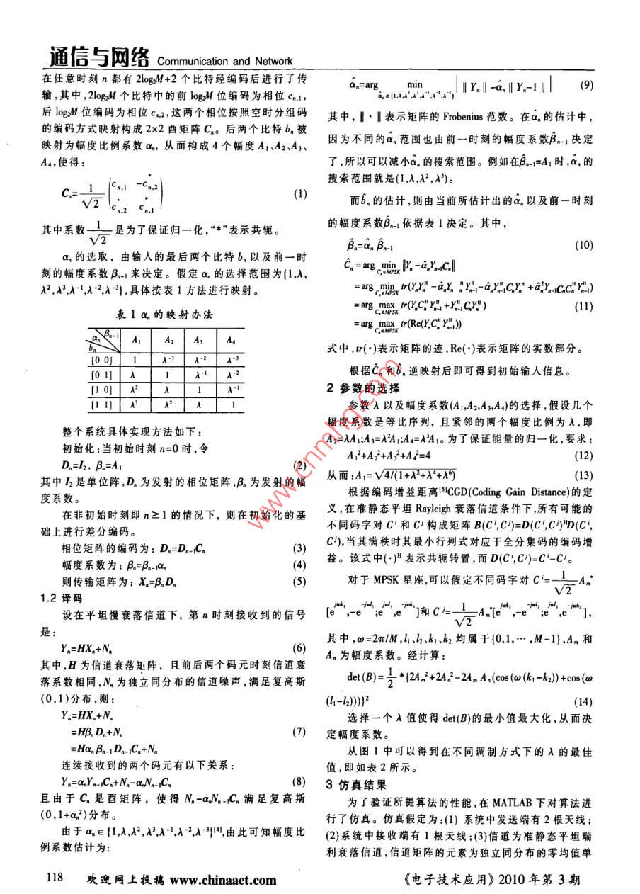 通信與網(wǎng)絡(luò) Communication and Network基于MPSK的多幅值差分空時(shí)碼改進(jìn)方案鄧冬虎,李宏偉,袁天,朱仁飛(空軍工程大學(xué)電訊工程學(xué)院,映西西安71007)摘要:針對(duì)傳統(tǒng)基于FSK調(diào)制的幅度相位雙差分空時(shí)碼( Amplitude- phase Double DifferentialSpace- Time Codes)在信息傳輸遠(yuǎn)率提高時(shí)會(huì)帶來(lái)性能?chē)?yán)重下降以及每次只能傳輸奇數(shù)個(gè)比特的缺點(diǎn),提出了一種適合于高階PSK調(diào)制的改進(jìn)的幅度相位雙差分空時(shí)碼方案。與傳統(tǒng)幅度相位雙差分空時(shí)碼相比,通過(guò)引入多電平調(diào)制幅度系數(shù)的辦法,提高信息傳輸速率,新方案對(duì)誤比特性能和信息傳翰速率進(jìn)行了一個(gè)較好的折中。而與基于PSK調(diào)制的單幅值差分空時(shí)碼DSTC( Differential SpaceTime Coding)相比,則是在相同的傳輸速率下提高了性能。關(guān)鍵詞:空時(shí)分組碼;差分檢測(cè);PSK;多幅值;誤比特率中圖分類(lèi)號(hào):TP911.7文獻(xiàn)標(biāo)識(shí)碼:AImproved multi-amplitude double differential space-time codesscheme based on MPSK modulationDENG Dong Hu, LI Hong Wei, YUAN Tian, ZHU Ren Fei(The Telecommunication Engineering Institute, Air Force Engineering University, Xi'an 710077, China)Abstract: The increase of bits rate would seriously decrease the performance of traditional amplitude-phase differential spacetime codes and system can only transmit odd bits information. To ameliorate these disadvantages we proposed an improved ampli-tude-phase differential space-time codes scheme based on MPSK modulation. Compared with traditional amplitude-phase doubledifferential space-time codes, this scheme well balanced error- bit rate and data rate to enhance the bits rate through introducingan amplitude coefficient of multi-level modulation, Under same bits rate comparing proposed scheme with DSTC(Differential SpaceTime Codes), the performance is enhancedKey words: space-time block coding; differential detection; PSK; multiple amplitudes; differential detection; bit-emor rate空時(shí)碼技術(shù)是對(duì)抗衰落、提高頻譜效率的一種重要STBC( Space Time Block Code)2l。參考文獻(xiàn)[3]介紹了一種手段,越來(lái)越受到學(xué)者們的重視。在空時(shí)碼研究中,解碼傳統(tǒng)幅度相位雙差分空時(shí)碼,對(duì)幅度和相位兩組系數(shù)均時(shí)接收端往往需要知道精確的信道狀態(tài)信息CSl(Chan·采用了差分的編譯碼方式??梢钥朔贙調(diào)制的nel State Information)),這就要求在接收端進(jìn)行信道估計(jì)。單幅值差分空時(shí)碼Dsrc( Differential Space- Time Coding)但在某些條件下,為了減小接收裝備的復(fù)雜度,通常不在高頻帶利用率下由于星座符號(hào)間的最小距離減小所要求對(duì)信道進(jìn)行估計(jì),或者在高速移動(dòng)環(huán)境中,信道的快帶來(lái)的性能下降。但是,隨著信息傳輸速率的提高,參考衰落特性使得信道估計(jì)變得異常困難,甚至無(wú)法估計(jì)叫。文獻(xiàn)[3]中的性能?chē)?yán)重下降,且每次都只能傳輸奇數(shù)個(gè)這種情況下,不需要信道估計(jì)的差分空時(shí)調(diào)制DSTM比特??紤]到可以用更多的信息來(lái)進(jìn)行幅度的編碼,所( Differential Space- Time Modulation)技術(shù)就顯得非常有以將幅度的調(diào)制辦法做一個(gè)調(diào)整,通過(guò)仿真表明,本文用。 Tarokh和 Jafarkhani提出了一種基于正交設(shè)計(jì)的差分所提方案在高階FK調(diào)制下,誤比特性能和數(shù)據(jù)傳輸速空時(shí)分組碼STBC( Space Time Block Code)/2。Takh和率與傳統(tǒng)辦法相比有了一個(gè)較好的折中。Jafarkhani提出了一種基于正交設(shè)計(jì)的差分空時(shí)分組碼1編解碼方案基金項(xiàng)目:國(guó)家自然科學(xué)基金資助(60672032);陜西省自然科學(xué)基礎(chǔ)研究1.1編碼項(xiàng)目(2007F28)對(duì)于兩根發(fā)射天線(xiàn)、一根接收天線(xiàn)、MFK的情況《電子技術(shù)應(yīng)用》2010年第3期l17通信與網(wǎng)絡(luò)Communication and Network在任意時(shí)刻n都有2logM+2個(gè)比特經(jīng)編碼后進(jìn)行了傳輸,其中,2lgM個(gè)比特中的前l(fā)ogM位編碼為相位ca,=arg min.Y, -a, Y,-1后lo8位編碼為相位c,這兩個(gè)相位按照空時(shí)分組碼其中,"·‖表示矩陣的 Frobenius范數(shù)。在的估計(jì)中,的編碼方式映射構(gòu)成2x2酉矩陣Cn。后兩個(gè)比特bn被映射為幅度比例系數(shù)a,從而構(gòu)成4個(gè)幅度A1、A2、A3因?yàn)椴煌腶n范圍也由前一時(shí)刻的幅度系數(shù)B,決定A4,使得了,所以可以減小a的搜索范圍。例如在B=A1時(shí),a的搜索范圍就是(1,A,A2,A)。(1)V2而b的估計(jì),則由當(dāng)前所估計(jì)出的a以及前一時(shí)刻其中系數(shù)一—是為了保證歸一化,“*”表示共軛的幅度系數(shù)B。依據(jù)表1決定。其中B.=a. B,I(10)an的選取,由輸人的最后兩個(gè)比特b以及前一時(shí)刻的幅度系數(shù)鳳-來(lái)決定。假定a的選擇范圍為(1,A,嗎8cmP-ay-CA2,A3,A-,A-2,A-),具體按表1方法進(jìn)行映射。酃8m(r-就,";-a"C"+CC"表1an的映射辦法ng以(C!+x:C")(11)S max r(Re( C Y )式中,r(…)表示矩陣的跡,Re()表示矩陣的實(shí)數(shù)部分。根據(jù)C和6。逆映射后即可得到初始輸人信息。0]A22參數(shù)的選擇參數(shù)λ以及幅度系數(shù)(A1,A2,AyA4)的選擇,假設(shè)幾個(gè)整個(gè)系統(tǒng)具體實(shí)現(xiàn)方法如下:幅度系數(shù)是等比序列,且緊鄰的兩個(gè)幅度比例為A,即A2=AA1;A3