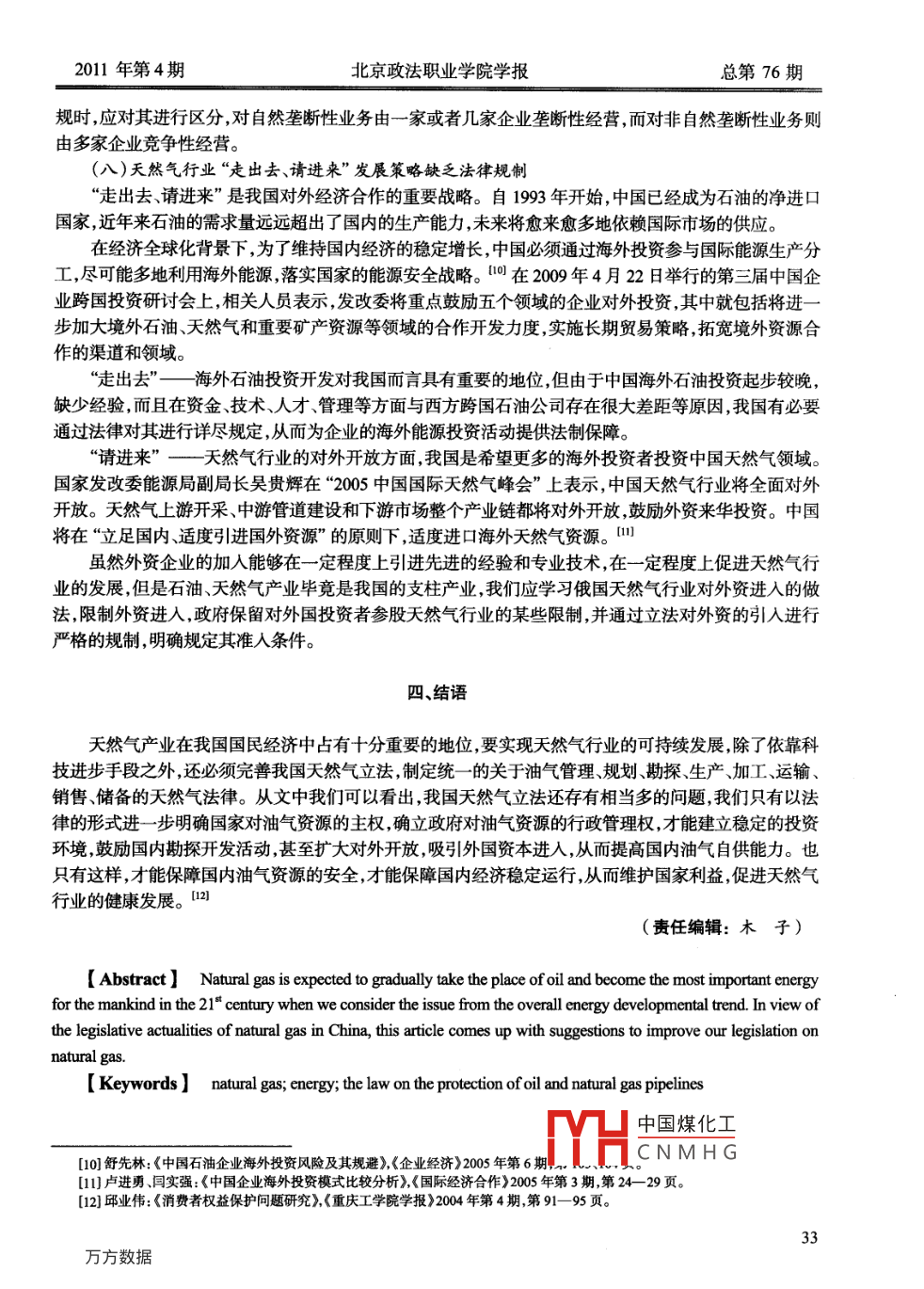 2011年第4期北京政法職業(yè)學院學報總第76期中圖分類號:DF466文獻標識碼:A文章編號:1672-9285(2011)04-002905我國天然氣立法現(xiàn)狀研究秦揚李亞美【摘要】從能源發(fā)展趨勢看,天然氣有望逐步取代石油,成為21世紀人類最重要的能源。本文根據(jù)我國天然氣立法現(xiàn)狀,提出了完善我國天然氣立法的建議。【關(guān)鍵詞】天然氣能源管道法一、我國天然氣立法概況目前,我國有關(guān)天然氣的專門立法主要有《中華人民共和國對外合作開采海洋石油資源條例》《礦產(chǎn)資源勘查區(qū)塊登記管理辦法入《開采海洋石油資源繳納礦區(qū)使用費的規(guī)定入《中外合作開采陸上、石油資源繳納礦區(qū)使用費暫行規(guī)定》《對外合作開采陸上石油資源條例》《石油、天然氣管道保護條例》《石油地震勘探損害補償規(guī)定入《石油及天然氣勘查、開采登記收費暫行規(guī)定》等十余部法律條例、規(guī)章及其他法律規(guī)范。此外,質(zhì)量法、土地法、環(huán)境保護法、稅法及工商管理等法律、法規(guī)也有涉及天然氣工業(yè)的內(nèi)容。這些行政法規(guī)和規(guī)章主要涉及了天然氣礦權(quán)及轉(zhuǎn)讓、天然氣資源管理體制、管道安全、對外合作、土地、環(huán)保質(zhì)量、安全、地震補償稅費等領(lǐng)域初步形成了以天然氣上游為主的法規(guī)體系。隨著我國天然氣開發(fā)、應用規(guī)模迅速擴大,天然氣相關(guān)法律的缺失顯然已經(jīng)不能適應天然氣工業(yè)的快速發(fā)展,天然氣立法被提上了重要的議事日程。在2007年底,國家公布了有“能源行業(yè)小憲法”之稱的《能源法》(征求意見稿)《能源法》送審稿在2009年1月初提交到國務(wù)院,目前正在法制辦進行意見征詢和初審,但《能源法》具體出臺時間尚無定論。就在《能源法》送審稿提交的同一年,十一屆全國人大常委會第十一次會議初次審議了《石油、天然氣管道保護法》草案,該法律草案對石油、天然氣管道的規(guī)劃與建設(shè)進行了規(guī)范,目前該法律已經(jīng)得到通過并實施。2009年5月,國家發(fā)改委政策法規(guī)司權(quán)威人士表示,受國家發(fā)改委召集,由能源專家法律專家及石油企業(yè)內(nèi)部人士參與的《石油(天然氣)法》的起草工作已經(jīng)啟動,草案初稿已經(jīng)完成。項法律從審批到立法需要時日,雖然我們無法敲定他們出臺的具體時間,我們卻可以從中看出國家對天然氣能源法規(guī)建設(shè)的重視,這將促進我國天然氣工業(yè)的發(fā)展。二、我國現(xiàn)有天然氣政策法律制度情況雖然我國天然氣立法體系總體上仍然不夠完善,尚未形成統(tǒng)一法規(guī)形式,但從零散的現(xiàn)有立法規(guī)定中,仍可以概括出我國天然氣立法制度的主要內(nèi)容。中國煤化工[本文系四川省哲學社會科學“十一五”規(guī)劃2009年度基金項目。[2]秦揚:西南石油大學法律研究所所長、教授CNMHG[3]李亞美:西南石油大學碩士研究生。[4周志斌:《中國天然氣經(jīng)濟發(fā)展問題研究》,石油工業(yè)出版社2008年版秦揚李亞美:我國天然氣立法現(xiàn)狀研究(一)管理體制我國對天然氣資源實行“一級管理體制”。根據(jù)該體制的規(guī)定,中央政府統(tǒng)一負責天然氣資源的勘探、開采主體資格的審批、勘探、開采許可證的發(fā)放、發(fā)展規(guī)劃和法規(guī)政策的制定、對外合作區(qū)塊及合同的審批等。(二)許可證制度對于天然氣的勘探、開采,我國實行許可證制度。凡是在中華人民共和國領(lǐng)域及管轄的其他海域從事天然氣資源勘查活動,應由國務(wù)院授權(quán)石油工業(yè)主管部門負責登記,并向地質(zhì)礦產(chǎn)主管部門備案,頒發(fā)勘查許可證,成為礦業(yè)權(quán)人后,方可進行勘查工作。采礦權(quán)和探礦權(quán)的取得必須采用有償?shù)姆绞?在定條件下也可以轉(zhuǎn)讓其權(quán)利。外商投資企業(yè)申請勘查項目,在簽訂合同前,由登記管理機關(guān)復核簽署意見,在簽訂合同后,由中方有關(guān)單位向登記管理機關(guān)辦理登記手續(xù)。(三)天然氣資源歸國家所有礦產(chǎn)資源國家所有權(quán)制度是我國國家財產(chǎn)所有制度的一個重要組成部分。它是指國家對全民所有的財產(chǎn)享有的占有使用、收益和處分的權(quán)利,是全民所有制在法律上的表現(xiàn)形式。這種所有權(quán)具有統(tǒng)性和唯一性。統(tǒng)一性是指國家是中華人民共和國領(lǐng)域和管轄的其他領(lǐng)海內(nèi)一切礦產(chǎn)資源的所有權(quán)主體,在可以享有所有權(quán)的礦產(chǎn)資源種類和范圍上不受限制。唯一性是指任何國家機關(guān),不論其地位作用如何,都不能完全擁有礦產(chǎn)資源所有權(quán)人的權(quán)能每個國家機關(guān)只能在法律規(guī)定的權(quán)限內(nèi)代表國家行使處分和利用礦產(chǎn)資源的權(quán)能。具體到法律規(guī)定上來看依照憲法及《礦產(chǎn)資源法》的規(guī)定國家擁有礦產(chǎn)資源的所有權(quán)國家對礦產(chǎn)資源的所有權(quán)由國務(wù)院行使。國家保障自然資源的合理利用,禁止任何組織或者個人用任何手段侵占、處置或者破壞礦產(chǎn)資源。據(jù)此我們可以看出,我國的天然氣資源歸國家所有。(四)在對外合作方面實行合同制為保障石油工