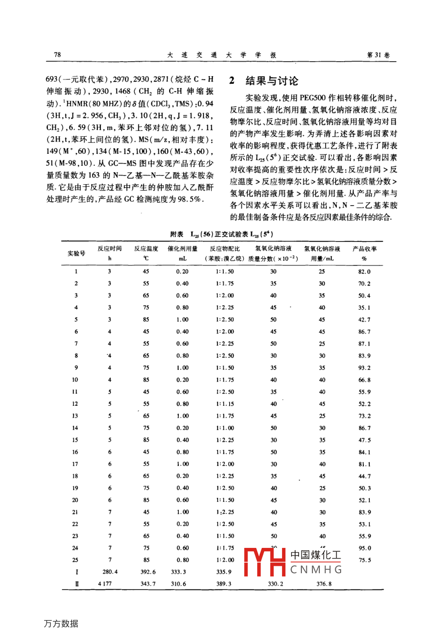 第31卷第1期,連交通Vol.31 No.12010年2月JO'RNAL 0F DAI.IAN JIAOTTONG UINIVERSITYFeb. 2010文章編號:1673- 9590( 2010)01-0077-04聚乙二醇500相轉(zhuǎn)移催化合成N,N-二乙基苯胺田慶偉(大連交通大學(xué)環(huán)境科學(xué)與工程學(xué)院,遼寧大連116028)摘要:用聚乙二醇 500作相轉(zhuǎn)移催化劑,在常壓下由苯胺和澳乙烷合成N.N-二乙基苯胺,研究了多種反應(yīng)因素對目的產(chǎn)物產(chǎn)率的影響,提出常壓催化合成目的產(chǎn)物的最佳工藝條件是:苯胺和溴乙烷的摩爾比為1:1.75 ,催化劑用量0.60 g.在45 mL 30 x I0 : 2的氫氧化鈉溶液中,反應(yīng)溫度75C ,常壓反應(yīng)7h,產(chǎn)品收率95.0%.關(guān)鍵詞:聚乙二醇;相轉(zhuǎn)移催化;N,N-二乙基苯胺中圖分類號:TQ246.3文獻(xiàn)標(biāo)識碼:A0引言1.2 實驗方法N,N-二乙基苯胺是制備優(yōu)良染料、藥物和在裝有電動攪拌溫度計、回流冷凝管的500 mL彩色顯影劑的重要中間體,用途廣泛".傳統(tǒng)合四頸燒瓶中,加入11 mL(0. 12 mol)苯胺和15. 75 mL成方法是將定量的苯胺、氯乙烷壓倒裝有液堿的(0.21 mol)澳乙烷,0.60 g(1.2x10-3 mol)聚乙高壓釜中,夾套蒸氣升溫到120C ,壓力為1.2 MPa二醇500 ,45 mL質(zhì)量分?jǐn)?shù)30 x 10-2的氫氧化鈉溶時,停汽.其后由于反應(yīng)熱產(chǎn)生,溫度可升到215~液,加熱控制反應(yīng)瓶溫度為75C,常壓下攪拌反230C ,壓力達(dá)4.5 ~5.5 MPa,反應(yīng)3 h,出料用水應(yīng)7 h,冷卻至室溫,將反應(yīng)液倒入分液漏斗中,靜汽蒸餾.得粗品,加苯二甲酸酐酯化,再進(jìn)行一次置分層.將油.水兩層分離.水層用30mL乙醚分蒸餾得成品,產(chǎn)品收率在85%以上2).近年來,常三次萃取,萃取液與油層混合,用無水硫酸鎂干燥壓相轉(zhuǎn)移催化合成N,N一二乙基苯胺的方法(-5] 3 h,過濾,蒸出乙醚.用等體積的乙酸酐處理剩余引起人們關(guān)注.在此基礎(chǔ)上,本文提出用聚乙二醇物并保持過夜,以除去游離的仲胺.加入過量500( PEG500)作相轉(zhuǎn)移催化劑,在氫氧化鈉溶液10%的鹽酸洗滌至酸性(pH=1 ~2),分出乙酰存在下,使苯胺和溴乙烷作用,合成了N,N-二N- -乙基苯胺,用25%氫氧化鈉溶液調(diào)pH為11 ~乙基苯胺,研究了多種反應(yīng)因素對目的產(chǎn)物產(chǎn)率12,靜置分層,分離油、水兩層水層用30 mL乙醚萃的影響,提出了最佳工藝條件,產(chǎn)品產(chǎn)率為95%.取兩次.將萃取液與油層混合,用無水硫酸鎂干燥1實驗方法3 h,蒸去乙醚后,減壓蒸餾,收集沸點62 ~66C/400 Pa時的餾分,得N,N一二乙基苯胺14.63 g, 收率1.1測試儀 器和試劑Perkin-Elmer 1730型傅里葉變換紅外光譜95.0%.儀,美國PE公司;PFT-NMR Bruker AC-80型核磁1.3產(chǎn)品分析共振譜儀,美國Bruker公司;日立AC-80型質(zhì)譜將減壓蒸餾得到的產(chǎn)品分別通過儀,日本日立公司;島津GC-16型氣相色譜儀,日IR,' HNMR ,GC-MS光譜鑒定,證實是N,N-二乙本島津公司. .基苯胺,IR值(cm-'):1 598,1 573,1 507,1 449苯胺、氫氧化鈉、乙酸酐均為AR;溴乙烷、(芳環(huán),C-C骨架振動) ,3 025(芳環(huán),C-H伸縮PEG500均為CP.振動),1 355,1 266(芳環(huán), C-N伸縮振動) ,746,中國煤化工收稿日期:2009-04-20CNMHG作者簡介:田慶偉( 1963-),男,副教授,碩士,主要從事精細(xì)化子麗和梁科中間體時研咒E-mail:qwian63@ hotmail. com.78大連交通大學(xué)學(xué)報第31卷693(-元取代苯) ,2970, 2930,2871(烷烴C-H2結(jié)果 與討論伸縮振動),2930, 1468(CH2的C-H伸縮振.動)." HNMR(80 MHZ)的8值(CDCI,TMS) :0.94實驗發(fā)現(xiàn),使用PEG500作相轉(zhuǎn)移催化劑時,(3H,t,J =2.9s6, CH,),3.10(2H,q,.J=1. 918,反應(yīng)溫度、催化劑用量、氫氧化鈉溶液濃度、反應(yīng)CH2),6. 59(3H,m,苯環(huán)上鄰對位的氫),7.11物摩爾比、反應(yīng)時間、氫氧化鈉溶液用量等均對目(2H,t,苯環(huán)上間位的氫). MS( m/z,相對豐度):的產(chǎn)物產(chǎn)率發(fā)生影響.為弄清上述各影響因素對149(M" ,60),134( M. I5,100), 160(M-43,60),收率的影響程度,獲得優(yōu)惠工藝條件,進(jìn)行了附表51(M-98,10).從GC- -MS圖中發(fā)現(xiàn)產(chǎn)品存在少所示的L2s(5*)正交試驗.可以看出,各影響因素量質(zhì)量數(shù)為163的N-乙基- _N- -乙?;桨冯s對收率提高的重要性次序依次是:反應(yīng)時間>反質(zhì).它是由于反應(yīng)過程中產(chǎn)生的仲胺加人乙酰酐應(yīng)溫度>反應(yīng)物摩爾比>氫氧化鈉溶液質(zhì)量分?jǐn)?shù)>處理時產(chǎn)生的,產(chǎn)品經(jīng)CC檢測純度為98.5%.氫氧化鈉溶液用量>催化劑用量.從產(chǎn)品產(chǎn)率與各個因素水平關(guān)系可以看出,N,N-二乙基苯胺的最佳制備條件應(yīng)是各反應(yīng)因素最佳條件的綜合,附表L(56)正交試驗表 L2(5*)實驗號反應(yīng)時間反應(yīng)溫度 催化利用量 反應(yīng)物配比氯氧化鈉溶液氫氧化鈉溶液產(chǎn)品收率hm(苯股:澳乙燒)質(zhì)量分?jǐn)?shù)(x10-2)用量/mL%450.201:1.50302:82.05s0.401:1.7570.260.601:2.003550.4750.801:2.2544035.1851.001:2. s0s042.786.7sc87.11:2.503C83.93:93.21066.855.912s51:1.1552.21:1.72573.21:1.005086. 747.584.100.244.71950.320852.121225S53.123247:95.0中國煤化工75.5280.4392.6333335.9 ,YHCNMHG4 177343.7310.6 .389.3330.2376.8第1期田慶偉:聚乙二醇500相轉(zhuǎn)移催化合成N,N-二乙基苯胺.79附表Lx(56)正交試驗表 L2g(5*)(縷)反應(yīng)時間反應(yīng)溫度催化劑用量反應(yīng)物配比氫氧化鈉溶液氫氧化鈉溶液產(chǎn)品收率實驗號muL(苯胺:溴乙烷) 質(zhì)量分?jǐn)?shù)( x10-2)用量/mL%315.5318.1340.5380.4 .303.6 .328.8N360.8 .330.8298. 3300.2294.8419. 5284.6374. 1285. 9356.5321.31/556.178. 