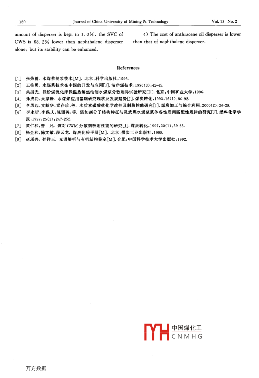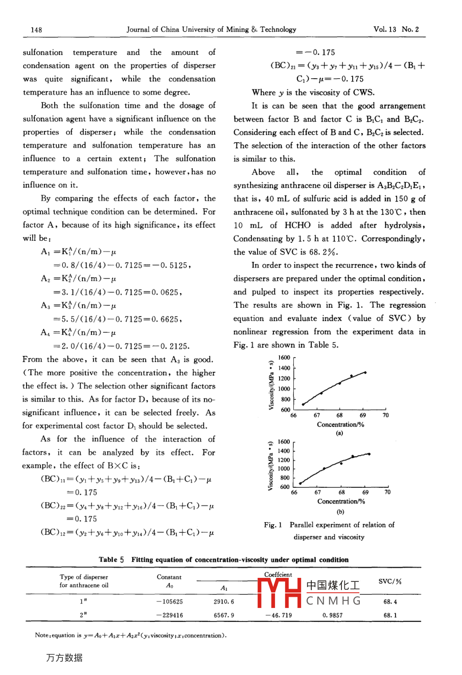 Dec. 200Journal of China University of Mining TechnologyVol. 13 No. 2Research on Synthesizing Disperserwith fraction of anthracene oil forCoal Water SlurryWU Guo-guang(吳國光), GUO Zhao-bing(郭照冰)2, wU Jian-jan(武建軍)1Xie Qiang(解強)3, WANG Xiao-chun(王曉春)(1. School of Chemical Engineering and Technology, CUMT Xuzhou, Jiangsu 221008, China2. School of Environment, Nanjing University, Nanjing, Jiangsu 210093, China;3. School of Chemical and Environmental Engineering, CUMT, Beijing 100083, China)Abstract: Experiment of synthesizing a disperser for coal water slurry (CwS) by using fractions of anthracene oilfrom high-temperature coal tar was performed. The orthogonal testsed to investigate the influence oftemperature,time, quantity of sulfonation agent and condensation agent and the interaction of these factors onproperties of the disperser. The result shows that the influence of temperature, time, quantity of sulfonation agentnd condensation agent, and the interaction of sulfonation time and sulfonation agent has a significant influence onthe properties of disperser. The optimal condition of synthesis is that in 150g of the fractions of anthracene oil, 40mL of sulfonation agent is added and sulfonated for 3 h at 130C, then, 10 mL of condensing agent is added andcondensated for 1.5 h at 115cCLC number: TQ 519 Document code: a Article ID: 1006-1266(2003)02-0145-06Coal water slurry (CwS) is a new type of coalCoal from Pangzhuang Mining Area, Xuzhoubased clean fuel for oil. its technology of producing Coal Mine Group was used in the experiment 8JCWS has attracted much attention of scientists all (Table 1). The coal belongs to bituminous coal of aoverthe world. 1, 2] It is well known that a kind of lower-medium rank. It has a low inherent moisturechemical disperse agent with good properties is one and a high H. G. index, which is easy to be groundof key factors preparing high quality of CWS. [3,4 into fine coalsSo, many researchers(3. 5-7) have studied thea given quantity of lump coal was put into apreparation of the disperser for Cws. But few crusher (SP-100 X 100), in which the lump coresearches on synthesizing disperser for CwS from was crushed into particles of less than 3mm. Thenfractions of anthracene oil have been done. The the particles were put into an oven drying for 3 h atpurpose of the research is to prepare the disperser by 105C, devided into two parts with the sameusing the fraction of anthracene oil which is easy to weight, ground in a rod mill XMB-70be obtained and examine its properties after respectively. One part was ground for 50 min, anpreparing CWS, so as to determine the optimal the other for 2 h. Then they were mixed togethernesis conditionthus a reasonable distribution of particle size of coalwas ob1 Experimentwhich could meet the requirement of中國煤化工1. 1 Property and preparation of coal sampleCNMHGBiography WU Guo-guang(1963-), male, from Changzhou, Jiangsu Province, associate professor, Ph. D, engaged in the research orclean coal technolog.146Journal of China University of Mining TechnologyVol 13 No. 2Table 1 Properties anal ysis of raw coalsoftdef1.3210.7936.5483.434.701.30150064.811.2 Synthesis of disperser1)Main material1. 3 Design of experimentAnthracene oil is from Jining Coal ChemicalThere are many factors influencing on theInstitute of Shangdong Lukang Group. The main synthesis of disperser. Considering the simplicityedients are anthracene, phenanthrene and some and efficiency of technique; the variety of technical2-3 cyclic aromatics. The others are chemically pure parameters is simplified. Factors, such assulfuric acid, formaldehyde and sodium hydroxide.sulfonation temperature(A), time(B), dosage of2) Main apparatusagent(C), condensation temperature(D), andFlask with four holes, condensing tube, dosage of condensation agent(e) are investigated inthermometer, separatory funnel, Zht type of detail. Levels of factors are selected based onelectric heater automatically constant temperature chemical properties of anthracene and phenanthreneand dynamical stirring equipment were used in the (Table 2)Table 2 The level and factorsfsallonationautonationV(H2SO4)feoodensstionV(HCHO)9025130be seen from Table 2 that it is an the experiment of synthesizing disperser for CwSone 4-level factor and four 2-level can be obtained based on factor levels in Table 2,factors. Considering the interaction of factors(Ax from which 16 kinds of dispersers for CWS can bB, AXC, BXC), an orthogonal test table is used. prepared and their properties, corTable 3, a test table Lis(4 2), or the schema ofTable 3 The orthogonal test L16(4x 212)A×BBXC1230121112211222212121221222112212112121中國煤化工2CNMHG22wU Guo-guang et alResearch on Synthesizing Disperser with Fraction of1471. 4 Preparation of CWSwas used as an index for assessment. The value ofa given quantity of disperser was dissolved in SVC is the index to compare the quality of CwS orwater. A certain quantity of fine coal was added to assess the properties of disperser. It can begradually while it was being stirred. Then the defined as the concentration under a certainixture was stirred by 5 min at 1200 r/minviscosity. The correspondent dots were drawn with1.5 Test of viscositya longitudinal coordinate for viscosity and aThe NXS-11A rotary viscosimeter was used to horizontal coordinate for concentration. Then thetest the viscosity of CwS, with a sheer rate of fitting equation can be obtained by the fitting curve.100s-1at24℃Then the concentration in accordance with a1.6 Test of coal content 1Jviscosity of 1200 Mpa.s was calculated, which is1+0. 1 g of CWS sample was weighed and put the value of SVC. 16 samples of CwS were madeinto a known weight glass bottle with a cover. The using 16 kinds of disperser prepared based on Tableottle was uncovered and put it into an oven at 3. The dosage of disperser for each CWS sample is105C, then the bottle was taken out of the oven, kept 1% and it is a mixture ofanthracen