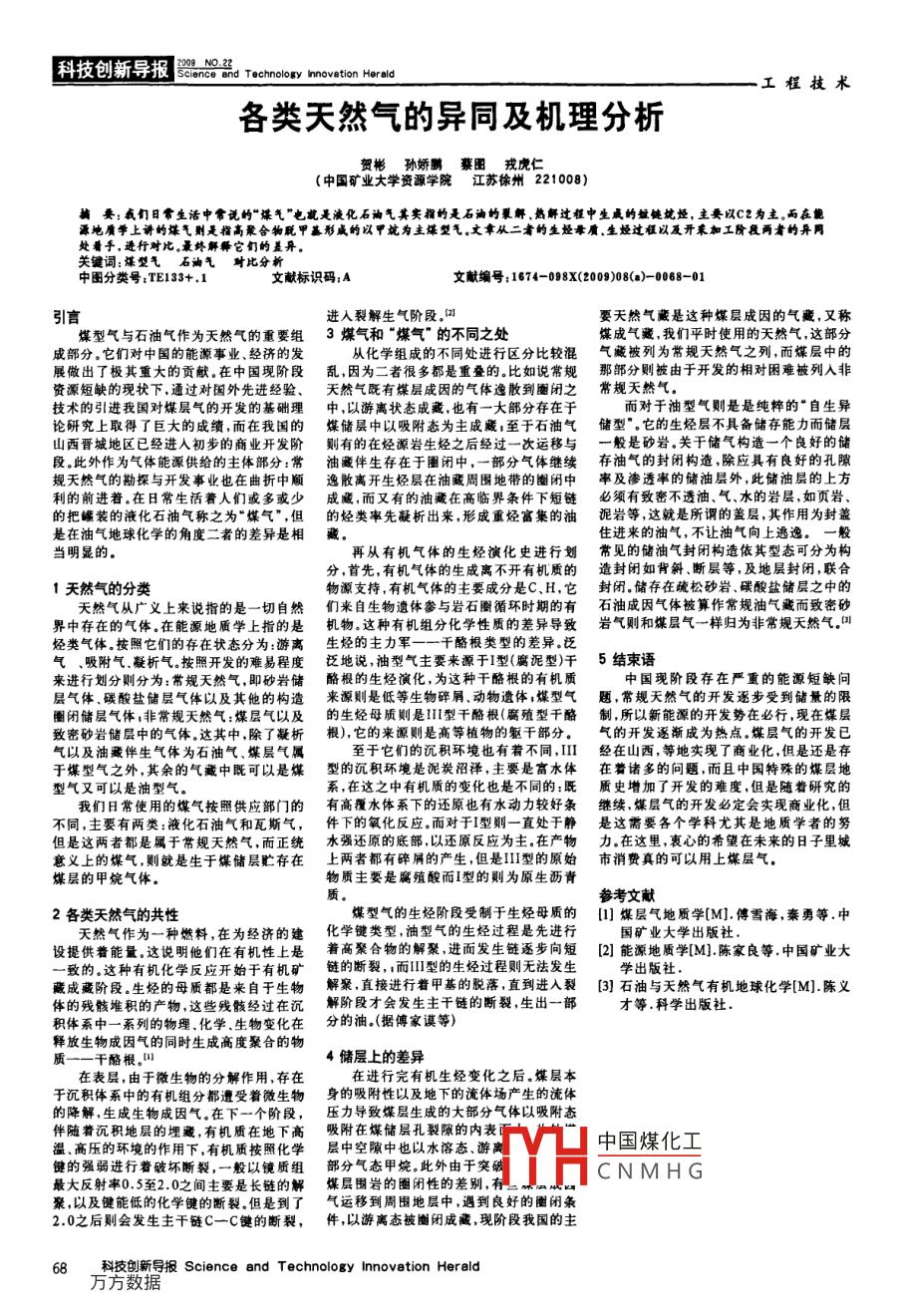 科技創(chuàng)新導(dǎo)報器mmnsy novation Herald工程技術(shù)各類天然氣的異同及機理分析賀彬?qū)O嬌鵬蔡圖戎虎(中國礦業(yè)大學(xué)資源學(xué)院江蘇徐州221008)摘要:我們?nèi)粘I钪谐Uf的“煤氣”也就是液化石油氣其實指的是石油的解熱解過樁中生威的量鏈就燥,主要以C2為主。而在能源地履季上講的煤氣則是指高聚合物脫甲基形成的以平就為主媒型氣丈拿從二者的生烴一質(zhì)生烴過租以及開乘加工階段兩者的異月處看手,透行對比,最終解釋它們的差異。關(guān)鍵詞:煤型氣石油氣對比分析中圖分類號:TE133+,1文獻(xiàn)標(biāo)識碼;A文獻(xiàn)編號:1674-098X(2009)08(a)-0068-01入裂解生氣階段。2要天然氣藏是這種煤層成因的氣藏,又稱煤型氣與石油氣作為天然氣的重要組3煤氣和“煤氣”的不同之處煤成氣藏,我們平時使用的天然氣,這部分成部分,它們對中國的能源事業(yè)、經(jīng)濟(jì)的發(fā)從化學(xué)組成的不同處進(jìn)行區(qū)分比較混氣藏被列為常規(guī)天然氣之列,而煤層中的展做出了極其重大的貢獻(xiàn)。在中國現(xiàn)階段亂,因為二者很多都是重疊的。比如說常規(guī)那部分則被由于開發(fā)的相對困難被列入非資源短缺的現(xiàn)狀下,通過對國外先進(jìn)經(jīng)驗、天然氣既有煤層成因的氣體逸散到圈閉之常規(guī)天然氣技術(shù)的引進(jìn)我國對煤層氣的開發(fā)的基礎(chǔ)理中,以游離狀態(tài)成藏,也有一大部分存在于而對于油型氣則是是純粹的“自生異論研究上取得了巨大的成績,而在我國的煤儲層中以吸附態(tài)為主成藏;至于石油氣儲型”。它的生烴層不具備儲存能力而儲層山西晉城地區(qū)已經(jīng)進(jìn)入初步的商業(yè)開發(fā)階則有的在烴源巖生烴之后經(jīng)過一次運移與一般是砂巖,關(guān)于儲氣構(gòu)造一個良好的儲段此外作為氣體能源供給的主體部分:常油藏伴生存在于圈閉中,一部分氣體繼續(xù)存油氣的封閉構(gòu)造,除應(yīng)具有良好的孔隙規(guī)天然氣的勘探與開發(fā)事業(yè)也在曲折中順逸散離開生烴層在油藏周圍地帶的圈閉中率及滲透率的儲油層外,此儲油層的上方利的前進(jìn)著,在日常生活著人們或多或少成藏,而又有的油藏在高臨界條件下短鏈必須有致密不透油、氣、水的巖層,如頁巖的把罐裝的液化石油氣稱之為“煤氣”,但的烴類率先凝析出來,形成重?zé)N富集的油泥巖等,這就是所謂的蓋層其作用為封蓋是在油氣地球化學(xué)的角度二者的差異是相藏。住進(jìn)來的油氣,不讓油氣向上逃逸般當(dāng)明顯的。再從有機氣體的生烴演化史進(jìn)行劃常見的儲油氣封閉構(gòu)造依其型態(tài)可分為構(gòu)分,首先,有機氣體的生成離不開有機質(zhì)的造封閉如背斜斷層等,及地層封閉,聯(lián)合1天然氣的分類物源支持,有機氣體的主要成分是C、H,它封閉儲存在疏松砂巖、碳酸鹽儲層之中的天然氣從廣義上來說指的是一切自然們來自生物遺體參與巖石圈循環(huán)時期的有石油成因氣體被算作常規(guī)油氣藏而致密砂界中存在的氣體在能源地質(zhì)學(xué)上指的是機物這種有機組分化學(xué)性質(zhì)的差異導(dǎo)致巖氣則和煤層氣一樣歸為非常規(guī)天然氣烴類氣體。按照它們的存在狀態(tài)分為:游離生烴的主力軍一一千酪根類型的差異泛氣、吸附氣凝析氣按照開發(fā)的難易程度泛地說,油型氣主要來源于I型(腐泥型)干5結(jié)束語來進(jìn)行劃分則分為:常規(guī)天然氣,即砂巖儲酪根的生烴演化,為這種干酪根的有機質(zhì)中國現(xiàn)階段存在嚴(yán)重的能源短缺問層氣體、碳酸鹽儲層氣體以及其他的構(gòu)造來源則是低等生物碎屑、動物遺體;煤型氣題,常規(guī)天然氣的開發(fā)逐步受到儲量的限圈閉儲層氣體,非常規(guī)天然氣:煤層氣以及的生烴母質(zhì)則是Il型干酪根(腐殖型干酪制,所以新能源的開發(fā)勢在必行,現(xiàn)在煤層致密砂巖儲層中的氣體達(dá)其中除了凝析根),它的來源則是高等植物的軀干部分。氣的開發(fā)逐漸成為熱點煤層氣的開發(fā)已氣以及油藏伴生氣體為石油氣、煤層氣屬至于它們的沉積環(huán)境也有著不同,II經(jīng)在山西,等地實現(xiàn)了商業(yè)化,但是還是存于煤型氣之外,其余的氣藏中既可以是煤型的沉積環(huán)境是泥炭沼澤,主要是富水體在著諸多的問題,而且中國特殊的煤層地型氣又可以是油型氣。系,在這之中有機質(zhì)的變化也是不同的:既質(zhì)史增加了開發(fā)的難度,但是隨著研究的我們?nèi)粘J褂玫拿簹獍凑展?yīng)部門的有高覆水體系下的還原也有水動力較好條繼續(xù)煤層氣的開發(fā)必定會實現(xiàn)商業(yè)化,但不同,主要有兩類:液化石油氣和瓦斯氣,件下的氧化反應(yīng),而對于I型則一直處于靜是這需要各個學(xué)科尤其是地質(zhì)學(xué)者的努但是這兩者都是屬于常規(guī)天然氣,而正統(tǒng)水強還原的底部以還原反應(yīng)為主在產(chǎn)物力在這里衷心的希望在未來的日子里城意義上的煤氣,則就是生于煤儲層貯存在上兩者都有碎屑的產(chǎn)生,但是I型的原始市消費真的可以用上媒層氣。媒層的甲烷氣體物質(zhì)主要是腐殖酸而I型的則為原生瀝青參考文獻(xiàn)2各類天然氣的共性煤型氣的生烴階段受制于生烴母質(zhì)的]煤層氣地質(zhì)學(xué)[M]傅雪海,秦勇等.中天然氣作為一種燃料,在