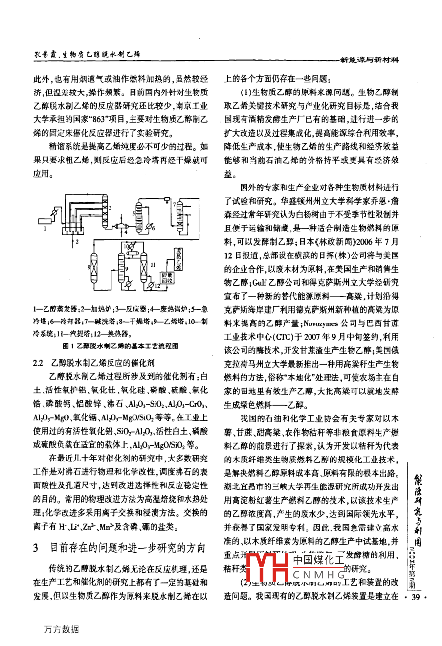 新能源與新材料生物質匕醇脫水制乙烯孔芬霞肖睿(東南大學能源與環(huán)境學院江蘇南京210006摘要:介紹了生物質乙醇脫水制乙烯的發(fā)展現(xiàn)狀,并與石油裂解制乙烯進行了比較,闡述了其突出的優(yōu)點。同時對生物質乙醇脫水制乙烯的反應動力學機理、國內外常用的反應器和主要工藝進行了闡述。最后指出了目前存在的問題,如原料來源、工藝和設備的改進、新型催化劑的研制等。關鍵詞:生物質乙醇;催化劑;反應機理;反應器工藝Abstract: The development condition of biomass ethanol dehydrating to produce ethyleneintroduced, giving a comparison with petroleum cracking to ethylene; its outstanding advantagealso discussed. At the same time, the reaction kinetic mechanism, the commonly used reactor andprocess at home and abroad are in discussion. At last, this paper points out the problems at presentsuch as raw material source, the improvement of process and equipment, the problem of research onnew catalysts, et al.Key words biomass ethanol; catalysts; reaction mechanism; reactor and process中圖分類號:TK019文獻標志碼:A文章編號:1001-5523(200802-0037-04目前有75%的石油化工產(chǎn)品由乙烯生產(chǎn),乙烯可避免對石油資源的依賴。對貧油或無油國家及地產(chǎn)量已成為衡量一個國家石油化工工業(yè)發(fā)展水平區(qū),尤其對以農(nóng)業(yè)為主的國家十分重要。的標志。目前國家已明確將生物乙醇脫水制乙烯列(2)石油貯量隨著開采量的增加和開采時間的人“863計劃”生物和現(xiàn)代農(nóng)業(yè)領域的“生物能源技延長,逐漸減少要考慮將來生產(chǎn)乙烯原料的長久來術開發(fā)與產(chǎn)業(yè)化”項目指南中。生物質乙醇指以生源問題物質為原料通過發(fā)酵制得的乙醇川,生物質原料包(3)用生物質乙醇作原料脫水制乙烯投資少建括玉米高粱、小麥、大麥、甘蔗、甜菜和土豆等含糖設周期短收效快,工藝簡單技術要求不高。類和淀粉的農(nóng)作物,此外城市垃圾、甘蔗渣、小樹(4)生物質乙醇催化脫水制乙烯純度高,產(chǎn)品單干、木片等纖維質原料也可用來生產(chǎn)生物燃料乙純。如果不要求聚合乙烯則可不必分離直接使用醇。生物乙醇濃度較低,通常僅為10%(質量分數(shù))(乙烯純度一般可達98%)。左右。發(fā)酵液中還含有許多其他雜質,如甲醇、乙酸、甘油等,通過蒸餾將乙醇產(chǎn)物分離純化需要消有極大的好處。耗很大的能量。乙烯可以由乙醇脫水得到因此將能次研究與(5)利用生物質乙醇作為替代原料對改善環(huán)境對低濃度的生物乙醇不經(jīng)過嚴格的分離純化,而是一1乙醇脫水的動力學研究步催化脫水制乙烯可以作為生物質產(chǎn)業(yè)的一個重要發(fā)展方向。中國煤化工間脫水和分子內脫水兩程和分子間脫生物質乙醇脫水制乙烯有其突出的優(yōu)點CNMHG水(1)原料乙醇主要來源于農(nóng)副產(chǎn)品的發(fā)酵這樣乙醇在酸催化作用下,發(fā)生分子內脫水生成乙,37,孔霞,生物質乙醇脫水制乙烯新能源與新材料烯的反應屬于E1消除反應歷程,反應機理可用下式催化劑提出乙醇脫水反應屬于平行反應,會生成乙氧基這一中間產(chǎn)物; Junko N Kondo(等利用原為紅CHJCH:OH+Hv快八 CHiCH,OH2(1)外檢測也證實了在反應過程中乙氧基這一中間產(chǎn)物的存在;河北工業(yè)大學的劉雁等利用序貫模塊法CH2CH2OH2++CH3 CHr+H,0(2)對乙醇脫水反應的動力學進行了研究,也認為乙醇H-CH, CH2++CH=CHr-H*(3)脫水反應符合平行反應機理乙醇分子間脫水生成乙醚實質上是親核取代反Chang等提出只要催化劑上存在足夠多的酸應,基本按SN2歷程進行:性位,乙醇可以直接反應生成乙烯;RLEⅤ AN MAOCHJCH2OH+H*++CHCH,OH2(4)等在ZSM5分子師基礎上提出52398K范圍內乙醇直接生成乙烯,448-498K范圍內乙醇生成乙CH,OH+CH,CHr-OH2+C2HSOC2H,+H,0 (5)醚,而498-523K范圍內乙醚生成乙烯和乙醇,反CHSOC++CHSOCH+H(6)應是在B酸中心上進行。綜上所述,乙醇脫水可生成乙烯和乙醚但高溫該反應同樣是先生成鐸鹽,使碳氧鍵的極性增有利于乙烯的生成,較低溫度時主要生成乙醚,這是強,烷基中的碳原子帶有部分正電荷使之與另一分因為反應過程中生成的碳正離子很活潑尤其在高子乙醇中的氧原子結合,生成二乙基鏵鹽離子,然溫,它的存在壽命更短,來不及與乙醇相遇時已經(jīng)失后失去質子得乙醚。有人認為乙醇分子間脫水是按去質子變成乙烯:而在較低溫度時碳正離子存在時SN歷程明,開始同E1歷程中的前兩式,當產(chǎn)生碳正間長些,與乙醇分子相遇的機率增多生成乙醚。離子后如果不進一步消去質子而是與乙醇作用,也有人認為嗎,在生成產(chǎn)物的決定步驟中生成乙烯則生成乙醚要斷裂CH鍵需要的活化能較高所以要在高溫才CH3OH+CHCH,++C2HSOC Hs(7)有利于乙烯的生成。CHOC2H一C2HOC2H+H(8)2乙醇脫水制乙烯的工藝目前,乙醇脫水反應的催化劑主要有γ-Al4O32.1乙醇脫水制乙烯工藝催化劑和酸性ZSM-5分子篩催化劑兩大類1797年首次由乙醇脫水獲得了乙烯并很快發(fā)Blaszkowski和 Van Santen指出:γ-AlO3的催化活展成工業(yè)規(guī)模的生產(chǎn)。70年代世界能源危機,乙醇性與其表面脫氫過程中形成的L酸L堿對有關,富生產(chǎn)乙烯的路線再次引起發(fā)達國家的重視,其表現(xiàn)電子的陰離子氧表現(xiàn)出堿的特性缺電子的陽離子在對開發(fā)新型催化劑的積極性。鋁表現(xiàn)出酸的特性。而酸性分子篩的催化活性與B我國在60年代以前
