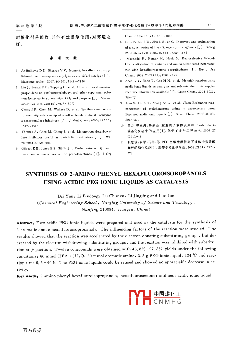 聚乙二醇型酸性離子液體催化合成2-(氨基苯)六氟異丙醇