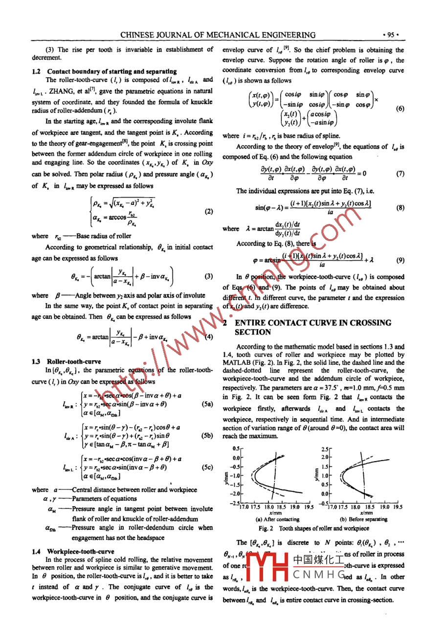 CHINESE JOURNAL OF MECHANICAL ENGINEERING●94.Vol. 21, No. 6, 2008DO: 10.3901/CIME 2008.06 094, available online at www.cjmenet.com; www.cjmenel.com.cnTOOTH CURVES AND ENTIRECONTACT AREA IN PROCESSZHANG DaweiSchool of Matenals Science andOF SPLINE COLD ROLLING*Engineeing,Northwestem Polytechnical UniversityXian 710072, ChinaAbstract: In spline rolling process, the contact area between roller and workpiece plays a importantU Yongtangrole in calculating rolling-force and rolling-moment. For the purpose of studying the contact area,contact state between roller and workpiece in process of spline cold rolling based upon cross rolling isanalyzed. According to the suitable hypothesis, the mathematic model of oller-tooth-curve inFU Jianhuaoptional position of rolling process is established. Combing the theory of conjugate curves with theSchool of Matrials Science andtheory of envelope curve, the corresponding mathematic model of workpiece-tootb-curve isEngineeing.establisbed. By utilizing establishing mathematic models, the algorithm of entire contact area inTajyuanUnivvrsity of Sciencerolling process is created. On the basis of the algorithm, calculation-program is compiled underand Technology,MATLAB program language environment. The calculation-program actualizes quantitative analysisand quantiative calculation of contact areas. Utilizing the calculation-program, the influence ofTaiyuan 030024 Chinaparameters on contact area is analyzed, and the tendency is consistent with the manufacturingexperience. In consideration of rolling- force optimization, the primary process parameters may beselected according to results of calculation. The result of the present study may provide basis forresearch on rolling- force and rolling-moment.Key words: Spline Cold rllig Contact area Mathematic model MATLABof workpiece-tooth-curve will be also established. So the0 INTRODUCTIONmathematic model of contact area in process of extemnal splineWith the rapid growth in manufacture, spline parts of highercold rlling may approach the true contact area in process.precision and better mechanical property are in great demand. 1 MATHEMATIC MODELS OFCold rolling is getting to be increasingly, utilized in manufacturingROLLER-TOOTH-CURVE ANDhigh strength and high precision splinet. Up to now, however, theWORKPIECE-TOOTH CURVEtheoretical research on extemal spline cold rolling is fewer,besides_ some papers about the mechanical analysis of theprocess(2]. And other related papers are calculation of blank 1,1 Coordinate and bypothesisdiameter and generalizing of manufacturing experienceAccording to the feature of extermal spline cold rlling, anySome metals have plasticity in cold (room-temperature) state, time in processf rolling, contact curve in cross-section isso the spline matched the die can be formed 4. Usually there are invariable in axial direction. If the contact curve is solved, thetwo shapes of die as fllows:①cylindrical die;②flat die. The contact area can be calculated as fllowspresent study is concermed chiefly with the study of rolling withA=S.L1)cylindrical die. Tbe principle of cold rolling process of extemalspline cold rlling with cylindrical die is as fllows 20:a couple where A-Entire contact areaof rllrs with identical-parameters, are paral!l assembled on two-Contact curve in cross-sectiondrive shafts, which are the rlling die, two shafts rotate in theL---Axial length of workpiecesynchronization and the same direction. At the same time, underThe rectangular coordinate systems on cross-section arethe action of the horizontal force that provided by bhydraulicestablished: Oxy andO,xyz (shown in Fig. 1). 02x2 is coupledsystem, two drive shafts infeed synchronized in radial direction,with roller. The coordinate angle日is the angle between yz axistwo drive shafts keep a constant ifeeding speed and continualand x axis (clockwise is negative and anticlockwise is positive).radial-infeed rolling until the extermpal spline is formed.Rolling-force and rolling-moment are prime processs of cold rollinAnd they are principal elements whenParamneterscalculate the fluid pressure of special spline cold rlling machineand the power of the motor driving the roller. Calculation andanalysis on the contact area in process of rolling are importantlink in calculation of rlling-force and rolling -moment. ZHANG,d-xet alt", studied the mathematic model of contact area betweenaddendum of the roller and workpiece. But the change of|薌workpiece-tooth-curve in rolling process wasn't described, andthe contact area of between the flank of roller and the workpieceFig. 1 Contact state in cos-sectionwasnconsidered.So this calculation of contact area isimperfection. In this study, the mathematic model coming fromThe following bhypotheses are proposed, when analysis on thethe Ref. [7] will be improved, and the entire contact area between change of contact area in process and establishing of mathematicroller and workpiece is able to consider well. Mathematic modelmodels中國煤化工and workpice isn'rThis project is supported by National Naturnl Science Foundation ofconsideChina (No. 50675145)。 Shanxi Province Key Project of Science andMYHc N M H Gner and wortpice isTechnology of China (No. 2006031147), Shanxi Province Innovationconstant in establishment of decrement. The decrement (ds) isProject for Graduate Students of China (No. 20061027) and the ShanxiProvince Key Project for Studied-abroad Reumee of China. Receivedresult that latter root radius of workpiecesubtracted from formerJanuary 22, 2008; received in revised form October 6, 2008; aceptedroot radius of workpiece in process of one rolling.October 28, 2008CHINESE JOURNAL OF MECHANICAL ENGINEERING(3) The rise per tooth is invariable in establishment of envelop curve of 1。9. So the chief problem is obtaining thedecrement.eavelop curve. Suppose the rotation angle of roller isφ, the1.2 Contact boundary of starting and separatingcoordinate conversion fom 1, to corresponding eavelop cu