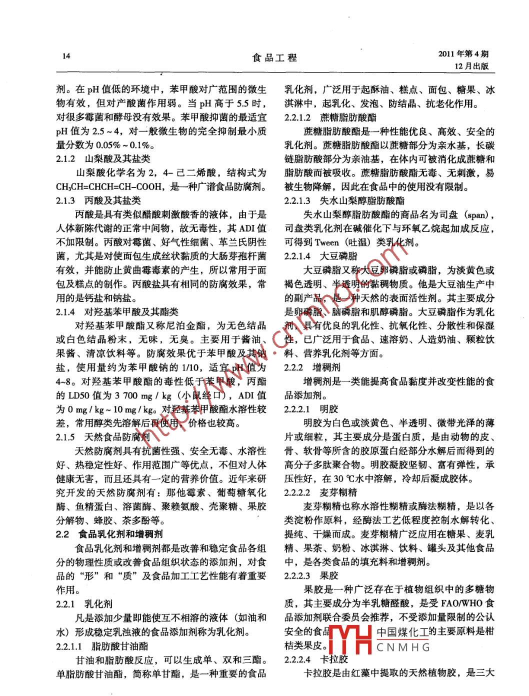 2011年第4期食品工程112月出版FOOD ENGINEERING淺談常用食品添加劑的性能特點(diǎn)及應(yīng)用On performance and applications of common food additives李海燕*喬建芬(山西輕工職業(yè)技術(shù)學(xué)院,太原030013)LI Hai-yan°QIAO Jian- -fen(Shanxi light industry vocational and technical college, Taiyuan 030013 ,China)摘要介紹了食品添加劑的定義、發(fā)展趨勢(shì);重點(diǎn)介紹了食品防腐劑、食品乳化劑、增稠劑、食品調(diào)味劑以及食用色素等的性能特點(diǎn)及應(yīng)用;強(qiáng)調(diào)食品添加劑的使用安全。關(guān)鍵詞食品添加劑; 防腐劑;著色劑;調(diào)味劑;安全性;標(biāo)準(zhǔn)Abstract The definition and development trend of food additives were introduced.Food preservatives , food emulsifers,food thickeners , food flavorings and food pigments were mainly introduced. The safe use of food additives was empha-sized.Keywords food additive; preservative; pigment; flavoring; safety; standard中圖分類號(hào):TS202.3文獻(xiàn)標(biāo)識(shí)碼:A文章編號(hào):1673- -6004(2011)04- 0014 -02食品添加劑是構(gòu)成現(xiàn)代食品工業(yè)的重要因素,化;對(duì)于改善食品的色、香、味,增加食品營養(yǎng),提高c)能夠使食品工業(yè)節(jié)約資源、降低成本,在食品品質(zhì),改善加工條件,防止食品變質(zhì),延長食極大地提升食品品質(zhì)和檔次的同時(shí),增加其附加品的保質(zhì)期有極其重要的作用。因此,食品添加劑值,產(chǎn)生明顯的經(jīng)濟(jì)效益和社會(huì)效益。工業(yè)在現(xiàn)代食品工業(yè)中占據(jù)重要地位。1.2.2食品添加劑發(fā)展趨勢(shì)a)開發(fā)天然、營養(yǎng)、多功能的食品添加劑;,1食品添加劑的定義及作用b)致力開發(fā)多樣化、專用的添加劑。1.1食品添加劑的定義2食 品添加劑的種類《中華人民共和國食品安全法》第九十九條中對(duì)食品添加劑下的定義:“食 品添加劑,指為改善食品添加劑按來源可分為天然食品添加劑和人食品品質(zhì)和色、香、味,以及為防腐和加工工藝的工合成食品添加劑。按功能進(jìn)行分類,主要有:營需要而加入食品中的人工合成或者天然物質(zhì)?!别B(yǎng)強(qiáng)化劑、防腐防霉劑、抗氧化保鮮劑、增稠劑、1.2 食品添加劑的作用和發(fā)展趨勢(shì)乳化劑、螯合劑(含穩(wěn)定劑和凝固劑)、品質(zhì)改良1.2.1食品添加劑的主要作用劑、調(diào)味劑、色澤處理劑、食用香精、香料等。a)能夠改善食品的品質(zhì),提高食品的質(zhì)量,2.1 食品防腐劑滿足人們對(duì)食品風(fēng)味、色澤、口感的要求;食品防腐劑是為了抑制食品腐敗和變質(zhì),延長b)能夠使食品加工制造工藝更合理、更衛(wèi)生、貯存期和保鮮期的一類添加劑_日前堂用的食品防更便捷,有利于食品工業(yè)的機(jī)械化、自動(dòng)化和規(guī)模腐劑主要有4歲中國煤化工梨酸及其鹽*李海燕,女,1966年出生, 1988年畢業(yè)于忻州師范學(xué)院化學(xué)類、丙酸及其鹽YH_ CNMH G教育專業(yè),實(shí)驗(yàn)師。2.1.1苯甲 酸及其鈉鹽收稿日期: 2011-10-29苯甲酸又稱安息香酸,是一種常用的有機(jī)殺菌14食品工程2011年第4期.12月出版劑。在pH值低的環(huán)境中,苯甲酸對(duì)廣范圍的微生乳化劑,廣泛用于起酥油、糕點(diǎn)、面包、糖果、冰物有效,但對(duì)產(chǎn)酸菌作用弱。當(dāng)pH高于5.5時(shí),淇淋中,起乳化、發(fā)泡、防結(jié)晶、抗老化作用。對(duì)很多霉菌和酵母沒有效果。苯甲酸抑菌的最適宜2.2.1.2蔗糖脂肪酸酯pH值為2.5~4,對(duì)一般微生物的完全抑制最小質(zhì)蔗糖脂肪酸酯是- -種性能優(yōu)良、高效、安全的量分?jǐn)?shù)為0.05% ~0.1%。乳化劑。蔗糖脂肪酸酯以蔗糖部分為親水基,長碳2.1.2山梨酸及其鹽類鏈脂肪酸部分為親油基,在體內(nèi)可被消化成蔗糖和山梨酸化學(xué)名為2,4-己二烯酸,結(jié)構(gòu)式為脂肪酸而被吸收。蔗糖脂肪酸酯無毒、無刺激,易CH2CH=CHCH=CH- CO0H,是-種廣 譜食品防腐劑。被生物降解, 因此在食品中的使用沒有限制。2.1.3丙酸及其鹽類2.2.1.3失水 山梨醇脂肪酸酯丙酸是具有類似醋酸剌激酸香的液體,由于是失水山梨醇脂肪酸酯的商品名為司盤(span) ,人體新陳代謝的正常中間物,故無毒性,其ADI值司盤類乳化劑在堿催化下與環(huán)氧乙烷起加成反應(yīng),不加限制。丙酸對(duì)霉菌、好氣性細(xì)菌、革蘭氏陰性可得到Tween (吐溫)類乳化劑。菌,尤其是對(duì)使面包生成絲狀黏質(zhì)的大腸芽孢桿菌2.2.1.4大豆磷脂有效,并能防止黃曲霉毒素的產(chǎn)生,所以常用于面大豆磷脂又稱大豆卵磷脂或磷脂,為淡黃色或包及糕點(diǎn)的制作。丙酸鹽具有相同的防腐效果,常褐色透明、半透明的黏稠物質(zhì)。他是大豆油生產(chǎn)中用的是鈣鹽和鈉鹽。的副產(chǎn)品,是- -種天然的表面活性劑。其主要成分2.1.4對(duì)羥基苯甲 酸及其酯類是卵磷脂、腦磷脂和肌醇磷脂。大豆磷脂作為乳化對(duì)羥基苯甲酸酯又稱尼泊金酯,為無色結(jié)晶劑,具有優(yōu)良的乳化性、抗氧化性、分散性和保濕或白色結(jié)晶粉末,無味,無臭。主要用于醬油、性, 已廣泛用于食品、速溶奶、人造奶油、顆粒飲果醬、清涼飲料等。防腐效果優(yōu)于苯甲酸及其鈉料、營養(yǎng)乳化劑等方面。鹽,使用量約為苯甲酸鈉的1/10,適宜pH值為2.2.2增稠劑4~8。對(duì)羥基苯甲酸酯的毒性低于苯甲酸,丙酯增稠劑是- ~類能提高食