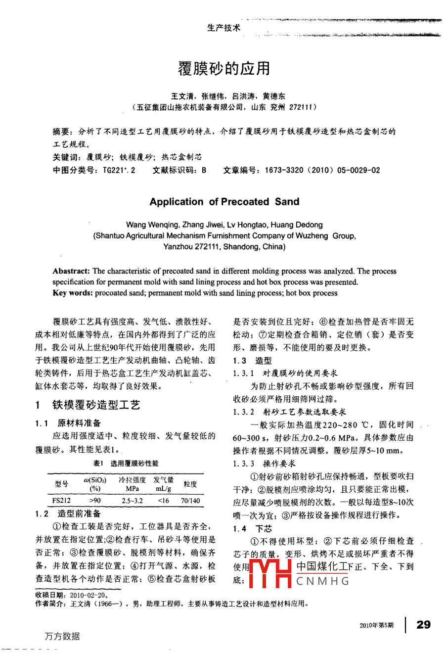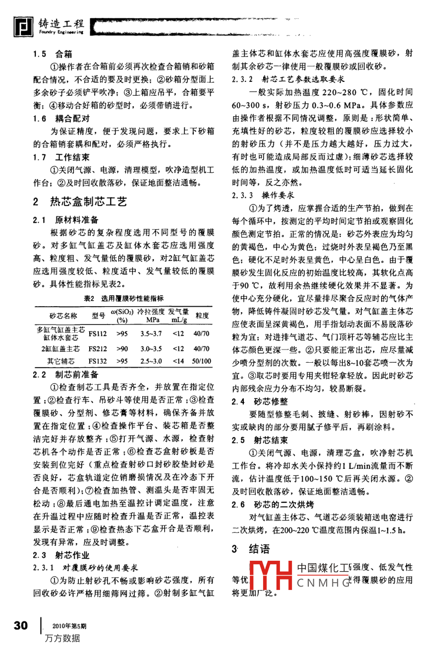 生產(chǎn)技術(shù)覆膜砂的應用王文清,張繼偉,呂洪濤,黃德東(五征集團山拖農(nóng)機裝備有限公司,山東兗州272111)摘要:分析了不同造型工芑用覆膜砂的特點,介紹了覆膜砂用于鐵模覆砂造型和熱芯盒制芯的工藝規(guī)程關(guān)鍵詞:覆膜砂;鐵模覆砂;熱芯盒制芯中圖分類號:TG221·2文獻標識碼:B文章編號:1673-3320(2010)05-0029-02Application of Precoated sandWang Wenqing, Zhang Jiwei, Lv Hongtao, Huang DedongShantuo Agricultural Mechanism Furnishment Company of Wuzheng Group,Yanzhou 272111, Shandong, China)Abastract: The characteristic of precoated sand in different molding process was analyzed. The processspecification for permanent mold with sand lining process and hot box process was presentedKey words: precoated sand; permanent mold with sand lining process; hot box process覆膜砂工藝具有強度髙、發(fā)氣低、潰散性好、是否安裝到位且完好;⑥檢查加熱管是否牢固無成本相對低廉等特點,在國內(nèi)外都得到了廣泛的應松動;⑦定期檢査合箱銷、定位銷(套)是否變用。我公司從上世紀90年代開始使用覆膜砂,先用形、磨損等,不能使用的要及時更換。于鐵模覆砂造型工藝生產(chǎn)發(fā)動機曲軸、凸輪軸、齒1.3造型輪類鑄件,后用于熱芯盒工藝生產(chǎn)發(fā)動機缸蓋芯、1.3.1對覆膜砂的使用要求缸體水套芯等,均取得了良好效果為防止射砂孔不暢或影響砂型強度,所有回1鐵模覆砂造型工藝收砂必須嚴格用細篩網(wǎng)過篩。1.3.2射砂工藝參數(shù)選取要求1.1原材料準備般實際加熱溫度220~280℃,固化時間應選用強度適中、粒度較細、發(fā)氣量較低的60-300s,射砂壓力02~0.6MPa.具體參數(shù)應由覆膜砂。其性能見表1。操作者根據(jù)不同情況調(diào)整。覆砂層厚5~10mm。表1選用覆膜砂性能1.3.3操作要求型號oS0)冷拉強度發(fā)氣量粒度①射砂前砂箱射砂孔應保持暢通,型板要吹掃干凈:②脫模劑應噴涂均勻,且只要能正常出模,FS212.5-3.2<1670/140應盡量減少噴脫模劑的次數(shù)。一般以每造型8~10次1.2造型前準備噴一次為宜;③嚴格按設備操作規(guī)程進行操作①檢查工裝是否完好,工位器具是否齊全,1.4下芯并放置在指定位置;②檢查行車、吊砂斗等使用是①不得使用壞型;②下芯前必須仔細檢査否正常;③檢査覆膜砂、脫模劑等材料,確保齊芯子的質(zhì)量,變形、烘烤不足或損壞嚴重者不得備,并放置在指定位置;④打開氣源、水源,檢使中國煤化工下正、下全、下到查造型機各個動作是否正常;⑤檢査芯盒射砂板底CNMHG看界:x96),男,理工程師,主要從事鑄透工藝設計和連程村料應用2010年第5期29回鑄造工程5合箱蓋主體芯和缸體水套芯應使用高強度覆膜砂,射①操作者在合箱前必須再次檢查合箱銷和砂箱制其余砂芯一律使用一般覆膜砂或回收砂。配合情況,不合適的要及時更換;②砂箱分型面上2.3.2射芯工藝參數(shù)選取要求多余砂子必須鏟平吹凈;③上箱應吊平,合箱要平般實際加熱溫度220~280℃,固化時間衡;④移動合好箱的砂型時,必須帶銷進行。60-300s,射砂壓力03~0.6MPa。具體參數(shù)應1.6耦合配對由操作者根據(jù)不同情況調(diào)整,原則是:形狀簡單、為保證精度,便于發(fā)現(xiàn)問題,要求上下砂箱充填性好的砂芯,粒度較粗的覆膜砂應選擇較小的合箱銷套耦和配對,必須嚴格執(zhí)行。的射砂壓力(并不是壓力越大越好,壓力過大,1.7工作結(jié)束有時也可能造成局部反而過虛);細薄砂芯選擇較①關(guān)閉氣源、電源,清理模型,吹凈造型機工低的加熱溫度,或加熱溫度低時可適當延長固化作臺;②及時回收散落砂,保證地面整潔通暢。時間等,反之亦然2熱芯盒制芯工藝2.3.3操作要求①為了烤透,應掌握合適的生產(chǎn)節(jié)拍,做到在2.1原材料準備每個循環(huán)中,按測定的平均時間定節(jié)拍或觀察固化根據(jù)砂芯的復雜程度選用不同型號的覆膜顏色測定節(jié)拍。正常的情況是:砂芯外表應為均勻砂。對多缸氣缸蓋芯及缸體水套芯應選用強度的黃褐色,中心為黃色:過燒時外表呈褐色乃至黑高、粒度粗、發(fā)氣量低的覆膜砂,對2缸氣缸蓋芯色;硬化不足時外表呈黃色,中心呈白色。由于覆應選用強度較低、粒度適中、發(fā)氣量較低的覆膜膜砂發(fā)生固化反應的初始溫度比較高,其軟化點高砂。具體性能指標見表2于90℃,故利用余熱繼續(xù)硬化效果并不顯著。為表2選用覆膜砂性能指標使中心充分硬化,宜盡量排盡聚合反應時的氣體產(chǎn)砂芯名稱型號(SioO)冷拉強度發(fā)氣量粒度物,降低鑄件凝固時砂芯發(fā)氣量。對氣缸蓋主體芯(% MPa mLg應使表面呈深黃褐色,用手指劃動表面不易脫落砂多缸氣缸蓋主芯rFs11∞9535-37<124070粒為宜;對進排氣道芯、氣門頂桿芯等輔芯應比主缸體水套芯2缸缸蓋主芯FS212>930-3.5<1240/70體芯顏色更深一些。②只要能正常出芯,應盡量減其它輔芯Fs132>9525-3041450100少噴分型劑的次數(shù)。一般以每出8-10套芯噴一次為制芯前準備宜。③取芯時要用專用夾鉗輕拿輕放。因此時砂芯①檢查制芯工具是否齊全,并放置在指定位內(nèi)部殘余應力分布不均勻,較易斷裂。置;②檢查行車、吊砂斗等使用是否正常:③檢查2.4砂芯修整覆膜砂、分型劑、修芯膏等材料,確保齊備并放要隨型修整毛刺、披縫、射砂棒,因射砂不置在指定位置;④檢查操作平臺、裝芯箱是否整實或缺肉的部分要用膩子修平后,再刷涂料。潔完好并存放整齊;⑤打開氣源、水源,