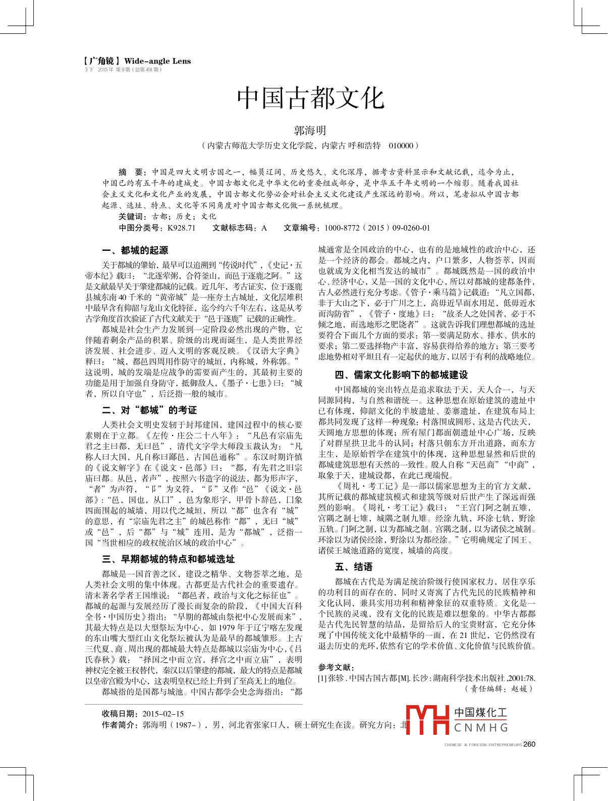 【廣角鏡】wide- angle lens中國古都文化郭海明內(nèi)蒙古師范大學(xué)歷史文化學(xué)院,內(nèi)蒙古呼和浩特0100000摘要:中囯是四大文明古國之一,幅員遼闊、歷史悠久、文化深厚,據(jù)考古資料顯示和文獻記載,迄今為止,中國已約有五千年的建城史。中國古都文化是中華文化的重要組成部分,是中華五千年文明的一個縮影。隨著我國社會主義文化和文化產(chǎn)業(yè)的發(fā)展,中國古都文化勢必會對社會主義文化建設(shè)產(chǎn)生深遠的影響。所以,筆者擬從中國古都起源、選址、特點、文化等不同角度對中國古都文化做一系統(tǒng)梳理。關(guān)鍵詞:古都;歷史;文化中圖分類號:K928.71文獻標志碼:A文章編號:10008772(2015)090260-0都城的起源城通常是全國政治的中心,也有的是地域性的政治中心,還關(guān)于都城的肇始,最早可以追溯到“傳說時代”,《史記,五是一個經(jīng)濟的都會都城之內(nèi),戶口繁多,人物薈率,因而是文獻最早關(guān)于肇建都城的記載。近幾年,考古證實,位于逐鹿心、經(jīng)濟中心,又是一國的文化中心,所以對都城的建都條件縣城東南40千米的“黃帝城”是一座夯土古城址,文化層堆積古人必然進行充分考慮?!豆茏印こ笋R篇》記載道:“凡立國都中最早含有仰韶與龍山文化特征,迄今約六千年左右,這是從考非于大山之下,必于廣川之上,高毋近旱而水用足,低毋近水古學(xué)角度首次驗證了古代文獻關(guān)于“邑于逐鹿”記載的正確性。而溝防省”,《管子·度地》曰:“故圣人之處國者,必于不都城是社會生產(chǎn)力發(fā)展到一定階段必然出現(xiàn)的產(chǎn)物傾之地,而選地形之肥饒者”。這就告訴我們理想都城的選址伴隨著剩余產(chǎn)品的積累、階級的出現(xiàn)而誕生,是人類世界經(jīng)要符合下面幾個方面的要求:第一要滿足防水、排水、供水的濟發(fā)展、社會進步、邁入文明的客觀反映?!稘h語大字典》要求;第二要選擇物產(chǎn)豐富,容易獲得給養(yǎng)的地方;第三要考釋曰:“城,都邑四周用作防守的城垣,內(nèi)稱城,外稱郭?!睉]地勢相對平坦且有一定起伏的地方,以居于有利的戰(zhàn)略地位。這說明,城的發(fā)端是應(yīng)戰(zhàn)爭的需要而產(chǎn)生的,其最初主要的四、儒家文化影響下的都城建設(shè)功能是用于加強自身防守,抵御敵人,《墨子·七患》曰:“城者,所以自守也”,后泛指一般的城市中國都城的突出特點是追求取法于天,天人合一,與天同源同構(gòu),與自然和諧統(tǒng)一。這種思想在原始建筑的遺址中二、對“都城”的考證已有體現(xiàn),仰韶文化的半坡遺址、姜寨遺址,在建筑布局上人類社會文明史發(fā)軔于封邦建國,建國過程中的核心要都共同發(fā)現(xiàn)了這樣一種現(xiàn)象:村落圍成圓形,這是古代法天素則在于立都?!蹲髠鳌でf公二十八年》:“凡邑有宗廟先天圓地方思想的體現(xiàn);所有屋門都面朝遺址中心廣場,反映君之主曰都,無曰邑”,清代文字學(xué)大師段玉裁認為:“凡了對群星拱衛(wèi)北斗的認同;村落只朝東方開出道路,而東方稱人曰大國,凡自稱曰鄙邑,古國邑通稱”。東漢時期許慎主生,是原始哲學(xué)在建筑中的體現(xiàn),這種思想顯然和后世的的《說文解字》在《說文·邑部》曰:“都,有先君之舊宗都城建筑思想有天然的一致性。殷人自稱“天邑商”“中商廟曰都。從邑,者聲”,按照六書造字的說法,都為形聲字取象于天,建城設(shè)都,在此已現(xiàn)端倪者”為聲符,“阝”為義符,“阝”又作“邑”《說文·邑《周禮·考工記》是一部以儒家思想為主的官方文獻部》:“邑,國也,從口”,邑為象形字,甲骨卜辭邑,口象其所記載的都城建筑模式和建筑等級對后世產(chǎn)生了深遠而強四面圍起的城墻,用以代之城垣,所以“都”也含有“城烈的影響?!吨芏Y·考工記》載曰:“王宮門阿之制五雉,作“都”,無曰“城”宮隅之制七雉,城隅之制九雉。經(jīng)涂九軌,環(huán)涂七軌,野涂或“邑”,后“都”與“城”連用,是為“都城”,泛指一五軌。門阿之制,以為都城之制。宮隅之制,以為諸侯之城制。國“當(dāng)世相應(yīng)的政權(quán)統(tǒng)治區(qū)域的政治中心”。環(huán)涂以為諸侯經(jīng)涂,野涂以為都經(jīng)涂?!彼鞔_規(guī)定了國王者侯王城池道路的寬度,城墻的高度、早期都城的特點和都城選址五、結(jié)語都城是一國首善之區(qū),建設(shè)之精華、文物薈萃之地,是人類社會文明的集中體現(xiàn)。古都更是古代社會的重要遺存都城在古代是為滿足統(tǒng)治階級行使國家權(quán)力,居住享樂清末著名學(xué)者王國維說:“都邑者,政治與文化之標征也”。的功利目的而存在的,同時又寄寓了古代先民的民族精神和都城的起源與發(fā)展經(jīng)歷了漫長而復(fù)雜的階段,《中國大百科文化認同,兼具實用功利和精神象征的雙重特質(zhì)。文化是全書·中國歷史》指出:“早期的都城由祭祀中心發(fā)展而來”,個民族的靈魂,沒有文化的民族是難以想象的。中華古都都其最大特點是以大型祭壇為中心,如1979年于遼寧喀左發(fā)現(xiàn)是古代先民智慧的結(jié)晶,是留給后人的寶貴財富,它充分體的東山嘴大型紅山文化祭壇被認為是最早的都城雛形。上古現(xiàn)了中國傳統(tǒng)文化中最精華的一面,在21世紀,它仍然沒有代夏、商、周出現(xiàn)的都城最大特點是都城