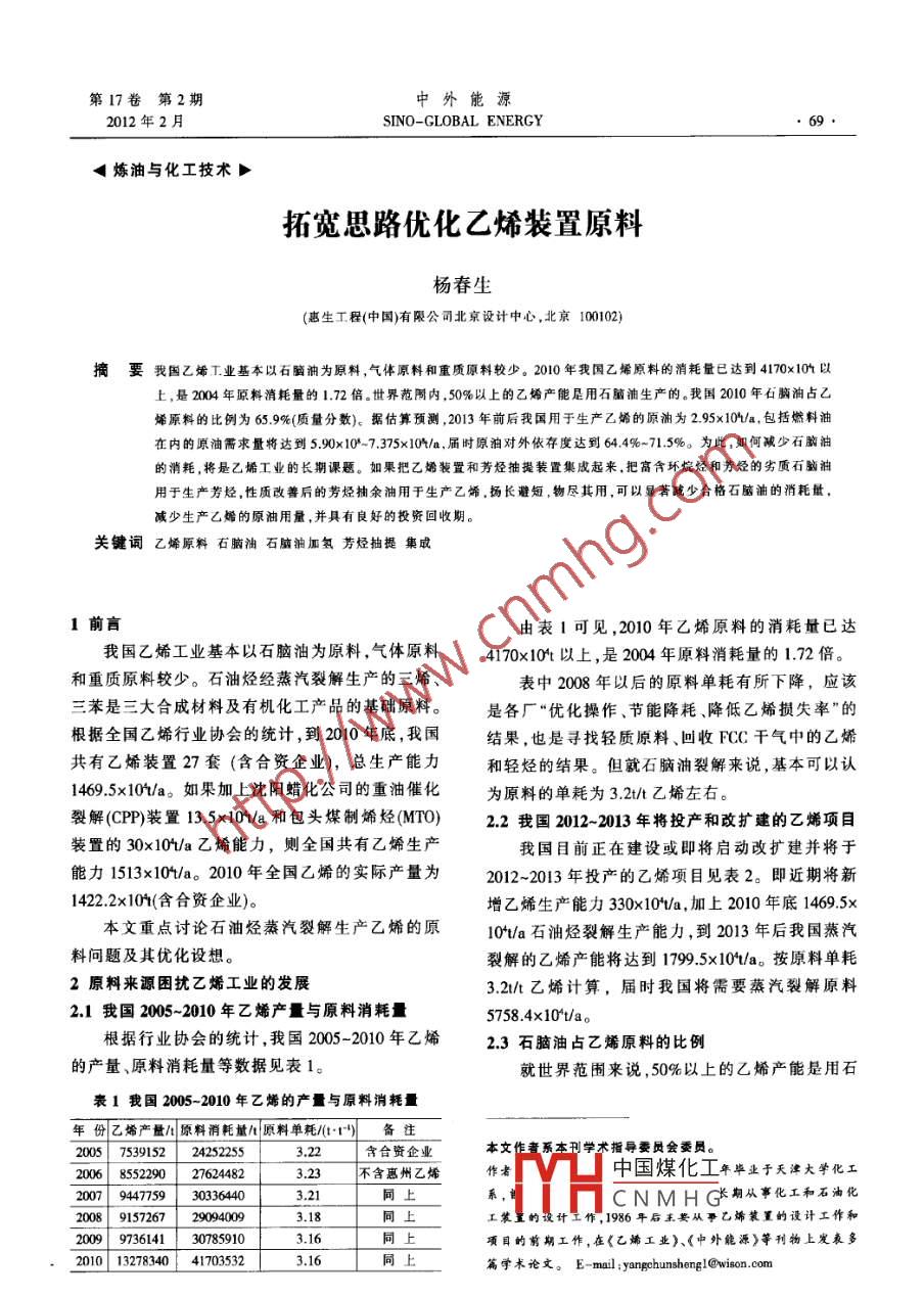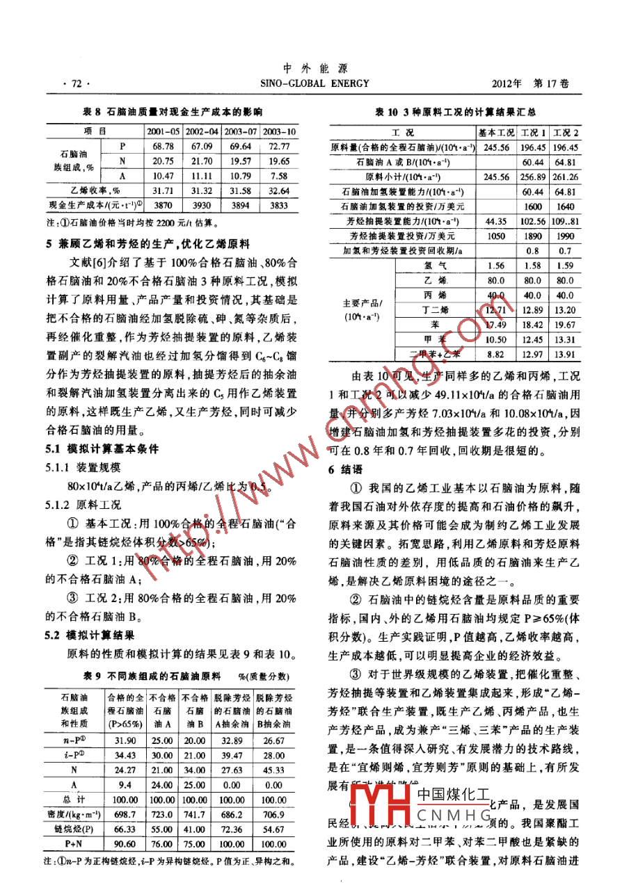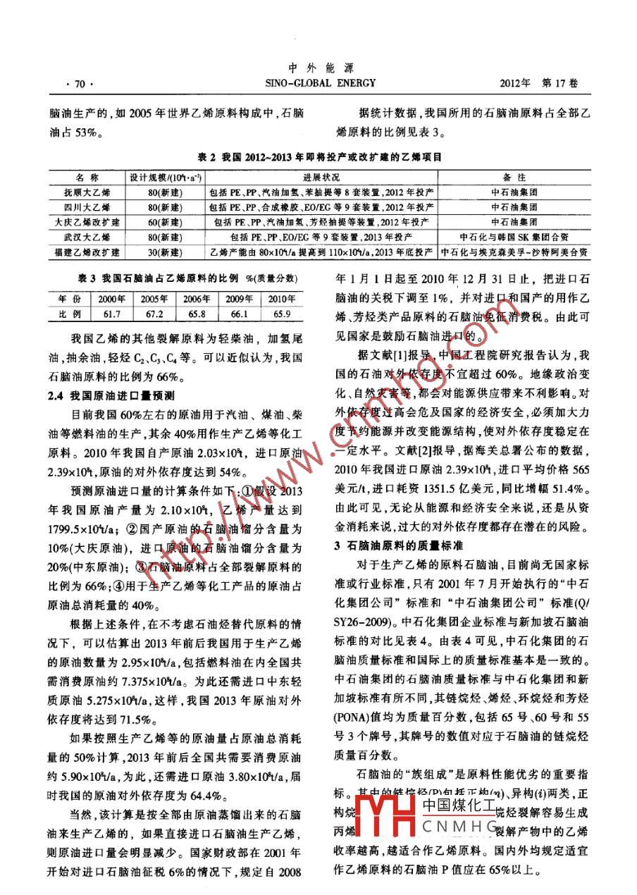 第17卷第2期中外能源2012年2月SINO-GLOBAL ENERGY《煉油與化工技術(shù)拓寬思路優(yōu)化乙烯裝置原料楊春生(惠生工程(中國)有限公司北京設(shè)計中心,北京100102)摘要我國乙烯工業(yè)基本以石腦油為原料,氣體原料和重質(zhì)原料較少。2010年我國乙烯原料的消耗量已達(dá)到4170x10以上,是2004年原料消耗量的1.72倍。世界范陽內(nèi),50%以上的乙烯產(chǎn)能是用石腦油生產(chǎn)的。我國2010年石胸油占乙.烯原料的比例為65.9%(質(zhì)量分?jǐn)?shù))。據(jù)估算預(yù)測,2013年前后我國用于生產(chǎn)乙烯的原油為2.95x10V/a,包括燃料油在內(nèi)的原油需求量將達(dá)到5.90x10*-7.375x10+/a,屆時原油對外依存度達(dá)到64.4%-71.5%。為此,如何減少石腦油的消耗,將是乙烯工業(yè)的長期課題。如果把乙烯裝置和芳烴抽提裝置集成起來.把高含環(huán)烷烴和芳烴的劣質(zhì)石腦油用于生產(chǎn)芳烴,性質(zhì)改善后的芳烴抽余油用于生產(chǎn)乙婚,揚(yáng)長避短,物盡其用,可以顯著踱少合格石腦油的消耗量.減少生產(chǎn)乙烯的原油用量,并具有良好的投資回收期。關(guān)鍵詞乙烯原料 石腦油石腦油加氫芳烴抽提集成1前盲由表1可見,2010年乙烯原料的消耗量已達(dá)我國乙烯工業(yè)基本以石腦油為原料,氣體原料4170x10t以上,是2004年原料消耗量的1.72 倍。和重質(zhì)原料較少。石油烴經(jīng)蒸汽裂解生產(chǎn)的三烯、表中2008年以后的原料單耗有所下降,應(yīng)該三苯是三大合成材料及有機(jī)化工產(chǎn)品的基礎(chǔ)原料。是各廠“優(yōu)化操作、節(jié)能降耗降低乙烯損失率”的根據(jù)全國乙烯行業(yè)協(xié)會的統(tǒng)計,到2010年底,我國結(jié)果,也是尋找輕質(zhì)原料、回收FCC干氣中的乙烯共有乙烯裝置27套(含合資企業(yè)),總生產(chǎn)能力和輕烴的結(jié)果。但就石腦油裂解來說,基本可以認(rèn)1469.5x101/a。如果加上沈陽蠟化公司的重油催化為原料的單耗為3.2t/t 乙烯左右。裂解(CPP)裝置13.5x104/a和包頭煤制烯烴(MTO)2.2我國2012~2013年將投產(chǎn)和改擴(kuò)建的乙烯項(xiàng)目裝置的30x104/a 乙烯能力,則全國共有乙烯生產(chǎn)我國目前正在建設(shè)或即將啟動改擴(kuò)建并將于能力1513x10*/a。 2010 年全國乙烯的實(shí)際產(chǎn)量為2012~2013年投產(chǎn)的乙烯項(xiàng)目見表2。即近期將新1422.2x10*(含合資企業(yè))。增乙烯生產(chǎn)能力330x10*/a,加上2010年底1469.5x本文重點(diǎn)討論石油烴蒸汽裂解生產(chǎn)乙烯的原10t/a石油烴裂解生產(chǎn)能力,到2013年后我國蒸汽料問題及其優(yōu)化設(shè)想。裂解的乙烯產(chǎn)能將達(dá)到1799.5x10*/a。按原料單耗2原料來源困擾乙烯工業(yè)的發(fā)展3.21/t 乙烯計算,屆時我國將需要蒸汽裂解原料2.1我國2005~2010年乙烯產(chǎn)量與原料消耗量5758.4x10t/a。根據(jù)行業(yè)協(xié)會的統(tǒng)計,我國2005-2010年乙烯2.3石腦油占乙烯原料的比例的產(chǎn)量、原料消耗量等數(shù)據(jù)見表1。就世界范圍來說,50%以上的乙烯產(chǎn)能是用石表1我國2005- 2010年乙烯的產(chǎn)量與原料消耗量年份乙烯產(chǎn)量/原料消耗量/原料單耗/(:+)備注2005 7539152 242522553.22含合資企業(yè)本文作者系本刊學(xué)術(shù)指導(dǎo)委員會委員。2006 8522902 276244823.23不含惠州乙烯作者中國煤化工年畢業(yè)于天津大學(xué)化工2007 9447759 303364403.21同上MHCNMH C*期從事化工和石油化2008 9157267 29094093.18工裝置的設(shè)計工作,1986年后主要從事乙烯裝置的設(shè)計工作和2009 9736141 307859103.16項(xiàng)目的前期工作,在《乙烯工業(yè))、《中外能源》等刊物上發(fā)表多2010 13278340 41703532篇學(xué)術(shù)論文。E-mail :yangchunshengl@wison.com中外能源SINO-GLOBAL ENERGY2012年第17卷腦油生產(chǎn)的,如2005年世界乙烯原料構(gòu)成中,石腦據(jù)統(tǒng)計數(shù)據(jù),我國所用的石腦油原料占全部乙.油占53%。烯原料的比例見表3。表2我國2012~2013年即將投產(chǎn)或改擴(kuò)建的乙烯項(xiàng)目名設(shè)計規(guī)模(109進(jìn)展?fàn)顩r備注撫順大乙烯80(新建)包括PE、PP、汽油加氫、苯抽提等8套裝置,2012年投產(chǎn)中石油集團(tuán)四川大乙烯包括PE、PP、合成橡膠、EO/EC 等9套裝置,2012年投產(chǎn)大慶乙烯改擴(kuò)建60(新建)包括PE.PP、汽油加氫、芳烴抽提等裝置,2012年投產(chǎn)武漢大乙烯包括PE、PP、EO/EG等9套裝置,2013年投產(chǎn)中石化與韓國SK集團(tuán)合資福建乙烯改擴(kuò)建30(新建)乙烯產(chǎn)能由80x10t/a提高到110x10v/a,2013年底投產(chǎn)中石 化與??松梨?沙特阿美合資表3我國石腦油占乙烯原料的比例%(質(zhì)量分?jǐn)?shù))年1月1日起至2010年12月31日止,把進(jìn)口石年份2000年2005年 2006年 2009年 2010年腦油的關(guān)稅下調(diào)至1%,并對進(jìn)口和國產(chǎn)的用作乙比例61.765.866.165.烯、芳烴類產(chǎn)品原料的石腦油免征消費(fèi)稅。由此可我國乙烯的其他裂解原料為輕柴油,加氫尾見國家是鼓勵石腦油進(jìn)口的。油,抽余油,輕烴C2、C.C4等??梢越普J(rèn)為,我國據(jù)文獻(xiàn)[1]報導(dǎo),中國工程院研究報告認(rèn)為,我石腦油原料的比例為66%。國的石油對外依存度不宜超過60%。地緣政治變2.4我國原油進(jìn)口k預(yù)測化、自然災(zāi)害等,都會對能源供應(yīng)帶來不利影響。對目前我國60%左右的原油用于汽油、煤油、柴外依存度過高會危及國家的經(jīng)濟(jì)