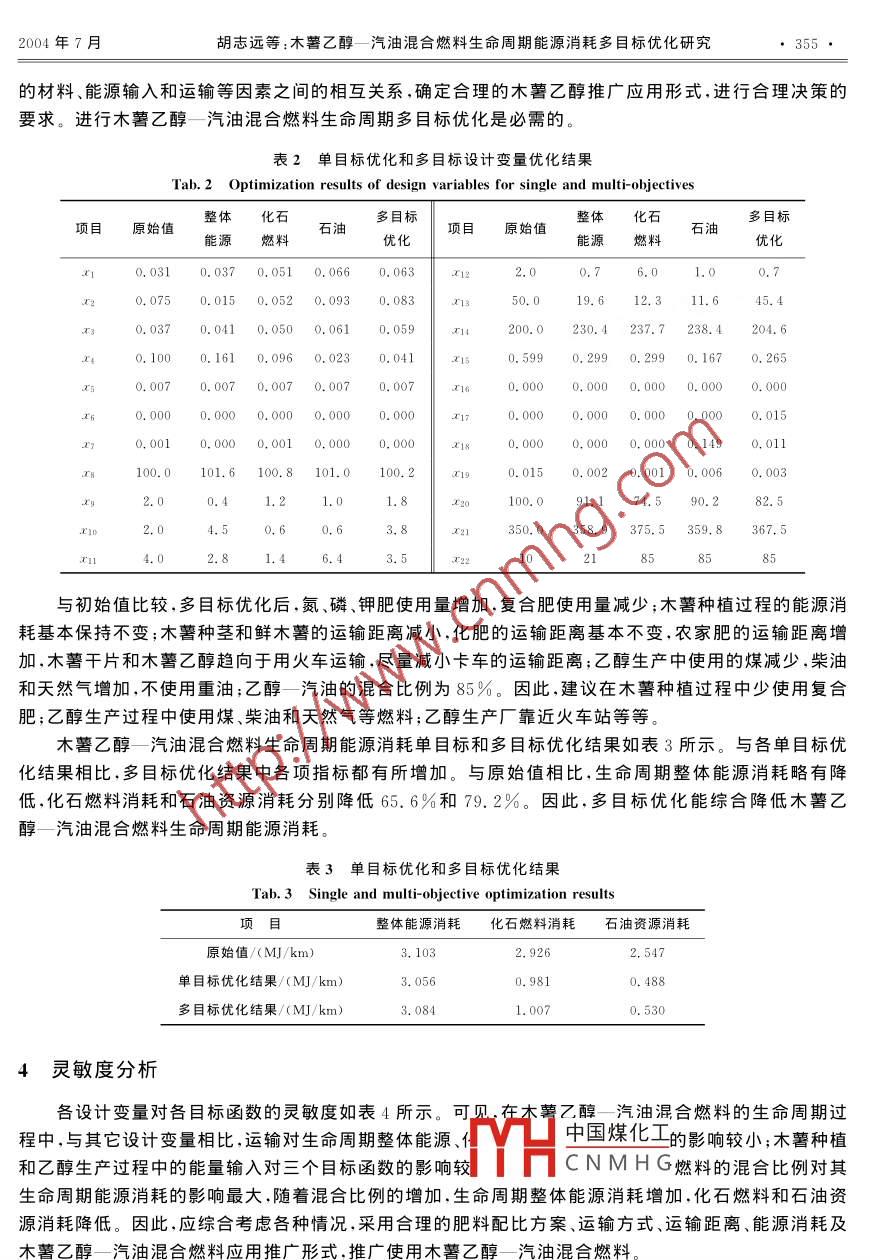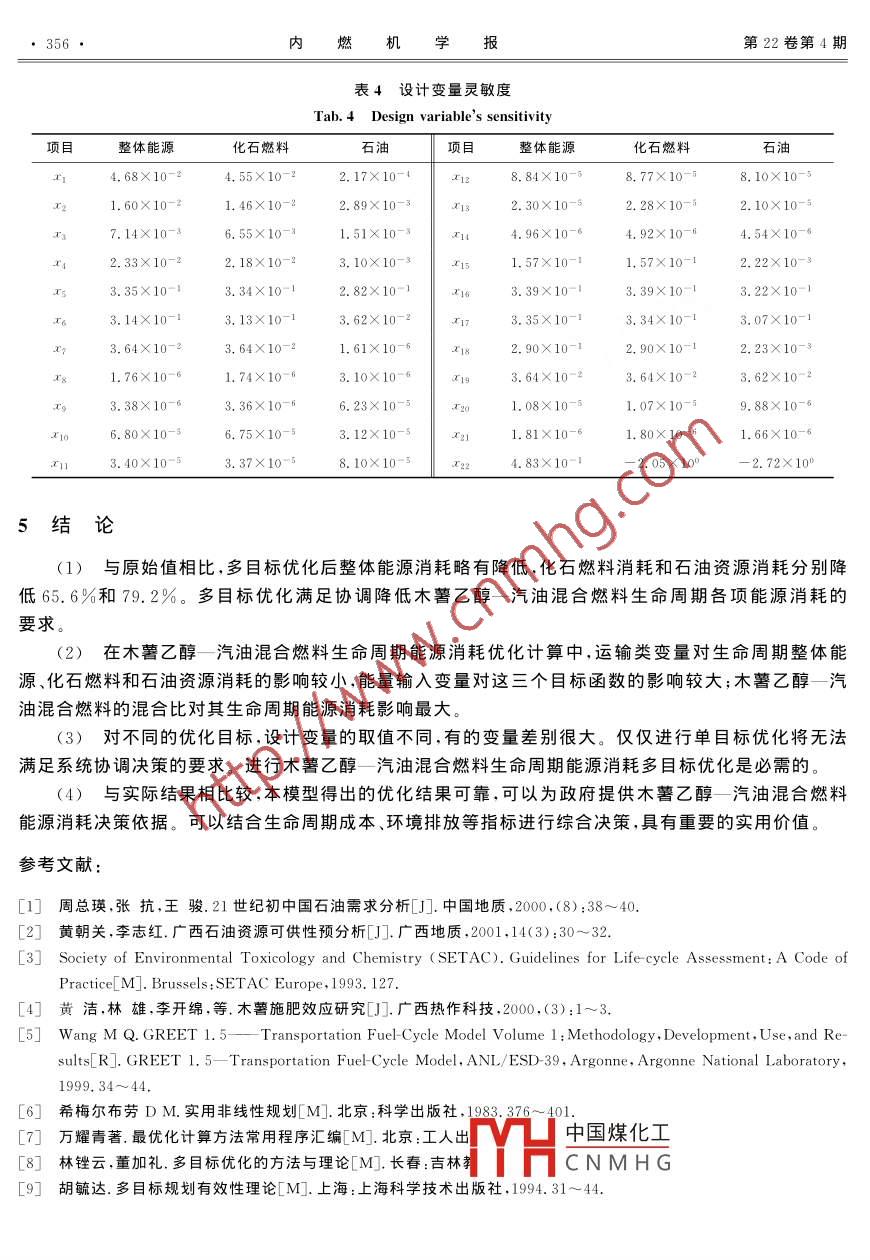第22卷(2004)第4期內(nèi)燃機(jī)學(xué)報(bào)Vol.22(2004)No.4Transactions of cSICe文章編號(hào):1000-0909(2004)04-0351-0622-054木薯乙醇一汽油混合燃料生命周期能源消耗多目標(biāo)優(yōu)化研究¨胡志遠(yuǎn),浦耿強(qiáng),王成燾(上海交通大學(xué)機(jī)械與動(dòng)力工程學(xué)院,上海200030)摘要:建立了木薯乙醇—汽油混合燃料生命周期能源消耗單目標(biāo)和多目標(biāo)優(yōu)化模型。以生命周期總體能源消耗、化石燃料消耗和石油消耗為優(yōu)化目標(biāo),對(duì)木薯乙醇—汽油混合燃料生命周期能源消耗進(jìn)行了單目標(biāo)及多目標(biāo)優(yōu)化,并進(jìn)行了靈敏度分析。結(jié)果表明:多目標(biāo)優(yōu)化能使木薯乙醇一汽油混合燃料的命周期總體能源、化石燃料和石油消耗同時(shí)降低,可以為木著乙醇—汽油混合燃料旳應(yīng)用提供決策依據(jù),具有重要的應(yīng)用價(jià)值關(guān)鍵詞:發(fā)動(dòng)期能源;多目標(biāo)優(yōu)化;木薯乙醇;汽油;混合燃料中圖分類號(hào):TK411.71文獻(xiàn)標(biāo)識(shí)碼:AMulti-Objectives Optimization on Life Cycle Energy Consumptionof Cassava Based ethanol blended gasoline fuelsHU Zhi-yuan, PU Geng-qiang WANG Cheng-ta(School of Mechanical and Power Engineering Shanghai Jiao Tong University, Shanghai 200030, ChinaAbstract: An optimization model on life cycle energy consumption of cassava-based ethanol blended gaso-ine fuels, including single and multi-objectives, was given in this paper. The single and multi-objectivesoptimization of cassava-based ethanol blended gasoline fuels were conducted and the life cycle total ener-gy, the fossil fuels, and the petroleum consumption were used as the objectives. The optimized resultshowed that the multi-objective optimization could reduce the life cycle total energy, the fossil fuels andthe petroleum consumption together. Therefore, the calculation could supply the important references fodecision-making on implementing cassava-based ethanol blended gasoline fuels. It would have great prac-Keywords: Engine; Life cycle energy; Multi-objectives optimization; Cassava-based ethanol; GasolineBlended fuels引言統(tǒng)計(jì)資料顯示,近10年來中國原油消費(fèi)量以年均5.77%的速度增加,而同期國內(nèi)原油供應(yīng)增長(zhǎng)速度僅為1.67%,國內(nèi)石油產(chǎn)量已難以滿足消費(fèi)量需要。預(yù)計(jì)到2020年,我國的原油需求量將達(dá)到3.66億噸,供求缺口為1.8億噸,石油自給率僅為60中國煤化有量為1800萬輛,隨著我國經(jīng)濟(jì)的發(fā)展汽車保有量將繼續(xù)增加。國務(wù)院發(fā)CNMH所有關(guān)負(fù)責(zé)人預(yù)測(cè),10年后中國汽車保有量將達(dá)到1億輛。因此,由汽車導(dǎo)致的晶里增加行個(gè)谷忽視。收稿日期:2003-1008;修訂日期:200401-10然科學(xué)基金資助項(xiàng)目(50175070)作者(1970-),男,博土研究生,主要研究方向?yàn)榫G色設(shè)計(jì)及生命周期評(píng)價(jià)352內(nèi)燃機(jī)學(xué)報(bào)第22卷第4期我國于2001年頒布了《變性燃料乙醇》和《車用乙醇汽油》兩個(gè)國家標(biāo)準(zhǔn),實(shí)行在汽油中添加10%無水乙醇的政策,并在河南、吉林、黑龍江、安徽等省開展使用車用乙醇汽油試點(diǎn)。預(yù)測(cè)在2005~2020年,廣西石油供需缺口約191~303萬噸,急需替代資源。結(jié)合我國的燃料乙醇政策和西部大開發(fā)戰(zhàn)略,廣西壯族自治區(qū)政府正進(jìn)行利用當(dāng)?shù)啬臼碣Y源生產(chǎn)燃料乙醇旳可行性研究。生命周期指產(chǎn)品從“搖籃”到“墳?zāi)埂钡恼麄€(gè)過程,包括原材料提取與加工;產(chǎn)品制造、運(yùn)輸以及銷售;產(chǎn)品的使用、再利用和維護(hù);廢物循環(huán)和最終廢物棄置等。從生命周期角度出發(fā),對(duì)木瞽乙醇一汽油混合燃料進(jìn)行能源消耗單目標(biāo)及多目標(biāo)優(yōu)化,優(yōu)化系統(tǒng)中各因素之間的相互關(guān)系,確定合理的木著燃料乙醇推廣形式,在降低系統(tǒng)整體能源消耗旳同時(shí),降低化石燃料消耗,尤其是降低對(duì)石油資源的消耗。本文從生命周期角度出發(fā),利用多目標(biāo)優(yōu)化方法,在各個(gè)單目標(biāo)優(yōu)化計(jì)算結(jié)果的基礎(chǔ)上,對(duì)木薯乙醇汽油混合燃料進(jìn)行能源多目標(biāo)優(yōu)化計(jì)算,并進(jìn)行靈敏度分析,為木薯乙醇的推廣應(yīng)用提供決策依據(jù)數(shù)學(xué)模型木薯乙醇燃料的生命周期是從“木材料I木薯種植薯種植”到“乙醇燃燒/車輛使用”的系統(tǒng)干片加工過程。在“木薯種植”和“木薯乙醇生產(chǎn)材料l過程中,輸入材料和能源,把木薯生長(zhǎng)過運(yùn)輸Ⅱ)(運(yùn)輸Ⅲ材料I程中吸收的太陽能轉(zhuǎn)化成木薯乙醇的化木薯乙醇生產(chǎn)能源學(xué)能。在“燃燒/車輛使用”過程,木薯乙(能源醇在發(fā)動(dòng)機(jī)氣缸中通過燃燒把化學(xué)能轉(zhuǎn)能源ll運(yùn)輸運(yùn)輸Ⅱ)(運(yùn)輸Ⅲ換為工質(zhì)的熱能,再通過工質(zhì)的膨脹轉(zhuǎn)換為驅(qū)動(dòng)汽車行駛的機(jī)械能。三個(gè)過程(源匚燃燒車輛使用通過“運(yùn)輸”聯(lián)系到一起。如圖1所示。1.1設(shè)計(jì)變量圖1生命周期框架以一輛百公里油耗為(混合Fig 1 Life cycle framework工況)的汽油車或玏能相當(dāng)旳乙醇—汽油混合燃料汽車行駛20萬公里為硏究對(duì)象,選擇“木薯種植”和木薯乙醇生產(chǎn)”過程中的材料和能源輸入、“燃燒/車輛使用”