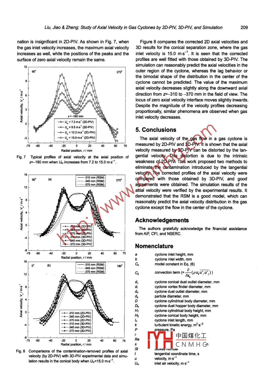 CHINA PARTICUOLOGY Vol 4. Nos 3-4. 204-210.2006STUDY OF AXIAL VELOCITY IN GAS CYCLONES BY 2D-PIV3D-PIV AND SIMULATIONZhengliang Liu, Jinyu Jiao and Ying ZhengDepartment of Chemical Engineering, University of New Brunswick15 Dineen Drive, P.O. Box 4400. Fredericton, NB. Canada E38 5A3. CanadaAuthor to whom correspondence should be addressed. Tel: 001-506-473329, E-mail: yzheng@unb.caAbstract The axial velocity distribution in a gas cyclone has been examined with two-dimensional particle imagevelocimetry(2D-PIV) and three-dimensional particle image velocimetry(3D-PIv) experiments in this study. due to theregistered in the axial velocity detected by 2D-PIV Efficient methods are proposed in this work to remove this contami-nation. The contamination-removed 2D-PIV data agree well with 3D-PIV results. The distributions of the axial velocity arealso computed by the Reynolds stress model(RSM)and verified using the PIv experimental results. Reasonableagreements are obtainedKeywords particle image velocimetry(PIV), numerical simulationelocity, cyclone separatorsIntroductionthis work, the axial velocity in a gas cyclone is studiedboth experimentally and numerically. Both two-dimensionalGas cyclones have been widely used as(2D)and three dimensional(3D )PIVs are used to measureseparators in the petrochemical and process itthe axial velocities. The contamination induced by thesince a centurury ago. The fiow pattems in gas cyclotangential velocity in the 2D-PIV measurements is re-of importance to their performance, and extensive research moved by mathematical methods. The contamina-has been caried out by experimental approaches and tion-removed results are compared with the experimentnumerical simulations. The experimental techniques for data obtained by 3D-PIV. The simulation results are veriobserving flow fields have been advanced from Pitot tubes fied using the experimental dataand hot-wire anemometers( HWA)to non-intrusive tech-niques such as laser Doppler anemometry(LDA)(Solero 2. Experimental Setup and MeasurementCoghe, 2002; Peng et al., 2002; Obermair et al. 2003; Huet al., 2005). However, all these aforementioned tech-Methodsniques have the common limitation that they make one- A schematic diagram of the experimental apparatus ispoint measurement for one test On the other hand, particle depicted in Fig. 1, where the cyclone was made of pleximage velocimetry(PIv) which can detect the whole-field glass. The detailed structure and dimensions(units in mmvelocity at the same time has been extensively used in of the cyclone are respectively shown in Fig. 2 and listed inrecent years( Stanislas et al., 2003; Liu et aL., 2005a).Table 1. Air stream was introduced to the cyclone tangenSince the flow field in an industrial cyclone was first tially through a scroll type inlet by a regenerative blowersimulated by Boysan et al. in 1982, numerical simulations (Gast R6150J-2)with a capacity of 365 m h-1.The inlethave attracted significant attention(HanjaliC, 1994; Meier& airflow rate being measured by a digital Pitot tube( KimoMori, 1999; Ma et al., 2000). In the field of modeling a con- AMI KS300)was controlled by a throttle valve and a byfined swirling flow, an important issue is how to accurately pass valve. the inlet air velocity ranged from 7.2 todescribe the turbulence behavior of the flow a number of 15.0.s", The pressure drop through the cyclone wasturbulence models are available, such as the standard k-e determined by a u-tube manometer. Detailed operatingmodel,the RNG. K-E model, and the Reynolds stress conditions are listed in Table 2. Tiny sugar particles(den-model(RSM)(Zhou, 1993). Hoekstra et al. (1999)evalu- sity: 1.58x10 kg m, refractive index: 1.54)of about 0.8ated the performance of these three turbulent closure microns in diameter were used as tracer particles, and theymodels with experimental results and reported that the were generated in a six-jet atomizer(TSI 9306A)by atom-RSM yields better prediction of the mean flow field in gascyclones. The RSM model involves the calculation of indi-izing a 5 wt% sugar solution. Experimental measurementsvidual Reynolds stresses using differential transport equa- tionswere performed across both0°-180°and90-270°sec中國煤化工 paration zonesnolds-averaged momentum equations. It has also been trace-nents First of all, theCN MHGy follow the centrifugaldocumented(Hu et al., 2005)that the results predicted by airflow. to determine the ability of tracer particles followingthe RSM model were in reasonable agreement with ex- the fluid and the speed at which the seed particles respondperimental dataLiu, Jiao& Zheng: Study of Axial Velocity in Gas Cyclones by 2D-P/V, 3D-P/, and Simulation1 Air filter, 2 Regenerative blower, 3 Bypass valve, 4 Throttle valve, 5 Atomizer, 6 Pitot tube, 7U-tube manometer, 8 Cyclone,9 Lightsheet optics, 10 Dual YAG laser, 11 Laser controller, 12 CCD cameras, 13 Synchronizer, 14 Computer systemFig. 1 Schematic diagram of the experimental apparatus and Piv systemto theusually introduced. It is defined asSttp/tgwhere tp is the characteristic time of tracer particles or180 velocity response time, and tg is the characteristic time ofthe vortex field4=2p+q2)d42136pd218(orp