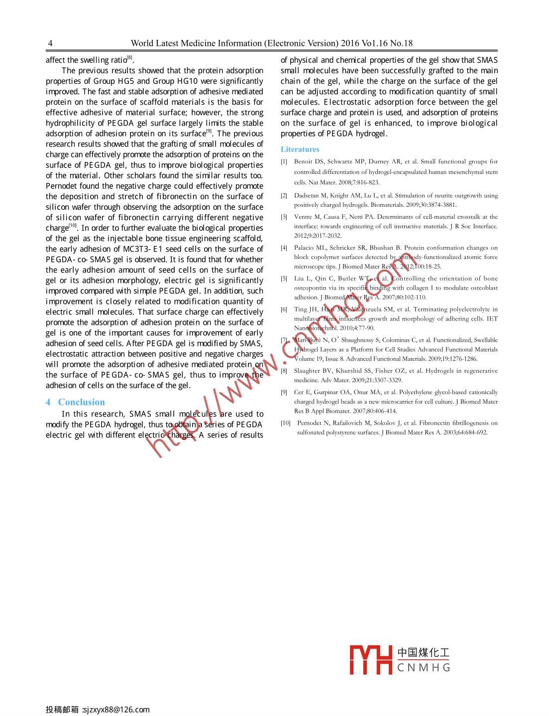 世界最新醫(yī)學(xué)信息文摘2016年第16卷第18期●論著●Fabrication of Negative Charged Poly (Ethylene glycol)-diacrylate Hydrogel as a Bone Tissue Engineering scaffoldWANG Ya qi, LIU Jie^, TAN Fei^ ,XIE Wei(Department of Prosthcdontics, The afliated hospital of Qingdao university,Qingdao University,Qingda,Shandong)ABSTRACT : Objective To improve the cell atachment of PEGDA hydrogel, the SMAS small molcule was used to modify the PEGDAhydrogel. The charged hydrogel would show improved cell attachment and enhanced protein adsorption caused by enhancement of electrostaticadsorption. Method In this study, a series of charged hydrogels were produced by adding different concentrations of charged small moleculemonomer into the PEGDA solution. Then, we investigate the physicochemical and biological characteristics of charged hydrogels, includingFTIR, swelling ratio, contact angle, cell attachment. Result The results indicate that the charged monomer had been successfully incorporatedinto PEGDA hydrogel. Meanwhile, the protein adsorption of the hydrogel increased with increasing concentration of charge modification.Moreover, compared to PEGDA hydrogel, the cell atachment signifcantly improved on the charged hydrogel. Conclusion The chargedhydrogel would be a promising scaffold candidate for bone tsse engineering.KEY WORDS : Tissuse engineering; Charged hydrogel; ChargeChinese Library Classification (CLC) : R318Document Code: ADOI: 10.96/j.ssn.1671-3141.2015.18.0020 Introductionbank), HEPES (Beijjing Solarbio Life Science & TechnologyIn recent years, the bone tissue engi neeri ng has beenCo., Ltd), PE GDA (synthesized by Laboratory of Chemicalrapidly developed as the new technology of bone defectEngineering of Wuhan University), D2959photoinitiator (Italyrepairing. In the tissue engineering, the interaction betweenSigma- Aldrich Company), Sodium MethylallyI Sulfonatecells and scaffold material is one of core issues. The ideal(SMAS) (Shanghai Aladdin Reagent Company), Sodium DodecyIscaffold materials for bone tissue engineering should provideSulfonate (SDS) (Shenzhen Y aneng Biological Technology Co.corresponding space for growth of repair tissue, and promoteLtd.), BCA Kit (Nanjing Jiancheng Bioengineering Institute),adhesion of seed cells, thus to speed up the healing andmulti- function micro- plate reader (T ecan Safire' Switzerlandreconstruction of bone tissue'".With the rise of concept of minimal invasive, injectableTecan Company), ultra- violet lamp (48w365nm Jiangsuhydrogel bone tissue engineering scaffold is more and moreK unshan Dongfei Chuangxin E lectronic T echnology Co.,concerned. Poly (ethylene glycol)- diacrylate (PE GDA) is a kindLtd.), attenuated total reflection infrared spectroscopy FTIRof good artificially synthesized scaffold; however, the strong(NICOLET380FT- IR America Nicolet Company), and contacthydrophilicity of material itself makes it difficult to adsorbinstrument (C601 Kino Industry Co, Ltd.)adhesive mediated proteins in the extracellular matrix, thus1.2 Test Methodto block the adhesion of seed cells, and limit its application.1.2.1 Preparation of Electric PEGDA GelSchol, ars home and abroad usually improve the performanceUse 20mM of HEPES buffer solution to prepare PE GDAof materials by the method of using adhesive polypeptide ofgel precursor solution of 25% of mass concentration, 0.8%graft function on gel surface; however, at present, the quantityD2959 photo crosslinker solution and 2mM of SMAS solutionand category of adhesive polypeptide of PE GDA surface graft,respectively, sealed for standby.which did not change the fact that it is difficult for gel toAdd different amount of SMAS respectively into 25wtadsorb proteins'. In view of charging characteristics of natural% of PEGDA precursor solution. With 0.8% D2959 as theproteins in physiological environment, PE GDA gel carryingphotoinitiator, prepare PE GDA gel precursor solution withnegative charge is to be prepared, using the electrostaticabsorption effect to promote the adhesion of adhesive proteins0mM, 2.5mM, 5mM and 10mM as final concentration of SMASon gel surface, thus to improve biological properties of the gel. .respectively,sealed for standby. The preparation method ofIn this research, Sodium Methyl Acrylate Sulfonate (SMAS)precursor solution is shown in Table 1, with single PE GDA gelcarrying negatively charged small molecules is to be graftedas the control group.to main chain of PE GDA, to adjust electricity of gel throughTable 1 The preparation methods of groups of negative chargedadjustment of grafting amount of SMAS, and promote thehydrogel preparationadsorption of adhesion proteins on gel surface, thus to improvePE GDAD2959SMASHEPES Total volumebiol ogical properties of PEGDA gel, and provide theoreticalGroups_(ml(mL)(μ L)(u L)basis for further research on scaffold materials of PE GDAHGPO0.0.509000tissue engineering.HGP2.5 0..51.25898.751 Materials and MethodsHGP5 .2.5897.51.1 Main Materials, Reagents, Instruments and EquipmentHGP10 0.2Mouse osteoblast cell strain MC3T3- E1 (Shanghai cell中國(guó)煤化工MHCNMHGAuthor: WANG Y aqi。Corresponding author: LIU Jie,TAN Fei.2_World Latest Medicine Information (Electronic Version) 2016 Vo1.16 No.181.2.2 Preparation of Electric PEGDA Gelin addition, this peak is caused by carboxyl group in SMASAbsorb 1ml of gel precursor solution, drop it on sterilemolecules.glass plate, and cover with another sterile glass plate, with the 2.2 Test on Swelling Ratio of Electric PEGDA Gelspacing of 1mm of slide between two gl ass plates. IluminateTable 2 shows the change in swelling ratio of gel modifiedfor 15min with UV curing light of 365nm; after the gel solutionby different concentrations of SMAS respectively ddH2O andis fully cured, cut it into the size of 1x 1x 1cm with sterilePBS. The result shows that with the increase in modificationblade, for standby.amount of SMAS small mol ecules in ddH2O, the swelling ratio1.2.3 Analysis of Chemical Structur