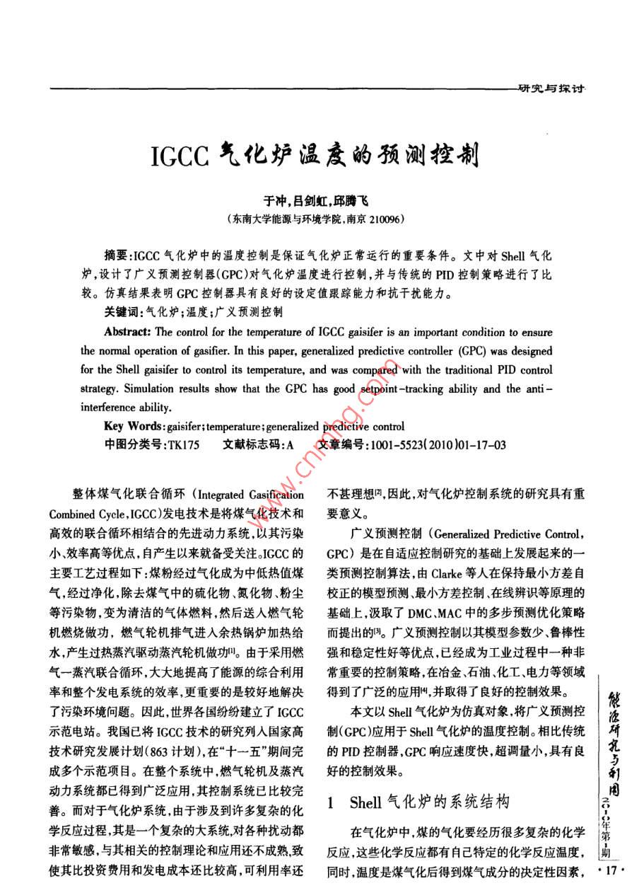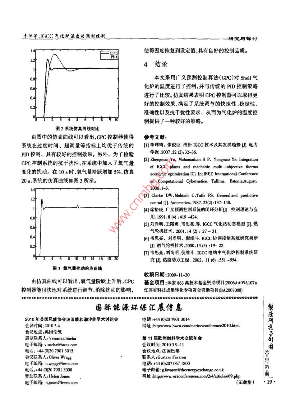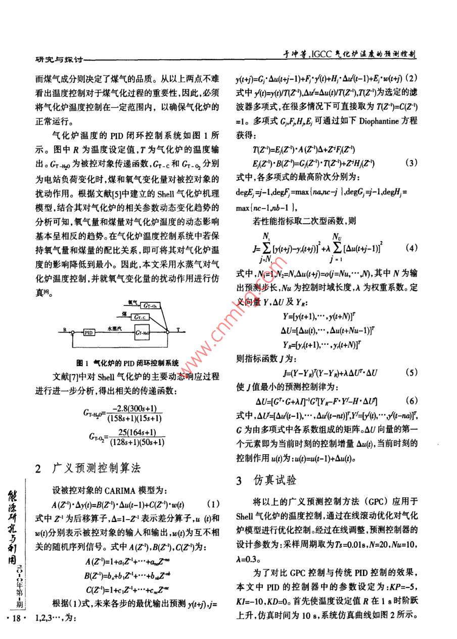 研究與探討IGCC氣化爐溫度的預(yù)測(cè)控制于沖,目劍虹,邱騰飛(東南大學(xué)能源與環(huán)境學(xué)院,南京210096)摘要:ICCC氣化爐中的溫度控制是保證氣化爐正常運(yùn)行的重要條件。文中對(duì)Shell氣化爐,設(shè)計(jì)了廣義預(yù)測(cè)控制器(GPC)對(duì)氣化爐溫度進(jìn)行控制,并與傳統(tǒng)的PID控制策略進(jìn)行了比較。仿真結(jié)果表明GPC控制器具有良好的設(shè)定值跟蹤能力和抗干擾能力。關(guān)鍵詞:氣化爐;溫度;廣義預(yù)測(cè)控制Abstract: The control for the temperature of ICCC gaisifer is an important condition to ensurethe normal operation of gasifier. In this paper, generalized predictive controller (GPC) was designedfor the Shell gaisifer to control its temperature, and was compared with the traditional PID controlstrategy. Simulation results show that the GPC has good setpoint -tracking ability and the anti -interference ability.Key Words:gaisifer;temperature;generalized predictive control中圖分類(lèi)號(hào):TK175文獻(xiàn)標(biāo)志碼:A 文章編號(hào) :1001-5523( 2010)01-17-03整體煤氣化聯(lián)合循環(huán)(Integrated Gasification不甚理想網(wǎng),因此,對(duì)氣化爐控制系統(tǒng)的研究具有重Combined Cycle,ICCC)發(fā)電技術(shù)是將煤氣化技術(shù)和要意義。高效的聯(lián)合循環(huán)相結(jié)合的先進(jìn)動(dòng)力系統(tǒng),以其污染廣義預(yù)測(cè)控制(Generalized Predictive Control,小效率高等優(yōu)點(diǎn),自產(chǎn)生以來(lái)就備受關(guān)注。IGCC的GPC)是在自適應(yīng)控制研究的基礎(chǔ)上發(fā)展起來(lái)的一主要工藝過(guò)程如下:煤粉經(jīng)過(guò)氣化成為中低熱值煤類(lèi)預(yù)測(cè)控制算法,由Clarke 等人在保持最小方差自氣,經(jīng)過(guò)凈化,除去煤氣中的硫化物、氮化物、粉塵校正的模型預(yù)測(cè)、最小方差控制、在線辨識(shí)等原理的等污染物,變?yōu)榍鍧嵉臍怏w燃料,然后送入燃?xì)廨喕A(chǔ)上,汲取了DMC .MAC中的多步預(yù)測(cè)優(yōu)化策略機(jī)燃燒做功,燃?xì)廨啓C(jī)排氣進(jìn)入余熱鍋爐加熱給而提出的明。廣義預(yù)測(cè)控制以其模型參數(shù)少、魯棒性水,產(chǎn)生過(guò)熱蒸汽驅(qū)動(dòng)蒸汽輪機(jī)做功。由于采用燃強(qiáng)和穩(wěn)定性好等優(yōu)點(diǎn),已經(jīng)成為工業(yè)過(guò)程中- -種非氣-蒸汽聯(lián)合循環(huán),大大地提高了能源的綜合利用常重要的控制策略,在冶金、石油、化工、電力等領(lǐng)域率和整個(gè)發(fā)電系統(tǒng)的效率,更重要的是較好地解決得到了廣泛的應(yīng)用",并取得了良好的控制效果。了污染環(huán)境問(wèn)題。因此,世界各國(guó)紛紛建立了ICCC本文以Shell氣化爐為仿真對(duì)象,將廣義預(yù)測(cè)控示范電站。我國(guó)已將ICC技術(shù)的研究列人國(guó)家高制(GPC)應(yīng)用于Shell氣化爐的溫度控制。相比傳統(tǒng)技術(shù)研究發(fā)展計(jì)劃(863計(jì)劃),在“十一五”期間完的PID控制器,GPC響應(yīng)速度快,超調(diào)量小,具有良成多個(gè)示范項(xiàng)目。在整個(gè)系統(tǒng)中,燃?xì)廨啓C(jī)及蒸汽好的控制效果。動(dòng)力系統(tǒng)都已得到廣泛應(yīng)用.其控制系統(tǒng)已比較完1Shell氣化爐的系統(tǒng)結(jié)構(gòu)用善。而對(duì)于氣化爐系統(tǒng),由于涉及到許多復(fù)雜的化學(xué)反應(yīng)過(guò)程,其是-一個(gè)復(fù)雜的大系統(tǒng),對(duì)各種擾動(dòng)都在氣化爐中,煤的氣化要經(jīng)歷很多復(fù)雜的化學(xué)第非常敏感,與其相關(guān)的控制理論和應(yīng)用還不成熟,致反應(yīng),這些化學(xué)反應(yīng)都有自己特定的化學(xué)反應(yīng)溫度,期使其比投資費(fèi)用和發(fā)電成本還比較高,可利用率還同時(shí),溫度是煤氣化后得到煤氣成分的決定性因素," 17●于沖等,IGCC氣化爐溫度的預(yù)測(cè)控制研究與探討而煤氣成分則決定了煤氣的品質(zhì)。從以上兩點(diǎn)不難y(+;)=G; Ou(+j-1)+F* y()+H (rl(-1)+E*"w(t+) (2)看出溫度控制對(duì)于煤氣化過(guò)程的重要性,因此,必須式中y()=y()VT(Z ),Au/=Qu(t)/T(2 ),T(Z )為選定的濾將氣化爐溫度控制在- -定范圍內(nèi),以確保氣化爐的波器多項(xiàng)式,在很多情況下可直接取為T(mén)(Z )=C(Z")正常運(yùn)行。=1。多項(xiàng)式C,F,H,E,可通過(guò)如下Diophantine方程氣化爐溫度的PID閉環(huán)控制系統(tǒng)如圖1所獲得:示。圖中R為溫度設(shè)定值,r為氣化爐的溫度輸T(Z)=E(Z )'A(Z ')Q+Z'F(Z)出。GrHp為被控對(duì)象傳遞函數(shù),GT c和G-q分別E;(Z).B(Z ")=C{Z ). T(Z )+ZH(Z")(3)為電站負(fù)荷變化時(shí),煤和氧氣變化量對(duì)被控對(duì)象的式中,各多項(xiàng)式的最高階次分別為:擾動(dòng)作用。根據(jù)文獻(xiàn)[5]中建立的Shell氣化爐機(jī)理degE;=j-1,degF;= max{na,nc rj ),degG =j-1,degH;=模型,結(jié)合其對(duì)氣化爐的相關(guān)參數(shù)動(dòng)態(tài)變化趨勢(shì)的max{nc- -1,nb-1 },分析可知,氧氣量和煤量對(duì)氣化爐溫度的動(dòng)態(tài)影響若性能指標(biāo)取二次型函數(shù),則基本呈相反的趨勢(shì)。在氣化爐溫度控制系統(tǒng)中若保NVy持氧氣量和煤量的配比關(guān)系,即可將其對(duì)氣化爐溫卜= Ebvt+)-xy(t +λ E[u(t+j-1)](4)度的影響降低到最小。因此,本文采用水蒸氣對(duì)氣式中,N=1,N=N,Au(+)=fjNu**.M,其中N為輸化爐溫度控制,并就氧氣變化量的擾動(dòng)作用進(jìn)行仿出預(yù)測(cè)步長(zhǎng),
