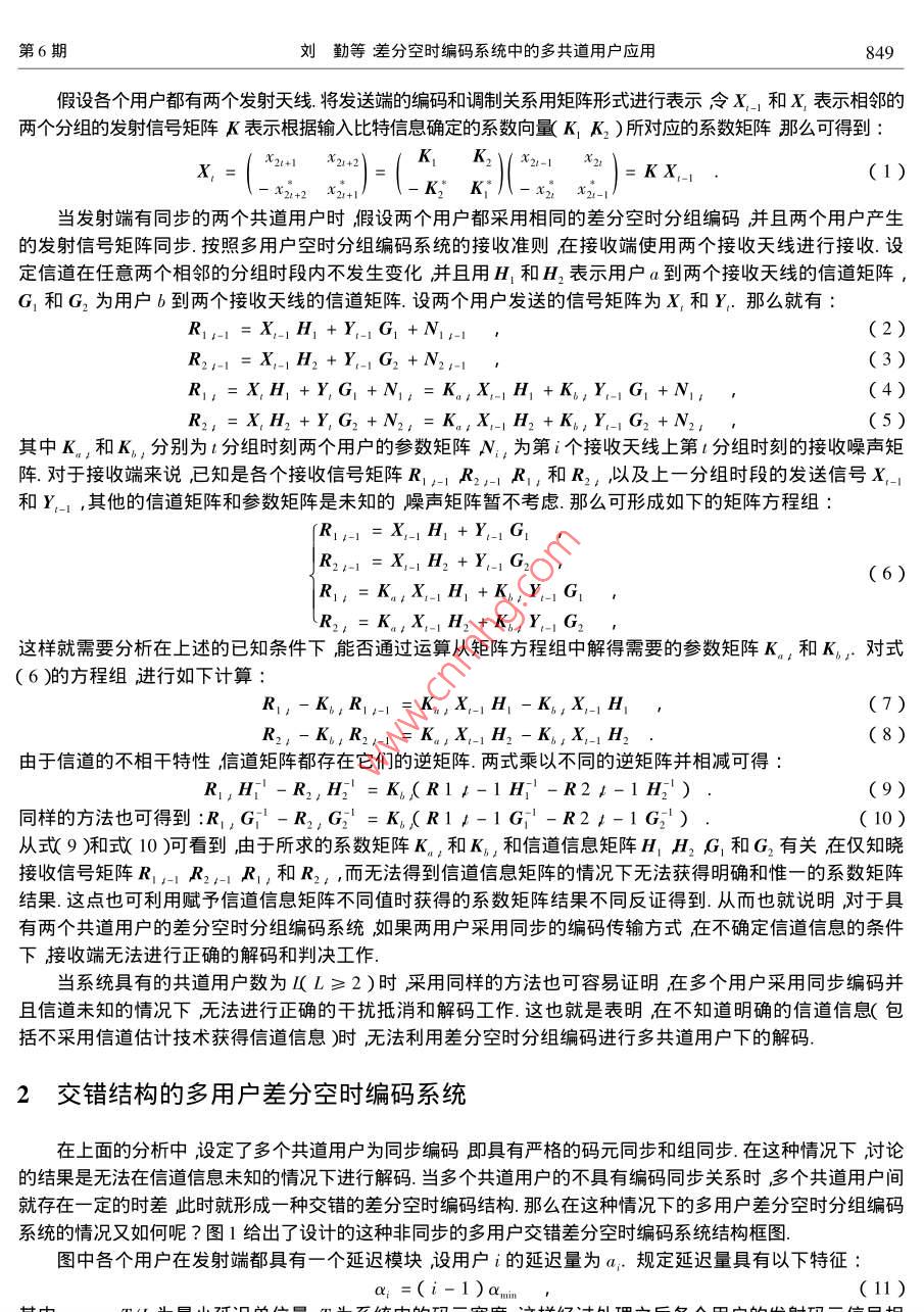 2005年12月西安電子科技大學(xué)學(xué)報(自然科學(xué)版)第32卷第6期JOURNAL OF XIDIAN UNIVERSITYVol 32 No 6差分空時編碼系統(tǒng)中的多共道用戶應(yīng)用劉勤,楊家瑋,李建東西安電子科技大學(xué)綜合業(yè)務(wù)網(wǎng)與關(guān)鍵技術(shù)國家重點實驗室信息科學(xué)研究所寬帶無線通信實驗室陜西西安710071)摘要:通過分析和推導(dǎo)指岀在多用戶差分空時分組編碼系統(tǒng)中發(fā)射端的多個共道用戶采用同步編碼和同步分組傳輸時接收端無法在未知信道狀態(tài)信息的情況下進(jìn)行差分解碼的結(jié)論.為了能夠保持原有編碼的差分解碼的特性提出了一種新型的多用戶交錯結(jié)構(gòu)利用多個共道用戶所發(fā)射的數(shù)據(jù)在時間上的不同時延彼此交錯形成傳輸?shù)姆峭?此時的接收端可通過輾轉(zhuǎn)迭代計算獲得等效的無共道干擾傳輸結(jié)果并通過差分計箅進(jìn)行解碼處理.具有這種交錯結(jié)構(gòu)的系統(tǒng)能夠在信道未知的情況下支持多個用戶的同時傳輸并且在接收端能夠?qū)崿F(xiàn)正確的解碼工作關(guān)鍵詞:差分空時分組編碼共道用戶洨錯結(jié)構(gòu)中圖分類號TN915.04文獻(xiàn)標(biāo)識碼:文章編號:001-24002005)6084804The differential space-time block coding system withmultiple co-channel usersLIU Qin, YANG Jia-wei, Ll Jian-dongState Key Lab. of Integrated Service Networks& Broadband Wireless Communications LabInformation Science Inst., Xidian Univ., Xi'an 710071, ChinaAbstract: After discussing the multi-user differential space-time block coding system, and analyzing therealizability of differential decoding method we can draw the conclusion that the receiver can not decode theinformation of various users while the channel is unknown if multiple co-channel users in the system aresynchronous. To solve this problem a new kind of offset system structure is presented. The multiple co-channelusers transmit signals nonsynchronously with different offset delays and the receiver can iteratively subtract toget the equivalent nil-interference result, which can be disposed of with the differential method. While themulti-user system is constructed accordint to the new offset structure, the receiver can easily cancel theinterference and decode the signal even if the channel state information is unknownKey Words: differential space-time block coding multiple co-channel users affset construct在空時編碼概念被提出之后,它就作為一種有效的抗衰落措施得到研究者的關(guān)注.同時人們也提出了數(shù)種不需要在接收端進(jìn)行信道估計來獲得信道信息就能夠進(jìn)行解碼的差分空時編碼例如基于正交設(shè)計的分組差分空時編碼2]基于群碼的差分空時調(diào)制3和酉空時差分編碼4]應(yīng)用空時編碼技術(shù)可獲得良好的分集增益和編碼增益3而采用干擾抵消技術(shù)后的空時編碼系統(tǒng)能夠支持多個共道用戶同時進(jìn)行通信在系統(tǒng)的容量和用戶的信息傳輸速率上系統(tǒng)能夠得到較大的提高671多用戶差分空時編碼系統(tǒng)分析根據(jù)文獻(xiàn)2]中的差分空時編碼模型分析存在多個同步共道用戶的系統(tǒng)接收和解碼情況.收稿日期200505-16基金項目國家自然科學(xué)基金和微軟亞洲研究院聯(lián)合資助項目(60372048)高等學(xué)校優(yōu)秀青年教師教學(xué)科研獎勵計劃 TRAPOYT)國家自然科學(xué)基金重大項目60496316)教育部科學(xué)技術(shù)研究重點項目(104171)國家863″計劃重大課題20014A123031第6期劉勤等差分空時編碼系統(tǒng)中的多共道用戶應(yīng)用假設(shè)各個用戶都有兩個發(fā)射天線將發(fā)送端的編碼和調(diào)制關(guān)系用矩陣形式進(jìn)行表示令X1和X表示相鄰的兩個分組的發(fā)射信號矩陣K表示根據(jù)輸入比特信息確定的系數(shù)向量KK2)所對應(yīng)的系數(shù)矩陣那么可得到KK=KX(1)x2+2x2+1-K2K1當(dāng)發(fā)射端有同步的兩個共道用戶時假設(shè)兩個用戶都采用相同的差分空時分組編碼并且兩個用戶產(chǎn)生的發(fā)射信號矩陣同步按照多用戶空時分組編碼系統(tǒng)的接收準(zhǔn)則在接收端使用兩個接收天線進(jìn)行接收.設(shè)定信道在任意兩個相鄰的分組時段內(nèi)不發(fā)生變化洴并且用H1和H2表示用戶a到兩個接收天線的信道矩陣G1和G2為用戶b到兩個接收天線的信道矩陣設(shè)兩個用戶發(fā)送的信號矩陣為X和Y.那么就有R11=X-1H1+Y1G1+N1:-1(2)R2A1=X-1H2+Y-1G2+N2-1(3R=X,H,+YG+N=kXh,+k, G+NRY, G2+N2=K X- H2+K其中K。和K,分別為t分組時刻兩個用戶的參數(shù)矩陣N為第i個接收天線上第t分組時刻的接收噪聲矩陣對于接收端來說已知是各個接收信號矩陣R11R2=1R1,和R2以及上一分組時段的發(fā)送信號X和Y_1,其他的信道矩陣和參數(shù)矩陣是未知的噪聲矩陣暫不考慮.那么可形成如下的矩陣方程組RX-H,+Y-GR2:1=X-:H2+Y-1CR1=K。X-1H1+K,Y-1GRKXH,+K這樣就需要分析在上述的已知條件下能否通過運算從矩陣方程組中解得需要的參數(shù)矩陣K。和K對式6)的方程組進(jìn)行如下計算K,,, Ru=KXH-k,x-H(7)R2;-K,R21=K,X(-1H2-k,X1-1H2由于信道的不相干特性信道矩陣都存在它們的逆矩陣.兩式乘以不同的逆矩陣并相減可得R1,H1-R2,H2=K(R11-1H1-R21-1H2)同樣的方法也可得到:R,G1-R2G2=K(R11-1G1-R21-1G2)從式9廂和式10)河看到由于所求的系數(shù)矩陣K和K和信道信息矩陣H1H2G1和G2有關(guān)在僅知曉接收信號矩陣R,R3,R1和R,而無法得到信道信息矩陣的情況下無法獲得明確和惟一的系數(shù)矩陣結(jié)果.這點