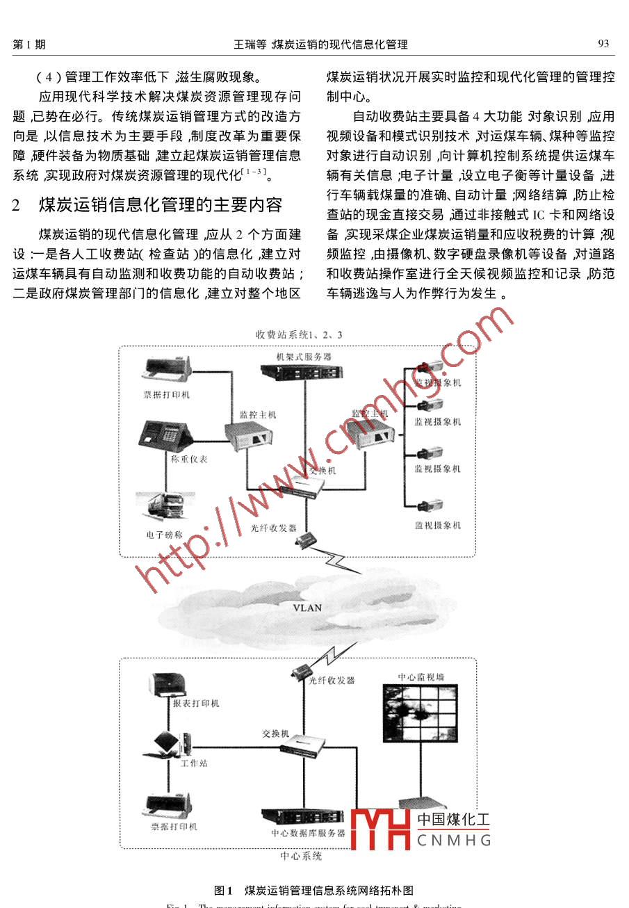 第20卷第1期資源環(huán)境與工程Vol. 202006年2月Resources Environment & EngineeringTotal No. 58文章編號: 1671 - 1211( 2006 )01 -0092 -04煤炭運(yùn)銷的現(xiàn)代信息化管理王瑞,王偉,任遠(yuǎn)(攀枝花市志林網(wǎng)絡(luò)科技有限責(zé)任公司四川攀枝花617000 )摘要:煤炭運(yùn)銷信息化管理是政府應(yīng)用現(xiàn)代信息技術(shù),對煤炭流通環(huán)節(jié)實(shí)行有效的監(jiān)控和管理,達(dá)到整頓礦產(chǎn)秩序和提高資源管理水平的目的。煤炭運(yùn)銷管理信息系統(tǒng),由對運(yùn)煤車輛具有自動(dòng)監(jiān)測和收費(fèi)功能的自動(dòng)收費(fèi)站和對整個(gè)地區(qū)煤炭運(yùn)銷狀況進(jìn)行實(shí)時(shí)監(jiān)控和現(xiàn)代化管理的管理控制中心兩大部分組成。煤炭運(yùn)銷的信息化管理不僅在資源規(guī)范管理、政府廉政建設(shè)等方面發(fā)揮重要作用,而且能顯著增加地方資源稅費(fèi)收入。關(guān)鍵詞:電子政務(wù);煤炭;運(yùn)銷;管理;信息化;系統(tǒng)中圖分類號: C931.6文獻(xiàn)標(biāo)識碼: A上調(diào)控煤炭資源的開發(fā)與保護(hù)。0引言這種傳統(tǒng)管理方式存在著明顯的管理漏洞:-當(dāng)前世界各國都把電子政務(wù)作為優(yōu)先發(fā)展戰(zhàn)是缺乏科學(xué)計(jì)量手段,運(yùn)煤車輛普遍嚴(yán)重超載。據(jù)略我國也十分重視政府系統(tǒng)政務(wù)信息化建設(shè)。近西南三省調(diào)查運(yùn)煤車輛實(shí)際載量與票據(jù)重量不符幾年來,全國電子政務(wù)工程正以迅猛勢頭發(fā)展2005是普遍現(xiàn)象。運(yùn)煤車輛核定噸位一般為7 t~10 t,年初政府網(wǎng)站已達(dá)到1萬個(gè)以上。電子政務(wù)成功的而實(shí)際承運(yùn)重量為15 t~20t超載一倍以上。各采重要標(biāo)志是能真正提高政府的行政功能所建電子煤企業(yè)(特別是民營煤礦)對煤炭的開采量,遠(yuǎn)超過政務(wù)系統(tǒng)具有很強(qiáng)的實(shí)用性和針對性。由于經(jīng)濟(jì)社國家配給的限額。二是缺乏嚴(yán)格管理監(jiān)督制度檢會(huì)基礎(chǔ)和資源擁有狀況不同各地電子政務(wù)的建設(shè)查站人員可以隨意放行運(yùn)煤車輛。不少地方檢查站重點(diǎn)也應(yīng)有所差異資源型地區(qū)-般應(yīng)把對資源的煤管人員玩忽職守,與礦主或車主私下進(jìn)行現(xiàn)金交管理列入電子政務(wù)工程的重點(diǎn)。易。三是缺乏有效監(jiān)控手段和設(shè)施煤炭偷運(yùn)現(xiàn)象攀枝花市志林網(wǎng)絡(luò)科技公司是位于西部地區(qū)的嚴(yán)重。運(yùn)礦車輛可以利用檢查站的管理紕漏進(jìn)行偷一家信息技術(shù)公 司,在深入調(diào)查資源型地區(qū)電子政運(yùn)例如車輛白天不過晚上過(檢查站休息時(shí)過),務(wù)的需求后提出把提升政府的資源管理職能作為逃避檢查站的檢查。電子政務(wù)工程的重點(diǎn)并根據(jù)全國煤炭能源形勢選上述現(xiàn)象在各地普遍存在,因而全國煤炭資源擇煤炭資源管理為突破口,積極開展了煤炭運(yùn)銷管實(shí)際開采量遠(yuǎn)高于經(jīng)檢查站檢查和收費(fèi)的煤炭量。理的信息化工作。從而導(dǎo)致:( 1 )煤炭資源開發(fā)基本失控私挖濫采現(xiàn)象比1煤炭運(yùn)銷信息化管理的必要性較嚴(yán)重;煤炭運(yùn)銷管理,是指對煤炭流通環(huán)節(jié)的管理。(2)政府在資源開發(fā)與保護(hù)上宏觀調(diào)控不力,目前國家對煤炭資源開發(fā)的管理主要從流通環(huán)節(jié)現(xiàn)有統(tǒng)計(jì)數(shù)堀嚴(yán)重生守決策缺乏科學(xué)依據(jù);入手通過發(fā)放定額煤票和設(shè)立人工收費(fèi)站(檢查中國煤化工和規(guī)費(fèi)未征收到財(cái)政站)來控制各采煤企業(yè)的煤炭開采量,從而在宏觀收入MHCNMHG收稿日期: 2005-11-24 ;改回日期: 2005-12-15作者簡介:王瑞( 1979- ),男,工程師,計(jì)算機(jī)專業(yè)。E - mail : wangui@ zllion. com. cn第1期王瑞等煤炭運(yùn)銷的現(xiàn)代信息化管理93(4 )管理工作效率低下滋生腐敗現(xiàn)象。煤炭運(yùn)銷狀況開展實(shí)時(shí)監(jiān)控和現(xiàn)代化管理的管理控應(yīng)用現(xiàn)代科學(xué)技術(shù)解決煤炭資源管理現(xiàn)存問制中心。題,已勢在必行。傳統(tǒng)煤炭運(yùn)銷管理方式的改造方自動(dòng)收費(fèi)站主要具備4大功能對象識別應(yīng)用向是,以信息技術(shù)為主要手段,制度改革為重要保視頻設(shè)備和模式識別技術(shù)對運(yùn)煤車輛、煤種等監(jiān)控障硬件裝備為物質(zhì)基礎(chǔ)建立起煤炭運(yùn)銷管理信息對象進(jìn)行自動(dòng)識別向計(jì)算機(jī)控制系統(tǒng)提供運(yùn)煤車系統(tǒng)實(shí)現(xiàn)政府對煤炭資源管理的現(xiàn)代化1-3。輛有關(guān)信息;電子計(jì)量,設(shè)立電子衡等計(jì)量設(shè)備進(jìn)2煤炭運(yùn)銷信息化管理的主要內(nèi)容行車輛載煤量的準(zhǔn)確、自動(dòng)計(jì)量;網(wǎng)絡(luò)結(jié)算,防止檢查站的現(xiàn)金直接交易通過非接觸式IC卡和網(wǎng)絡(luò)設(shè)煤炭運(yùn)銷的現(xiàn)代信息化管理應(yīng)從2個(gè)方面建備實(shí)現(xiàn)采煤企業(yè)煤炭運(yùn)銷量和應(yīng)收稅費(fèi)的計(jì)算視設(shè):-是各人工收費(fèi)站(檢查站)的信息化,建立對頻監(jiān)控,由攝像機(jī)、數(shù)字硬盤錄像機(jī)等設(shè)備對道路運(yùn)煤車輛具有自動(dòng)監(j