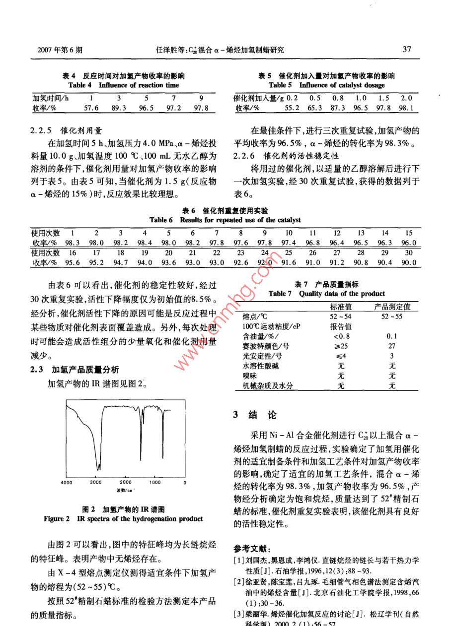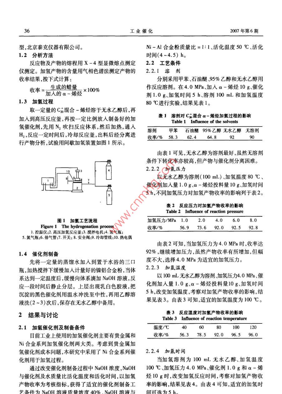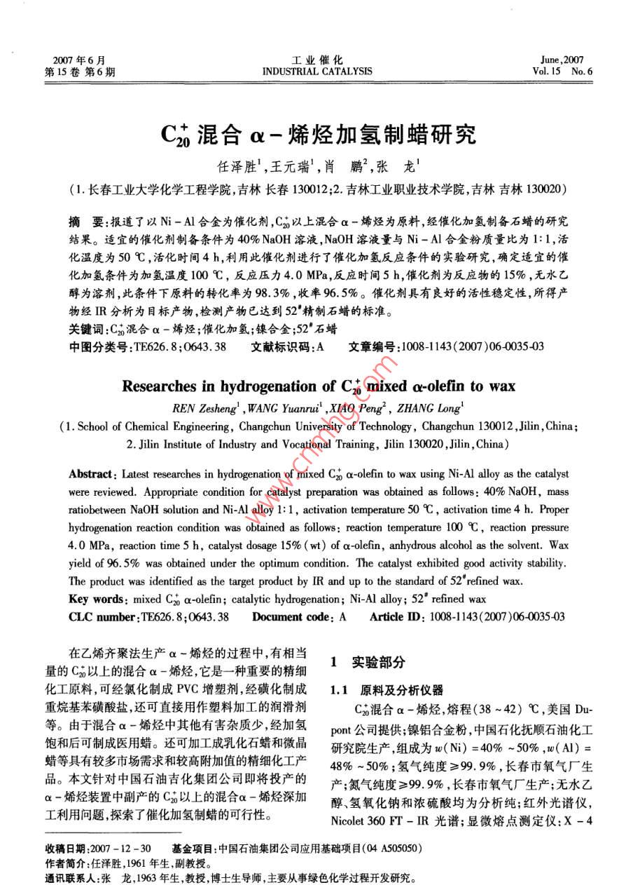 2007年6月工業(yè)催化June ,2007第15卷第6期INDUSTRIAL CATALYSISVol.15 No.6C20混合a-烯烴加氫制蠟研究任澤勝',王元瑞',肖鵬",張龍'(1.長(zhǎng)春工業(yè)大學(xué)化學(xué)工程學(xué)院,吉林長(zhǎng)春130012;2.吉林工業(yè)職業(yè)技術(shù)學(xué)院,吉林吉林130020)摘要:報(bào)道了以Ni-Al合金為催化劑,以上混合a-烯烴為原料, 經(jīng)催化加氫制備石蠟的研究結(jié)果。適宜的催化劑制備條件為40% NaOH溶液,NaOH溶液量與Ni-Al合金粉質(zhì)量比為1:1,活化溫度為50 C ,活化時(shí)間4 h,利用此催化劑進(jìn)行了催化加氫反應(yīng)條件的實(shí)驗(yàn)研究,確定適宜的催化加氫條件為加氫溫度100 C,反應(yīng)壓力4.0 MPa,反應(yīng)時(shí)間5 h,催化劑為反應(yīng)物的15%,無水乙醇為溶劑,此條件下原料的轉(zhuǎn)化率為98.3% ,收率96.5%。催化劑具有良好的活性穩(wěn)定性,所得產(chǎn)物經(jīng)IR分析為目標(biāo)產(chǎn)物,檢測(cè)產(chǎn)物已達(dá)到52*精制石蠟的標(biāo)準(zhǔn)。關(guān)鍵詞:Cg混合a-烯烴;催化加氫;鎳合金;52"石蠟中圖分類號(hào):TE626.8;0643. 38文獻(xiàn)標(biāo)識(shí)碼:A文章編號(hào):1008-1143(2007 )06-0035-03Researches in hydrogenation of C20 mixed axolefin to waxREN Zesheng' , WANG Yuanruil ,XIAO Peng2 , ZHANG Long'(1. School of Chemical Engineering, Changchun University of Technology,Changchun 130012 ,Jilin , China;2. Jilin Institute of Industry and Vocational Training, Jjilin 130020 , Jilin , China)Abstract: Latest researches in hydrogenation of mixed C2 a-olefin to wax using Ni-Al alloy as the catalystwere reviewed. Appropriate condition for catalyst preparation was obtained as follows: 40% NaOH, massratiobetween NaOH solution and Ni-Al alloy 1: 1, activation temperature 50 C, activation time4 h. Properhydrogenation reaction condition was obtained as follows: reaction temperature 100 C, reaction pressure4.0 MPa, reaction time 5 h, catalyst dosage 15% ( wt) of a-olefin, anhydrous alcohol as the solvent. Waxyield of 96. 5% was obtained under the optimum condition. The catalyst exhibited good activity stability.The product was identified as the target product by IR and up to the standard of 52 'efined wax.Key words: mixed C20 a-olefn; catalytic hydrogenation; Ni-Al alloy; 52* refined waxCLC number :TE626. 8;0643. 38Document code: AArticle ID: 1008-1 143(2007 )06-0035-03在乙烯齊聚法生產(chǎn)a -烯烴的過程中,有相當(dāng)1實(shí)驗(yàn)部分量的C2以上的混合a-烯烴,它是一種重要的精細(xì)化工原料,可經(jīng)氯化制成PVC增塑劑,經(jīng)磺化制成1.1原料及分析儀器重烷基苯磺酸鹽,還可直接用作塑料加工的潤(rùn)滑劑Czo混合a-烯烴,熔程(38 ~42) C,美國(guó)Du-等。由于混合a -烯烴中其他有害雜質(zhì)少,經(jīng)加氫pont公司提供;鎳鋁合金粉,中國(guó)石化撫順石油化工飽和后可制成醫(yī)用蠟。還可加工成乳化石蠟和微晶研究院生產(chǎn),組成為w(Ni) =40% ~ 50% ,w(AI) =蠟等具有較多市場(chǎng)需求和較高附加值的精細(xì)化工產(chǎn)48% ~ 50%;氫氣純度≥99.9%,長(zhǎng)春市氧氣廠生.品。本文針對(duì)中國(guó)石油吉化集團(tuán)公司即將投產(chǎn)的產(chǎn);氮?dú)饧兌取?9.9% ,長(zhǎng)春市氧氣廠生產(chǎn);無水乙a -烯烴裝置中副產(chǎn)的C20 以上的混合a -烯烴深加醇、氫氧化鈉和濃硫酸均為分析純;紅外光譜儀,工利用問題,探索了催化加氫制蠟的可行性。Nicolet 360 FT- IR光譜;顯微熔點(diǎn)測(cè)定儀:X -4收稿日期: 2007-12-30基金項(xiàng)目:中國(guó)石油集團(tuán)公司應(yīng)用基礎(chǔ)項(xiàng)目(04 A505050)作者簡(jiǎn)介:任澤勝, 1961年生,副教授。通訊聯(lián)系人:張龍,1963 年生,教授,博士生導(dǎo)師,主要從事綠色化學(xué)過程開發(fā)研究。36工業(yè)催化2007年第6期型,北京泰克儀器有限公司。Ni-Al合金粉質(zhì)量比=1:1、活化溫度50 C、活化1.2 分析方法時(shí)間(4~4.5) h。反應(yīng)物及產(chǎn)物的熔程用X-4型顯微熔點(diǎn)測(cè)定2.2工藝條件儀測(cè)定。加氫產(chǎn)物的含量用氣相色譜法測(cè)定產(chǎn)物的2.2.1溶劑收率結(jié)果,按下式計(jì)算: .分別采用甲苯石油醚.95%乙醇和無水乙醇用收率=_生成的蠟量x 100%作反應(yīng)溶劑。在4.0 MPa、加入a-烯烴10 g、催化加入的a-烯烴劑1.0g、加氫時(shí)間5h、溶劑100mL和加氫溫度1.3加氫過程80C進(jìn)行實(shí)驗(yàn),結(jié)果見表1。取一定量的C2混合-烯烴溶于無水乙醇后,再加人到高壓反應(yīng)釜,再按-定比例放入制備好的加表1溶劑對(duì) C5混合a-烯烴加氫過程的影響Table 1 Influence of the solvents氫催化劑,先用N2吹掃反應(yīng)體系,然后加熱,通人溶劑甲苯石油醚 95%乙醇無水乙醇無溶劑H,反應(yīng)-一定時(shí)間后,冷卻反應(yīng)釜,出料后經(jīng)分離進(jìn)收率/% 58. 362.464. 8929行產(chǎn)物分析,試驗(yàn)用間歇加氫裝置如圖1所示。由表1可見,無水乙醇為溶劑最好,雖然無溶劑條件下轉(zhuǎn)化率亦較高,但產(chǎn)物與催化劑分離困難。2.2.2加氫壓力以無水乙醇為溶劑( 100 mL)、加氫溫度80 C、催化劑加入量1.0g、a -烯烴投料量10 g、加氫時(shí)間5 h,不同加氫壓力對(duì)加氫產(chǎn)物收率的影響列于表2。表2反應(yīng)壓力對(duì)加氫產(chǎn) 物收率的影響Table 2 Influence of reaction pressure圖1加氫工藝流程加氫壓力/MPa 1.02.04.06.0 8.0Figure 1 The hydrogenation process收率/%56.973. 692.0 92.5 92. 81.控溫儀;2.高壓加氫反應(yīng)釜;3.攪拌電機(jī);4.氫氣瓶;5.氮?dú)馄?6.排氣管;7.開關(guān); 8.安全閥;9.冷卻管線;10.熱電偶由表2