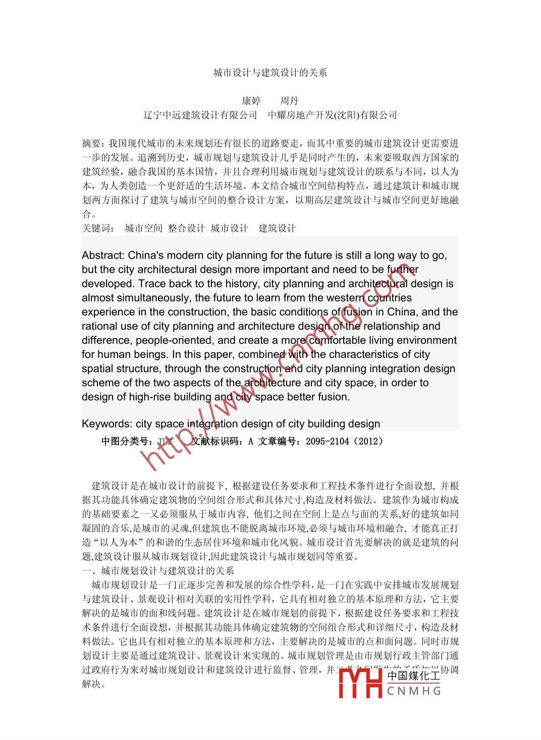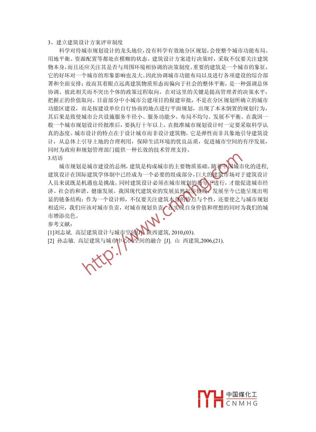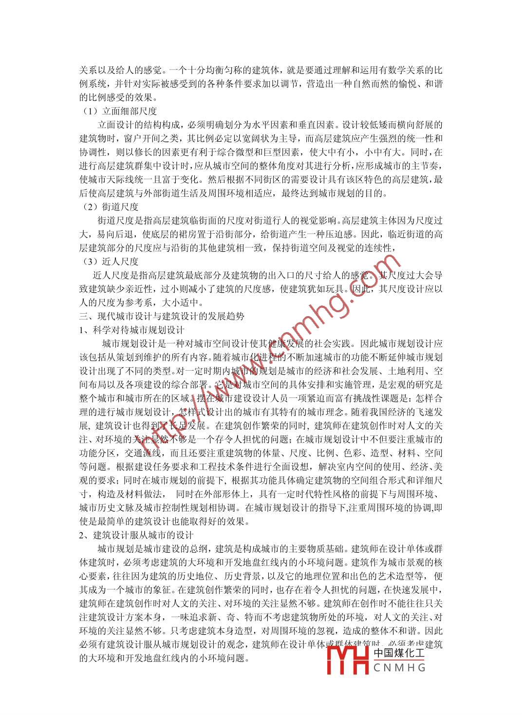 城市設(shè)計(jì)與建筑設(shè)計(jì)的關(guān)系康婷周丹遼寧中遠(yuǎn)建筑設(shè)計(jì)有限公司中 耀房地產(chǎn)開發(fā)(沈陽)有限公司摘要:我國現(xiàn)代城市的未來規(guī)劃還有很長的道路要走,而其中重要的城市建筑設(shè)計(jì)更需要進(jìn)一步的發(fā)展。追溯到歷史,城市規(guī)劃與建筑設(shè)計(jì)幾乎是同時(shí)產(chǎn)生的,未來要吸取西方國家的建筑經(jīng)驗(yàn),融合我國的基本國情,并且合理利用城市規(guī)劃與建筑設(shè)計(jì)的聯(lián)系與不同,以人為本,為人類創(chuàng)造--個(gè)更舒適的生活環(huán)境。本文結(jié)合城市空間結(jié)構(gòu)特點(diǎn),通過建筑計(jì)和城市規(guī)劃兩方面探討了建筑與城市空間的整合設(shè)計(jì)方案,以期高層建筑設(shè)計(jì)與城市空間更好地融合。關(guān)鍵詞:城市空間 整合設(shè)計(jì)城市設(shè)計(jì)建筑設(shè)計(jì)Abstract: China's modern city planning for the future is still a long way to go,but the city architectural design more important and need to be furtherdeveloped. Trace back to the history, city planning and architectural design isalmost simultaneously, the future to learn from the western countriesexperience in the construction, the basic conditions of fusion in China, and therational use of city planning and architecture design of the relationship anddifference, people-oriented, and create a more comfortable living environmentfor human beings. In this paper, combined with the characteristics of cityspatial structure, through the construction and city planning integration designscheme of the two aspects of the architecture and city space, in order todesign of high-rise building and city space better fusion.Keywords: city space integration design of city building design中圖分類號(hào): TU2文獻(xiàn)標(biāo)識(shí)碼: A文章編號(hào): 2095-2104 (2012)建筑設(shè)計(jì)是在城市設(shè)計(jì)的前提下,根據(jù)建設(shè)任務(wù)要求和工程技術(shù)條件進(jìn)行全面設(shè)想,并根據(jù)其功能具體確定建筑物的空間組合形式和具體尺寸,構(gòu)造及材料做法。建筑作為城市構(gòu)成的基礎(chǔ)要素之一又必須服從于城市內(nèi)容,他們之間在空間上是點(diǎn)與面的關(guān)系,好的建筑如同凝固的音樂,是城市的靈魂,但建筑也不能脫離城市環(huán)境,必須與城市環(huán)境相融合,才能真正打造“以人為本”的和諧的生態(tài)居住環(huán)境和城市化風(fēng)貌。城市設(shè)計(jì)首先要解決的就是建筑的問題,建筑設(shè)計(jì)服從城市規(guī)劃設(shè)計(jì),因此建筑設(shè)計(jì)與城市規(guī)劃同等重要。城市規(guī)劃設(shè)計(jì)與建筑設(shè)計(jì)的關(guān)系城市規(guī)劃設(shè)計(jì)是一門正逐步完善和發(fā)展的綜合性學(xué)科,是一門在實(shí)踐中安排城市發(fā)展規(guī)劃與建筑設(shè)計(jì)、景觀設(shè)計(jì)相對關(guān)聯(lián)的實(shí)用性學(xué)科,它具有相對獨(dú)立的基本原理和方法,它主要解決的是城市的面和線問題。建筑設(shè)計(jì)是在城市規(guī)劃的前提下,根據(jù)建設(shè)任務(wù)要求和工程技術(shù)條件進(jìn)行全面設(shè)想,并根據(jù)其功能具體確定建筑物的空間組合形式和詳細(xì)尺寸,構(gòu)造及材料做法。它也具有相對獨(dú)立的基本原理和方法,主要解決的是城市的點(diǎn)和面問題。同時(shí)市規(guī)劃設(shè)計(jì)主要是通過建筑設(shè)計(jì)、景觀設(shè)計(jì)來實(shí)現(xiàn)的。城市規(guī)劃管理是由市規(guī)劃行政主管部門通過政府行為來對城市規(guī)劃設(shè)計(jì)和建筑設(shè)計(jì)進(jìn)行監(jiān)督、管理,并' 中國煤化王協(xié)調(diào)解決。YHCNMH G二、城市設(shè)計(jì)與建筑設(shè)計(jì)的形式1、建筑空間輪廓與城市空間輪廓的組合設(shè)計(jì)城市的天際線只是--維的立面邊線為主的輪廓線,而它反映的是三維的城市空間,以及整個(gè)城市的風(fēng)貌特點(diǎn)。因此,三維城市空間的布局,不僅僅是功能性的問題,也是對建筑風(fēng)貌的選擇與城市風(fēng)貌的構(gòu)建。從城市區(qū)域規(guī)劃出發(fā)設(shè)想建筑與大環(huán)境的結(jié)合,立面上虛實(shí)對比、色彩處理與環(huán)境格調(diào)相協(xié)調(diào),流線.上符合環(huán)境的肌理。從人的感覺出發(fā)想象建筑局部小環(huán)境的處理,應(yīng)通過人的生理和心理需求來感受塑造空間。從而實(shí)現(xiàn)建筑的整體輪廓上與城市空間輪廓的呼應(yīng)。具體來講,建筑結(jié)合城市輪廓的設(shè)計(jì)可以分為點(diǎn)狀形態(tài)、線狀形態(tài)和立體網(wǎng)絡(luò)形態(tài)三個(gè)層次的組合。點(diǎn)狀形態(tài)組合是指在建筑個(gè)體設(shè)計(jì)中應(yīng)協(xié)同城市機(jī)能,實(shí)現(xiàn)各空間單元的合理歸屬及其屬性包括各建筑空間單元在城市三維空間坐標(biāo)中占據(jù)的位序特征、空間所有權(quán)的合理定位及空間容量和性質(zhì)的合理配比。線性形態(tài)組合是指在設(shè)計(jì)中重新形成的建筑與原有城市建筑的協(xié)調(diào)。建筑設(shè)計(jì)觀念應(yīng)由單體概念轉(zhuǎn)向成片的綜合群體,用地方式表現(xiàn)為跨街區(qū)的聯(lián)合開發(fā),功能組織上高度集聚而成為功能群組,在空間組織上,表現(xiàn)為城市空間立體綜合開發(fā)利用。立體網(wǎng)絡(luò)形態(tài)是建筑與城市在三維
