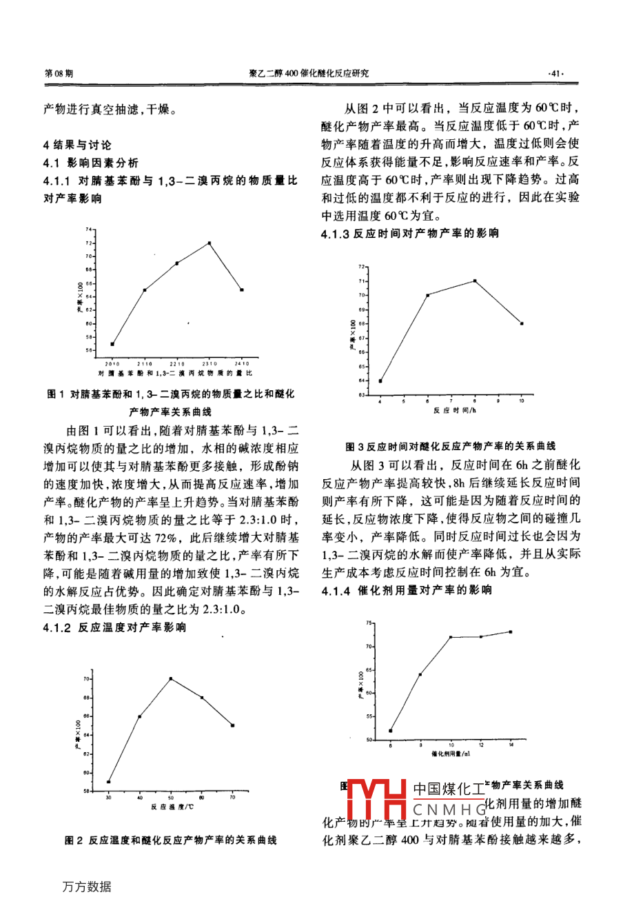 化工中間體Chemical Intermediate2000年第08期科研開發(fā)聚乙二醇400催化醚化反應研究摘要:本實驗采用聚乙二醇400作為催化劑研究了13-二(對腈基苯氧基)丙烷的合成工藝條件。通過實驗考察了對腈基苯酚與13-二溴丙烷的物質量比時間溫度催化劑用量等因素對產(chǎn)率的影響。得到了適宜的工藝條件為:對腈基苯酚與13-二溴丙烷物質的量之比為23:1.0,醚化反應溫度為60℃反應時間為6h,催化劑用量10ml,其最大產(chǎn)率達到72%。關鍵詞聚乙二醇400;1,3-二(對腈基苯氧基)丙烷;相轉移中圖分類號:T23162文獻標識碼:A文章編號:16728142009)080040037~8個氧原子處于同一平面的假環(huán)狀結構,而其1,3-二(對腈基苯氧基)丙烷作為一種重要余氧原子則彎曲于平面的一側,能夠與反應試劑的有機中間體在醫(yī)藥,農(nóng)藥上的用途很廣[,但中的堿金屬或堿金屬陽離子生成穩(wěn)定配合物,溶使用常規(guī)的威廉森反應產(chǎn)率較低,因此如何提高于有機相中,從而使親核試劑№u-棵露,使之具醚化步驟的產(chǎn)率成為當今研究的一個熱點。相轉有較高反應活性,同時從水相轉移到有機相中,形移催化技術目前廣泛應用于多種化學反應,合成成目標產(chǎn)物。出了多種新型化合物叫,本實驗采用聚乙二醇400作為相轉移催化劑合成1,3-二(對腈基苯氧基H丙烷。實驗原理聚乙二醇400催化反應過程如下。0m-2實驗部分2.1儀器與試劑實驗儀器:傅立葉紅外光譜儀,電動攪拌器,km7~c求相四口燒,循環(huán)水式真空,恒溫水浴鍋,德形瓶界面興達化工廠,1,3-二溴丙烷(分析純),山東鄒平銘興化工有限公司,聚乙二醇40(分析純),天津PEG市大茂化學試劑廠,苯甲醚(分析純),天津市化學試劑一廠,氫氧化鈉(分析純),天津天大化工廠PEG№rCN Br(CH2hB3實驗步驟聚乙二醇400鏈節(jié)可以折疊成螺旋狀并自由將氫氧化鈉固體置于錐形瓶中加入去離子水滑動的鏈,如下圖。其中氧原子位于內側,形成和對腈基苯酚攪拌,使其完全溶解后移至四口燒瓶中,后將13--丙驚溶解在苯甲醚中攪拌中國煤化工將油相緩慢加人到作者簡介:蔡亮(1982-),男,碩士研究生,2007月畢業(yè)于中北四口CNMHG醇400在設定溫度大學化工與環(huán)境學院應用化學專業(yè)現(xiàn)從事有機合成工作下反應一段時間后停止攪拌,冷卻,倒人燒杯,靜·通訊聯(lián)系人置后有白色沉淀析出,然后洗滌靜置;將靜置后的第08期聚乙二醇400催化醚化反應研究產(chǎn)物進行真空抽濾,干燥。從圖2中可以看出,當反應溫度為60℃時,醚化產(chǎn)物產(chǎn)率最高。當反應溫度低于60℃時,產(chǎn)4結果與討論物產(chǎn)率隨著溫度的升高而增大,溫度過低則會使4.1影響因素分析反應體系獲得能量不足,影響反應速率和產(chǎn)率。反4.11對腈基苯酚與1,3-二溴丙烷的物質量比應溫度高于60℃時,產(chǎn)率則出現(xiàn)下降趨勢。過高對產(chǎn)率影響和過低的溫度都不利于反應的進行,因此在實驗中選用溫度60℃為宜。4.1.3反應時間對產(chǎn)物產(chǎn)率的影響對基苯酚和1,3-二溴丙烷物質的盤比圖1對腈基苯酚和1,3-二溴丙烷的物質量之比和醚化產(chǎn)物產(chǎn)率關系曲線反應時間/h由圖1可以看出,隨著對腈基苯酚與1,3-二溴內烷物質的量之比的增加,水相的堿濃度相應圖3反應時間對醚化反應產(chǎn)物產(chǎn)率的關系曲線增加可以使其與對腈基苯酚更多接觸,形成酚鈉從圖3可以看出,反應時間在6h之前醚化的速度加快,濃度增大,從而提高反應速率,增加反應產(chǎn)物產(chǎn)率提高較快,8h后繼續(xù)延長反應時間產(chǎn)率。醚化產(chǎn)物的產(chǎn)率呈上升趨勢。當對腈基苯酚則產(chǎn)率有所下降,這可能是因為隨著反應時間的和1,3-二溴丙烷物質的量之比等于23:1.0時,延長,反應物濃度下降,使得反應物之間的碰撞幾產(chǎn)物的產(chǎn)率最大可達72%,此后繼續(xù)增大對腈基率變小,產(chǎn)率降低。同時反應時間過長也會因為苯酚和1,3-二溴內烷物質的量之比,產(chǎn)率有所下1,3-二溴丙烷的水解而使產(chǎn)率降低,并且從實際降,可能是隨著堿用量的增加致使1,3-二溴內烷生產(chǎn)成本考慮反應時間控制在6h為宜。的水解反應占優(yōu)勢。因此確定對腈基苯酚與1,3-4.1.4催化劑用量對產(chǎn)率的影響二溴丙烷最佳物質的量之比為23:1.0。4.1.2反應溫度對產(chǎn)率影響?zhàn)瘎┯昧?a1中國煤化工物產(chǎn)率關系曲線反應溫度/℃CNMHG化劑用量的增加醚化產(chǎn)物時廣皇工廾超努。陽著使用量的加大,催圖2反應溫度和釀化反應產(chǎn)物產(chǎn)率的關系曲線化劑聚乙二醇400與對腈基苯酚接觸越來越多化工中間體42·Chemical Intermediate2009年第08期形成的堿金屬絡合物也越來越多,不斷的進入到有機相中去,使得反應加速進行,產(chǎn)率也增加。催5結論化劑用量超過10ml后產(chǎn)率增加不大,因此從實際本研究采用聚乙二醇400為相轉移催化劑催效果考慮,催化劑用量選用10ml為佳?;瘜﹄婊椒雍铣?3-二(對腈基苯氧基)丙烷,4.2紅外譜圖分析以苯甲醚為溶劑通過正交實驗研究了對腈基苯酚聚乙二醇400催化醚化反應產(chǎn)物的紅外譜與1,3-二溴丙烷物質的量之比、反應溫度、催化圖如下。劑用量和反應時間對醚化產(chǎn)物產(chǎn)率的影響。通過對實驗結果的分析,得出對腈基苯酚醚化反應的最佳工藝條件:對腈基苯酚與1,3-二溴丙烷物質的量之比為2310,醚化反應溫度為60℃,反應時間為6h,催化劑用量1oml,其最
