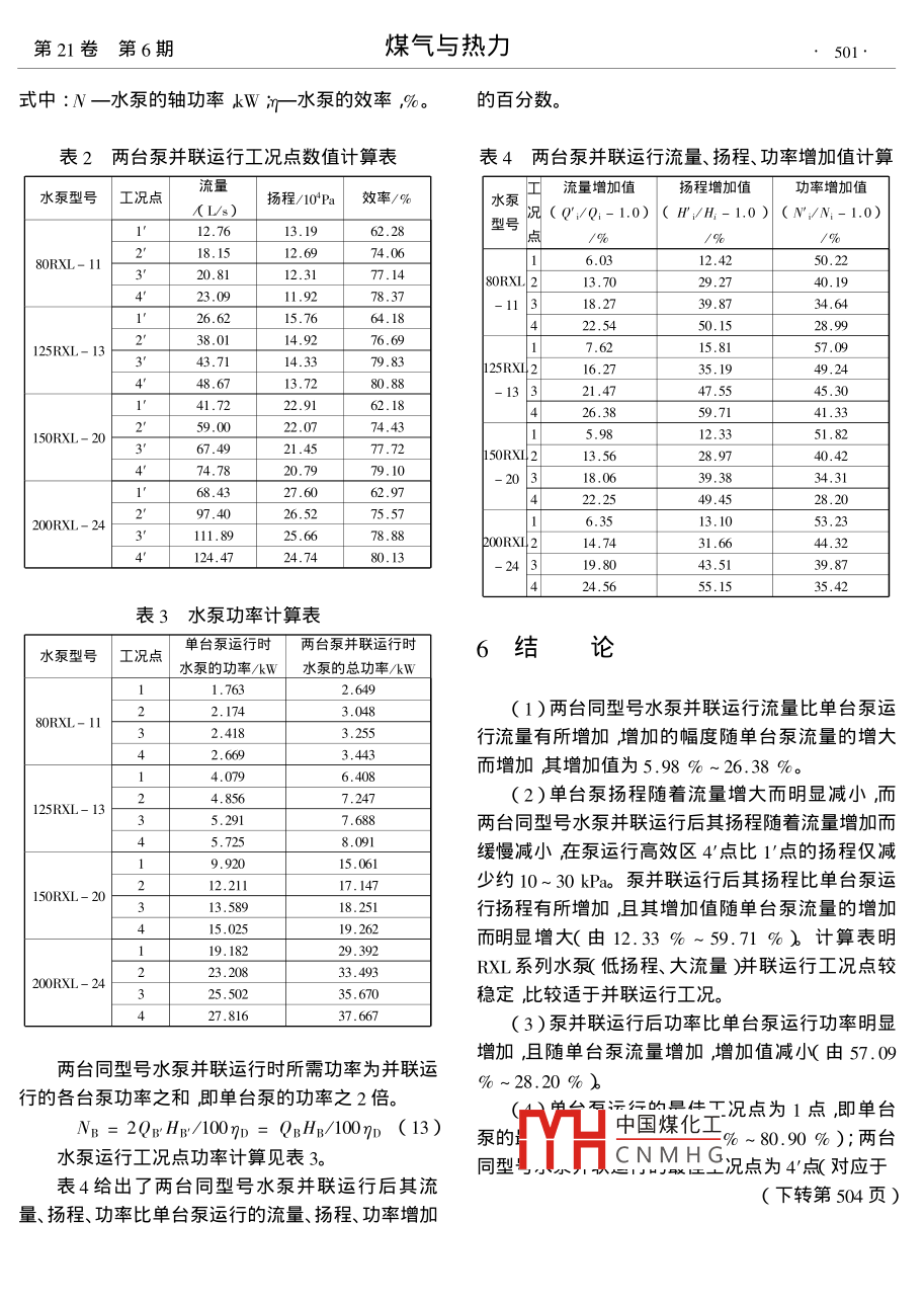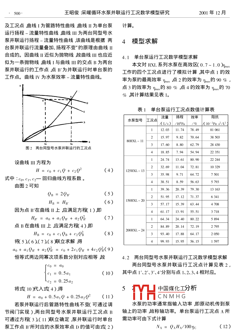 第21卷第6期煤氣與熱力.文章編號(hào):1000- 4416( 2001 )06 - 0499- 03采暖循環(huán)水泵并聯(lián)運(yùn)行工況數(shù)學(xué)模型研究王昭俊(哈爾濱工業(yè)大學(xué)市政環(huán)境工程學(xué)院黑龍江哈爾濱150090 )摘要:建立了單臺(tái)水泵及兩臺(tái)水泵并聯(lián)運(yùn)行工況的數(shù)學(xué)模型進(jìn)行了模擬計(jì)算,兩臺(tái)水泵并聯(lián)運(yùn)行最佳工況點(diǎn)的總流量比單臺(tái)泵運(yùn)行流量增加約25 %功率增加40 %而在非最佳運(yùn)行工況點(diǎn)并聯(lián)運(yùn)行后總流量增加最少時(shí)不到6 %耗功率增加最大時(shí)為57 %。關(guān)鍵詞:采暖循環(huán)水泵并聯(lián)運(yùn)行;最佳工況點(diǎn)中圖分類(lèi)號(hào):TU995.1文獻(xiàn)標(biāo)識(shí)碼:A1引言RXL系列水泵的特性回歸曲線方程為[7]H= ao+ a1Q+ a2Q2(1)采暖工程設(shè)計(jì)中為了滿(mǎn)足流量的要求常采用η=bo+biQ+b2Q2(2)循環(huán)水泵并聯(lián)運(yùn)行方案。關(guān)于循環(huán)水泵的選型設(shè)計(jì)式中:Q一流量L/s;H-揚(yáng)程,10Pan-效率,% ;已有介紹1-4]但對(duì)兩臺(tái)同型號(hào)采暖循環(huán)水泵并聯(lián)ao、a小a2、bov b1、b2一回歸曲線方程系數(shù)。運(yùn)行方案是否經(jīng)濟(jì)節(jié)能看法不一。水泵并聯(lián)運(yùn)行工管路特性曲線方程為況點(diǎn)可通過(guò)圖解法來(lái)確定據(jù)此可定性得出水泵并H= sQ2(3)聯(lián)運(yùn)行總流量大于單泵運(yùn)行的流量,小于各臺(tái)泵單.式中:H-管路阻力損失,10+Pa;s-管路阻抗,獨(dú)運(yùn)行流量之和5。但兩臺(tái)泵并聯(lián)運(yùn)行后總流量比10tPa s2/L? ;Q一流量,L/s。單臺(tái)泵運(yùn)行流量究竟增加多少呢?通過(guò)熱水供暖系單臺(tái)泵運(yùn)行工況點(diǎn)A的流量和揚(yáng)程可通過(guò)方統(tǒng)循環(huán)泵運(yùn)行狀況的實(shí)測(cè)數(shù)據(jù)得出:同型號(hào)水泵并程(1 )(3 )聯(lián)立求出,A點(diǎn)所對(duì)應(yīng)的水泵效率點(diǎn)為聯(lián)運(yùn)行實(shí)際流量增加最大不超過(guò)40 % ,而 且很大一C可由方程(2)求出。部分流量增加不足10 %[6。本文試圖通過(guò)建立水泵并聯(lián)運(yùn)行工況數(shù)學(xué)模型,并以RXL系列水泵為例7]通過(guò)仿真計(jì)算進(jìn)一步地探討和驗(yàn)證上述結(jié)論。如果.上述實(shí)驗(yàn)結(jié)論具有普遍意義則將使人們重新考慮水泵并聯(lián)運(yùn)行是否經(jīng)濟(jì)、合理、節(jié)能的問(wèn)題。這是系統(tǒng)優(yōu)化設(shè)計(jì)中所必須考慮的問(wèn)題。2單臺(tái)泵運(yùn)行工況數(shù)學(xué)模型圖1 單臺(tái)泵運(yùn)行的工況點(diǎn)圖1為單臺(tái)泵運(yùn)行工況5]其中曲線1為管路中國(guó)煤化工特性曲線曲線II為水泵揚(yáng)程-流量特性曲線,E3MYHCNIM H C故學(xué)模型者的交點(diǎn)A即為單臺(tái)泵運(yùn)行的工況點(diǎn),曲線III為泵的效率-流量特性曲線。圖2所示為兩臺(tái)同型號(hào)水泵并聯(lián)運(yùn)行特性曲線*收稿日期:2001-01- 15作者簡(jiǎn)介:王昭俊( 1965- )女遼寧撫順人副教授博士生主要從事供熱與鍋爐的研究與教學(xué)工作。500王昭俊采暖循環(huán)水泵并聯(lián)運(yùn)行工況數(shù)學(xué)模型研究2001年12月及工況點(diǎn),曲線1為管路特性曲線,曲線II為單臺(tái)泵計(jì)算。運(yùn)行揚(yáng)程-流量特性曲線,曲線II為兩臺(tái)同型號(hào)水泵并聯(lián)運(yùn)行揚(yáng)程-流量特性曲線,該曲線是根據(jù)兩4模型求解 .臺(tái)泵并聯(lián)運(yùn)行流量疊加、揚(yáng)程不變"的原理由曲線II合成的。因曲線II近似為拋物線故曲線II也應(yīng)近4.1單 臺(tái)泵運(yùn)行工況數(shù)學(xué)模型求解似為一條拋物線 ,曲線1與曲線III 的交點(diǎn)B為兩臺(tái)本文對(duì)RXL系列水泵在高效區(qū)(0.7~1.0)mmx泵并聯(lián)運(yùn)行的工作點(diǎn)點(diǎn)B'為并聯(lián)運(yùn)行時(shí)單臺(tái)泵的工作的四個(gè)工況點(diǎn)進(jìn)行了模擬計(jì)算其中點(diǎn)1的效工作點(diǎn)。曲線IV為水泵效率-流量特性曲線。率為泵的最高效率ηmax點(diǎn)2的效率為nmas的90% ,點(diǎn)3的效率為nmo.的80 %點(diǎn)4的效率為7m.的70%其計(jì)算結(jié)果見(jiàn)表1。表1單臺(tái)泵運(yùn)行工況點(diǎn)數(shù)值計(jì)算表流量揚(yáng)程效率阻抗水泵型號(hào)工況點(diǎn)(L/s) /10Pa/% 10-Pa 3?/L y1| 12.03| 11.74| 78.4981 0612| 15.97| 9.82| 70.6438 50380RXL.-113| 17.60| 8.80| 62.7928 430圖2兩臺(tái)同型號(hào)水泵并聯(lián)運(yùn)行的工況點(diǎn)4| 18.85| 7.94| 54.9422 3511| 24.74| 13.61| 80.9022 244設(shè)曲線II方程為2| 32.69| 11.04 72.8110 329H = co+c1Q+ c2Q2(4)125RXL- 1335.989.7164.727 501式中:coC1、C2-回歸曲線方程系數(shù)。38.51| 8. 5956.635 793由圖2可知39.36| 20.39| 79. 3013 163Qp = 2Qp"(5)51.9517.12| 71.376 341Hp=H(6)150RXL- 203| 57.17| 15.39| 63 .444708因?yàn)辄c(diǎn)B'在曲線II上應(yīng)滿(mǎn)足方程(1)即4| 61.17| 13.91| 55.513 718Hp = ao+ a1Qg + a2Q屆(7)64.34| 24.40| 80.225 894點(diǎn)B在曲線II上應(yīng)滿(mǎn)足方程( 4)即2| 84.89| 20.14| 72.192 795200RXL-24 .Hp = co+ cqQp+ c2Q名(8)3| 93.40| 17.88| 64.172 050將(5)(6)(7)(8)聯(lián)立求解得4| 99.93| 15.95 | 56.151 597ao+ auQr + a2Qi = co+ 2cQw + 4c2QK(9)恒等式兩邊同冪次項(xiàng)系數(shù)分別對(duì)應(yīng)相等故4.2兩臺(tái)同型 號(hào)水泵并聯(lián)運(yùn)行工況數(shù)學(xué)模型求解Co=ao兩臺(tái)同型號(hào)水泵并聯(lián)運(yùn)