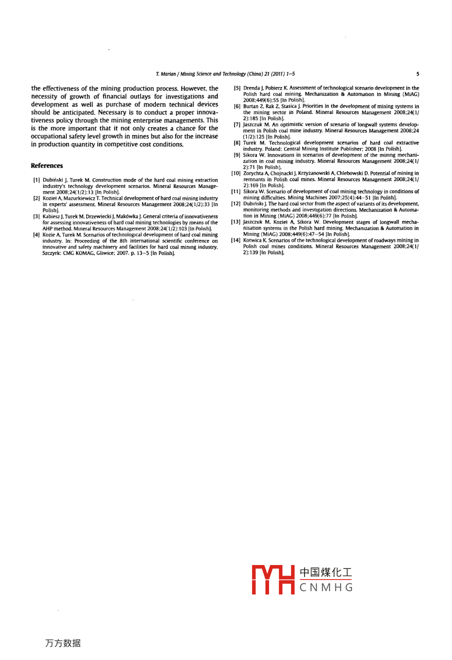 Mining Science and Technology(China)21(2011)1-5Contents lists available at Science DirectMining Science and Technology(China)ELSEVIERjournalhomepagewww.elsevier.com/locate/mstcDirections of changes of hard coal output technologies in PolandTurek marianCentral Mining institute, 40-166 Katowice, PolandARTICLEINFOABSTRACTThe author presents the results being the effect of the analysis of innovative rate of indivcepted 3 August 2009project: scenarios of technological development of hard coal extractive industry". Afteopening up, development and extraction technologies that are applied in polish hard coalheir classification with regard to innovation degree the author desomanner. He brings attention to the most effective systems for hard coal deposits'opening up, devel-opment and their extraction, including the extraction of the residual coal. The attention is also paid to thesafety level of the applied technologies.Copyright e 2011, China University of Mining Technology All rights reserved.1. IntroductionThe technologies counted among the time period until 2015constitute the optimistic variant of development of the hard coalThe presented analysis of innovativeness of individual technol- mining sector. The technologies implemented with lower intensity.ogies of the hard coal production process was carried out in the ie until 2020 constitute the variant of sustainable development offramework of the project entitled "Scenarios of technological hard coal mining Technologies counted among the time perioddevelopment of hard coal extractive industry"[1. In the framework after 2020 constitute the pessimistic vision of the mining sectorof conducted investigations the division into the following tech- development 5).nological areas was performed(Fig. 1)(21Among the variants of optimistic scenarios of development ofFor individual technological areas the corresponding with them underground deposit extraction technology were counted (Table 1)hnologies were presented according to their innovativeness 16.7)degree with the division into disseminated and development techAmong variants of sustainable and pessimistic scenarios ofnologies. The following innovativeness criteria were adopted [3]development of underground deposit extraction technology werecounted (Table 2)181)2B-Disseminated technologies, medium innovativeness level.2)2C-Disserminated technologies, high innovativeness level3)1A-Development technologies, low innovativeness level.4)1B-Development technologies, medium innovativeness leveL, 2. Extraction technologies5)1C-Development technologies, high innovativeness level.The optimistic variants of extraction technologies constitute theFor each technology group the following time periods of most effective systems for hard coal deposits and extraction ofimplementation of distinguished innovative technologies were remainders.gled out (41The basic systems of hard coal deposit extraction in Poland willemain longwall systems of different forms, with the distinct1)until 2010.2)until 2015The main directions of longwall system development will aim at3)until 2020 andthe improvement of system effectiveness and safety level through4)after 2020.1)improvement of reliability of individual equipment elements,·TeL:+4832258613mturekegig.eu.中國煤化工 lon of self-slIdeable dam1674-5264/5- see front matter Copyright e 2011, China University of Mining Technology.CNMHGdoi:101o16/mstc200908001T, Marian/ Mining Science and Technology( China)21(2011)1-5TECHNOLOGIESIn the sustainable variant of development of extraction tech-nologies possible to implement until 2020 the following technol-1)Fundamental directions of development of short-frend systems will to a high extent be in line with theassumed for longwall systems, however, there wiadditional fields of activities such as [111a)development of a getting system using one -organ cutter-loaders with increased capacity.b)determination of possibilities, determinants and technolo.es to conduct operations in conditions of a shoi0-30 m)"blind working2)The thick seam deposits of the saddle group in areas that do notequire surface protection should become in the nearest future專|53Ehe terrain for operational testsly the openSignificant is the fact that these systems were and are effec-d for coal seam extraction in the etan orChinese mining industry, often also in difficult mining andFig. 1. Technological areas.geological conditions.Basing on European experience there exist the possibility to3)development of the plough technique for the needs of extrac. start in the polish mining industry operational tests to use thetion of seams with thickness below 1.5 mlongwall sublevel caving system and open end-sublevel caving4)modification of driving and improvement of maintaining of system. Detailed analyses will require some elements of thisgate roads including crossings with the longwalltechnology mainly connected with occupational safety and mined5)improvement of thick coal size yield.coal contamination. To them belong among others[1216)better adaptation to natural hazard conditions, especially 1) assessment of impact of this system on the fire and rockburst7)use of remote steering systems and automatics.hazard increase and indispensable prevention scope relating tothese hazardsRemainder deposits, located within pillars and seam parts with 2)modification of construction of powered(sublevel cavingirregular forms will gradually force the use of short-front systemsrelated) support with respect to geological and mining condiespecially open end systems (pillar-open end)and roadway 3) development of an effective system of mined coal trans-portation from the longwall using one or two chain conveyors1)possibility to use the known and commonly applied mechabasing on the analysis of deposit use coefficient and mined coalnisation of mining operations,2)considerable elasticity from the aspect of adaptation tochangeable mining and geological conditions of coal seamIn spite of high innovativeness, am