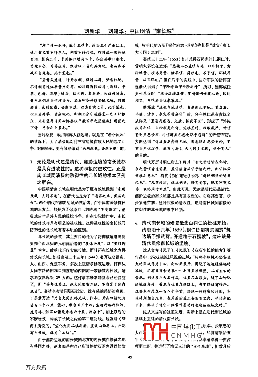 第2卷第1期銅仁學(xué)院學(xué)報(bào)2008年1月Journal of Tongren University中國(guó)明清“南長(zhǎng)城”劉新華1劉建華2(1.銅仁學(xué)院黔東文化研究中心,貴州銅仁5543002.銅仁地區(qū)民族中學(xué),貴州銅仁554300摘要:“邊墻”是明清兩代對(duì)長(zhǎng)堿的普遍稱(chēng)謂。明代修筑南長(zhǎng)城的背景,是在“動(dòng)分彼此″的情況下,為了消極地對(duì)付湘黔川三省邊境苗族人民的起義斗爭(zhēng),封國(guó)疆圍,更有效地做到“來(lái)則致戳,去則不追”的。清代南長(zhǎng)城的修復(fù)最先由銅仁的松桃開(kāi)始。乾嘉苗民起義后,統(tǒng)治者在湘黔邊境大修邊墻、廣設(shè)碉卡,企圖“遢苗之來(lái),截苗之歸”。南長(zhǎng)城雖然是封建統(tǒng)治者隔絕漢族人民和茴族人民聯(lián)系的一個(gè)硬件設(shè)施,同時(shí)也是漢族人民和苗族人民源遠(yuǎn)流長(zhǎng)的民族融洽史的一個(gè)歷史鐵證。關(guān)鍵詞:明清;南長(zhǎng)城圖分類(lèi)號(hào):K297.73文獻(xiàn)標(biāo)識(shí)碼:A文章編號(hào):1673-9639(2008)01-004307湮沒(méi)在荒阡野陌中的中國(guó)南長(zhǎng)城,已經(jīng)在風(fēng)雨中經(jīng)中國(guó)內(nèi)陸文明的巨大凝聚力和說(shuō)不盡道不明的奧歷了400余年的滄桑?!躲~仁府志》記載,明朝萬(wàn)歷四十秘,必須首先從歷史的角度去審視和解讀。我們?nèi)绻麅H三年(1615),湖北分守道參政(從三品)蔡復(fù)一“以營(yíng)僅從有限的記載或一些人片言只語(yǔ)去看中國(guó)的南長(zhǎng)城哨羅布,苗路崎嶇,難以遢窺覷,請(qǐng)發(fā)帑金四萬(wàn)有奇,那么,我們也不可能看到歷史,更不可能看到中華民族筑沿邊土墻,上至銅仁,下至保靖汛地,迤山亙水,凡璀璨的古典文化三百余里從浩如煙海的歷史卷帙中,我們不難看出,“邊墻”,我們?cè)诰幾躲~仁市志·軍事篇·設(shè)施》時(shí),同古其實(shí)就是明清兩代對(duì)長(zhǎng)城的普遍稱(chēng)謂。明代是繼秦始皇代的史志同行一樣,心平氣和地記下了古代在中國(guó)南疆后中國(guó)修筑長(zhǎng)城次數(shù)最多的朝代。明初,朱元璋雖然取修筑的這一段長(zhǎng)城;美國(guó)學(xué)者金介甫上世紀(jì)80年代初在得了天下,但“元人北歸,累謀興復(fù)”,特別是“正統(tǒng)以鳳凰之子·沈從文傳》一書(shū)中也是很平靜地指出,明后,敵患日多,故終明之世,邊防甚重”。因此,從洪武代修筑的這一段城墻,是“漢人在一六一五年試圍結(jié)束年間到萬(wàn)歷年間,明朝廷前后僅大規(guī)模修筑長(zhǎng)城就達(dá)十邊疆沖突,效仿北方長(zhǎng)城的辦法,建起一道高墻,把苗八次之多。朱元璋的孫子、明建文帝朱允炆在給總兵郭民全趕到西邊去住”?,F(xiàn)在的松桃苗族自治縣正大鄉(xiāng)有一亨的敕書(shū)中還一再?gòu)?qiáng)調(diào):“各處煙墩,務(wù)增筑高厚,上貯個(gè)行政村,數(shù)百年來(lái)一直用“邊墻”命名;這里的苗族五月糧及柴薪藥弩,墩旁開(kāi)井,井外國(guó)墻與墩平,外望人民,世世代代也一直用一顆平常心,反反復(fù)復(fù)使用著?!本幮蕖睹魇贰返娜嗽谟涗涍@段話(huà)時(shí),也忍不住加邊墻”這個(gè)稱(chēng)謂。上一句評(píng)價(jià)說(shuō):“重門(mén)御暴之意,常凜凜也。”然而國(guó)家文物局古建筑專(zhuān)家組組長(zhǎng)、中國(guó)長(zhǎng)城學(xué)會(huì)現(xiàn)今的北長(zhǎng)城,大多是明代長(zhǎng)城的遺址。但是,無(wú)副會(huì)長(zhǎng)羅哲文教授在登上湮沒(méi)在夕陽(yáng)蓑草中的碉樓殘墻論是皇家修纂的《明史》,還是地方編纂的志書(shū),除了偶時(shí),卻出語(yǔ)石破天驚:這是中國(guó)南方的長(zhǎng)城,我尋找了爾把長(zhǎng)城稱(chēng)為“邊城”、“邊垣”外,基本上都是把長(zhǎng)城五十年,終于在這里找到了!稱(chēng)為“邊墻”的。如《明史·兵三·邊防》記載:“成化消息傳開(kāi)后,人們才在驚喜中振奮起來(lái):喲嗬!我七年(1471),延綏巡撫都御史余子俊大筑邊城”,“依山們這里也有長(zhǎng)城!形,隨地勢(shì),或蒯蒯,或壘筑,或挑塹,綿引相接,以成邊墻”,“由黃甫川西至定邊營(yíng)千二百里,墩臺(tái)相望"。1.“邊墻”就是長(zhǎng)城?!斑厜Α钡谋疽饩褪沁呹P(guān)明嘉靖年間,兵部侍郎兼右僉都御史翁萬(wàn)達(dá),“疏請(qǐng)修連貫的城墻是明清兩代對(duì)長(zhǎng)城的普遍稱(chēng)謂。筑邊墻”“請(qǐng)都銀60萬(wàn)兩修大同西路、宣府東路邊墻,中國(guó)煤化工收稿日期:200705-15作者簡(jiǎn)介:、劉新華(1952),男,湖北武漢市人,《銅仁市志》副主端,《黔小,rCNMHG銅仁地城歷史丈化研究。劉建華(1955-),男,湖北武漢市人,嫻仁地區(qū)民族中學(xué)高媛教師,主要從事語(yǔ)文教學(xué),業(yè)余從事文學(xué)創(chuàng)作和地方志躺寡,筆名耕石08年第1期銅仁學(xué)院學(xué)報(bào)凡八百里"。鞏固了一段時(shí)期的“十三哨”)麻陽(yáng)參將孫賢還率先在明代抗倭名將戚繼光(其弟戚繼美,萬(wàn)歷十一年任湘黔邊境修筑了邊墻。三十二年(1553),明朝廷又將相駐銅仁的貴州總兵)一生主要做了“南平倭寇、北國(guó)長(zhǎng)當(dāng)于省軍區(qū)司令員職務(wù)的鎮(zhèn)守貴州兼提督平(越)、清城”兩件事,并且在明代修筑長(zhǎng)城中最具創(chuàng)造性。他在(浪)等處地方總兵官加提督麻陽(yáng)等處職銜,移駐銅仁隆慶五年(1571)修筑的長(zhǎng)城,“跨嬙為臺(tái),
