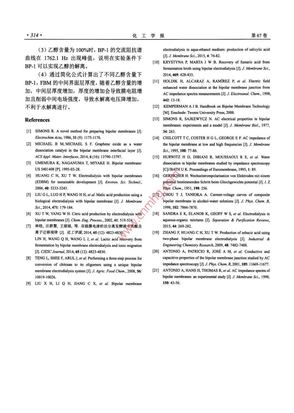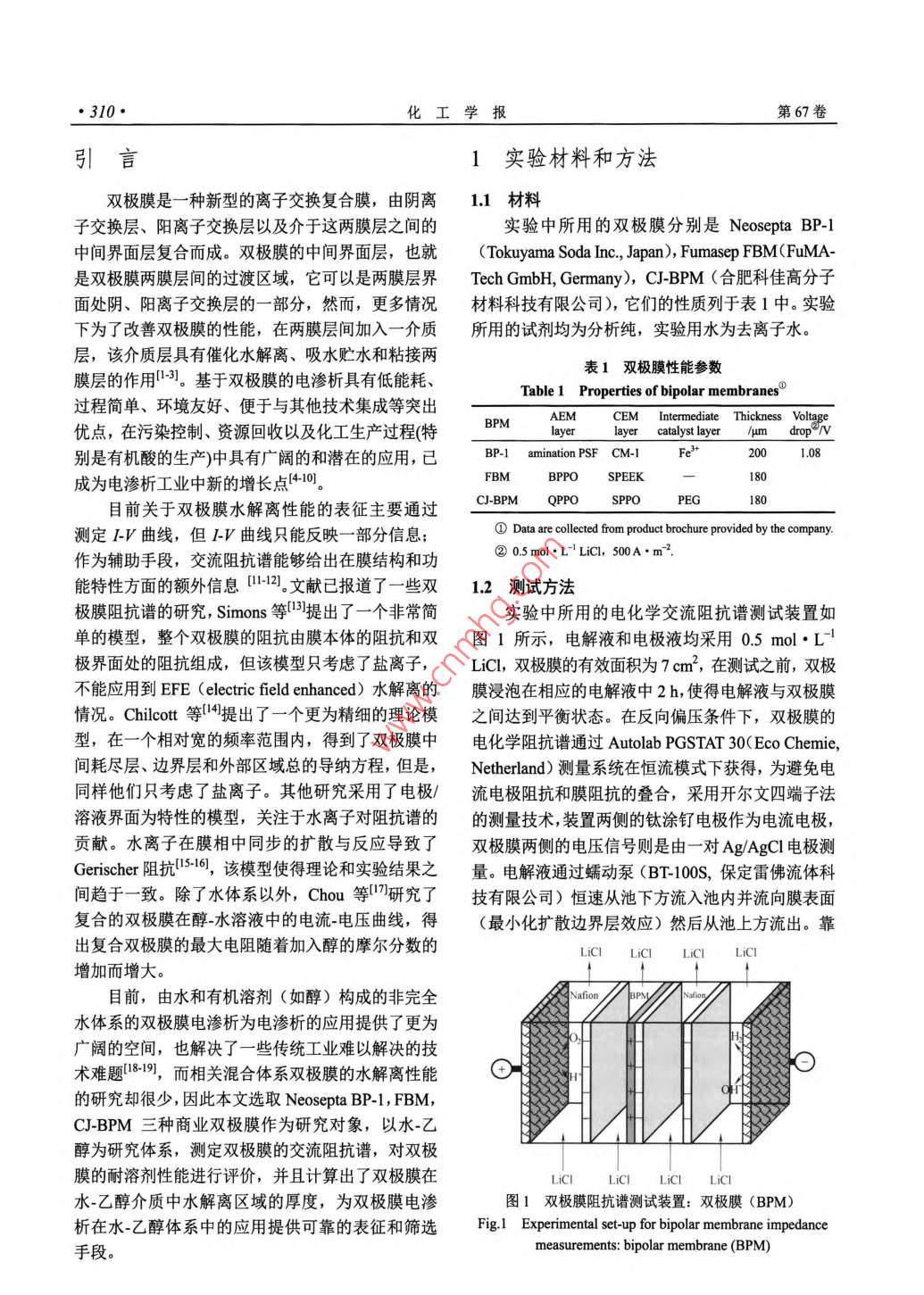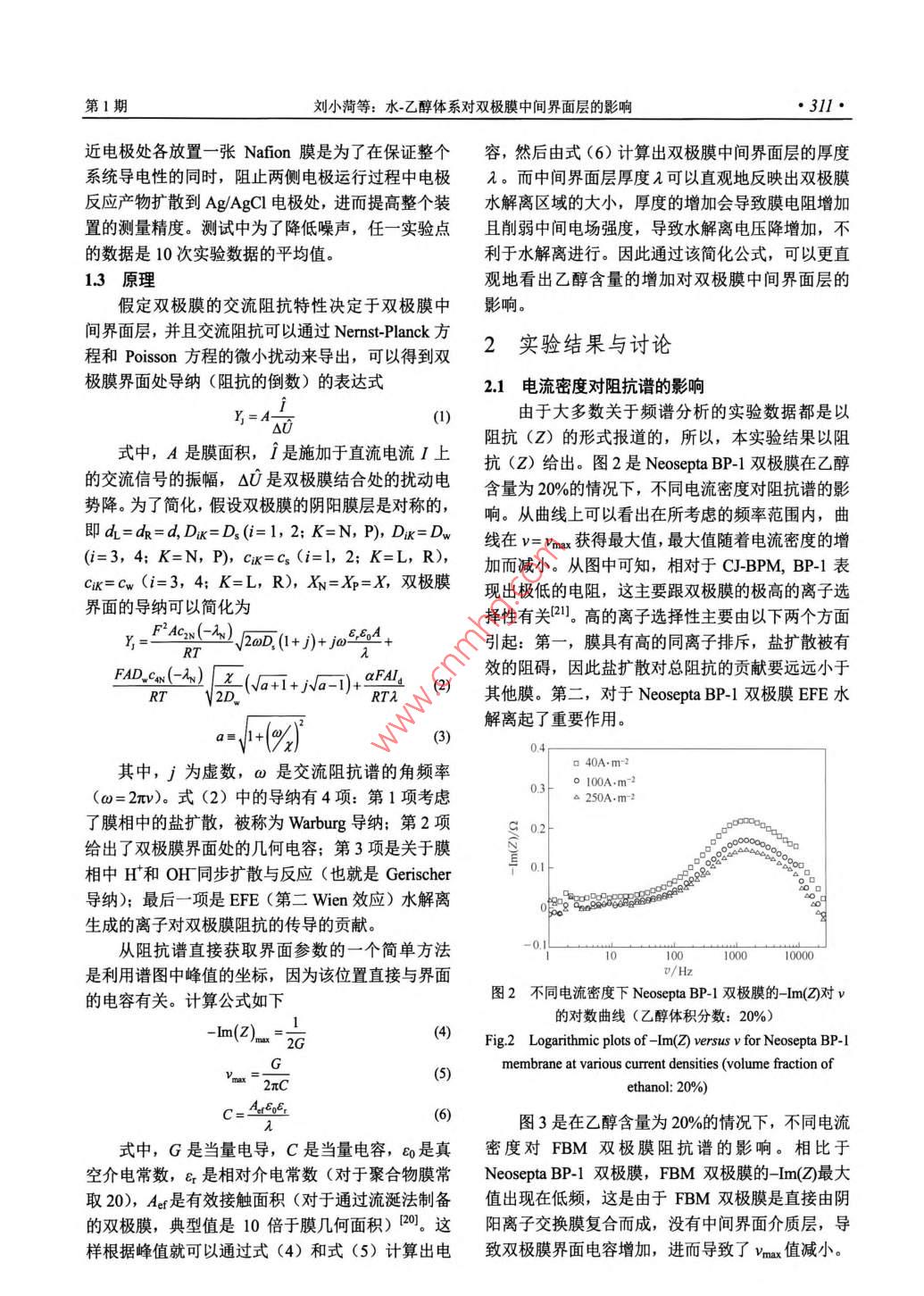第67卷第1期化工學(xué)報(bào)VoL. 67 No. 12016年1月CIESC Journal2016研究論文水-乙醇體系對(duì)雙極膜中間界面層的影響劉小菏,李秋花,葛亮,徐銅文(中國(guó)科學(xué)技術(shù)大學(xué)化學(xué)與材料科學(xué)學(xué)院,安徽合肥230026)摘要:選取 Neosepta BP1, Fumasep FBM, CJ-BPM三種商業(yè)標(biāo)準(zhǔn)雙極膜作為研究對(duì)象,以水乙醇為研究體系,通過(guò)改變不同乙醇含量,測(cè)定雙極膜的交流阻抗譜,并且對(duì)雙極膜的耐溶劑性能進(jìn)行評(píng)價(jià),結(jié)果表明BP-1具有良好的耐溶劑性,FBM,CJ-BPM耐溶劑性相對(duì)較弱;水解離現(xiàn)象發(fā)生在LiCl水-乙醇混合溶液中,隨著乙醇含量的増加,雙極膜的阻值增加,而水解離程度降低。這種現(xiàn)象可以解釋為醇解離能力要遠(yuǎn)遠(yuǎn)小于水解離能力,因此乙醇的存在使得中間界面層區(qū)域的水濃度降低,進(jìn)而降低了水解離程度:通過(guò)簡(jiǎn)化算法計(jì)算出了不同乙醇含量下,BP-1,FBM的中間界面層厚度,更直觀地看出乙醇對(duì)雙極膜水解離性能的影響關(guān)鍵詞:水-乙醇體系;膜;離子交換;電化學(xué);交流阻抗譜DoI:10.1949issn.0438-1157.20151004中圖分類號(hào):TQ028.8文獻(xiàn)標(biāo)志碼:A文章編號(hào):0438-1157(2016)01-030906Influence of aqua-ethanol medium on properties of intermediate layer ofa bipolar membraneLIU Xiaohe, LI Qiuhua, GE Liang, XU Tongwen(School of Chemistry and Materials Science, University of Science and Technology of China, Hefei 230026, Anhui, China)Abstract: A bipolar membrane(BPM) was composed of a cation and an anion ion-exchange layer joined togetherin series. The water dissociation in BPM was then considered as an electric field-enhanced(efe) phenomenonand its magnitude depended critically on the structure and composition of the bipolar intermediate layer. Bychanging the different content of ethanol, three commercial bipolar membranes Neosepta BP-l, Fumasep FBMand CJ-BPM were tested by AC impedance spectra and their bipolar membrane solvent resistance were evaluatedsimultaneously. It was confirmed that BP-1 had good solvent resistance and FBM and CJ-BPM solvent resistanceswere relatively weak. The experimental results showed that the water dissociation phenomenon occurred in theLiCi water-ethanol mixed solutions. and the local effective value of the BPm resistance increased with an increasein the content of ethanol, while the water dissociation became less obvious. This phenomenon could be explaineddue to the fact that the dissociative ability of alcohol was weaker than that of water. Thus, the existence of ethanoldecreased the concentration of water in the intermediate layer of a bipolar membrane and caused the decrease inthe water dissociation effect. By simplifying the algorithm to calculate the intermediate layer thickness of the BP-1and FBM membranes it was more intuitive to know the influence of ethanol content on the water dissociationKey words: water-ethanol system; membrane; ion exchange; electrochemistry; AC impedance spectra2015-0629收到初稿,2015-08-27收到修改稿Received date: 2015-06-29聯(lián)系人:徐銅文。第一作者:劉小菏(1989—),女,碩士Correspondingauthor:Prof.XUTongwen,twxu@ustc.edu.cn基金項(xiàng)目:國(guó)家自然科學(xué)基金項(xiàng)目(21206155)Foundation item: supported by the National Natural Science Foundationof china(21206155)3l0·化工學(xué)報(bào)第67卷1實(shí)驗(yàn)材料和方法雙極膜是一種新型的離子交換復(fù)合膜,由陰離11材料子交換層、陽(yáng)離子交換層以及介于這兩膜層之間的實(shí)驗(yàn)中所用的雙極膜分別是 Neosepta BP1中間界面層復(fù)合而成。雙極膜的中間界面層,也就( Tokuyama Soda Inc, Japan), Fumasep FBM(FuMA是雙極膜兩膜層間的過(guò)渡區(qū)域,它可以是兩膜層界 Tech gmbH, Germany), CJ-BPM(合肥科佳高分子面處陰、陽(yáng)離子交換層的一部分,然而,更多情況材料科技有限公司),它們的性質(zhì)列于表1中。實(shí)驗(yàn)下為了改善雙極膜的性能,在兩膜層間加入一介質(zhì)所用的試劑均為分析純,實(shí)驗(yàn)用水為去離子水層,該介質(zhì)層具有催化水解離、吸水貯水和粘接兩膜層的作用?;陔p極膜的電滲析具有低能耗、表1雙極膜性能參數(shù)Table 1 Properties of bipolar membranes過(guò)程簡(jiǎn)單、環(huán)境友好、便于與其他技術(shù)集成等突出優(yōu)點(diǎn),在污染控制、資源回收以及化工生產(chǎn)過(guò)程特BPMAEMCEM Intermediate Thickness別是有機(jī)酸的生產(chǎn))中具有廣闊的和潛在的應(yīng)用,已BP-1 amination PSF CM-IFe1.08成為電滲析工業(yè)中新的增長(zhǎng)點(diǎn)40SPEEK目前關(guān)于雙極膜水解離性能的表征主要通過(guò)CJ-BPMSPPOPEG測(cè)定IV曲線,但ⅠV曲線只能反映一部分信息;Data are collected from product brochure provided by the company作為輔助手段,交流阻抗譜能夠給出在膜結(jié)構(gòu)和功②0.5mol· L LiCI,500A·m2能特性方面的額外信息12.文獻(xiàn)已報(bào)道了一些雙1.2測(cè)試方法極膜阻抗譜的研究, Simons等提出了一個(gè)非常簡(jiǎn)實(shí)驗(yàn)中所用的電化學(xué)交流阻抗譜測(cè)試裝置如單的模型,整個(gè)雙極膜的阻抗由膜本體的阻抗和雙圖1所示,電解液和電極液均采用0.5mol·L極界面處的阻抗組成,但該模型只考慮了鹽離子,LiC,雙極膜的有效面積為7cm2,在測(cè)試之前,雙極不能應(yīng)用到EFE( electric field enhanced)水解離的膜浸泡在相應(yīng)的電解液中2h,使得電解液與雙極膜情況。 Chilcott等“提出了一個(gè)更為精細(xì)的理論模間達(dá)到平衡狀態(tài)。在反向
