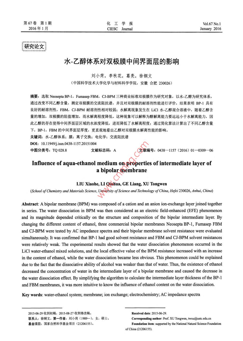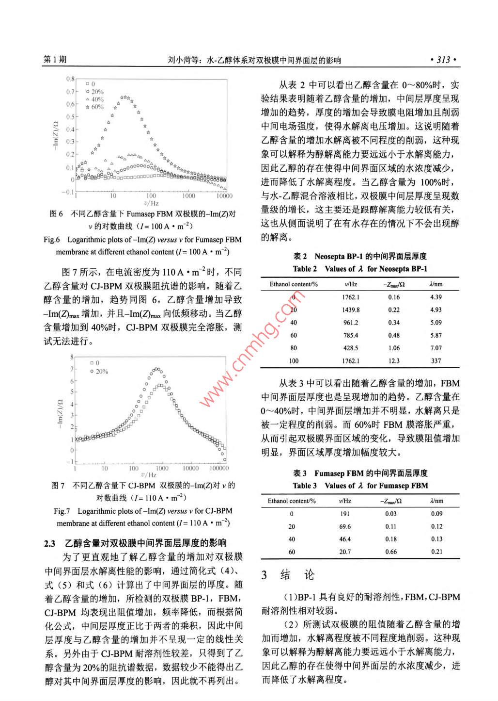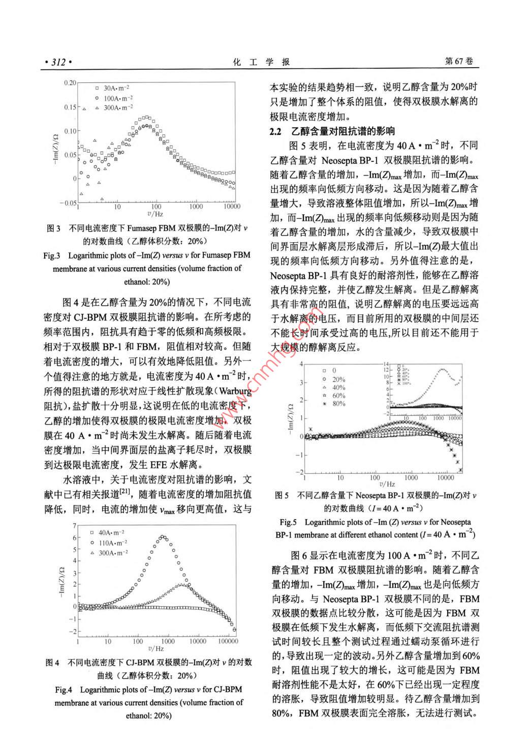 第67卷第1期化工學(xué)報(bào)VoL. 67 No. 12016年1月CIESC Journal2016研究論文水-乙醇體系對(duì)雙極膜中間界面層的影響劉小菏,李秋花,葛亮,徐銅文(中國(guó)科學(xué)技術(shù)大學(xué)化學(xué)與材料科學(xué)學(xué)院,安徽合肥230026)摘要:選取 Neosepta BP1, Fumasep FBM, CJ-BPM三種商業(yè)標(biāo)準(zhǔn)雙極膜作為研究對(duì)象,以水乙醇為研究體系,通過(guò)改變不同乙醇含量,測(cè)定雙極膜的交流阻抗譜,并且對(duì)雙極膜的耐溶劑性能進(jìn)行評(píng)價(jià),結(jié)果表明BP-1具有良好的耐溶劑性,FBM,CJ-BPM耐溶劑性相對(duì)較弱;水解離現(xiàn)象發(fā)生在LiCl水-乙醇混合溶液中,隨著乙醇含量的増加,雙極膜的阻值增加,而水解離程度降低。這種現(xiàn)象可以解釋為醇解離能力要遠(yuǎn)遠(yuǎn)小于水解離能力,因此乙醇的存在使得中間界面層區(qū)域的水濃度降低,進(jìn)而降低了水解離程度:通過(guò)簡(jiǎn)化算法計(jì)算出了不同乙醇含量下,BP-1,FBM的中間界面層厚度,更直觀地看出乙醇對(duì)雙極膜水解離性能的影響關(guān)鍵詞:水-乙醇體系;膜;離子交換;電化學(xué);交流阻抗譜DoI:10.1949issn.0438-1157.20151004中圖分類號(hào):TQ028.8文獻(xiàn)標(biāo)志碼:A文章編號(hào):0438-1157(2016)01-030906Influence of aqua-ethanol medium on properties of intermediate layer ofa bipolar membraneLIU Xiaohe, LI Qiuhua, GE Liang, XU Tongwen(School of Chemistry and Materials Science, University of Science and Technology of China, Hefei 230026, Anhui, China)Abstract: A bipolar membrane(BPM) was composed of a cation and an anion ion-exchange layer joined togetherin series. The water dissociation in BPM was then considered as an electric field-enhanced(efe) phenomenonand its magnitude depended critically on the structure and composition of the bipolar intermediate layer. Bychanging the different content of ethanol, three commercial bipolar membranes Neosepta BP-l, Fumasep FBMand CJ-BPM were tested by AC impedance spectra and their bipolar membrane solvent resistance were evaluatedsimultaneously. It was confirmed that BP-1 had good solvent resistance and FBM and CJ-BPM solvent resistanceswere relatively weak. The experimental results showed that the water dissociation phenomenon occurred in theLiCi water-ethanol mixed solutions. and the local effective value of the BPm resistance increased with an increasein the content of ethanol, while the water dissociation became less obvious. This phenomenon could be explaineddue to the fact that the dissociative ability of alcohol was weaker than that of water. Thus, the existence of ethanoldecreased the concentration of water in the intermediate layer of a bipolar membrane and caused the decrease inthe water dissociation effect. By simplifying the algorithm to calculate the intermediate layer thickness of the BP-1and FBM membranes it was more intuitive to know the influence of ethanol content on the water dissociationKey words: water-ethanol system; membrane; ion exchange; electrochemistry; AC impedance spectra2015-0629收到初稿,2015-08-27收到修改稿Received date: 2015-06-29聯(lián)系人:徐銅文。第一作者:劉小菏(1989—),女,碩士Correspondingauthor:Prof.XUTongwen,twxu@ustc.edu.cn基金項(xiàng)目:國(guó)家自然科學(xué)基金項(xiàng)目(21206155)Foundation item: supported by the National Natural Science Foundationof china(21206155)3l0·化工學(xué)報(bào)第67卷1實(shí)驗(yàn)材料和方法雙極膜是一種新型的離子交換復(fù)合膜,由陰離11材料子交換層、陽(yáng)離子交換層以及介于這兩膜層之間的實(shí)驗(yàn)中所用的雙極膜分別是 Neosepta BP1中間界面層復(fù)合而成。雙極膜的中間界面層,也就( Tokuyama Soda Inc, Japan), Fumasep FBM(FuMA是雙極膜兩膜層間的過(guò)渡區(qū)域,它可以是兩膜層界 Tech gmbH, Germany), CJ-BPM(合肥科佳高分子面處陰、陽(yáng)離子交換層的一部分,然而,更多情況材料科技有限公司),它們的性質(zhì)列于表1中。實(shí)驗(yàn)下為了改善雙極膜的性能,在兩膜層間加入一介質(zhì)所用的試劑均為分析純,實(shí)驗(yàn)用水為去離子水層,該介質(zhì)層具有催化水解離、吸水貯水和粘接兩膜層的作用?;陔p極膜的電滲析具有低能耗、表1雙極膜性能參數(shù)Table 1 Properties of bipolar membranes過(guò)程簡(jiǎn)單、環(huán)境友好、便于與其他技術(shù)集成等突出優(yōu)點(diǎn),在污染控制、資源回收以及化工生產(chǎn)過(guò)程特BPMAEMCEM Intermediate Thickness別是有機(jī)酸的生產(chǎn))中具有廣闊的和潛在的應(yīng)用,已BP-1 amination PSF CM-IFe1.08成為電滲析工業(yè)中新的增長(zhǎng)點(diǎn)40SPEEK目前關(guān)于雙極膜水解離性能的表征主要通過(guò)CJ-BPMSPPOPEG測(cè)定IV曲線,但ⅠV曲線只能反映一部分信息;Data are collected from product brochure provided by the company作為輔助手段,交流阻抗譜能夠給出在膜結(jié)構(gòu)和功②0.5mol· L LiCI,500A·m2能特性方面的額外信息12.文獻(xiàn)已報(bào)道了一些雙1.2測(cè)試方法極膜阻抗譜的研究, Simons等提出了一個(gè)非常簡(jiǎn)實(shí)驗(yàn)中所用的電化學(xué)交流阻抗譜測(cè)試裝置如單的模型,整個(gè)雙極膜的阻抗由膜本體的阻抗和雙圖1所示,電解液和電極液均采用0.5mol·L極界面處的阻抗組成,但該模型只考慮了鹽離子,LiC,雙極膜的有效面積為7cm2,在測(cè)試之前,雙極不能應(yīng)用到EFE( electric field enhanced)水解離的膜浸泡在相應(yīng)的電解液中2h,使得電解液與雙極膜情況。 Chilcott等“提出了一個(gè)更為精細(xì)的理論模間達(dá)到平衡狀態(tài)。在反向