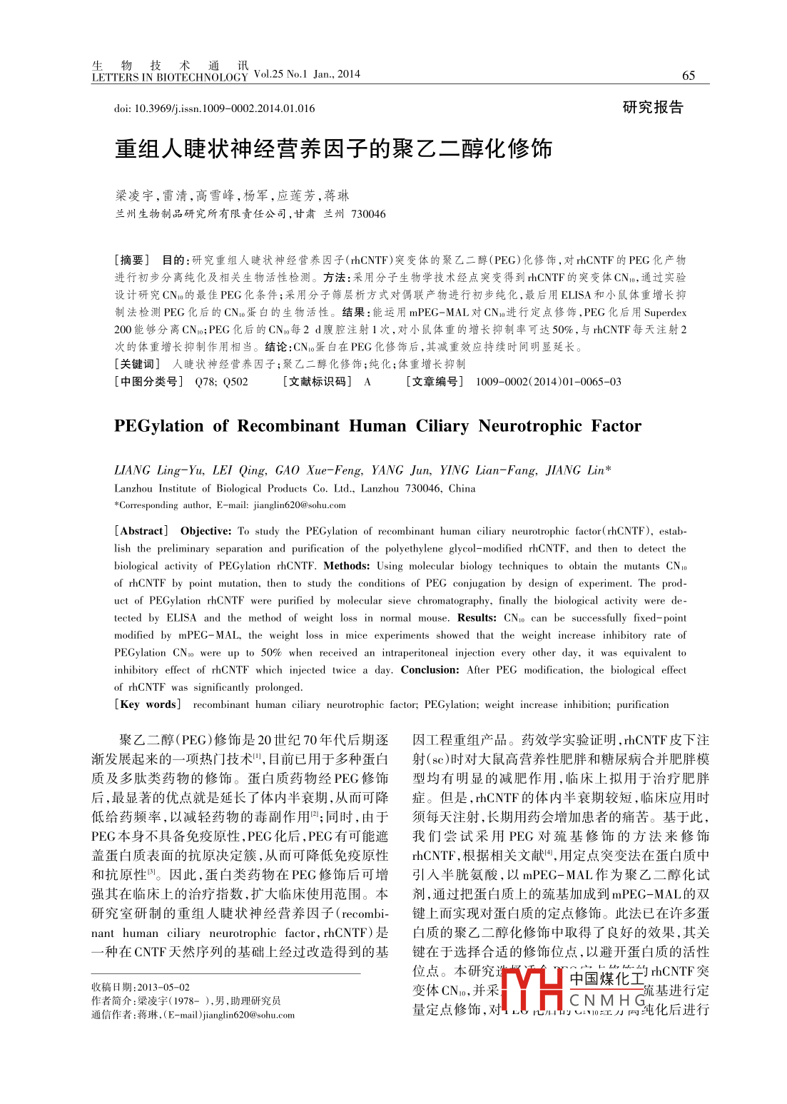 ETTERS IN BIOTECHNOLOCY Vol.25 No.1 Jan., 201465doi: 10.3969/jissn. 10090002.2014.01.016研究報(bào)告重組人睫狀神經(jīng)營(yíng)養(yǎng)因子的聚乙二醇化修飾梁凌宇,雷清,高雪峰,楊軍,應(yīng)蓮芳,蔣琳蘭州生物制品研究所有限責(zé)任公司,甘肅蘭州730046[摘要] 目的:研究重組人睫狀神經(jīng)營(yíng)養(yǎng)因子(rhCNTF)突變體的聚乙二醇(PEG)化修飾,對(duì)rhCNTF的PEG化產(chǎn)物進(jìn)行初步分離純化及相關(guān)生物活性檢測(cè)。方法:采用分子生物學(xué)技術(shù)經(jīng)點(diǎn)突變得到rhCNTF的突變體CNo,通過實(shí)驗(yàn)設(shè)計(jì)研究CNo的最佳PEG化條件;采用分子篩層析方式對(duì)偶聯(lián)產(chǎn)物進(jìn)行初步純化,最后用ELISA和小鼠體重增長(zhǎng)抑制法檢測(cè)PEG化后的CNo蛋白的生物活性。結(jié)果:能運(yùn)用mPEG-MAL對(duì)CNu進(jìn)行定點(diǎn)修飾, PEG化后用Superdex200能夠分離CNo;PEG化后的CNo每2 d腹腔注射1次,對(duì)小鼠體重的增長(zhǎng)抑制率可達(dá)50%,與rhCNTF每天注射2次的體重增長(zhǎng)抑制作用相當(dāng)。結(jié)論:CNo蛋白在PEG化修飾后,其減重效應(yīng)持續(xù)時(shí)間明顯延長(zhǎng)。[關(guān)鍵詞]人睫狀神經(jīng)營(yíng)養(yǎng)因子;聚乙二醇化修 飾;純化;體重增長(zhǎng)抑制[中圖分類號(hào)] Q78; Q502[文獻(xiàn)標(biāo)識(shí)碼] A[文章編號(hào)] 1009-0002( 2014)01-0065-03PEGylation of Recombinant Human Ciliary Neurotrophic FactorLIANG Ling-Yu, LEI Qing, GAO Xue-Feng, YANG Jun, YING Lian-Fang, JIANG Lin*Lanzhou Institute of Biological Products Co. Ltd, Lanzhou 730046, China*Corresponding author, E-mail: jianglin620@ sohu.com[Abstract] Objective: To study the PEGylation of recombinant human ciliary neurotrophic factor( rhCNTF),estab-lish the preliminary separation and purification of the polyethylene glycol- modified rhCNTF, and then to detect thebiological activity of PEGylation rhCNTF. Methods: Using molecular biology techniques to obtain the mutants CNoof rhCNTF by point mutation, then to study the conditions of PEG conjugation by design of experiment. The prod-uct of PEGylation rhCNTF were purified by molecular sieve chromatography, finally the biological activity were de-tected by ELISA and the method of weight loss in normal mouse. Results: CNo can be successfully fixed- pointmodified by mPEG- MAL, the weight loss in mice experiments showed that the weight inerease inhibitory rate ofPEGylation CNo were u to 50% when received an intraperitoneal injection every other day, it was equivalent toinhibitory efct of rhCNTF which injected twice a day. Conclusion: Afer PEG modification, the biological effectof rhCNTF was significantly prolonged.[Key words] recrecombinant human ciliary neurotrophic factor; PEGylation; weight increase inhibition; purification聚乙二醇(PEG)修飾是20世紀(jì)70年代后期逐因工程重組產(chǎn)品。藥效學(xué)實(shí)驗(yàn)證明, rhCNTF皮下注漸發(fā)展起來的一-項(xiàng)熱門]技術(shù)",目前已用于多種蛋白射(sc)時(shí)對(duì)大鼠高營(yíng)養(yǎng)性肥胖和糖尿病合并肥胖模質(zhì)及多肽類藥物的修飾。蛋白質(zhì)藥物經(jīng)PEG修飾型均有明顯的減肥作用,臨床上擬用于治療肥胖后,最顯著的優(yōu)點(diǎn)就是延長(zhǎng)了體內(nèi)半衰期,從而可降癥。但是,rhCNTF的體內(nèi)半衰期較短,臨床應(yīng)用時(shí)低給藥頻率,以減輕藥物的毒副作用”;同時(shí),由于須每天注射,長(zhǎng)期用藥會(huì)增加患者的痛苦。基于此,PEG本身不具備免疫原性,PEG化后,PEG有可能遮我們嘗試采用PEG對(duì)巰基修飾的方法來修飾蓋蛋白質(zhì)表面的抗原決定簇,從而可降低免疫原性rhCNTF,根據(jù)相關(guān)文獻(xiàn)4,用定點(diǎn)突變法在蛋白質(zhì)中和抗原性”。因此,蛋白類藥物在PEG修飾后可增引人半胱氨酸,以mPEG-MAL作為聚乙二醇化試強(qiáng)其在臨床上的治療指數(shù),擴(kuò)大臨床使用范圍。本劑,通過把蛋白質(zhì)上的巰基加成到mPEG-MAL的雙研究室研制的重組人睫狀神經(jīng)營(yíng)養(yǎng)因子(recombi-鍵上而實(shí)現(xiàn)對(duì)蛋白質(zhì)的定點(diǎn)修飾。此法已在許多蛋nant human ciliary neurotrophic factor , rhCNTF)是白質(zhì)的聚乙二醇化修飾中取得了良好的效果,其關(guān)一種在CNTF天然序列的基礎(chǔ)上經(jīng)過改造得到的基鍵在于選擇合適的修飾位點(diǎn),以避開蛋白質(zhì)的活性位點(diǎn)。本研究迷氣嚴(yán)中國(guó)煤化工J rhCNTF突作者簡(jiǎn)介:梁凌宇(1978- ), 男,助理研究員收稿日期:2013-05-02變體CNo,并采THCNMH 流基進(jìn)行定通信作者:蔣琳, ( E-mail)jiangin620@sohu.com量定點(diǎn)修飾,對(duì)5U10江力網(wǎng)純化后進(jìn)行56LETTERS IN BIOTECHNOLOGY Vol.25 No.1 Jan, 2014相關(guān)生物活性檢測(cè),以得到符合預(yù)期效用的rthCNTF1.5 CN:o與mPEG-MAL的結(jié)合及結(jié)合蛋白的純化長(zhǎng)效化蛋白。在8C條件下將CNo蛋白透析至PB緩沖液(50mmol/L, pH6.8)中進(jìn)行結(jié)合實(shí)驗(yàn),選擇CNi的初始濃1材料與方法度為1 mg/mL, 物料比為1:1,反應(yīng)24 h后采用10kD超濾膜對(duì)反應(yīng)混合液濃縮至1/4,取2 mL濃縮液上1.1 材料樣Superdex 200( 16/60)柱,280 nm波長(zhǎng)進(jìn)行監(jiān)測(cè),昆明鼠由本公司實(shí)驗(yàn)動(dòng)物室提供;大腸桿菌收集第一峰,分別用HPLC和SDS-PAGE檢測(cè)PEGBL21(DE3)、含rhCNTF基因(558 bp) 的重組質(zhì)?;疌Nw結(jié)合蛋白的純度。pET/rhCNTF由本室保存;Taq酶.T, DNA連接酶及1.6結(jié)合蛋白的活性檢測(cè)限制性內(nèi)切酶Nde I、Aur II均購(gòu)自T