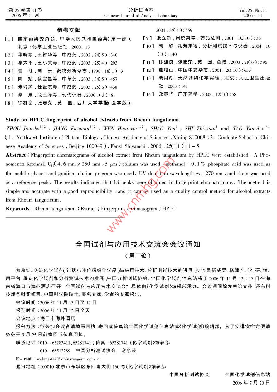 第25卷第11期分析試驗室25 No 11006年11月Chinese Journal of Analysis Laboratory唐古特大黃乙醇提取物的HPLC指紋圖譜研究周劍波2,蔣福全2,文懷秀12,邵赟,師治賢,陶燕鐸*〔Ⅰ.中國科學院西北高原生物研究所,西寧810008;2.中國科學院研究生院,北京100049)摘要闈高效液相色譜法建立唐古特大黃乙醇提取物的指紋圖譜分析方法。采用 Phenomenex Kromasil C色譜柱(4.6mm×250mm,5pm);甲醇-0.1%HPO為流動相,梯度洗脫,檢測波長為270nm,以大黃酸為參照峰。結果共有18個共有峰。此法為有效地控制唐古特大黃乙醇提取物的質量提供了依據(jù).關鍵詞唐古特大黃;提取物;HPLC;指紋圖譜中圖分類號657.7文獻標識碼A文章編號1000-07202006)1-001-05唐古特大黃( Rheum tanguticum Maxim.ex器), agilent化學工作站,中藥色譜指紋圖譜相似Ba∥f.)為蓼科植物,是大黃藥材的主要來源,其有度評價系統(tǒng)(國家藥典委員會,版本2004A),KQ效成分主要是蔥醌類衍生物如大黃酸、大黃素、-250DB型數(shù)控超聲波清洗器(昆山市超聲波儀器大黃酚、蘆薈大黃素和大黃素甲醚等,具有瀉熱有限公司),電子分析天平(梅特勒公司通腸,涼血解毒,逐淤通經(jīng)等功能,是中醫(yī)臨床1.2試劑常用中藥。有關大黃中蒽醌類衍生物的含量測定甲醇為色譜純(山東禹王化工廠),水為重蒸方法報道24較多,但以此作為質量控制,很難全水,其它試劑均為分析純。大黃酸對照品(批號面反映藥材或提取物的內在質量。而有關大黃指0757-9804)大黃素對照品(批號:110756紋圖譜的研究,文獻5也曾有報道,但多限于200110)大黃酚對照品(批號:110796-200309大黃藥材成份的指紋圖譜分析。徐雄良等曾研大黃素甲醚對照品(批號:758-9301),以上對照究了注射用大黃粉針劑的HPLC指紋圖譜,關于大品購自中國藥品生物制品檢定所。12批唐古特大黃提取物的HPC指紋圖譜還沒見報道。建立中藥黃乙醇提取物由本實驗室根據(jù)優(yōu)化工藝制得。提取物可行的質控方法將更加有助于中藥提取物2方法與結果向更廣闊的國際市場空間發(fā)展。利用色譜指紋圖2.1色譜條件譜可以較為全面地檢測其多種成分在藥材中分布Phenomenex Kromasil C1色譜柱(4.6mm×250的全貌,使藥材的內在質量情況可視。本文通m,5pm);流動相:A相為甲醇,B相為0.1%的過優(yōu)選HPLC梯度洗脫程序,建立了大黃乙醇提取H3PO緩沖液,采用梯度洗脫∶流速:1.0mI/r物的指紋圖譜質量控制技術,可作為唐古特大黃DAD檢測器,柱溫30℃。線性梯度洗脫程序見乙醇提取物及以其為主成分制劑的指紋圖譜研究表1,運行時間50min,兩次進樣之間用流動相初基礎始梯度條件平衡15min。采用二極管陣列檢測器1儀器與試劑對檢測波長進行了考察,分別記錄波長在2301.1儀器254、270、280,300mm的色譜圖。結果在270mmΔ gilet100液相色譜儀〔含在線真空脫氣機,處各色譜峰均有較好的紫外吸收,色譜信息最為低壓四元梯度泵,手動進樣器,柱溫箱,DAD檢測豐富,并且分離度好,可使主要色譜峰達到基線*收稿日期:2006-02-24修訂日期:2006-04-29基金項目:中國科學院知識創(chuàng)新工程(CXLY-2002-9項目資助第25卷第11期分析試驗室ol.25.No.112006年11月Chinese Joumal of Analysis Laboratory2006-11分離。以大黃酸色譜峰(指紋圖譜中為14號峰)為參照表1線性梯度洗脫程序峰,計算各共有峰的相對保留時間和相對峰面積。Gradient elution program結果表明,各共有峰相對保留時間和相對峰面積梯度流速B/%穩(wěn)定,RSD<3%,表明樣品溶液在16h內穩(wěn)定。t/min(ml/min)甲醇0.1%HPO4緩沖液2.4唐古特大黃提取物指紋圖譜的測定及參數(shù)分別準確吸取對照品溶液及12批供試品溶液各10μL按前述色譜條件進樣,記錄指紋圖譜(見圖1、圖2),將圖譜數(shù)據(jù)導入指紋圖譜相似性評價軟(中藥色譜指紋圖譜相似度評價系統(tǒng),2004A2.2樣品與對照品溶液的制備版)分析,通過設置參照圖譜,自動匹配(見圖3),2.2.1提取物的制備根據(jù)文獻"報道,經(jīng)過生成對照圖圖2)確定了18個共有峰,其中14優(yōu)化確定提取物的最佳提取工藝為唐古特大黃藥材粉碎成粗粉,加8倍量V75%乙醇):V(15%384.9H2SO4)=10:1回流提取2次,每次2h,合并提取液,濃縮,先用乙酸乙酯萃取,乙酸乙酯層再以50g/ L NaoH溶液萃取,取水層,加入HCl后得沉淀,干燥成浸膏粉,得提取物。2.2.2樣品溶液的制備準確稱取干燥至恒量的09.1618.3227.4836.6445.805496提取物粉末10mg,加甲醇超聲溶解,用甲醇定容圖1混合對照品色譜圖至25mL,過0.45m的微孔濾膜后作為供試品溶Fig. I Chromatogram of mixed reference substances液大黃酸;b-大黃素;c-大黃酚;d-大黃素甲醚2.2.3對照品溶液的制備分別準確稱取大黃酸、大黃素、大黃酚和大黃素甲醚對照品5mg,加384.91甲醇超聲溶解,用甲醇定容至25mL,制成0.2mg/m的混合對照品溶液,過0.45{m的微孔濾膜后作為供試品溶液。2.3方法學考察2.3.1精密度分別準確吸取同一供試品溶液0△10μL,按上述色譜條件連續(xù)進樣5次,記錄指紋09.1618.3227.4836.6445.8054.96圖譜。以大黃酸色譜峰(指紋圖譜中為14號峰)為圖2對照樣品色譜圖參照峰,計算各共有峰的相對保留時間和相對峰Fig 2 Chromatogram of a representative sample面積。結果表明,各共有峰相對保留時間和相對峰面積穩(wěn)定,RSD<3%,表明儀器精密度良好。15、16、18號峰分別為大黃酸、大黃素、大黃酚2.32重現(xiàn)性按樣品溶液制備方法處理同一樣大黃素甲醚,選取14號峰大黃酸為參照峰標示品5份,各吸取10L,按上述色譜條件分別測定為S峰)計算各共有峰