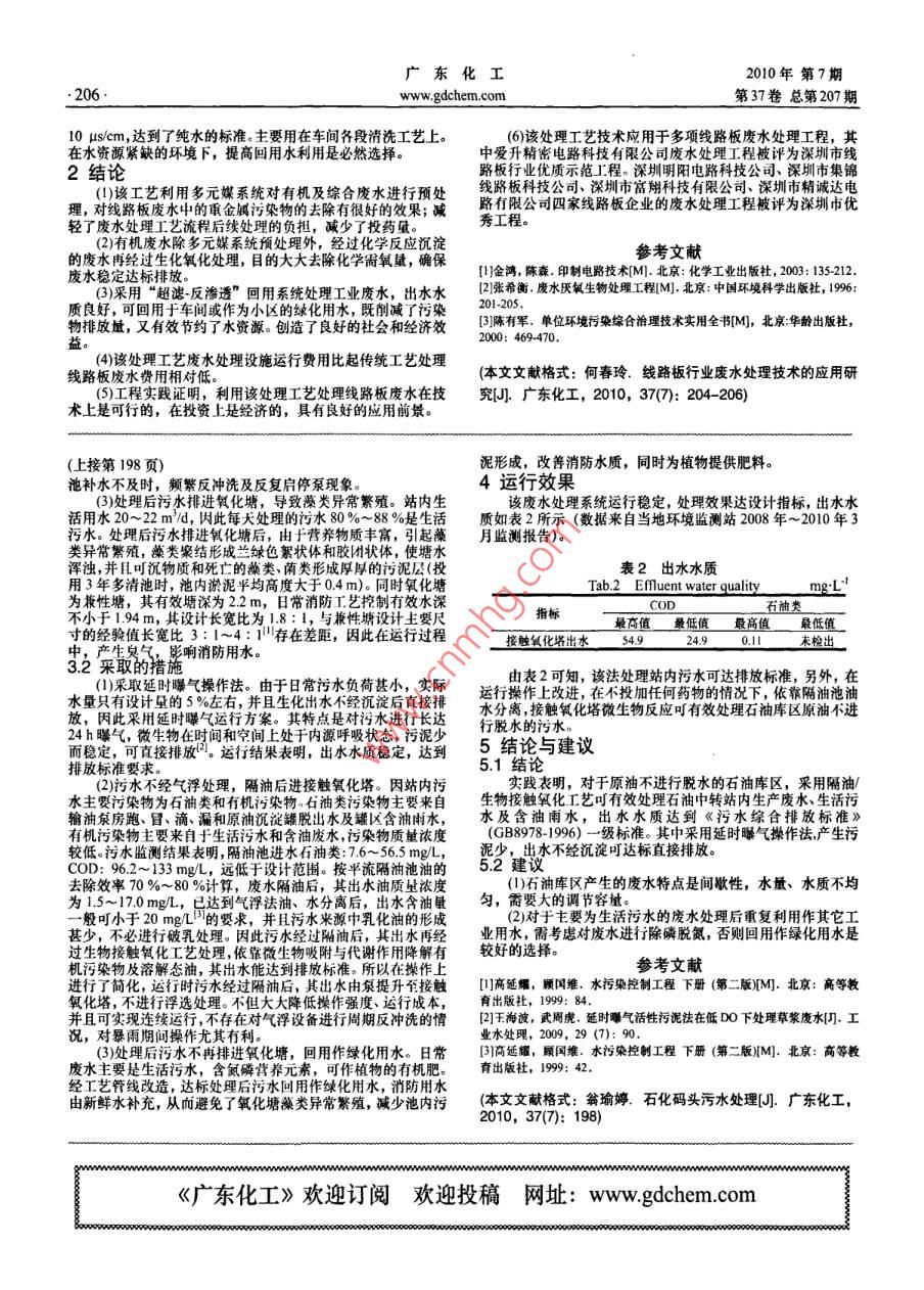 廣東化工2010年第7期。198.www.gdchem.com第37卷總第207期石化碼頭污水處理翁瑜婷(華德石化有限公司,廣東惠州516081)[摘要]介紹了廣州石化碼頭污水處理設計工藝,指出了運行中存在的問題。針對現(xiàn)有水質(zhì)、水量的特點,優(yōu)化及簡化了操作工藝。運行結(jié)果表明,采用隔油/生物按觸氧化工藝可有效處理石油庫區(qū)的污水,處理后的污水水質(zhì)達到《污水綜合排放標準》(G88978-1996)- -級標準,而且出水水質(zhì)較穩(wěn)定。[關(guān)鍵詞]石油庫區(qū)污水;隔油;生物接觸氧化[中圖分類號)X5[文獻標識碼]A[文章編100-18652010)07-0198-01Wastewater Treatment of Petrochemical TerminalWeng Yuting,(Huade Petrochemical Co., Ltd, Huizhou 516081, China)Abstract: Introduced the design process of wastewater treatment of Guanzhou Petrochemical Terminal. The problem existing in the running was pointed out.The operating processes were optimized and simplified on the water quality and characteristis of water quantity. The results of operation showed that the processesof the oil separaion/ biological contact oxigation were applied to the wastewater treatment on oil reservoir were a feasible technology. The treated wastewater qualityachieves the First Grade Standard of the Synthetic Wastewater Discharge(GB8978-1996).The efluent water quality was quite stable.Keywords: wastewater of oil reservoir; oil separation; biological contact oxigation華德石化馬鞭洲首站是廣州石化碼頭,其擔負著原油的接站內(nèi)污水主要來源于辦公區(qū)生活污水、罐區(qū)初期含油雨水卸、儲存與輸送任務。該碼頭目前擁用60萬t庫容,15 萬t及原油沉淀罐(2個100 m)脫出水、轉(zhuǎn)輸泵房、污水泵房、循級與30萬1級原油碼頭各一個及相應的配套設施,污水處理環(huán)水裝置產(chǎn)生的生產(chǎn)廢水。設計處理量是20 m/h,最大處理裝置是其中的配食設施之一。現(xiàn)結(jié)合該裝置在實際運行中存在量是30 m/h,污水水質(zhì)如表1所示,處理后出水水質(zhì)要求達的問題、操作實踐淺談個人的看法。到《污水綜合排放標準》(GB8978-1996)- 級標準,控制的主1污水水質(zhì)、水量和排放標準要指標是石油類,COD。表1設計水質(zhì)及處理后污染物排放指標Tab.1 Water quality of design and index of treated pollutants dischargemg:L項日pHCOD石油類揮發(fā)酚硫化物包化物杜浮物BOD,氨氣進水水質(zhì)7.76-7.91 200 -300<3.66<3.88未檢出.< 100出水水質(zhì)6-9≤60≤s指標2污水處理工藝流程濃縮池。污水由集水池經(jīng)泵提升進入氣浮設備,在此裝置內(nèi)乳污水處理工藝流程見圖1.污水經(jīng)站內(nèi)排水系統(tǒng)管道收化油被去除。其出水流進回流水池,液位達到一定高度時自流,匯流到平流隔油池(兼作含油雨水調(diào)節(jié)池),在隔油池內(nèi)污至生化集水池經(jīng)泵提升進入生物接觸氧化塔,處理后排進氧化水中污油(游離態(tài)油和機械分散態(tài)油)被收集到污油池,由泵送塘作為消防用水。至原油罐,油泥通過刮油刮泥機收集進泥斗,由泵提升至污泥生活污水廠* 時油泡一原油罐生產(chǎn)廢水→通油道一山浮集水地十氣渾設備飛得設備一回流水泡一→生化集水他含油雨水污泥濃縮池j浮渣T[氧化塘→-接觸創(chuàng)化圖提升泵--一醫(yī) 出站州圖1設計工藝流程Figl Design process flow3運行與管理分離,后進入過濾區(qū),經(jīng)石英砂過濾后,由下部穿孔管流出進3.1運行中存在的問題回流水池。污水進行氣行氣浮時,水中易分離的懸浮物被去除,在(1)實際負荷遠小于設計負荷。設計時考慮對原油進行脫經(jīng)過過濾區(qū)時,水中難于氣浮的顆粒被截留在濾層中,運行一水,由于碼頭地處大亞灣自然保護區(qū)內(nèi),公司為了實現(xiàn)“不讓段時間后,通常48 h,濾層截留較多未能通過浮上分離去除的一滴油污染大亞灣”的承諾,不在罐區(qū)內(nèi)進行原油脫水作業(yè)。污染物,出水流量小,進水大部分通過集渣槽進入濃縮池,需因此日常產(chǎn)生的廢水量甚少約25 m/d,遠未達到設計負荷20 m/ho對其進行人工反沖洗。反洗結(jié)束后,重啟氣浮提升泵、溶氣泵(2)氣浮設備反洗周期短,操作強度大。氣浮設備是兼浮及生化提升泵處理污水。因此在實際操作中,常出現(xiàn)生化集水選與過濾于一體的綜合凈水器。污水進入設備時,先經(jīng)過氣浮(下轉(zhuǎn)第206頁)(收稿日期] 2010-06-02[作者簡介]翁瑜婷(1976-), 女,廣東人,學士,助理工程師,主要從事工業(yè)水處理運行與管理工作。廣東化工2010年第7期.206.www.gdchem.com第37卷總第207期10 us/cm,達到了純水的標準。主要用在車間各段清洗工藝上。_(6)該處 理工藝技術(shù)應用于多項線路板廢水處理工程,其在水資源緊缺的環(huán)境F,提高回用水利用是必然選擇。中愛升精密電路科技有限公司廢水處理工程被評為深圳市線2結(jié)論路板行業(yè)優(yōu)質(zhì)示范I程。深圳明陽電路科技公司、深圳市集錦(!)該工藝利用多元媒系統(tǒng)對有機及綜合廢水進行預處線路板科技公司深圳市富翔科技有限公司深圳市精誠達電理,對線路板廢水中的重金屬污染物的去除有很好的效果;減路有限公司四家線路板企業(yè)的廢水處理工程被評為深圳市優(yōu)輕了廢水處理工藝流程后續(xù)處理的負擔,減少了投藥量。秀工程。(2)有機廢水除多元媒系統(tǒng)預處理外,經(jīng)過化學反應沉淀參考文獻的廢水再經(jīng)過生化氧化處理,目的大大去除化學需氧量,確保[|]金鴻,陳森.印
