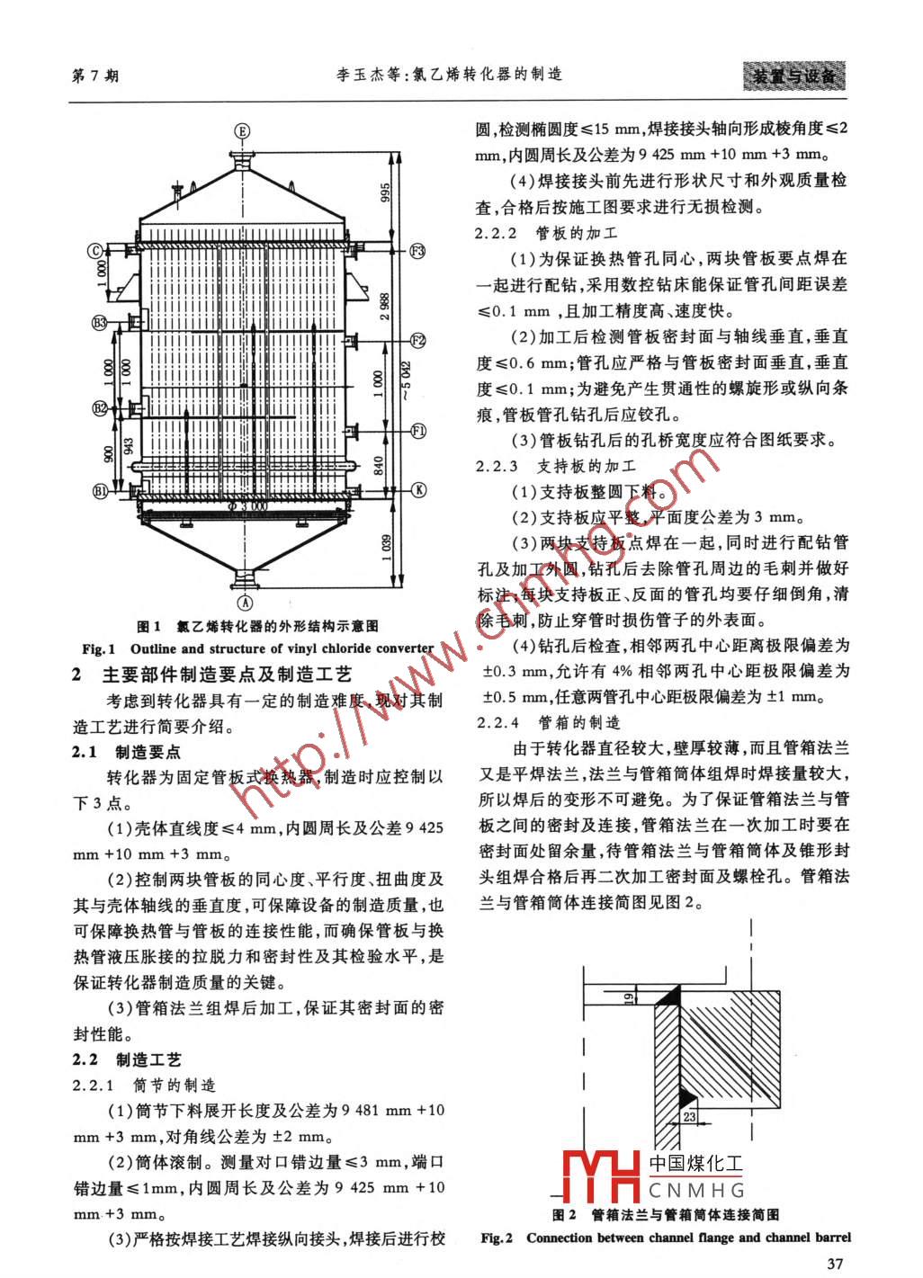 第42卷第7期聚氯乙烯Vol. 42, No. 72014年7月Polyvinyl ChlorideJul. , 2014[裝置與設(shè)備]氟乙烯轉(zhuǎn)化器的制造李玉杰" ,信中野;李彪(中航黎明錦西化工機(jī)械(集團(tuán))有限責(zé)任公司,遼寧葫蘆島125001)[關(guān)鍵詞]氯乙烯;轉(zhuǎn)化器;管束;制造工藝摘要]介紹了氯乙烯轉(zhuǎn)化器的結(jié)構(gòu)及技術(shù)特性。針對(duì)氯乙烯轉(zhuǎn)化器在制造過(guò)程中存在的難點(diǎn)問(wèn)題,制定了合理的制造工藝,效果良好,對(duì)類(lèi)似設(shè)備的制造具有重要的參考價(jià)值。[中圈分類(lèi)號(hào)] TQ325. 3 ;TQ052[文獻(xiàn)標(biāo)志碼] A[文章編號(hào)] 1009 -7937(2014)07 -0036 -03Manufacure of vinyl chloride converterLI Yujie, XIN Zhongye, LI Biao(AVIC Liming Jinxi Chemical Machinery ( Group) Co.,Ltd. , Huludao 125001, China)Key words: vinyl chloridc; converter; tube bundle ; manufacturing processAbstract: The structure and technical characteristics of vinyl chloride converter were introduced.Aiming at problems existing in the manufacture of vinyl chloride converter, a reasonable manufacturingprocess was worked out. Good results were obtained. The manufacturing process had important referencevalue to the manufacture of similar equipment.隨著我國(guó)國(guó)民經(jīng)濟(jì)的持續(xù)高速發(fā)展以及建筑業(yè)有1160根57mmx3.5mmx3000mm的換熱與PVC加工工業(yè)對(duì)PVC消費(fèi)的強(qiáng)勁拉動(dòng),國(guó)內(nèi)管,材質(zhì)為20。上、下管板為兼作法蘭形式,與簡(jiǎn)PVC工業(yè)發(fā)展十分迅速。近幾年,國(guó)內(nèi)先后建設(shè)了體焊接;管箱與管板為法蘭連接結(jié)構(gòu),設(shè)備法蘭為許多PVC項(xiàng)目。在這些項(xiàng)目中,基本上都是采用電凹面結(jié)構(gòu)。石法生產(chǎn)PVC,而在該生產(chǎn)裝置中,轉(zhuǎn)化器又是關(guān)良1氯乙烯轉(zhuǎn)化器技術(shù)特性鍵設(shè)備。轉(zhuǎn)化器的設(shè)計(jì)及制造質(zhì)量直接關(guān)系到Table 1 Specifications of vinyl chloride converterPVC產(chǎn)品的質(zhì)量,它在電石法PVC生產(chǎn)中的作用名稱(chēng)殼程管程至關(guān)重要。設(shè)計(jì)壓力/MPa0.550.061結(jié)構(gòu)形式及技術(shù)特性設(shè)計(jì)溫度/C105200工作壓力/MPa0.50.05氯乙烯轉(zhuǎn)化器的技術(shù)特性見(jiàn)表1,外形結(jié)構(gòu)如工作溫度(進(jìn)/出)/C95/99100/185圖1所示。鈞料名稱(chēng)/特性熱水(無(wú)毒〉氧乙婚氣、氧化錄(易爍,中度危害)轉(zhuǎn)化器殼體尺寸為D3 000 mm x18 mm x管子與管板連接形式強(qiáng)度脹5042 mm,材質(zhì)為Q345R,管板尺寸為3. 160 mm x65mm,材質(zhì)為Q345R(正火)??偣埠缚p接頭系數(shù)0.851.0[收稿日期] 2014 -05 -28中國(guó)煤化工[作者筒介]李玉杰(1971- -) ,女,助理工程師,1991年畢業(yè)于遼寧省石MYHCNMHG12年畢業(yè)于中央廣播電視大學(xué)機(jī)械設(shè)計(jì)制造及自動(dòng)化專(zhuān)業(yè),現(xiàn)于中航黎明錦西化工機(jī)械(集團(tuán))有限責(zé)任公司化工機(jī)械研究院從事設(shè)備設(shè)計(jì)與工藝工作。.36聚氯.乙烯2014年2.2.5管束與殼體組裝提高換熱管與管板連接處抵抗腐蝕的能力,還可避組裝拉桿、支持板,并進(jìn)行穿管。調(diào)整管板與殼:免因焊接高溫而使管板及換熱管的局部材質(zhì)力學(xué)性體的垂直度和同心度。把拉桿裝于下管板上,按鉆能下降??椎捻樞蚪M對(duì)支持板。每裝1塊支持板,就從上管2.2.7壓 力試驗(yàn)板密封面方向穿人梅花形的數(shù)組換熱管,其目的是首先按圖樣壓力進(jìn)行殼程的水壓試驗(yàn),檢查管自然調(diào)整支持板與管板的同心度。待用螺母緊固支子與管板的連接質(zhì)量。殼程水壓試驗(yàn)合格后,組裝持板之后,穿入全部換熱管。然后以管板面為基準(zhǔn),管箱,并按圖紙壓力進(jìn)行水壓及氣密性試驗(yàn)。調(diào)整換熱管伸出管板面的長(zhǎng)度為5mm。.3結(jié)語(yǔ)2.2.6換熱管與管板的連 接[1]在氯乙烯轉(zhuǎn)化器的制造過(guò)程中,換熱管與管板換熱管與管板采用強(qiáng)度脹接的方式連接,其結(jié)的脹接質(zhì)量非常重要,脹接后殼程應(yīng)進(jìn)行壓力為構(gòu)如圖3所示。0.05MPa的氣密性試驗(yàn),以保證脹接質(zhì)量;管箱焊0°接量大,易造成焊后變形,對(duì)關(guān)鍵部位進(jìn)行焊后二次加工是解決焊后變形必不可少的措施。中航黎明錦西化工機(jī)械(集團(tuán))有限責(zé)任公司按圖紙和制造工藝要求,成功制造出氯乙烯轉(zhuǎn)化器,其各項(xiàng)性能均達(dá)到預(yù)定要求,設(shè)備運(yùn)抵現(xiàn)場(chǎng)后,運(yùn)行情況良好,受到用戶(hù)好評(píng)。[參考文獻(xiàn)][1]全國(guó)壓力容器標(biāo)準(zhǔn)化技術(shù)委員會(huì)換熱設(shè)備分委員會(huì)圄3換熱管與管板的連接簡(jiǎn)圖GB 151- -1999管殼式換熱器[S].北京:中國(guó)標(biāo)準(zhǔn)出版Fig.3 Connection between heat exchange tube and tube plate社,000.[編輯:陳立春]強(qiáng)度脹接可使換熱管與管板的結(jié)合更加緊密,*****米***業(yè)業(yè)業(yè)業(yè)*********業(yè)業(yè)****業(yè)***業(yè)* *業(yè)業(yè)*業(yè)業(yè)業(yè)業(yè)業(yè)當(dāng)**當(dāng)業(yè)當(dāng)(上接第23頁(yè))[15]趙清香,溫少?lài)?guó),景秀琴,等. vC -BA共聚物在PVc[4]任連保.特種及專(zhuān)用pvc樹(shù)脂的加工特性與選擇[J].電線(xiàn)電纜中的應(yīng)用[J].塑料,1988(6):12 -15.聚氯乙烯,2013,41(5):20 -25.[16]張海燕,趙留喜. ABS/(VC -BA)/PVC共聚體