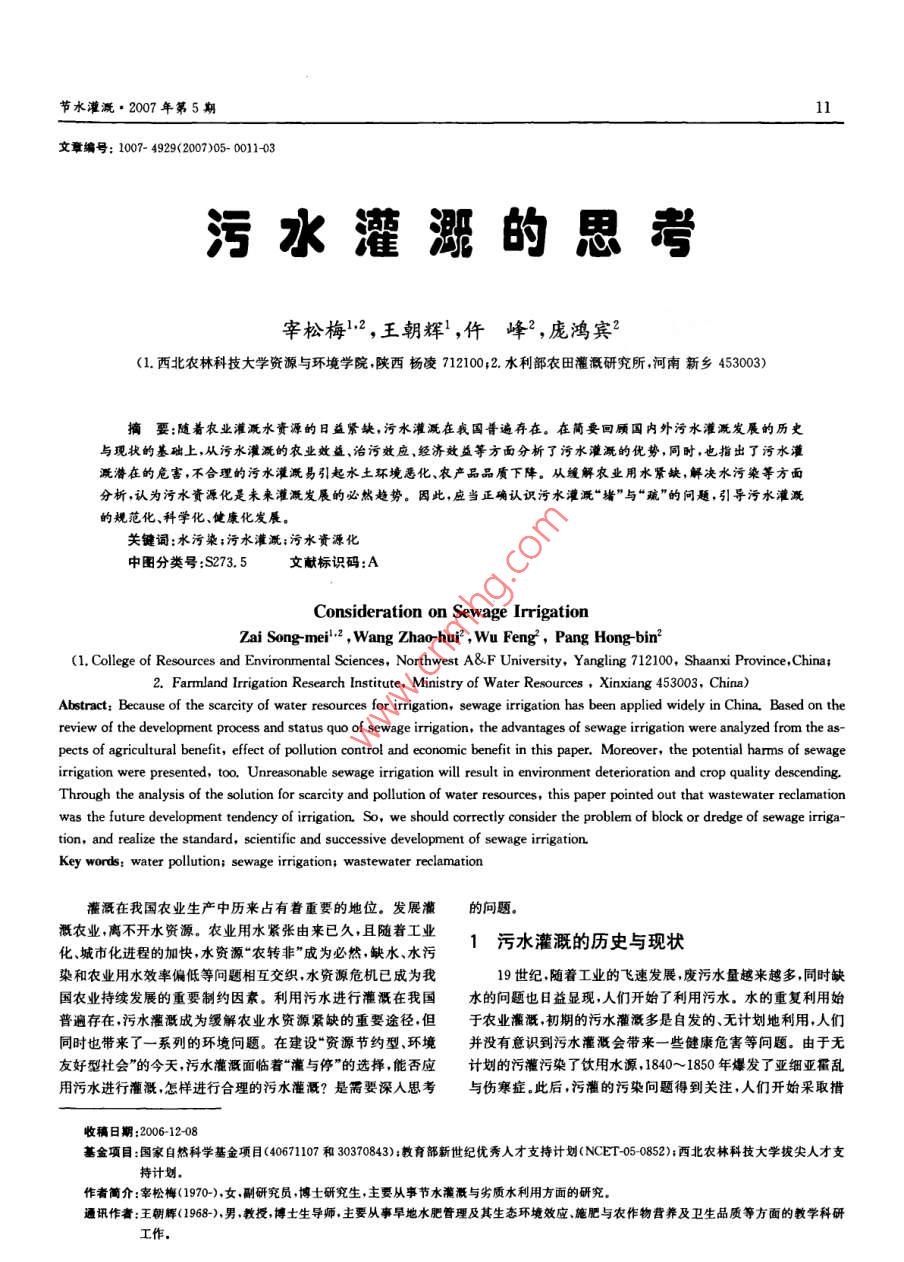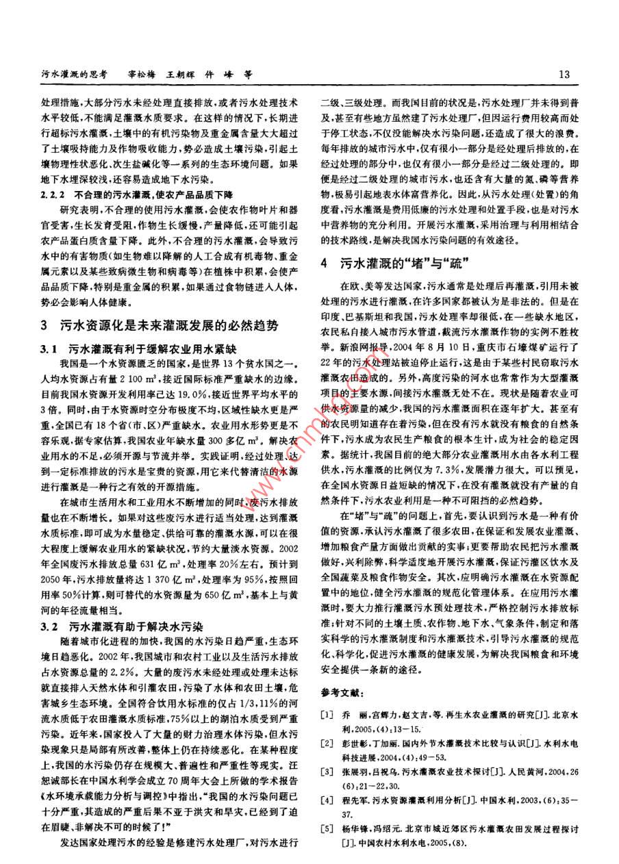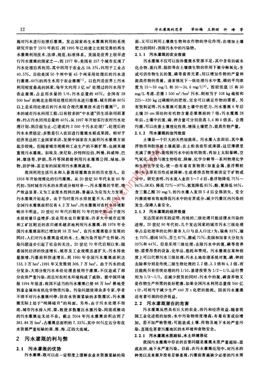 節(jié)水灌溉·2007年第5期文章編號(hào):1007-4929(2007)05-001103污水灌跚的恩岢宰松梅2,王朝輝,仵峰2,龐鴻賓2(1.西北農(nóng)林科技大學(xué)資源與環(huán)境學(xué)院陜西楊凌7121002.水利部農(nóng)田灌溉研究所,河南新鄉(xiāng)453003)摘要:隨著農(nóng)業(yè)灌溉水資源的日益緊缺,污水灌溉在我國普遍存在。在簡要回顧國內(nèi)外污水灌溉發(fā)展的歷史與現(xiàn)狀的基礎(chǔ)上,從污水灌溉的農(nóng)業(yè)效益、治污效應(yīng)、經(jīng)濟(jì)效益等方面分析了污水灌溉的優(yōu)勢,同時(shí),也指出了污水灌溉潛在的危害,不合理的污水灌溉易引起水土環(huán)境惡化、農(nóng)產(chǎn)品品質(zhì)下降。從緩解農(nóng)業(yè)用水緊缺,解決水污染等方面分析,認(rèn)為污水資源化是未來灌溉發(fā)展的必然趨勢。因此,應(yīng)當(dāng)正確認(rèn)識(shí)污水灌溉“堵”與“疏”的問題,引導(dǎo)污水灌溉的規(guī)范化、科學(xué)化、健康化發(fā)展關(guān)鍵詞:水污染;污水灌溉;污水資源化中圖分類號(hào):S273.5文獻(xiàn)標(biāo)識(shí)碼:AConsideration on Sewage IrrigationZai Song-mei, Wang Zhao-hui, Wu Feng?, Pang Hong-bin(1. College of Resources and Environmental Sciences, Northwest A&F University, Yangling 712100, Shaanxi Province, China2. Farmland Irrigation Research Institute, Ministry of Water Resources, Xinxiang 453003, ChinaAbstract: Because of the scarcity of water resources for irrigation, sewage irrigation has been applied widely in China. Based on thereview of the development process and status quo of sewage irrigation, the advantages of sewage irrigation were analyzed from the as-pects of agricultural benefit, effect of pollution control and economic benefit in this paper. Moreover, the potential harms of sewageirrigation were presented, too. Unreasonable sewage irrigation will result in environment deterioration and crop quality descending.Through the analysis of the solution for scarcity and pollution of water resources, this paper pointed out that wastewater reclamationwas the future development tendency of irrigation. So, we should correctly consider the problem of block or dredge of sewage irriga-tion, and realize the standard, scientific and successive development of sewage irrigation.Key words: water pollution; sewage irrigation; wastewater reclamation灌溉在我國農(nóng)業(yè)生產(chǎn)中歷來占有著重要的地位。發(fā)展灌的問題。溉農(nóng)業(yè)離不開水資源。農(nóng)業(yè)用水緊張由來已久,且隨著工業(yè)化、城市化進(jìn)程的加快,水資源“農(nóng)轉(zhuǎn)非”成為必然,缺水、水污污水灌溉的歷史與現(xiàn)狀染和農(nóng)業(yè)用水效率偏低等問題相互交織,水資源危機(jī)已成為我19世紀(jì)隨著工業(yè)的飛速發(fā)展,廢污水量越來越多,同時(shí)缺國農(nóng)業(yè)持續(xù)發(fā)展的重要制約因素。利用污水進(jìn)行灌溉在我國水的問題也日益顯現(xiàn),人們開始了利用污水。水的重復(fù)利用始普遍存在,污水灌溉成為緩解農(nóng)業(yè)水資源緊缺的重要途徑但于農(nóng)業(yè)灌溉初期的污水灌溉多是自發(fā)的、無計(jì)劃地利用,人們同時(shí)也帶來了一系列的環(huán)境問題。在建設(shè)“資源節(jié)約型、環(huán)境并沒有意識(shí)到污水灌溉會(huì)帶來一些健康危害等問題。由于無友好型社會(huì)”的今天,污水灌溉面臨著“灌與?!钡倪x擇,能否應(yīng)計(jì)劃的污灌污染了飲用水源1840~1850年爆發(fā)了亞細(xì)亞霍亂用污水進(jìn)行灌溉怎樣進(jìn)行合理的污水灌溉?是需要深入思考與傷寒癥。此后,污灌的污染問題得到關(guān)注,人們開始采取措收稿日期:20061208基金項(xiàng)目:國家自然科學(xué)基金項(xiàng)目(4067107和30370843);教育部新世紀(jì)優(yōu)秀人才支持計(jì)劃(NCET050852);西北農(nóng)林科技大學(xué)拔尖人才支作者簡介:宰松梅(1970),女副研究員,博士研究生,主要從事節(jié)水灌溉與劣質(zhì)水利用方面的研究通訊作者:王朝輝(1968),男教授博土生導(dǎo)師,主要從事旱地水肥管理及其生態(tài)環(huán)境效應(yīng)施肥與農(nóng)作物營養(yǎng)及衛(wèi)生品質(zhì)等方面的教學(xué)科研工作12污水灌溉的思考宰松梅王朝輝件峰等施對(duì)污水進(jìn)行處理后灌溉。發(fā)達(dá)國家再生水灌溉利用的系統(tǒng)面,又可以利用土壤微生物和農(nóng)作物的凈化作用,在增加土壤研究開始于1970年前后,到1995年已經(jīng)建立比較完善的再生肥力的同時(shí),消除污水中的污染物水灌溉利用技術(shù)、法律、規(guī)范、標(biāo)準(zhǔn)體系。美國是世界上較早進(jìn)2.1.1污水灌溉的農(nóng)業(yè)效益行污水灌溉的國家之一,到1977年,美國有357個(gè)城市實(shí)現(xiàn)了污水灌溉不僅可以彌補(bǔ)灌溉水資源不足,其中含有的碳水污水處理后再利用,其中回用于農(nóng)業(yè)占58.3%回用于工業(yè)占化合物蛋白質(zhì)脂肪等在土壤微生物的作用下被分解氧化生40.5%。目前美國50個(gè)州中有45個(gè)州采用處理后的污水進(jìn)成可供作物生長的氮、磷等營養(yǎng)元素,用以增加作物的產(chǎn)量和行灌溉,60%的再生水用于農(nóng)業(yè)灌溉。以色列是世界上污水提高作物的質(zhì)量。通常情況下一級(jí)處理污水中氮、磷的平均濃利用程度最高的國家,每年大約用3億m3處理過的污水用于度為15~59mg/L和30~34.6mg/1,按較低值15和30農(nóng)業(yè)灌溉,占總用水量的1/6,污水總量的46%。全國有28mg/L考慮,若灌1