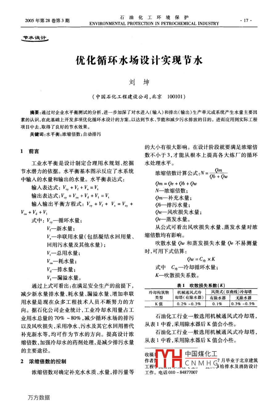 2005年第28卷第3期石油化工環(huán)境保護ENVIRONMENTAL PROTECTION IN PETROCHEMICAL INDUSTRY節(jié)水設計優(yōu)化循環(huán)水場設計實現(xiàn)節(jié)水劉坤(中國石化工程建設公司,北京100101)摘要:通過對企業(yè)水平衡測試的分析,進一步加深了對水進入(輸入)和排出(輸出)生產(chǎn)單元或系統(tǒng)產(chǎn)生水量主要因素的認識,在此基礎上開發(fā)多項優(yōu)化循環(huán)水設計的方案,以達到節(jié)水、節(jié)能和減少污水排放的目的。進而應用到實際工程項目中去,取得了良好的節(jié)水效果。關鍵詞:水平衡;濃縮倍數(shù);自動排污的大小有很大影響。在設計階段就要滿足濃縮倍1前言數(shù)不小于3,才能從根本上提高各大煉廠的循環(huán)工業(yè)水平衡是設計制定合理用水規(guī)劃、挖掘水處理水平。節(jié)水潛力的依據(jù)。水平衡基本圖示反應了水系統(tǒng)濃縮倍數(shù)計算公式:N=m中輸入的水量和輸出的水量。水平衡表達式:=Qe+Qb+ Q輸人表達式:V。+V+V=VN一濃縮倍數(shù)輸出表達式:V+V+V+V1=VQm—補充水量;輸入輸出平衡方程式:V+V+VQb—排污水量Ven +va+v,Q—風吹損失水量;式中:V。一循環(huán)水量Qe—蒸發(fā)水量v一新水量從公式可看出風吹損失水量、蒸發(fā)水量對濃v,一串聯(lián)用水量(包括凝結水回用量、縮倍數(shù)均有影響?;赜梦鬯考捌渌?;吹散水量Q和蒸發(fā)損失水量Qe不易測量v一總用水量;時,可用下式估算v。一耗水量=Cs×KV-排水量;式中Cn一冷卻循環(huán)水量;V1一漏溢水量。K—吹散損失系數(shù)。通過上式可看出:在滿足安全生產(chǎn)的前提下表1吹散損失系數(shù)(K)減少新水量排水量、耗水量、漏溢水量、增加串聯(lián)增加串聯(lián)冷卻構筑物機械通風式冷風簡式(雙曲線)冷卻塔用水量是現(xiàn)在眾多工程技術人員不斷努力的方02%~03%0.1%0.3%-0.5%向。據(jù)石化公司企業(yè)統(tǒng)計,工業(yè)冷卻水用量占工業(yè)用水總量的70%~80%,減少循環(huán)水場的排污石油化工行業(yè)一般選用機械通風式冷卻塔,以及風吹損失,采用凈水、污水及其它水回用替代從表1中看采用除水器后K值會小些。補充新水等,均可作為節(jié)水的方向。提高設計濃石油化工行業(yè)一般選用機械通風式冷卻塔縮倍數(shù),加強冷卻水的藥劑處理,是減少排污水量從表1中看采用除水器后K值會小些的主要途徑。收稿2濃縮倍數(shù)的控制作者工程H中國煤化工CNMHG7月畢業(yè)于北京建筑給排水及消防設計濃縮倍數(shù)對確定補充水水質、水量,排污量等工作。電話010-8487700718石油化工環(huán)境保005年第28卷除水器的主要作用是收集飄滴,減少對周圍環(huán)境與設備的不良影響。國內對除水器的研究在換熱器不斷改進和發(fā)展,比較普遍應用的為波形除水器。冷國外一些專業(yè)從事冷卻塔研究的公司生產(chǎn)的除水補允本器具有比較大的表面積,收水效率高,阻力小。其循環(huán)水泵表面積為國內波形除水器的兩倍多;飄滴損失率不足波形除水器的1/2,節(jié)水效果明顯??刂破髁髁總鞲衅魇街蠸一蒸發(fā)損失系數(shù);△t-冷卻水進出水溫度。表2萊發(fā)損失系數(shù)(S)電磁計量泵氣溫(℃)-100200.080.10.120.140.150.16圖1流程圖蒸發(fā)水量又與冷卻塔的進出口水溫差、蒸發(fā)損失系數(shù)(S)成正比。統(tǒng)容積和小時循環(huán)水量之比應控制在1/3以內。3全自動加藥及自動排污5排污控制在生產(chǎn)過程中,循環(huán)水會因為各種因素而損排污水量是按照物料平衡的原理推導出的理失這時必須打開補充水閥門補水,補充水圖1流論計算公式計算所得的數(shù)量,它包括滲漏水量旁程圖經(jīng)過流量計測定出水的流量,并傳達到控制流處理過程中的排水量等。其中機泵冷卻用水不器進行顯示和分析控制器根據(jù)設定的程序,再控回系統(tǒng);用循環(huán)水做洗滌用水后直排;沖洗設備用制計量泵自動加藥(流程如圖1)。這套系統(tǒng)初步循環(huán)水等不規(guī)范操作都是造成濃縮倍數(shù)降低的原實現(xiàn)了自動監(jiān)測和在線自動分析的全自動加藥系因?;诖它c在運行自動排污流程的同時,從管統(tǒng),淘汰了過去傳統(tǒng)的連續(xù)定量投加緩蝕阻垢劑理運行角度加強節(jié)水意識杜絕循環(huán)水的浪費才的加藥機,避免了現(xiàn)場操作各種儀器的麻煩。用能使循環(huán)水系統(tǒng)真正達到優(yōu)化。熒光示蹤技術也可自動監(jiān)測加藥系統(tǒng);還可通過6達標污水回用設計具有防腐、防垢、和除垢的電磁設備,通過物理方法使循環(huán)水達到規(guī)定的水質指標。我國水資源日益短缺,水污染日益嚴重已成利用電導TDS探頭測量電導。TDs探頭在工為不爭的事實,我國政府已引起高度重視,正在制作期間把測定的電導傳送到控制器進行顯示分訂一系列嚴格的保護水資源、減少污水排放的政析,當電導率超過設定的電導上值的1%~5%時,策和法律。降低新鮮水消耗、減少污水排放已成控制器將認為此時的循環(huán)水電導偏高,將控制閥為各用水企業(yè)迫切需要解決的問題。將達標排放開啟,進行排污。排污同時電導TDS探頭一直測污水進行適當處理回用于循環(huán)冷卻水系統(tǒng),是降定循環(huán)水電導,并傳送給控制器,當電導率低于限低企業(yè)水耗、減少污水排放的一個行之有效的辦定值控制器將認為電磁閥的排污過程可結束,將法可降低企業(y