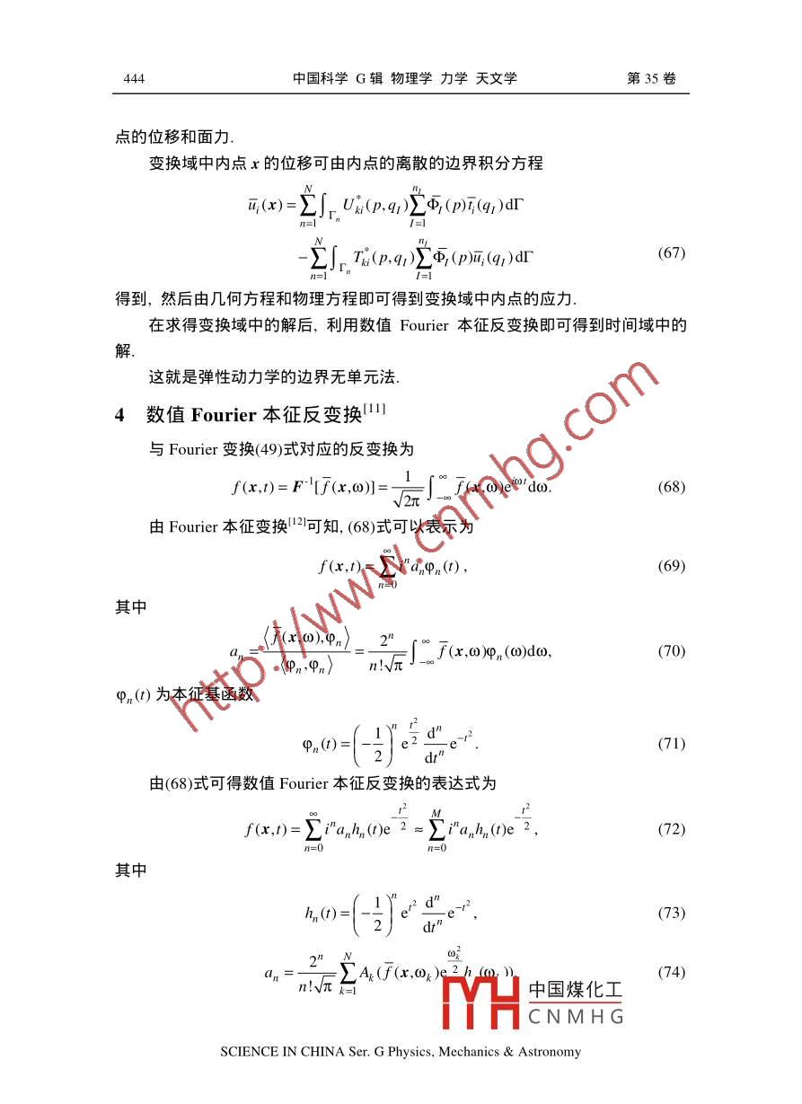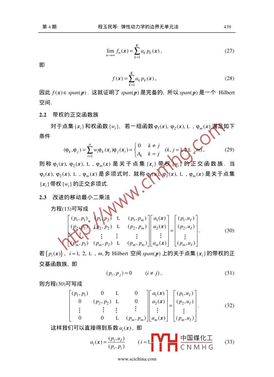 中國科學G輯物理學力學天文學2005,35(4):435-448435彈性動力學的邊界無單元法程玉民彭妙娟上海大學上海市應用數(shù)學和力學研究所,上海200072)上海大學土木工程系,上海200072)摘要討論了 Hilbert空間上的改進的移動最小二乘法,并將彈性動力學的邊界積分方程方法與改進的移動最小二乘法結合,提出了彈性動力學的邊界無單元法.改進的移動最小二乘法避免了求解病態(tài)方程組,既提高了效率,又提高了精度.邊界無單元法是邊界積分方程的無網格方法的直接列式法,容易引入邊界條件,且具有更高的精度.最后給出了彈性動力學的邊界無單元法的數(shù)值實現(xiàn)方法和具體的算例關鍵詞移動最小二乘法邊界積分方程無網格方法彈性動力學改進的移動最小二乘法邊界無單元法無網格方法近年來得到了較大發(fā)展,是目前計算力學研究的熱點之無網格方法采用基于點的近似,在處理諸如大變形、裂紋擴展等問題時不需進行網格重構,具有較為明顯的優(yōu)越性.目前發(fā)展的無網格方法有擴散單元法( Diffuse element method,即DEM)、無單元 Galerkin法( lement-Free GalerkinMethod,即EFG)、Hp- -clouds無網格方法、有限點法( The Finite Point method,即FPM)、無網格局部 Petrov-Galerkin方法( Meshless local petrov- Galerkin Method,即MLPG)、多尺度重構核粒子方法(Mult- Scale Reproducing Kernel ParticleMethod,即MRKP)、小波粒子方法( Wavelet Particle Method,即WPM)、徑向基函數(shù)法( Radial basis Functions,即RBF)、無網格有限元法( Meshless finite elementMethod,即MFEM)、移動粒子有限元法( Moving particle Finite Element Method,即 MPFEM)以及邊界積分方程的無網格方法等邊界積分方程的無網格方法是將邊界積分方程方法與無網格方法中的移動最小二乘法結合而形成的.目前這一方面的研究主要有 Mukherjee等人提出的邊界點法( Boundary Node method,即BNM)3、Atui等人提出的局部邊界積分方004-08-02收稿,2005-04-22收修改稿中國煤化工*上海市重點學科建設項目資助(批準號:Y0103)*sE-mail:yecheng@sh163net:yecheng@staff.shu.edu.cnCNMHGSCIENCE IN CHINA Ser. G Physics, Mechanics Astronomy436中國科學G輯物理學力學天文學第35卷程方法 Local Boundary Integral Equation Method,即LBI)、姚振漢等人提出的雜交邊界點法( Hybrid Boundary Node Method)9、以及本文作者提出的邊界無單元法( Boundary Element-Free Method,即BEFM)等與邊界點法和局部邊界積分方程方法相比,邊界無單元法在形成的邊界積分方程中采用節(jié)點變量的真實解為未知量,而邊界點法和局部邊界積分方程方法均采用節(jié)點變量的近似解為未知量.邊界無單元法是邊界積分方程無網格方法的直接解法.邊界無單元法不僅直觀而且具有較高的精度,還可方便地引入邊界條件本文在 Hilbert空間上討論了改進的移動最小二乘法,并將彈性動力學的邊界積分方程方法與改進的移動最小二乘法結合,提出了彈性動力學的邊界無單元法,最后給出了彈性動力學的邊界無單元法的數(shù)值實現(xiàn)方法和具體的算例1移動最小二乘法在移動最小二乘法( Moving least- square approximation)中,取試函數(shù)n(x)=∑n(x)a(x)=p(x)a(x)(x∈9)(1)為函數(shù)u(x)的逼近函數(shù).這里m是基函數(shù)的個數(shù),P(x)是基函數(shù),a1(x)是相應的系數(shù).基函數(shù)的通常形式為線性基:p1=(1,x)(對一維區(qū)域)p=(,x,x2)(對二維區(qū)域二次基p2=(1,x1,x2)(對一維區(qū)域p=(1,x1,x2,x,xx2,x2)(對二維區(qū)域)對應于(1)式的整體逼近,在點x的鄰域內的局部逼近定義為n'(x,)=∑(x)a1(x)=p(x)a(x),(6)其中系數(shù)a1(x)根據(jù)加權最小二乘法來確定,它使得對函數(shù)n(x)的局部逼近誤差最小定義J=2w(r-x,u(r,x)-u(xn)w(x-x1)∑P(x7)a中國煤化工其中wx-x1)是具有緊支集特性的權函數(shù),xCNMH點SCIENCE IN CHINA Ser. G Physics, Mechanics Astronomy第4期程玉民等:彈性動力學的邊界無單元法437(7)式可用矩陣形式表示為J=(Pa-u) w(r(pa-u)(8)其中(r,) p2(n)l pm(n)P=|()P2()LPm(與)(10)p,(An) P2(r,n)L Pm(n)L為了得到a(x),對J取極值,即得A(x)a(x)-B(r)u=0(12)A(x)a(r)=b(x )u(13)其中矩陣A(x)和B(x)分別為A(r)=P w(r)P(14)B(x)=Pw(x)(15)由(13)式,可得a(r)=A (xB(x)u(16)這樣,逼近函數(shù)u(x)的表達式為x)=φ(x)m=∑(17)其中Φ(x)為形函數(shù)Φ(x)=閩(x,2(x),,2(x)=p(x)A(x)B(x)(18)2改進的移動最小二乘法在移動最小二乘法中,當m較大時,方程(13)有時是病態(tài)的,甚至是奇異的這樣,方程(13就難以求解或獲得正確的解.若選取正交函數(shù)作為基函數(shù),則所得到的方程即不病態(tài)也不奇異,而且不需求中國煤化工方程組的解THCNMHG中國科學G輯物理學力學天文學第35卷21 Hilbert空間span(p)為了討論正交基函數(shù),我們先來證明pam(p)是一個 Hilbert空對vf(x),g(x)∈spmn(p),定義I=1那么(f,g)是一個內積,spmn(p)是一個內積空間.下面我們給出證明(a)由(19)式可得(f,g)=(g,f)(b)和β為常數(shù),那么(f+βg,h)=(f,h)+β(g,h),(21)(c)對wf(x)∈spmn(p),可得1)f(x1)2≥0(22)若(f,f)=0,那么w(x-x1)=0或f(x1)=0,I=1,2,…,N.在移動最小二乘法中(x-x1)≠0、所以我們有f(x1)=0,I=1,2,…,N所以(f,g)是一個內積由于spm(p)是一個線性空間,則spmn(p)是一個內積空間對內積空間 spani(p)來說,如果它是完備的,那么它是一個 Hilbert空間.現(xiàn)在我們來證明spn(p)是完備的設{(x)為span(p)中的任一收斂級數(shù),且lim fn (x)=f(r)(23)將fn(x)表示為fn(r)1,2,L其中an為常數(shù).那么mf(x)=lm∑ankP(x)=∑(imak)(x)由于極限limf1(x)存在,則極限 lim ank存在,即有l(wèi)im可得中國煤化工CNMHGSCIENCE IN CHINA Ser. 