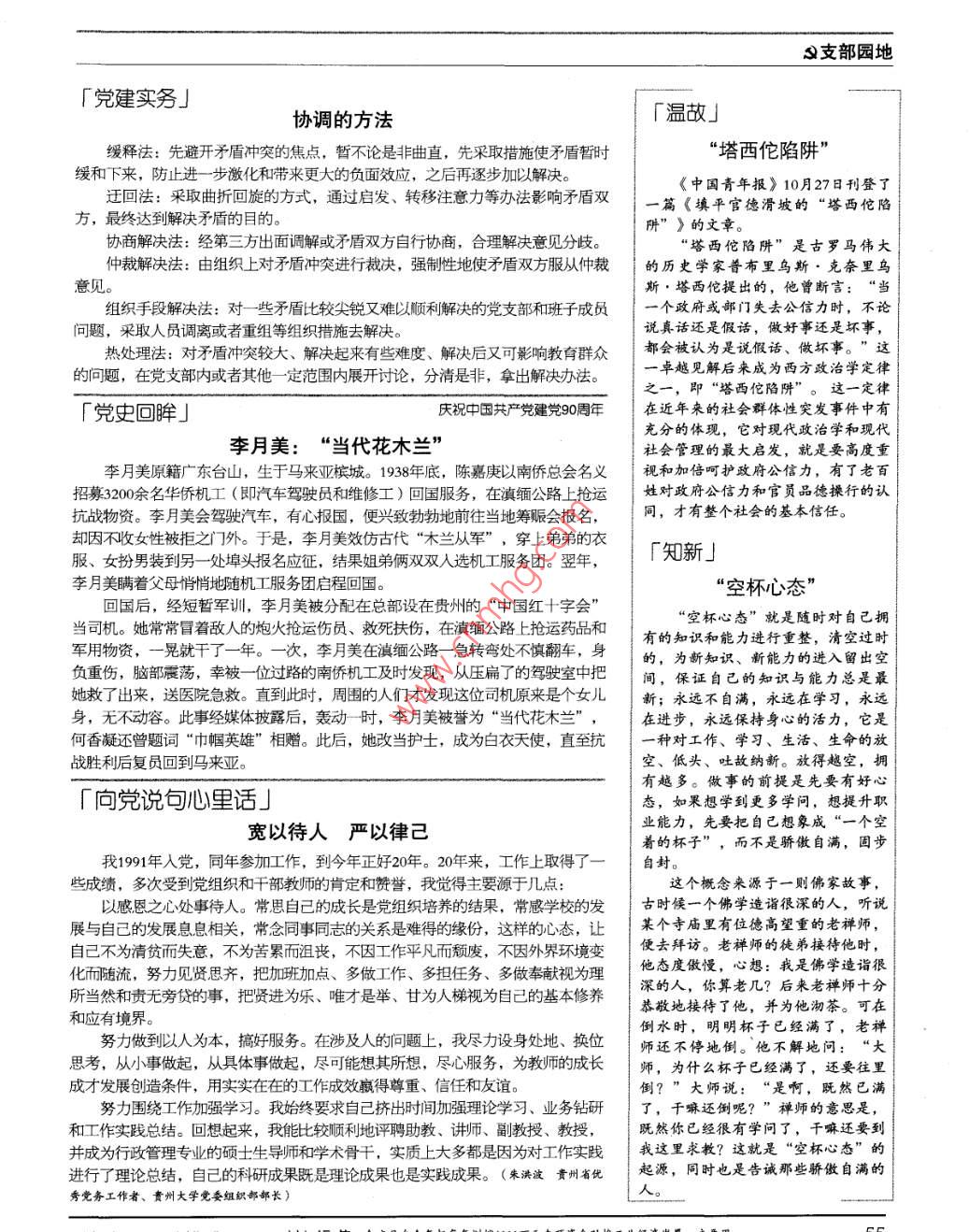s支部園地「黨建實(shí)務(wù)」協(xié)調(diào)的方法「溫故」緩釋法:先避開矛盾沖突的焦點(diǎn),暫不論是非曲直,先采取措施使矛盾暫時(shí)“塔西佗陷阱”緩和下來,防止進(jìn)一步激化和帶來更大的負(fù)面效應(yīng),之后再逐步加以解決。迂回法:采取曲折回旋的方式,通過啟發(fā)、轉(zhuǎn)移注意力等辦法影響矛盾雙《中國青年報(bào)》10月27日刊登了篇《填平官徳滑坡的“塔西佗陷方,最終達(dá)到解決矛盾的目的阱”》的文章。協(xié)商解決法:經(jīng)第三方出面調(diào)解或矛盾雙方自行協(xié)商,合理解決意見分歧。塔西佗陷阱”是古羅馬偉大仲裁解決法:由組織上對(duì)矛盾沖突進(jìn)行裁決,強(qiáng)制性地使矛盾雙方服從仲裁的歷史學(xué)家普布里烏斯·克奈里烏意見斯·塔西佗提出的,他曾斷言:“當(dāng)組織手段解決法:對(duì)一些矛盾比較尖銳又難以順利解決的黨支部和班子成員個(gè)政府或部門失去公信力時(shí),不論問題,采取人員調(diào)離或者重組等組織措施去解決。說真話還是假話,做好事還是壞事熱處理法:對(duì)矛盾沖突較大、解決起來有些難度、解決后又可影響教向群眾都會(huì)被認(rèn)為是說假話、做壞事?!边@的問題,在黨支部內(nèi)或者其他一定范圍內(nèi)展開討論,分清是非,拿出解決辦法。卓越見解后來成為西方政治學(xué)定律之一,即“塔西佗陷阱”。這一定律「黨史回眸」厭祝中國共產(chǎn)黨建黨90在近年來的社會(huì)群體性突發(fā)事件中有充分的體現(xiàn),它對(duì)現(xiàn)代政治學(xué)和現(xiàn)代李月美:“當(dāng)代花木蘭”社會(huì)管理的最大啟發(fā),就是要高度重李月美原籍廣東臺(tái)山,生于馬來亞檳城。1938年底,陳嘉庚以南僑總會(huì)名義視和加倍呵護(hù)政府公信力,有了老百招募3200余名華僑機(jī)工(即汽車駕駛員和維修工)回國服務(wù),在滇緬公路上搶運(yùn)姓對(duì)政府公信力和官員品德操行的認(rèn)抗戰(zhàn)物資。李月美會(huì)駕駛汽車,有心報(bào)國,便興致勃勃地前往當(dāng)?shù)鼗I賑會(huì)報(bào)名同,才有整個(gè)社會(huì)的基本信任。卻因不收女性被拒之門外。于是,李月美效仿古代“木蘭從軍”,穿上弟弟的衣服、女扮男裝到另一處埠頭報(bào)名應(yīng)征,結(jié)果姐弟倆雙雙人選機(jī)工服務(wù)團(tuán)。翌年,「知新」李月美瞞著父母悄悄地隨機(jī)工服務(wù)團(tuán)啟程回國。“空杯心態(tài)回國后,經(jīng)短暫軍訓(xùn),李月美被分配在總部設(shè)在貴州的“中國紅十字會(huì)當(dāng)司機(jī)。她常常冒著敵人的炮火搶運(yùn)傷員、救死扶傷,在滇緬公路上搶運(yùn)藥品和“空杯心態(tài)”就是隨時(shí)對(duì)自己擁有的知識(shí)和能力進(jìn)行重整,清空過時(shí)軍用物資,一晃就干了一年。一次,李月美在滇緬公路一急轉(zhuǎn)彎處不慎翻車,身的,為新知識(shí)、新能力的進(jìn)入留出空負(fù)重傷,腦部震蕩,幸被一位過路的南僑機(jī)工及時(shí)發(fā)現(xiàn),從壓扁了的駕駛室中把間,保證自己的知識(shí)與能力總是最她救了出來,送醫(yī)院急救。直到此時(shí),周圍的人們才發(fā)現(xiàn)這位司機(jī)原來是個(gè)女兒新;永遠(yuǎn)不自滿,永遠(yuǎn)在學(xué)習(xí),永遠(yuǎn)身,無不動(dòng)容。此事經(jīng)媒體披露后,轟動(dòng)時(shí),李月美被譽(yù)為“當(dāng)代花木蘭”,「在進(jìn)步,永遠(yuǎn)保持身心的活力,它是何香凝還曾題詞“巾幗英雄”相贈(zèng)。此后,她改當(dāng)護(hù)士,成為白衣天使,直至抗種對(duì)工作、學(xué)習(xí)、生活、生命的放我勝利后復(fù)員回到馬來亞??铡⒌皖^、吐故納新。放得越空,擁有越多。做事的前提是先要有好心「向黨說句心里話」態(tài),如果想學(xué)到更多學(xué)問,想提升職寬以待人嚴(yán)以律己業(yè)能力,先要把自己想象成“一個(gè)空著的杯子”,而不是驕傲自滿,固步我1991年入黨,同年參加工作,到今年正好20年。20年來,工作上取得了自封。些成績,多次受到黨組織和干部教師的肯定和贊譽(yù),我覺得主要源于幾點(diǎn):這個(gè)概念來源于一則佛家故事,以感恩之心處事待人。常思自己的成長是黨組織培養(yǎng)的結(jié)果,常感學(xué)校的發(fā)古時(shí)候一個(gè)佛學(xué)造詣很深的人,聽說展與自己的發(fā)展息息相關(guān),常念同事同志的關(guān)系是難得的緣份,這樣的心態(tài),讓萊個(gè)寺廟里有位德高望重的老神師,自己不為清貧而失意,不為苦累而喪,不因工作平凡而廢,不因外界環(huán)境變使去拜訪,老褲師的徒接待他時(shí)化而陸流,努力見賢思齊,把加班加點(diǎn)、多做工作、多擔(dān)任務(wù)、多做奉獻(xiàn)視為理他度做便,心想:我是佛學(xué)逵諧很所當(dāng)然和責(zé)無旁貸的事,把賢進(jìn)為樂、唯才是舉、甘為人梯視為自己的基本修養(yǎng)深的人,你算老幾?后來老禪師十分恭敬地接待了他,并為他沏茶。可在和應(yīng)有境界。倒水時(shí),明明杯子已經(jīng)滿了,老禪努力做到以人為本,搞好服務(wù)。在涉及人的問題上,我盡力設(shè)身處地、換位師還不停地倒。他不解地問:“大思考,從小事做起,從具體事做起,盡可能想其所想,盡心服務(wù),為教師的成長師,為什么杯子已經(jīng)滿了,還要往里成才發(fā)展創(chuàng)造條件,用實(shí)實(shí)在在的工作成效得尊重