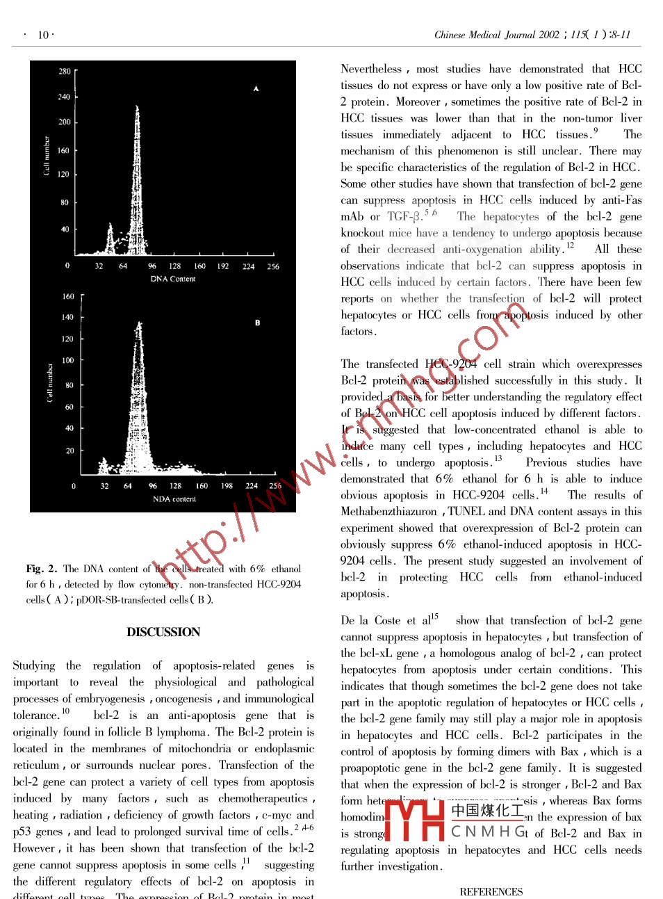 Chinese Medical Journal 2002 115(1): 8-11Overexpression of bcl-2 protects hepatoma cell line HCC-9204 fromethanol-induced apoptosisYANG Lianjun楊連君, SI Xiaohui司曉輝 and WANG Wenliang王文亮Keywordsbcl-2. carcinoma, hepatocellular. transfection gene expressionObjective To investigate the effect of overexpression of bcl-2 on ethanol-induced apoptosis of primaryhepatocellular carcinoma( HCC ) cellsMethods The retrovirus expression vector pDOR-SB containing human bcl-2 CDNA was introduced into ahuman HCC cell line HCC-9204 by liposome-mediated transfection. pDOR-transfected and non-transfectedHCC-9204 cells were used as controls. The expression of Bcl-2 protein by transfected HCC-9204 cells wasdetected by the immunohistochemical method. Then the cells were cloned with the limited dilution methodcontinually until a monoclonal cell strain whose positive rate of Bcl-2 protein was 100%detected by flowcytometry was obtained. The killing rates of cells were detected by Methabenzthiazuron assay aftertreatment of 6%ethanol for 6 h. The extent of apoptosis was analyzed by transferase-mediated dUTPend labeling( TUNEL staining and flow cytometryResults Most of the pDOR-SB-transfected cells demonstrated Bcl-2 positive signals while no signal wasfound in the controls. The positive rate of Bcl-2 protein detected by flow cytometry in the obtainedmonoclonal cell strain, which was named HcC-bcl2, was 100% after the cells had been cloned 3 timescontinually. The killing rate, TUNEL index and the scale of sub-G, apoptotic peak in HCC-bcl2 cells were allsignificantly lower than those in the control cellsConclusion Overexpression of Bcl-2 protein suppresses ethanol-induced apoptosis of the HCC cell lineHcC-9204Chin Med J2002: 115(1): 8-11which are studied extensively at present. I Accumulones University )was introduced into a human HCC cell lineThe bcl-2 gene family is a group of apoptosis-relatedHCC-9204 cells established by our department ) byreports show that there is a high-level expression of bcl-2 in Liposome-mediated cell transfection kit LipofectAMINEmany tumor tissues and the transfection of the bcl-2 gene GibcoBRL, USA ) Three days later, the cells werecan protect a variety of cells from apoptosis inducer entransferred to RPMI-1640 medium containing 500 mg/Ldifferent factors 2-6rimary hepatocellular carcinomG-418( GibcoBRL, USA) and maintained for 2-3 wk.TheHCC )is a very common malignant tumor in China. 78 clones that survived G-418 selection were isolated andThere are specific characteristics in the expression of bcl-2 expanded. The cells cultured on coverslips were subjected toin HCC.9 In the present study a retrovirus expression normal immunohistochemical staining procedures provided byvector containing human bcl-2 cdNa was introduced into a ABC kit( Vector, USA ) Mouse anti-human Bcl-2HCC cell line HCC-9204 by gene transfection tomonoclonal antibody( mAb, Oncogene, USA )was used asregulatory effect of bcl-2 overexpression on ethanol-induced the primary antibody and substitution of PBs for Bcl-2 mAbapoptosis in HCC cellsDepart:YH中國煤化工 Medical University,ximn710032METHODSResearchCNMHGNinth People s HospitalShanghai Second Medical University, Shanghai 200011, ChinaCell transfection, selection and identificationSi XH)The purified pDOR-SB retrovirus expression vector Correspondence to: Dr. Yang Lianjun, Department of Pathology1-2 cdNA provided by Dr. Zhu Feng, Fourth Military Medical University, Xi' an 710032, China( Tel: 029-DepariochemistryForthMilitaryMedical3374541-115.Email:yangsi@sina.comChinese Medical Journal 2002; 11( 1): 8-11was used as negative control. The pDOR-SB-transfectedcells were cloned by limited dilution method continually untilall the cells were Bcl-2 positive. These cells were namedHCC-bcl2 cells. The cloned cells were subjected to indirectimmunofluorescence staining. Mouse anti-human bcl-2 mAbwas used as the primary antibody and FITC-labeled sheepanti-mouse IgG mAb( Oncogene, USA )was used as thesecondary antibody. The substitution of PBS for Bcl-2 mAwas used as negative control. Then, approximately 10 x 10cells were detected by flow cytometry for each group. ThepDOR-transfected vector only and non-transfected HCC9204 cells were used as controlsApoptosis induction and detectionThe pDOR-SB-transfected, pDOR-transfected and nontransfected HCC-9204 cells at log phase were respectivelyultured with RPMI-1640 medium containing 6%0 ethanol for6 hours. The following assays were performedO Methabenzthiazuron assay was carried out according tonormal procedures and 10 wells were used for each group ofcells. Absorbance(a) was measured at 490 nm withvme-linked immunosorbent assay detector. Then thekilling rates were calculated according to the followingformula: Killing rate %)=( 1-A4go-test/A49o-controlX 100%0. Finally the data was statistically analyzed byStudents t test; @2 Terminal deoxynucleotidyl transferase-mediated dUTP nick end labeling( Tunel )staining wasperformed according to the protocol of the TUNEL kit1000Boehringer Mannheim Germany ) substitution of PBS forFL1TUNEL staining solution was used as negative control. Theells were then observed under fluorescence microscopeThree hundred cells were counted, and the TUNel indexwas expressed as the number of positive cells/the totalnumber of cells. The data was statistically analyzed with the1. Expression of Bcl-2 protein detected by flow cytometryx test; B DNA content of the cells was measured with flowafter the cells had been cloned for 3 times. non-transfected HCC-ometry after they were stained with9204 cells (A) pDOR-SB-transfected cells( B ) FLl: intensitynce:B: measure scale of the positive ratesRESULTSApoptosis induction and detectionMethabenzthiazuron assay demonstrated that the killing rateof HCC-bcl2 cells(0. 519+0.053 ) was significantly lowerCell transfection, selection and identificationthan those of the pDOR-transfected cells(0. 338+0.052)Immunohistochemical staining showed that most HCC-bcl2and non-tra